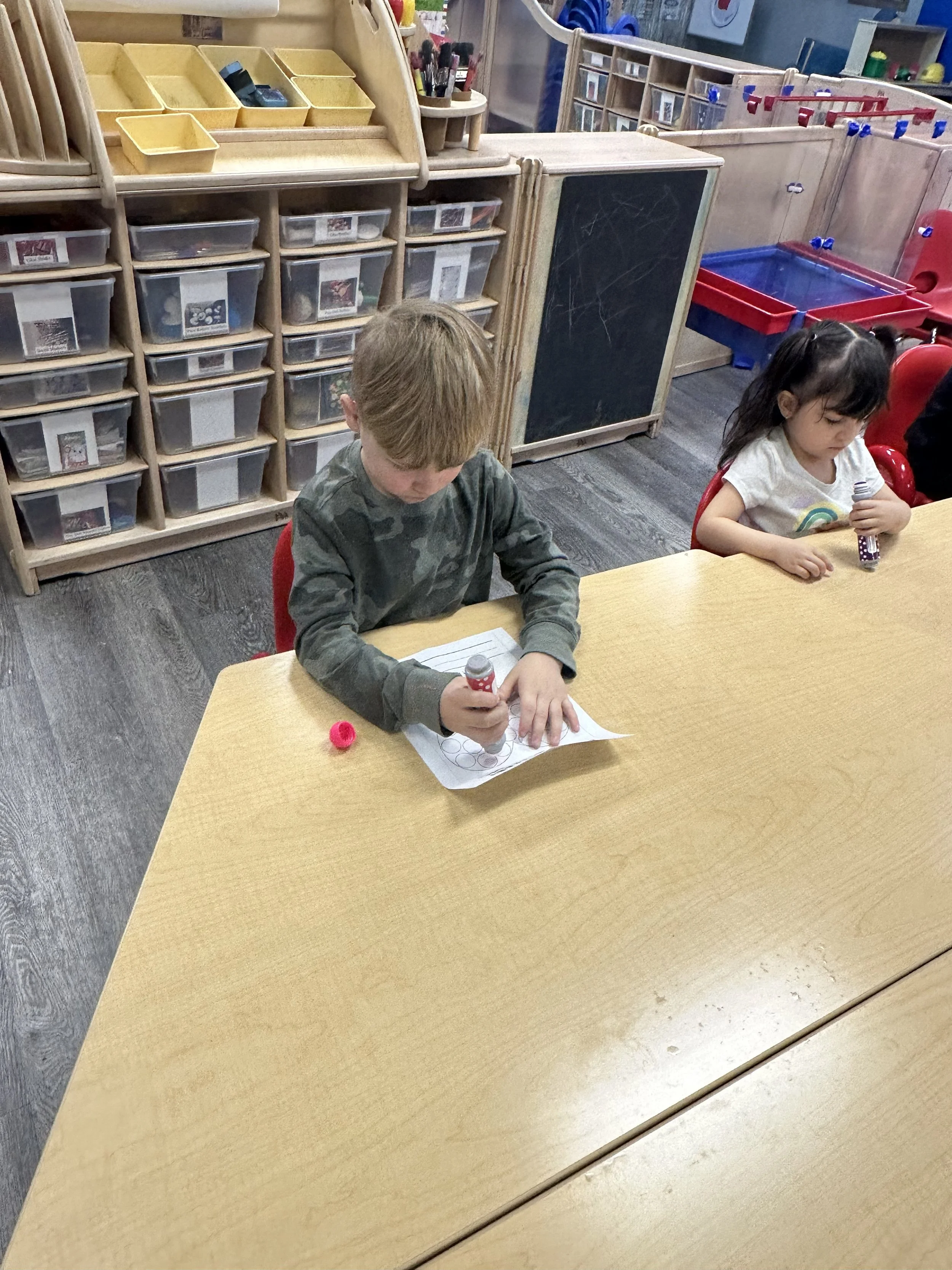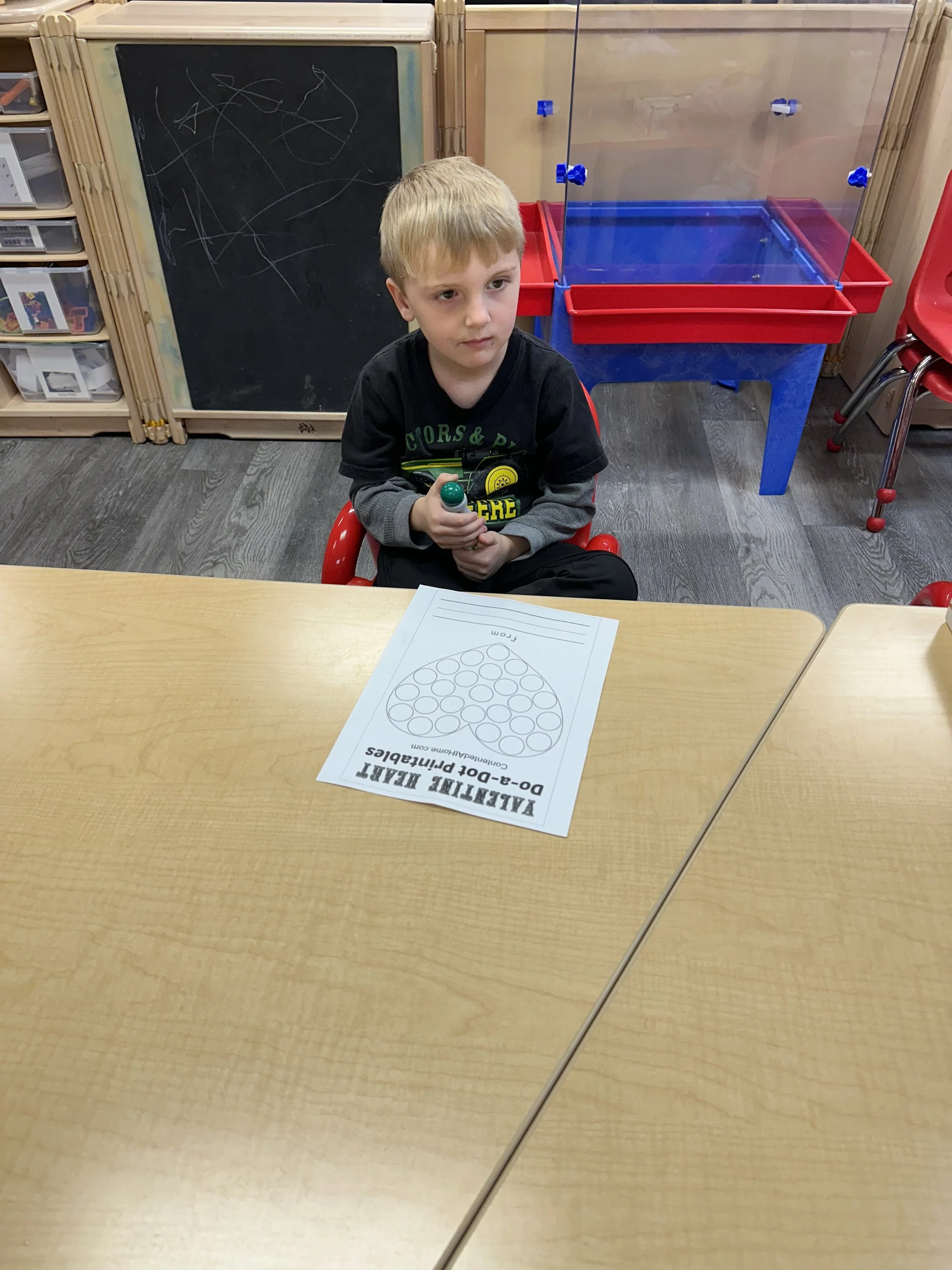 Happy Friday! Today we read the book Love Monster and the Perfect Present by Rachel Bright. This book is about a monster that wanted to create the most special present that he could for his special someone. For our math and cognition activity we used paint dobbers to paint hearts. During science and sensory we created a sensory bin out of beads and plastic hearts. Lastly, for fine motor and literacy we practiced tracing our names.