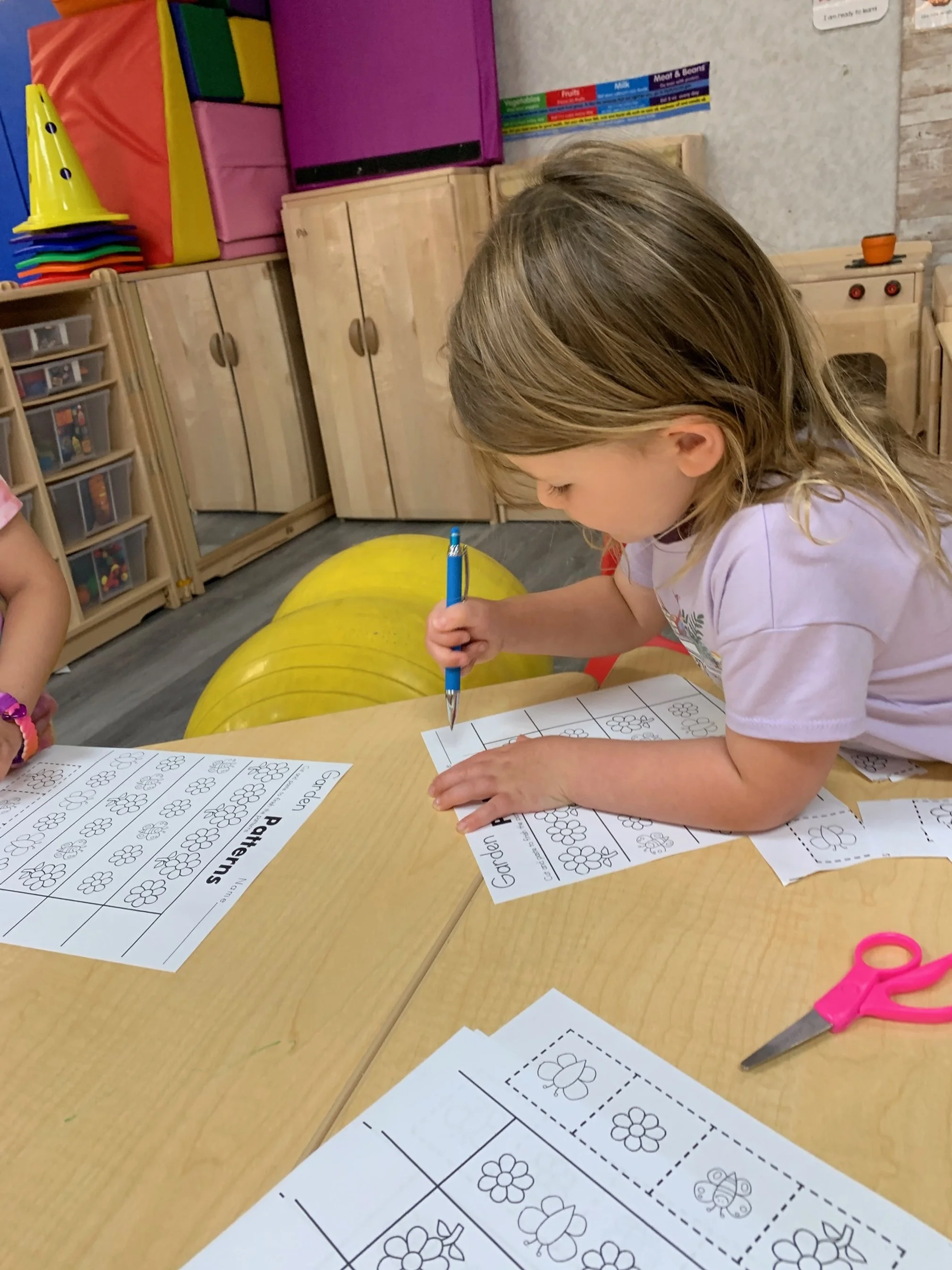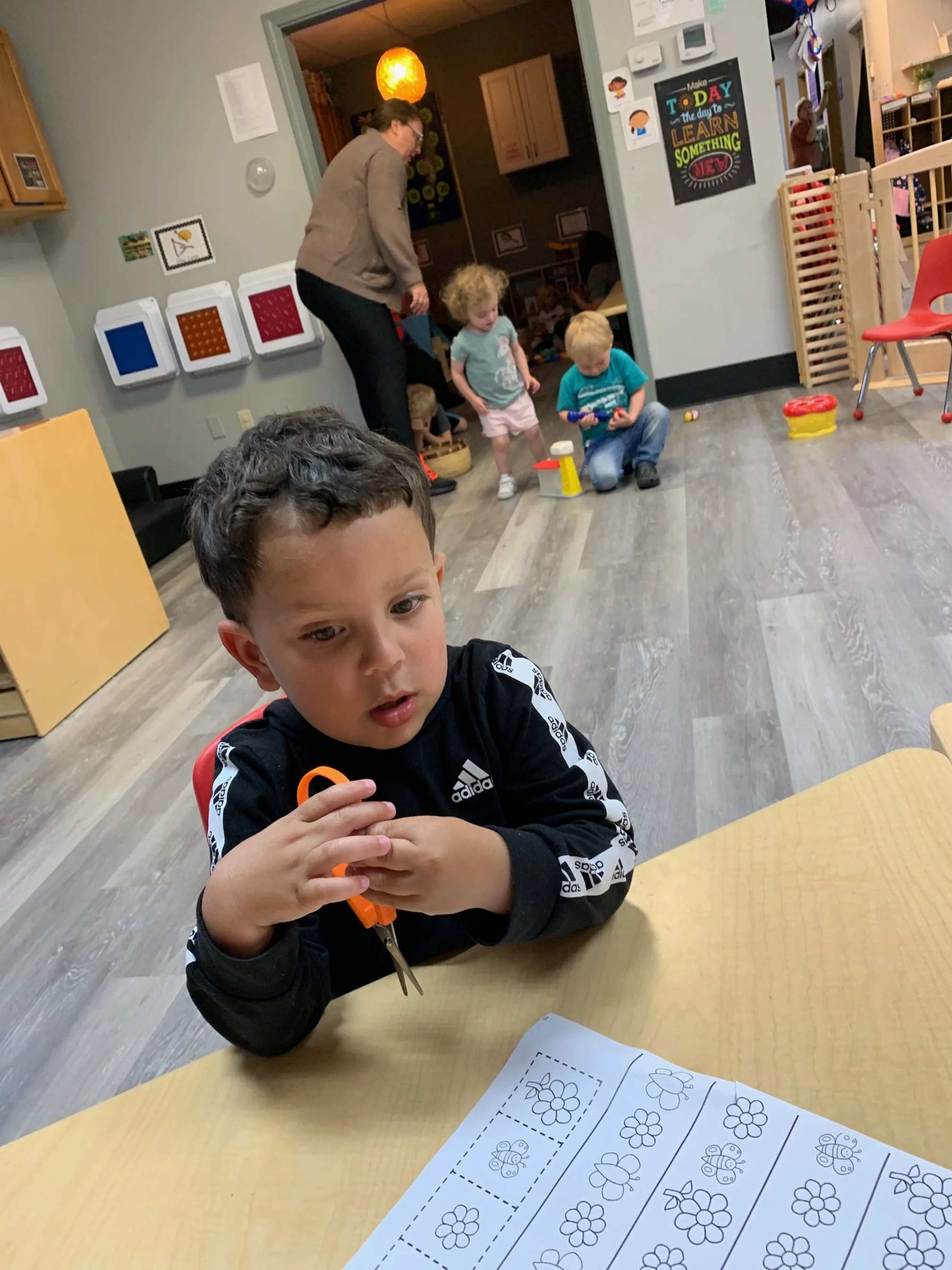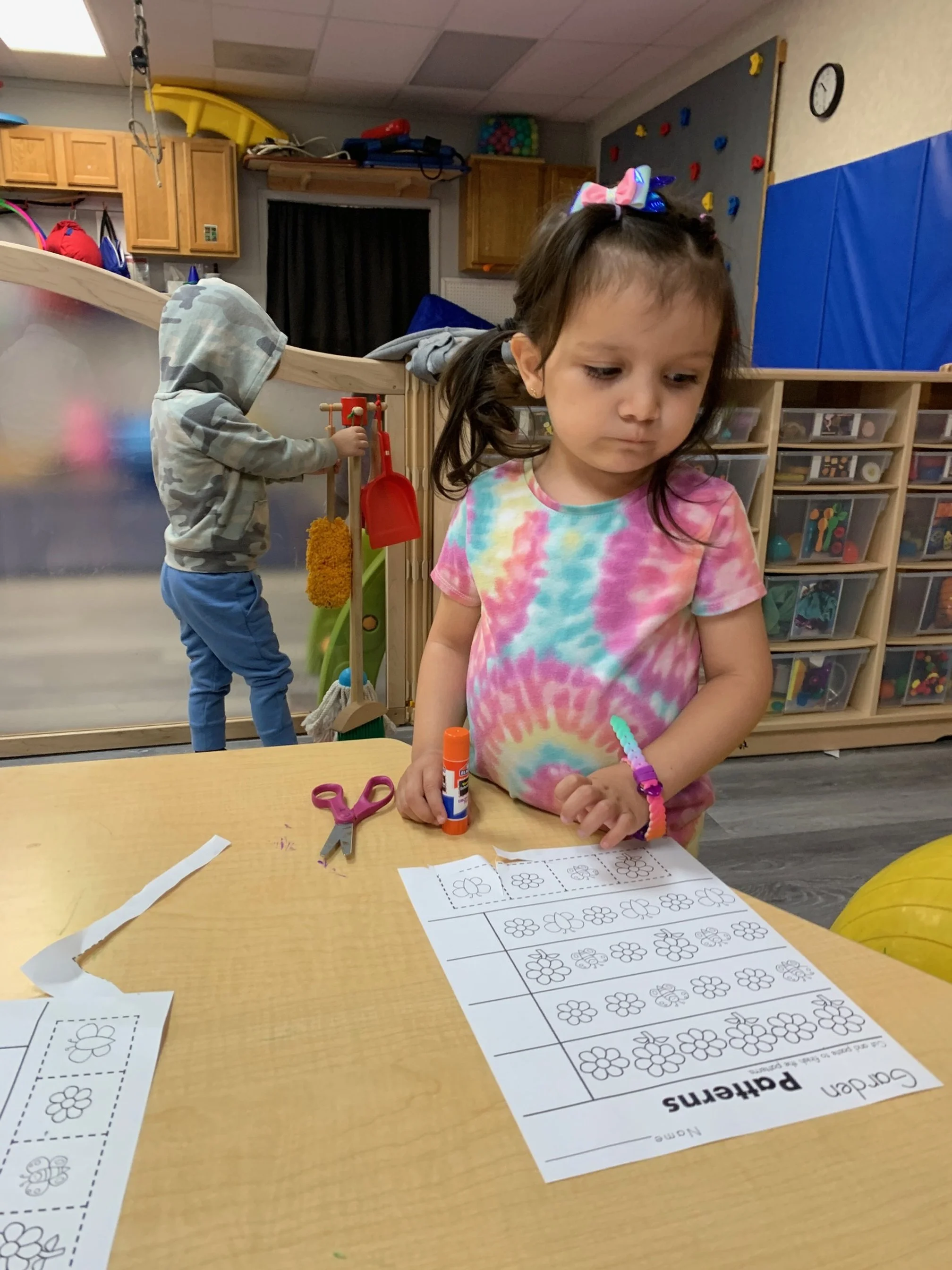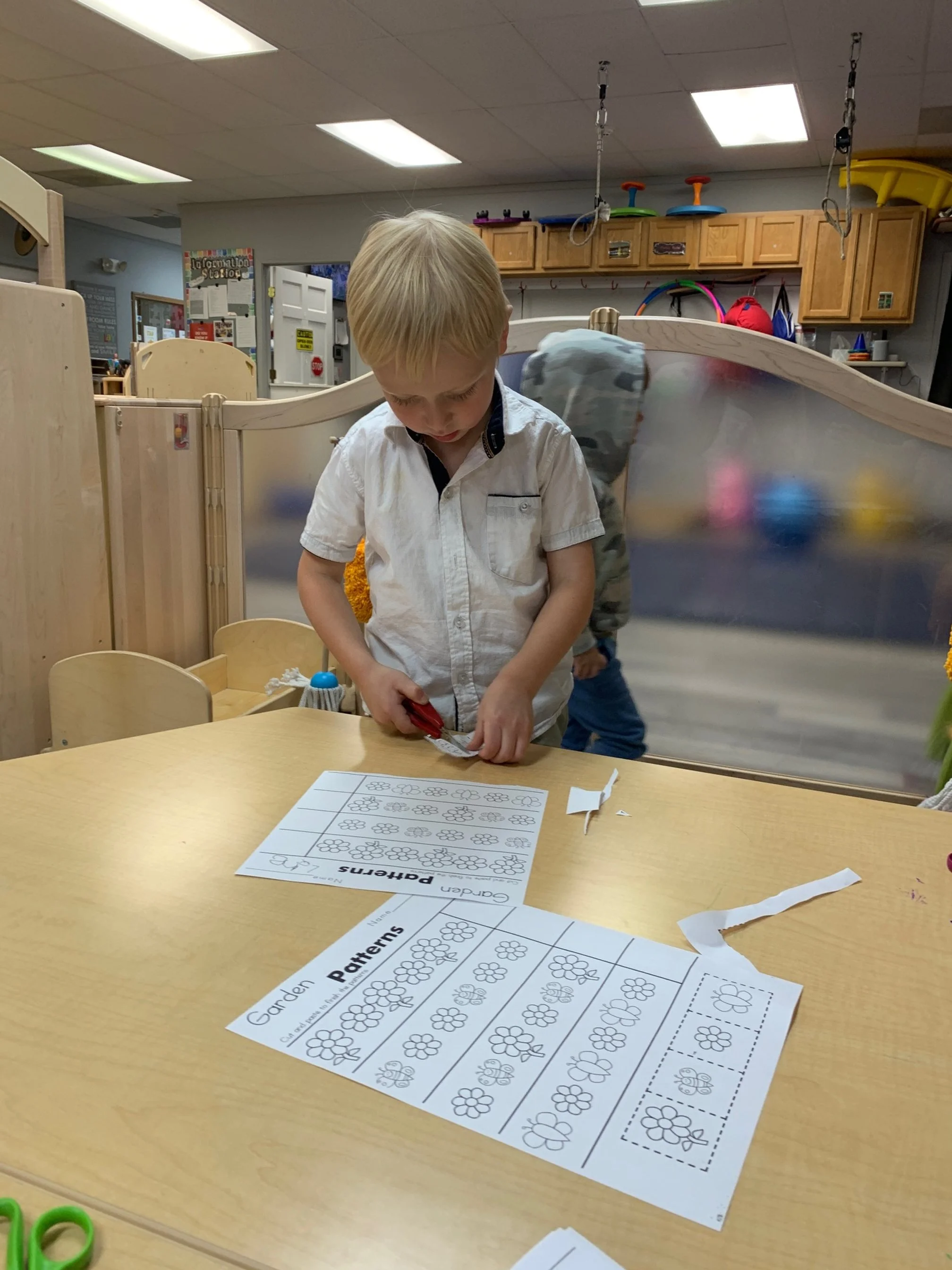During circle time today, we read “Zinnia’s Flower Garden” by Monica Wellington. In one small group, we used our fine motor skills to cut out pictures to make garden patterns. In another small group, we used our sensory and science skills and watched a video of a flower growing. After the video, we talked about what we saw. Later, during our large group activity, we played with play doh and made flower shapes. Our friend Ms. Chrissie, helped us play a matching game this morning since we couldn’t play outside with all the rain. Have a great Thursday!