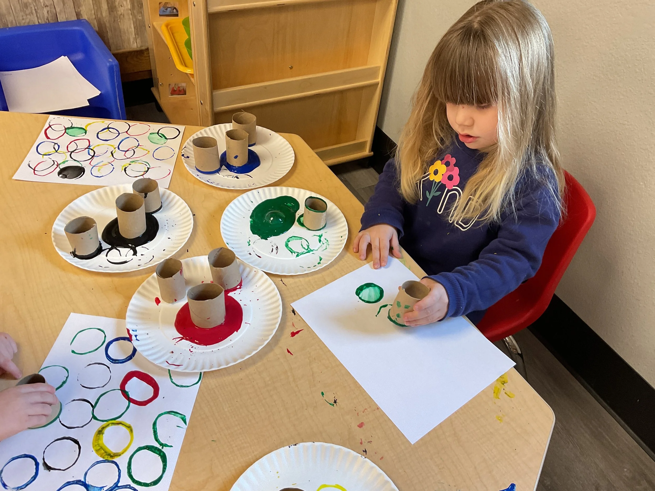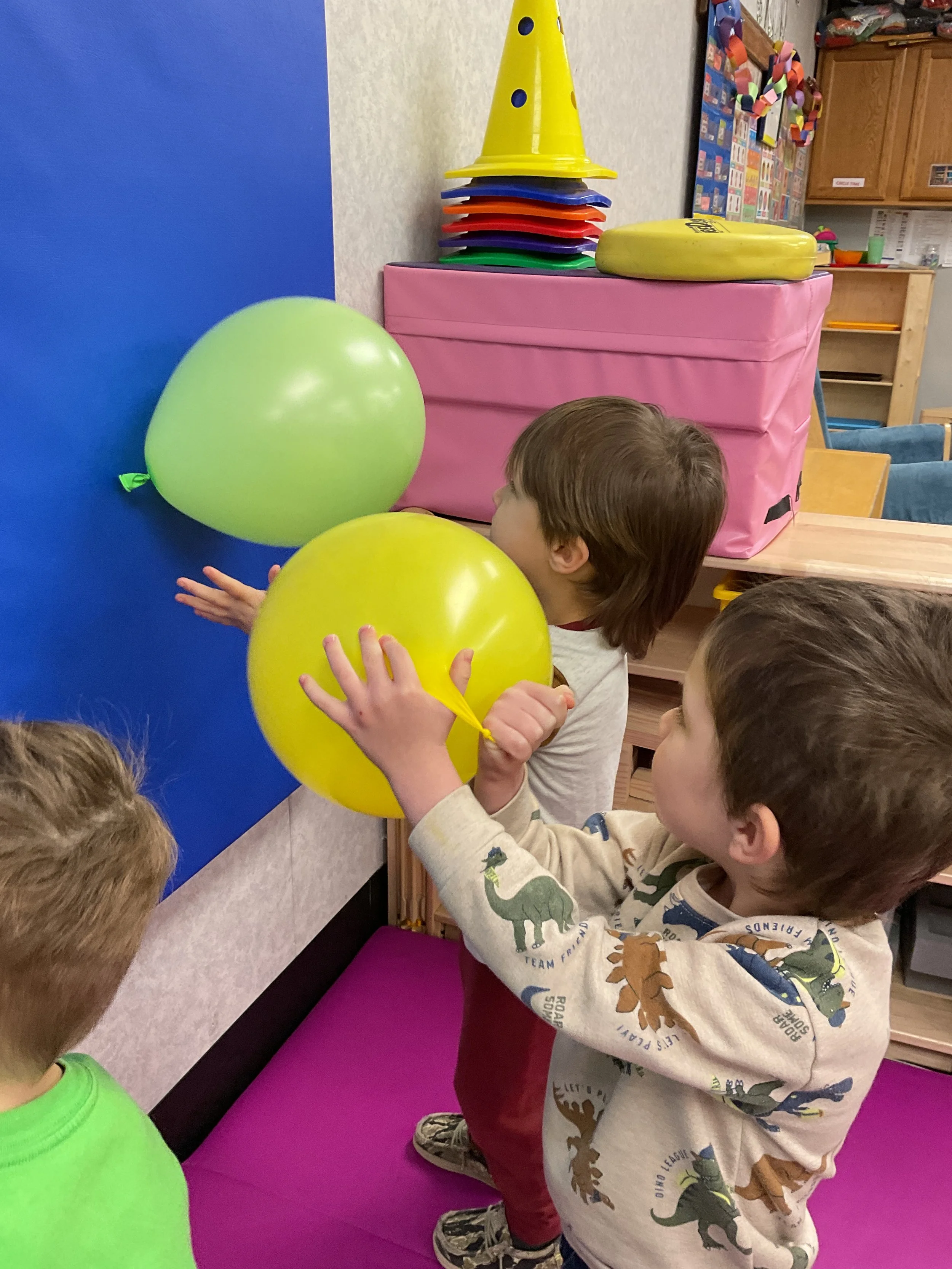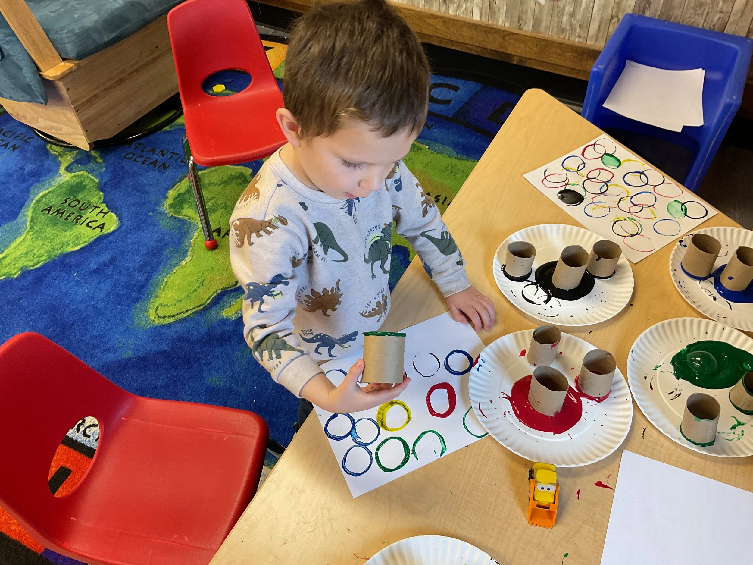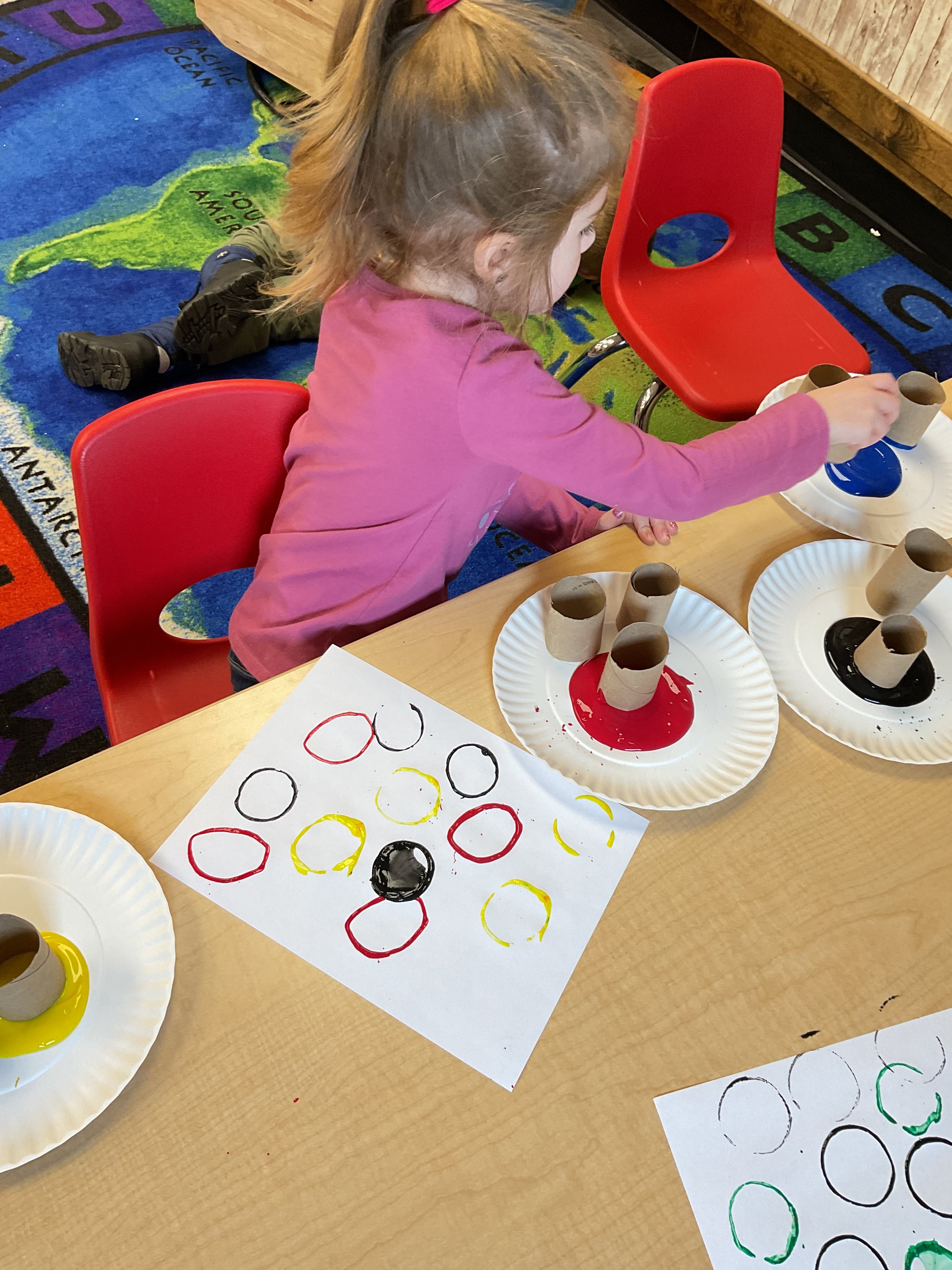This morning, we read the book Snowman Paul at the Winter Olympics written by Yossi Lapid and illustrated by Joanna Pasek. During our music and motor time, we played with balloons! Then, during our math and cognition lesson, we worked on 1 to 1 correspondence using a basketball hoops and pom poms. Next, for our science and sensory lesson, we made a stamping art using the colors of the Olympic Rings. Finally, for our literacy and fine motor lesson, we listened to a book on tape.
