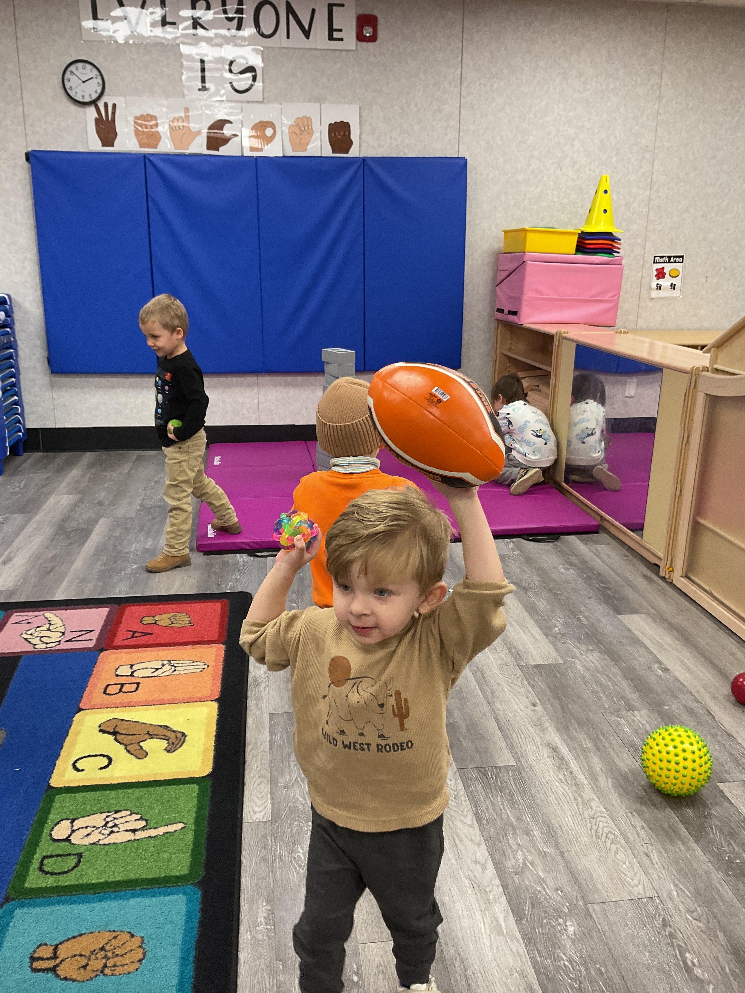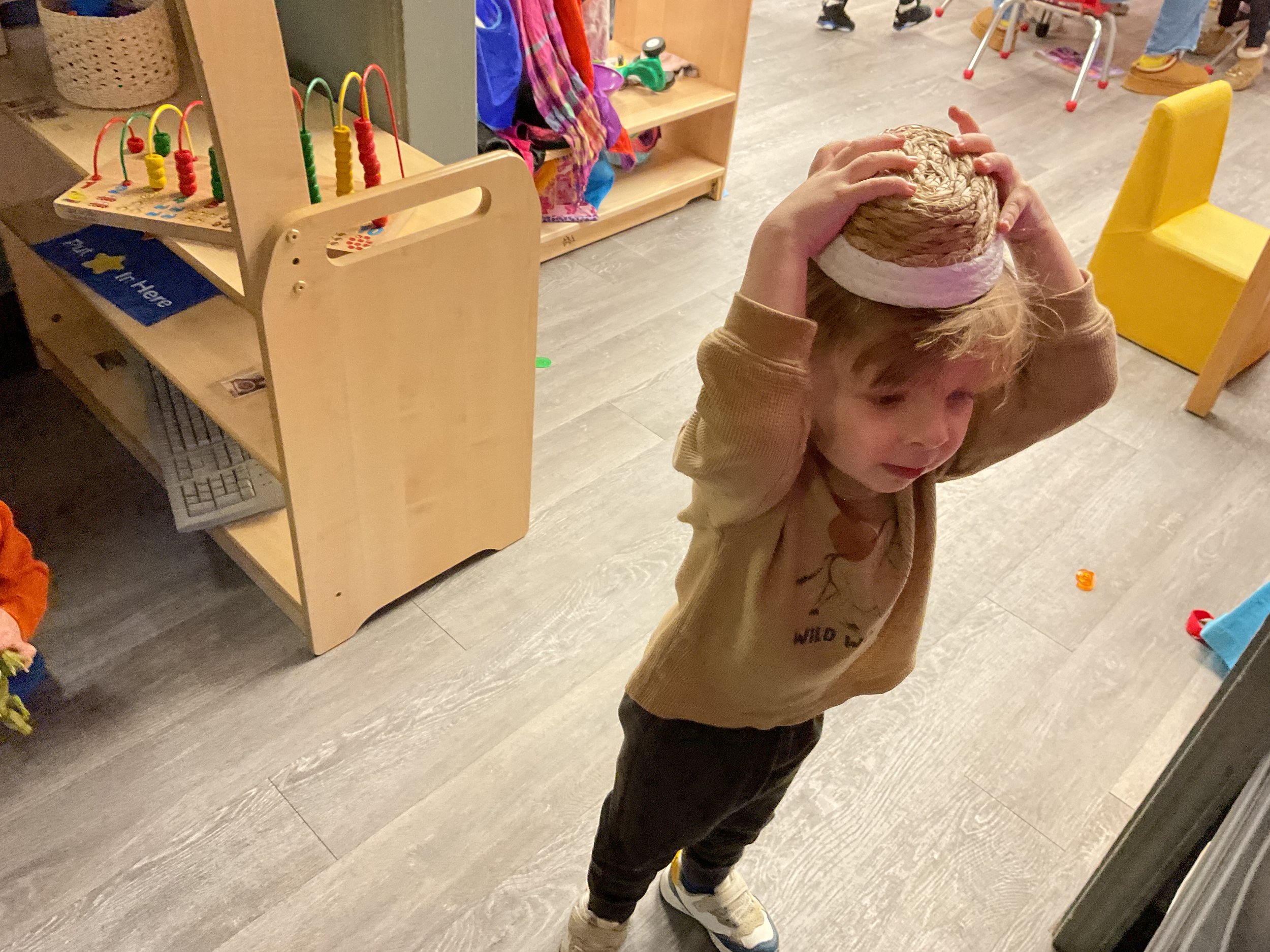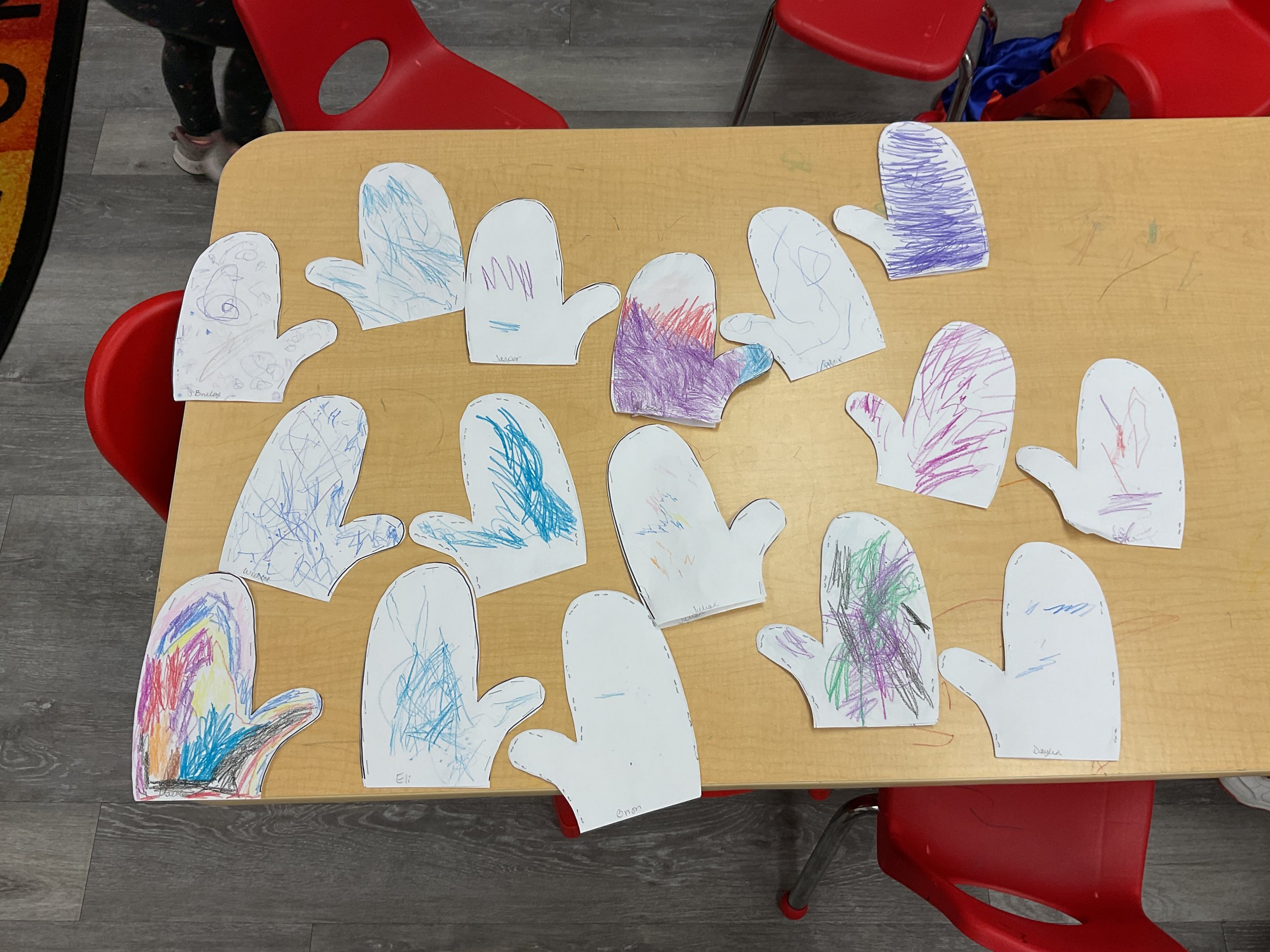 This morning, we read the book Tony Baroni Loves Macaroni written by Marilyn Sadler and illustrated by Lucie Crovatto. During our music and movement time, we played with different sized and texture balls. Then, during our math and cognition lesson, we talked about what foods are hot and cold. Next, for our science and sensory lesson, we got a cup of water and sprinkled a thick layer of cinnamon on top of the water. Then, we put our finger in the cup and the cinnamon surrounded our fingers and they did not get wet! Finally, for our literacy and fine motor lesson, we made oven mitts for our letter of the week creation.