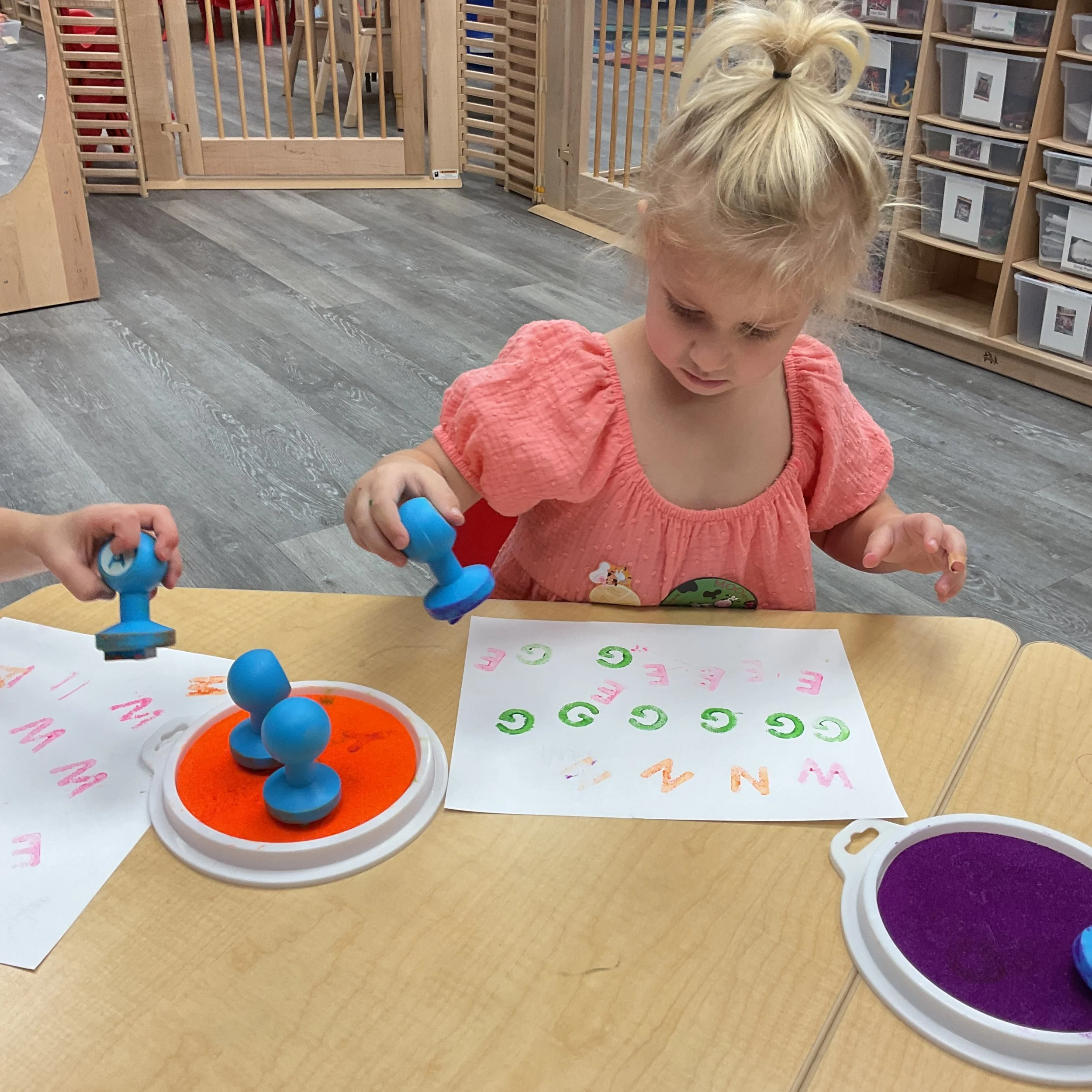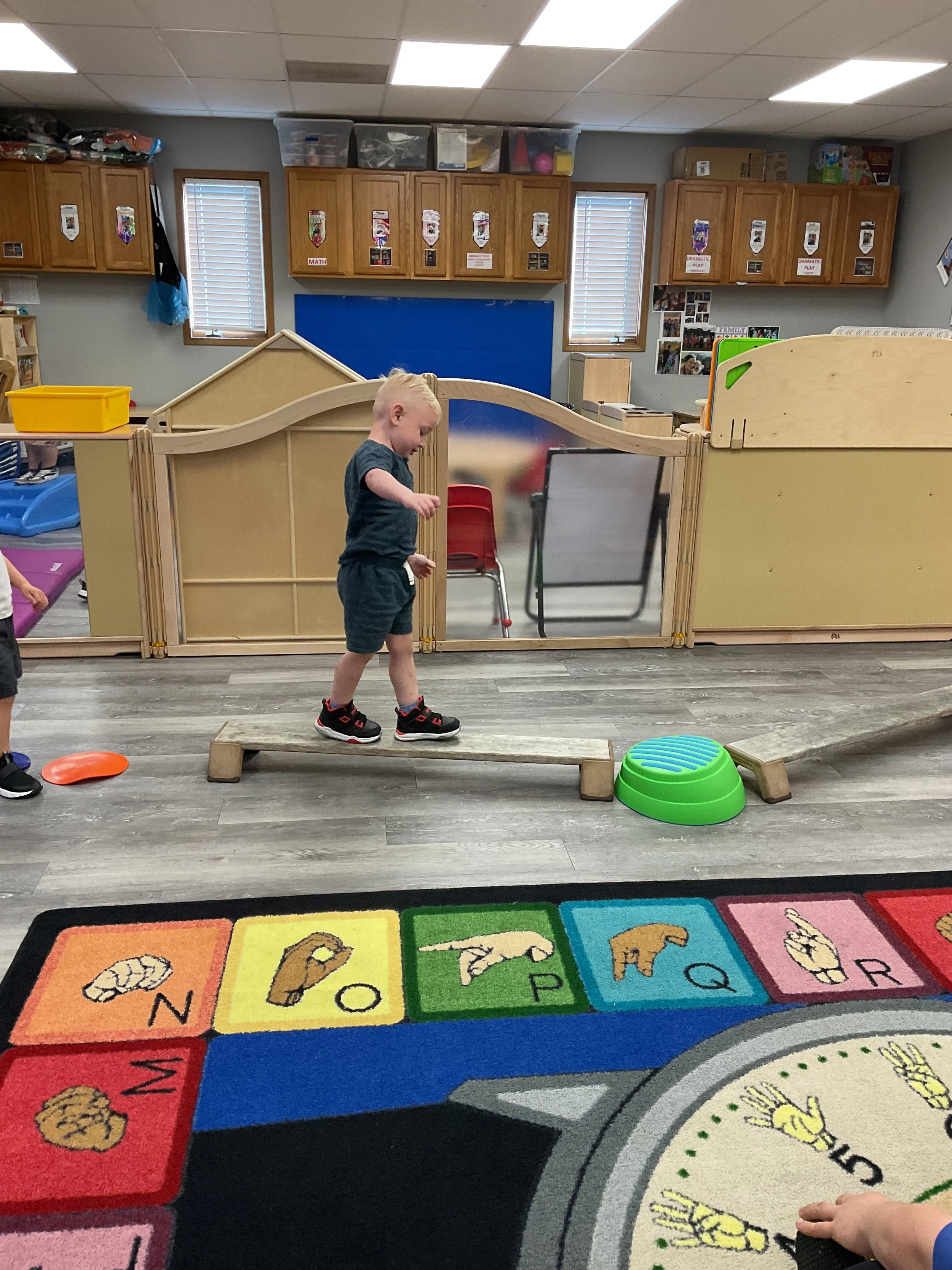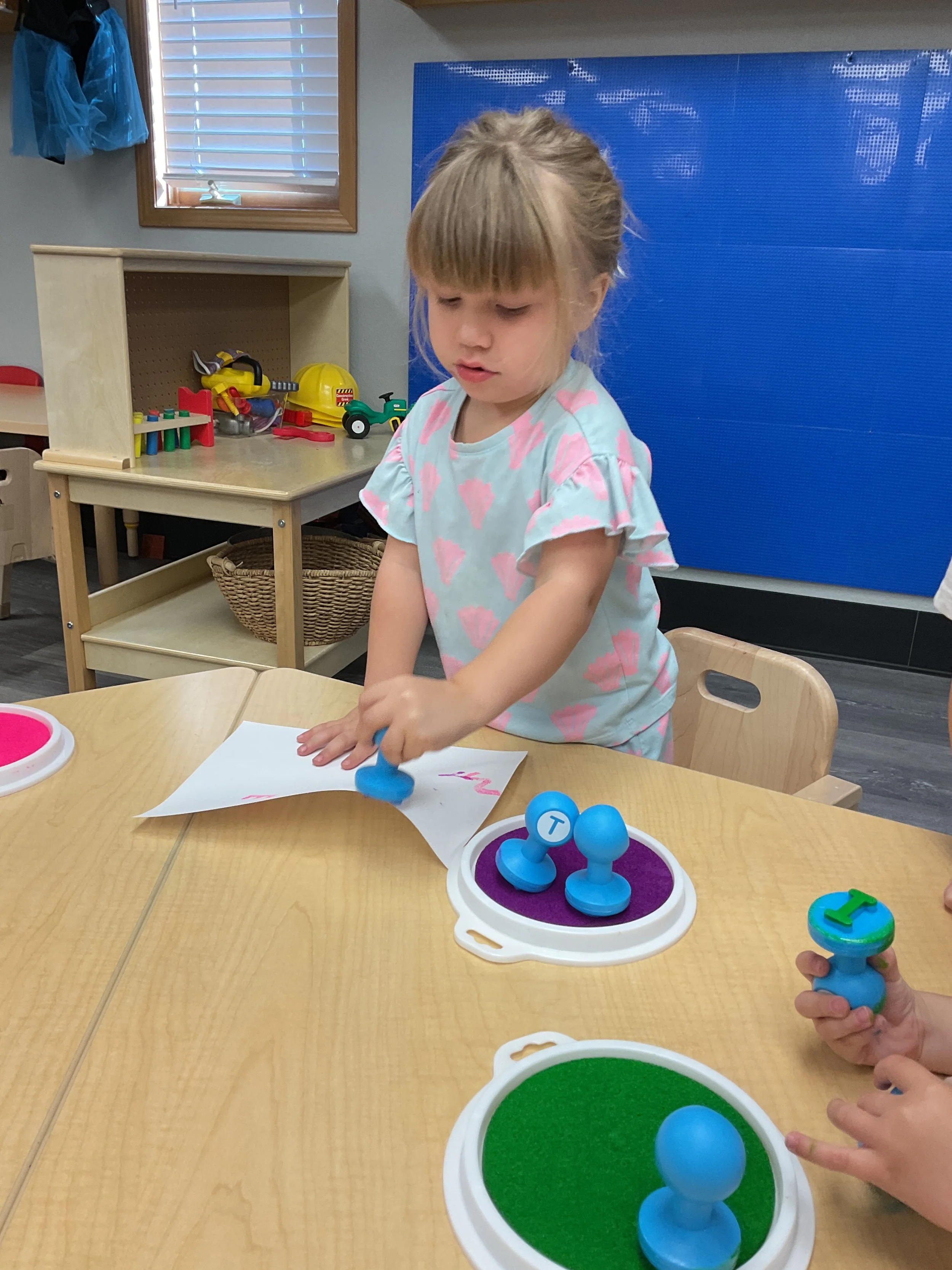 This morning, we read the book Shiver Me Letters: A Pirate ABC written by June Sobel and illustrated by Henry Cole. During music and movement time, we had a challenging obstacle course to navigate. The balance beams and summersaults were our favorite part! Next, during our math and cognition lesson, we made our name with plastic letters and stamp pads. We had to count the number of letters in our names and we had to identify the corresponding number! Then, for our science and sensory lesson, we used stamps to make some 3 letter words. Lastly, for our fine motor and literacy lesson, we listened to a book on tape.