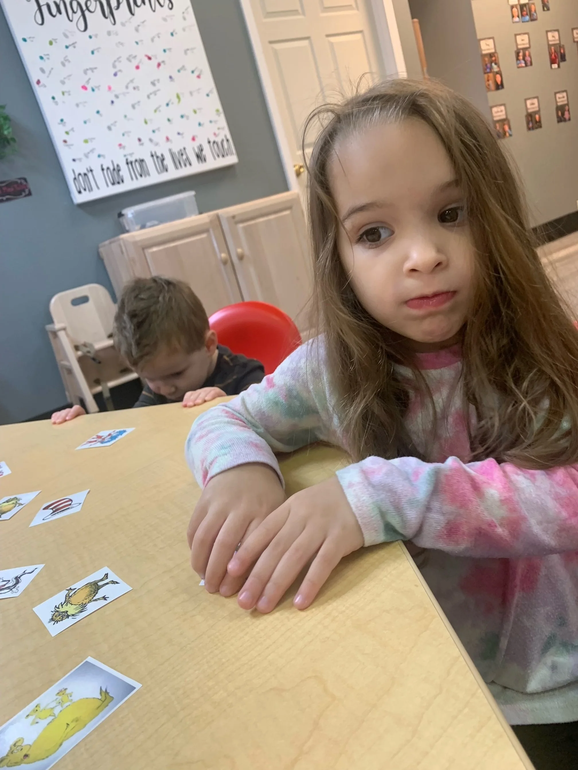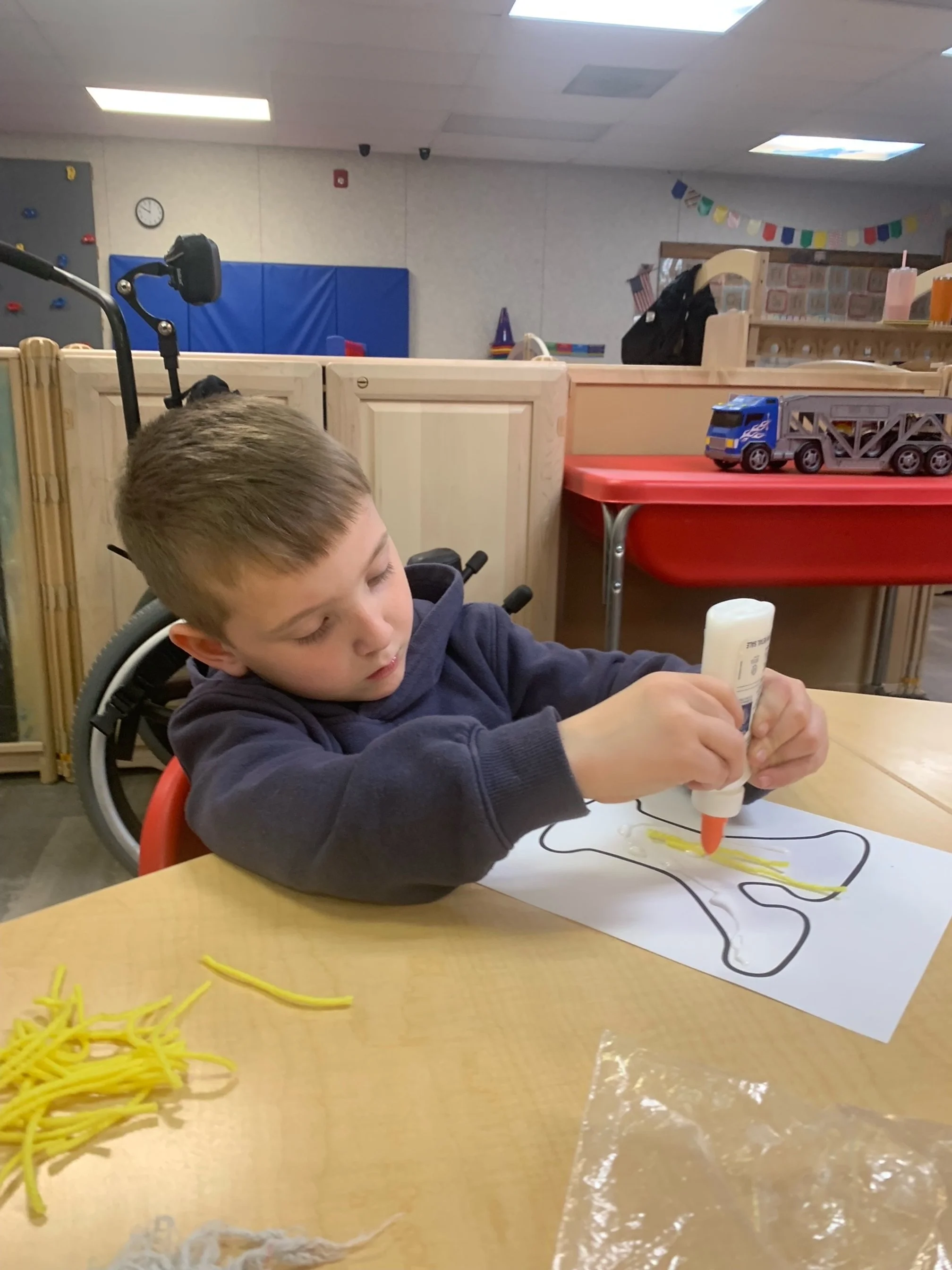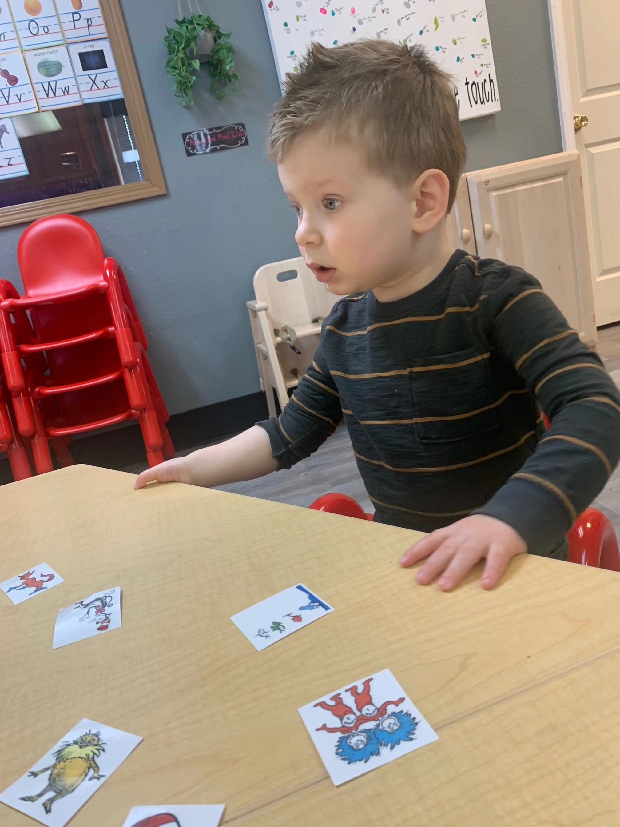 Happy Wednesday! Today we read the book One Fish Two Fish Red Fish Blue Fish by Dr. Suess. We went along with Jay and Kay and learned all kinds of different words. We also meet different characters and seen fish. During our math and cognition activity we played a Dr. Suess match game. During our science and sensory activity we made a green eggs and ham fizz. Our teacher poured baking soda into an plastic egg we then poured green vinegar into the egg and made it fizz. During our fine motor and literacy activity we made our letter Y creation. We glued yellow yarn onto our letter Y.