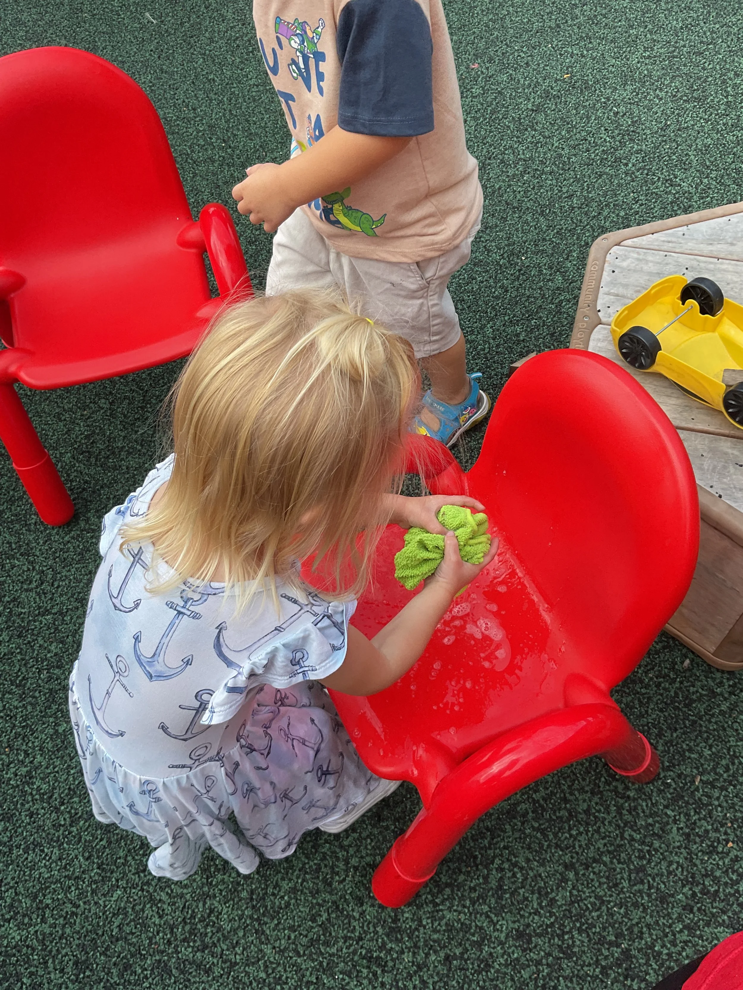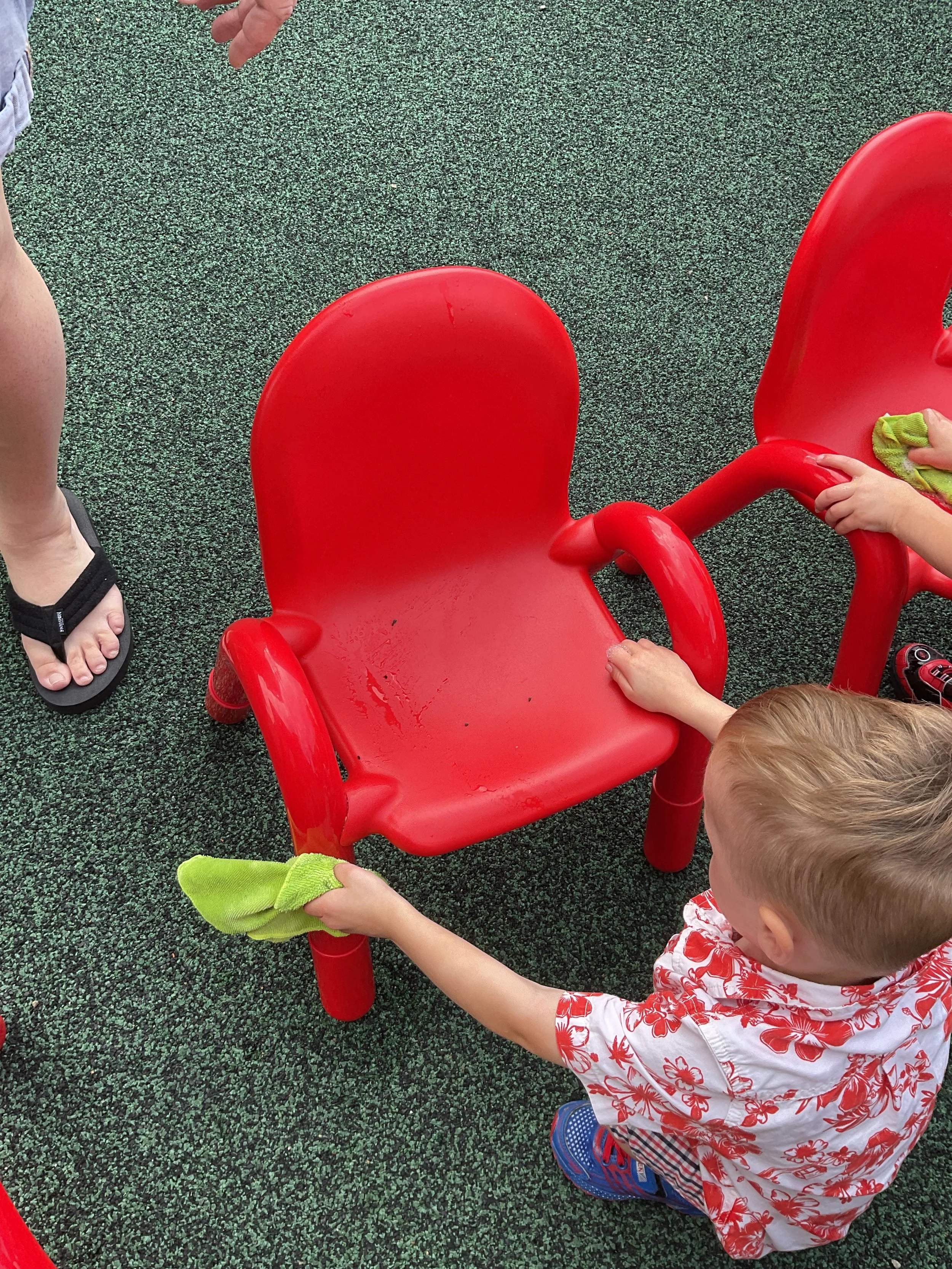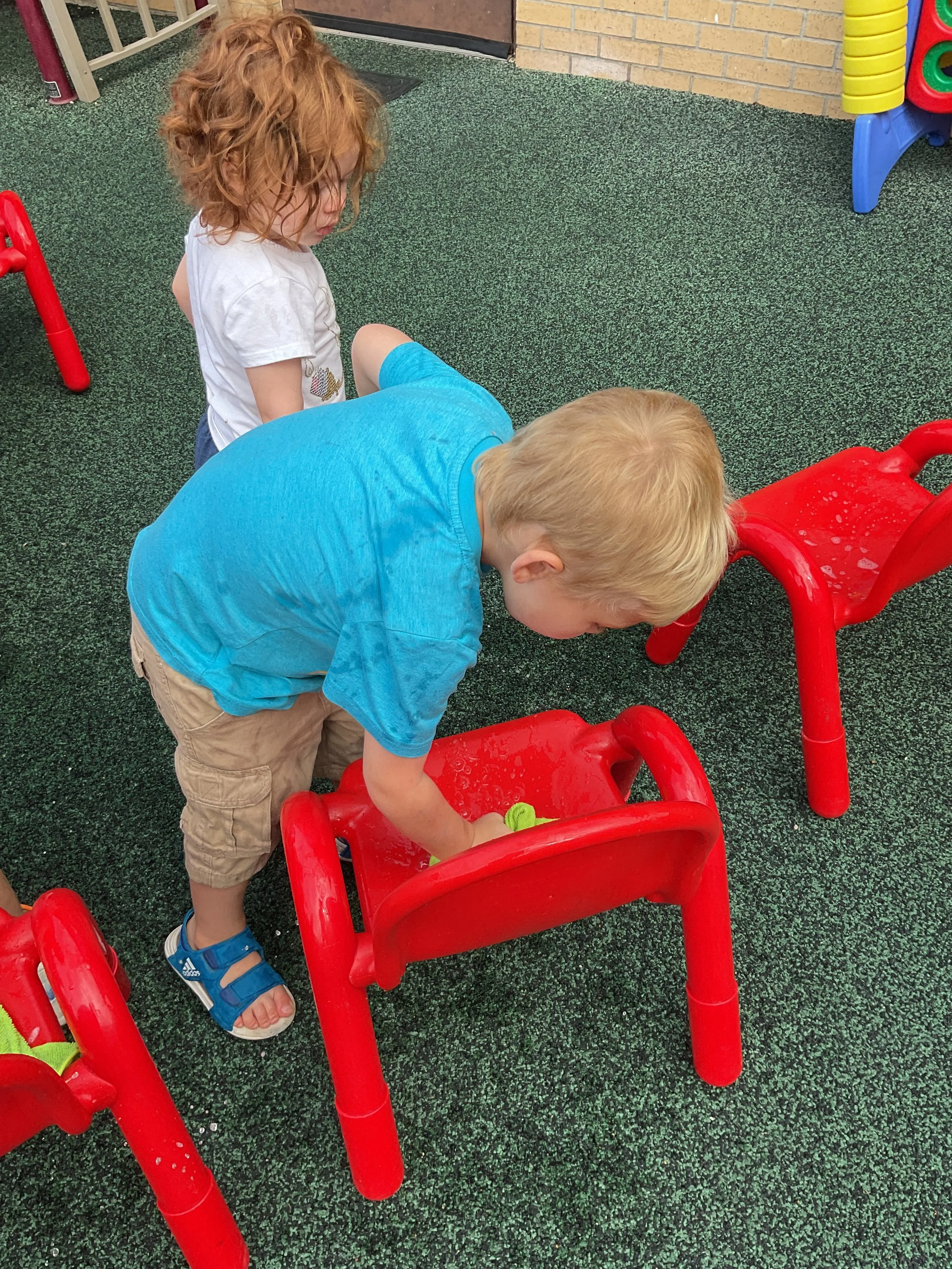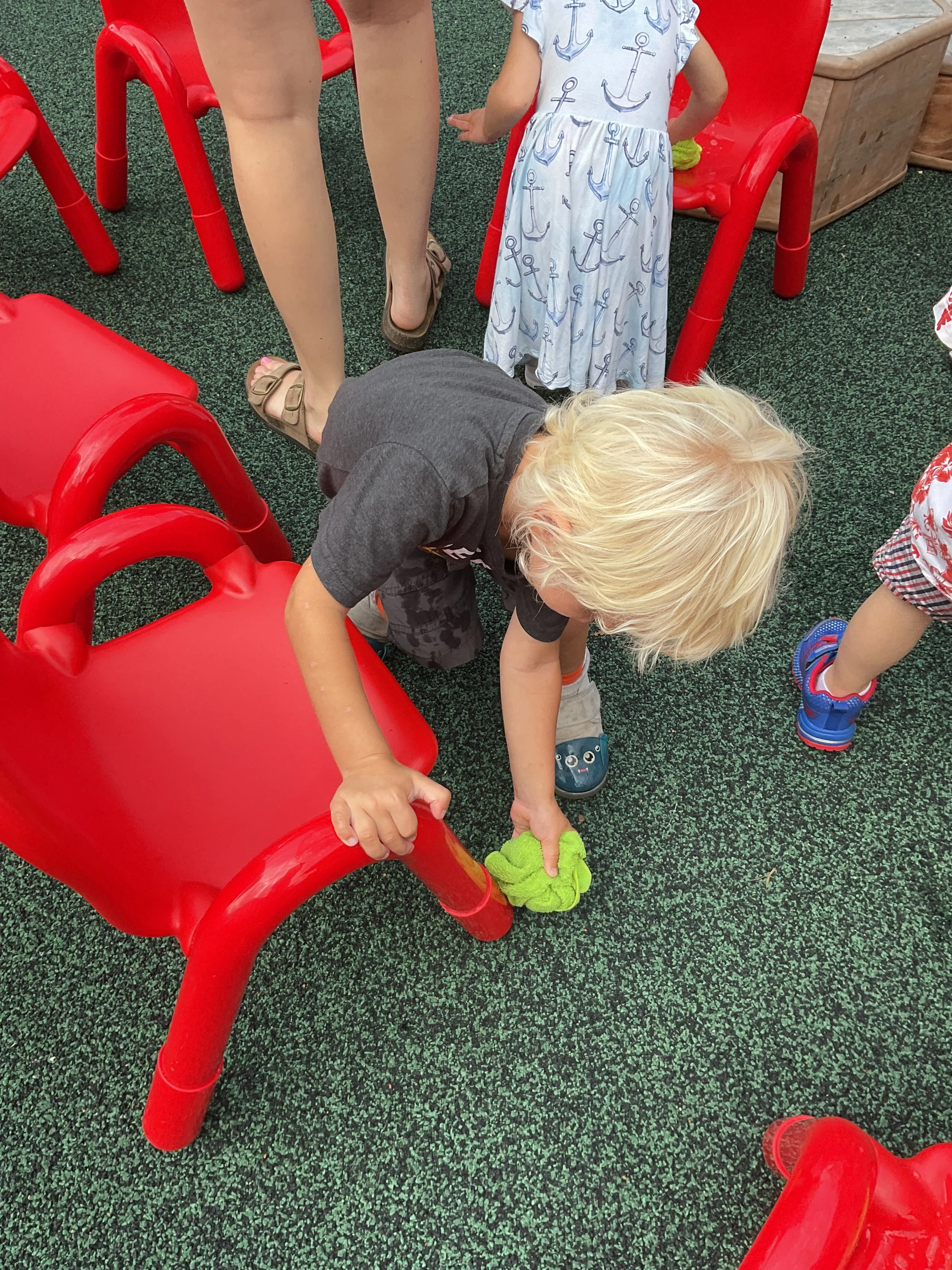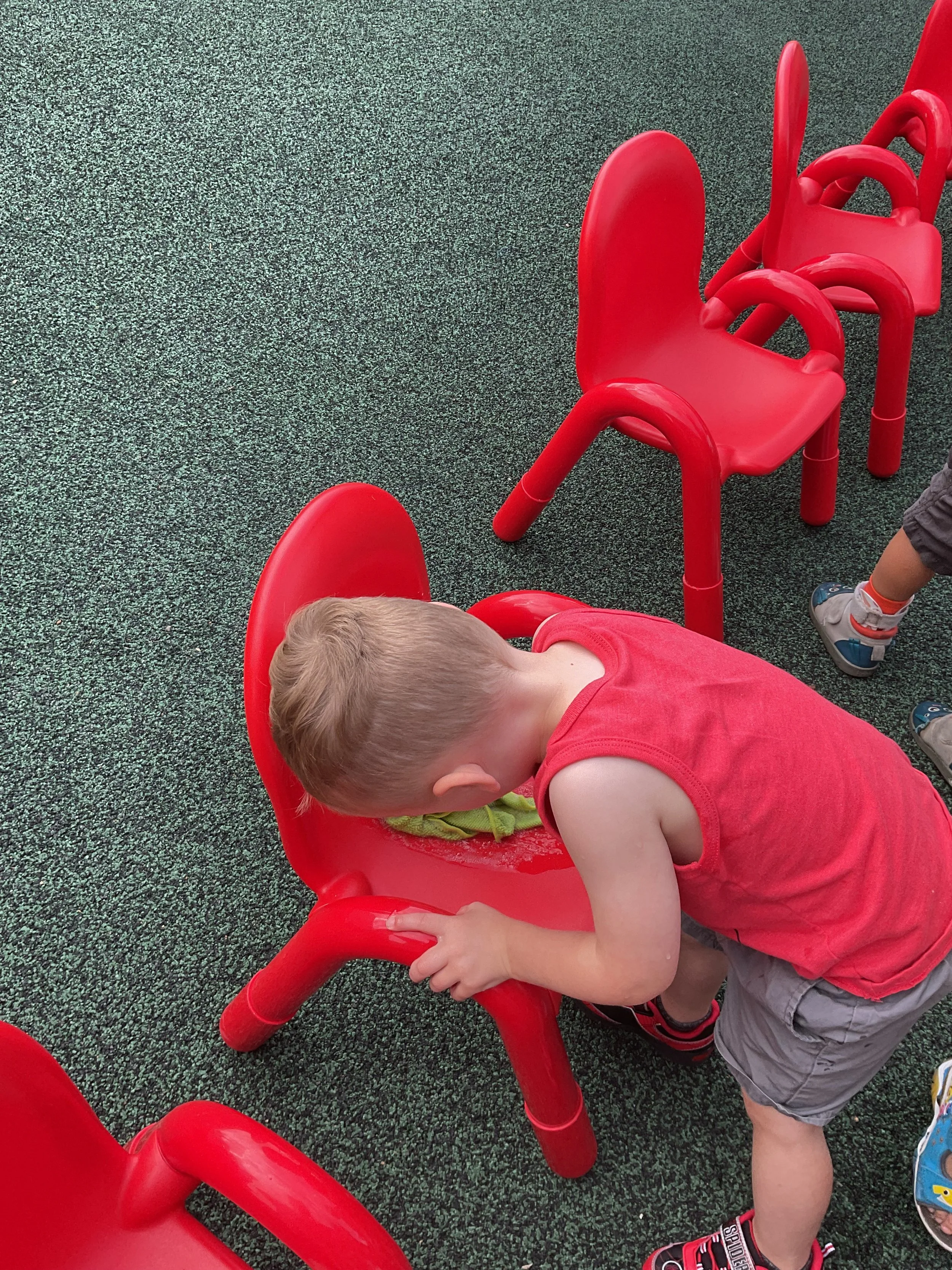 Happy Monday, we are starting this week off learning about opposites! Today, we read How do Dinosaurs Say Good Night? by Jane Yolen. This book talks about the ways you should and shouldn’t act when it’s time for bed. First, during our math and cognition activity, we compared different objects to see what would float and what would sink. Then, for our sensory and science activity, we used rags and water to clean our dirty chairs and talked about how the opposite of dirty is clean. Lastly, for our fine motor and literacy activity, we practiced tracing our names.
