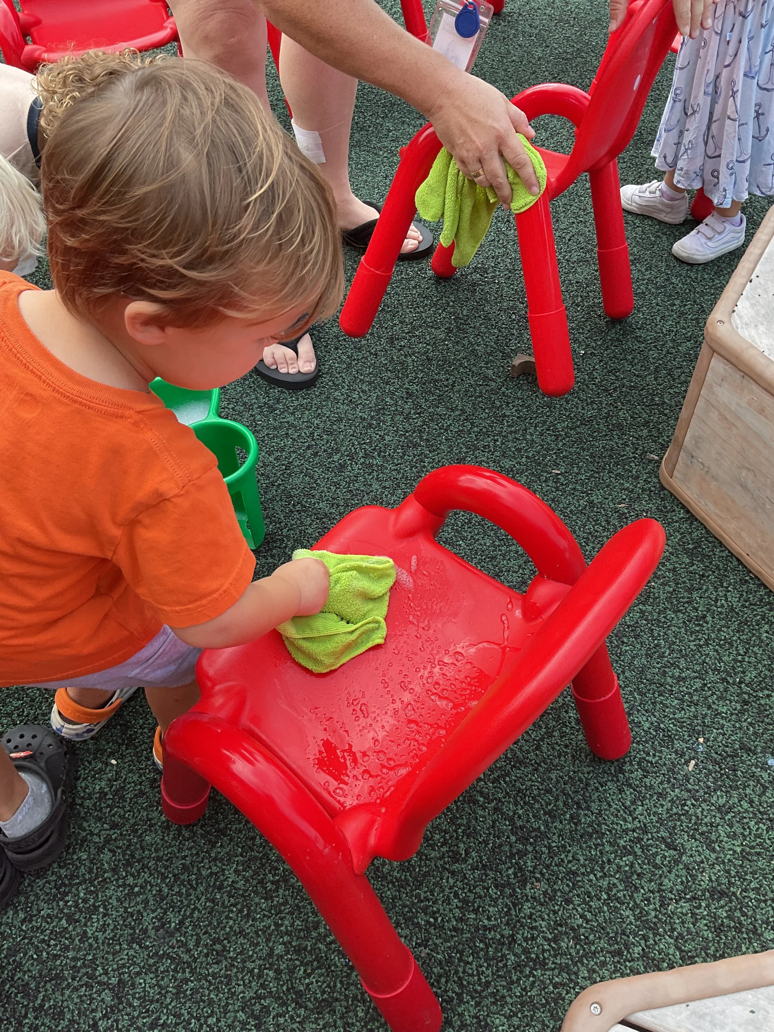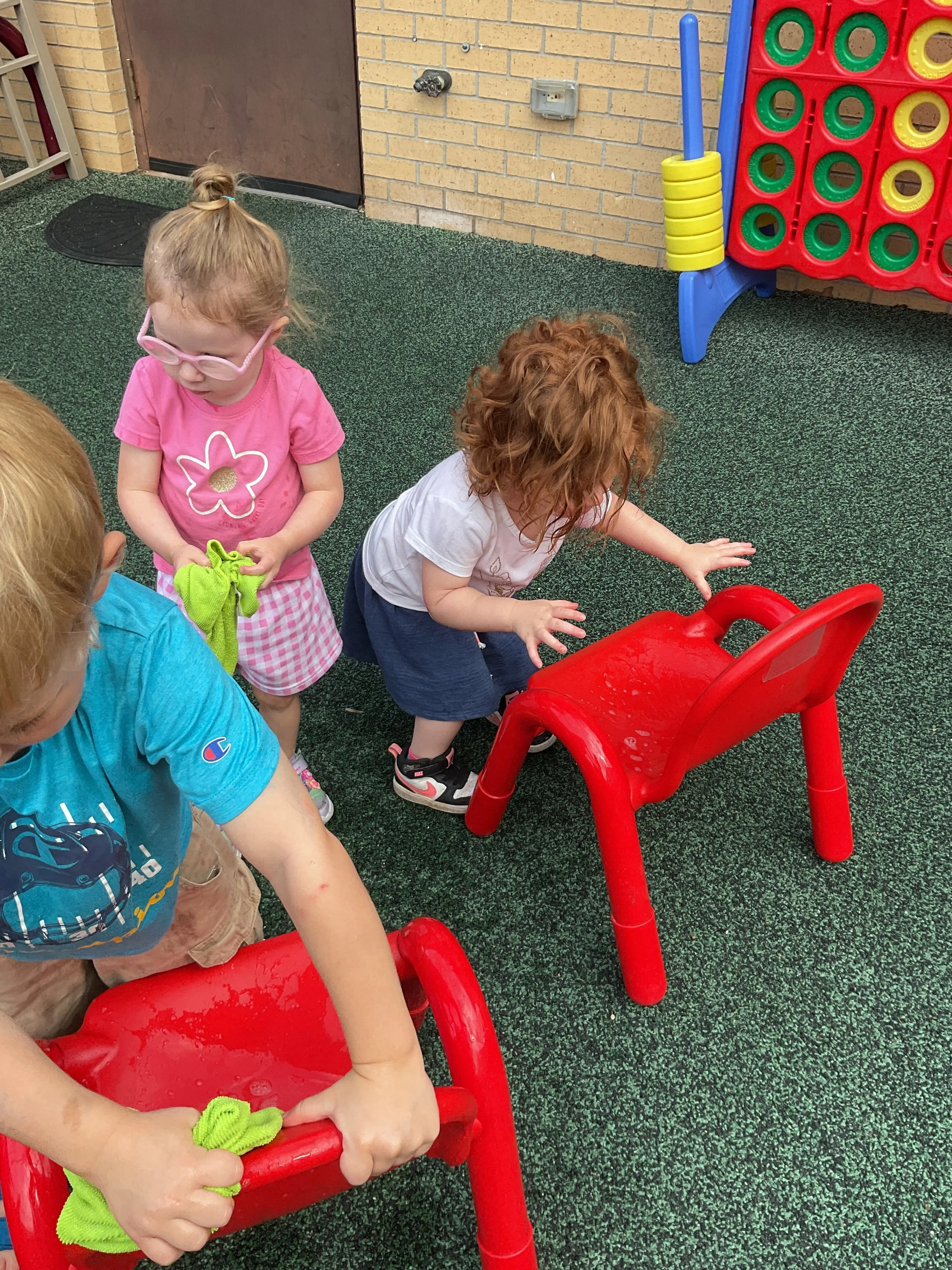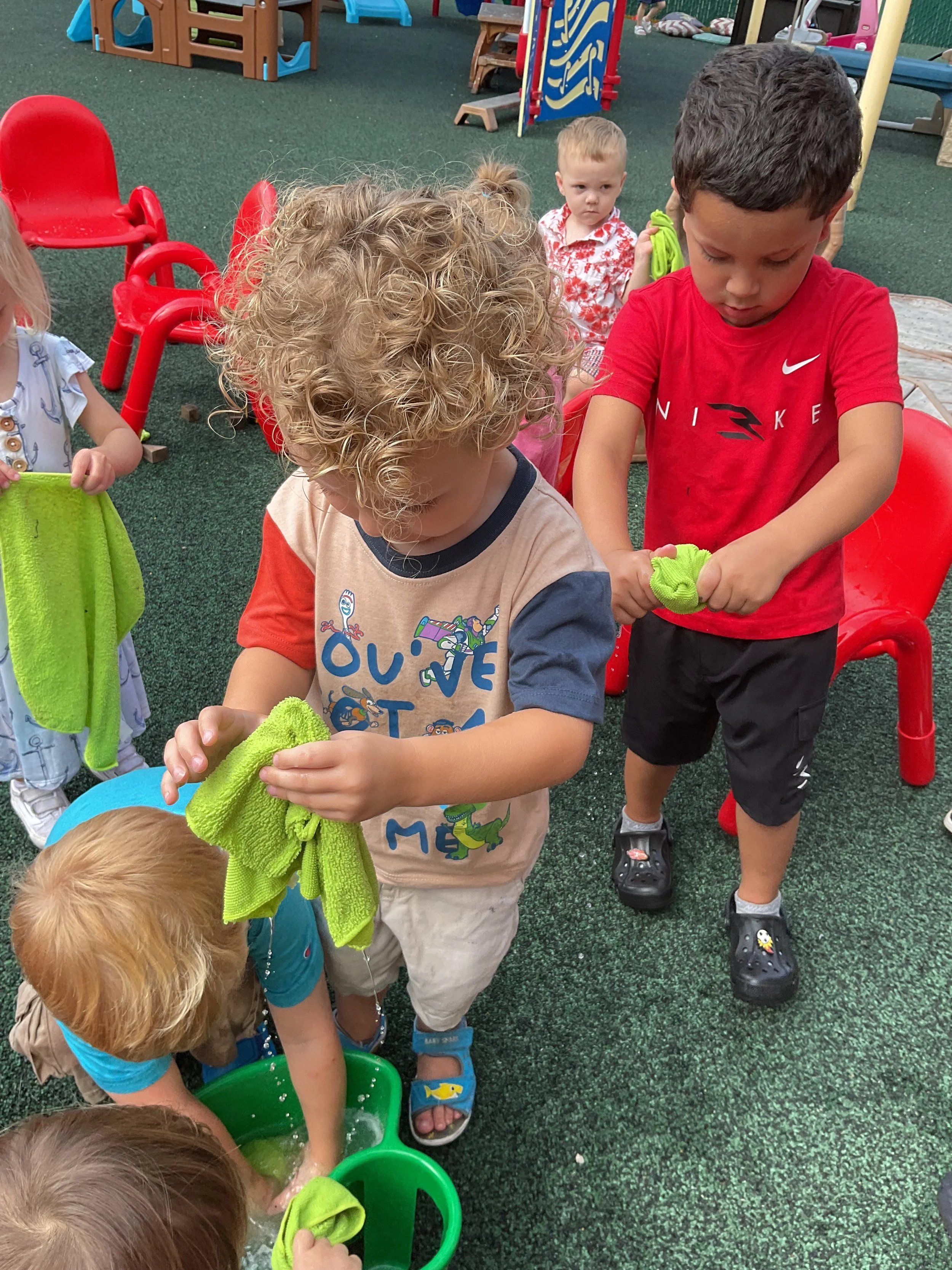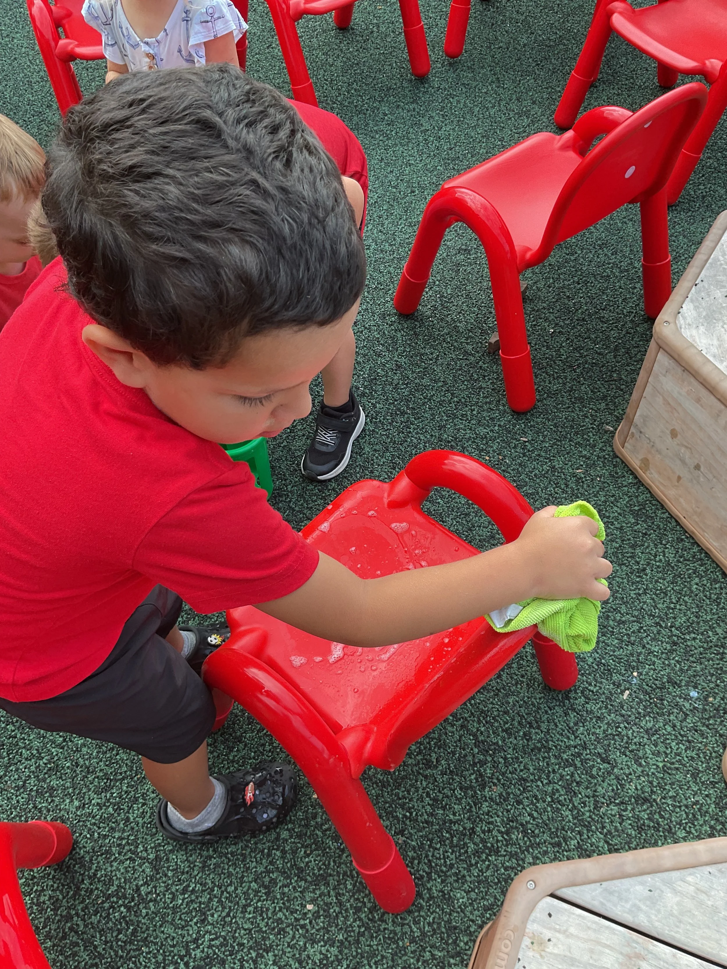 Happy Monday, we are starting this week off learning about opposites! Today, we read How do Dinosaurs Say Good Night? by Jane Yolen. This book talks about the ways you should and shouldn’t act when it’s time for bed. First, during our math and cognition activity, we compared different objects to see what would float and what would sink. Then, for our sensory and science activity, we used rags and water to clean our dirty chairs and talked about how the opposite of dirty is clean. Lastly, for our fine motor and literacy activity, we practiced tracing our names.