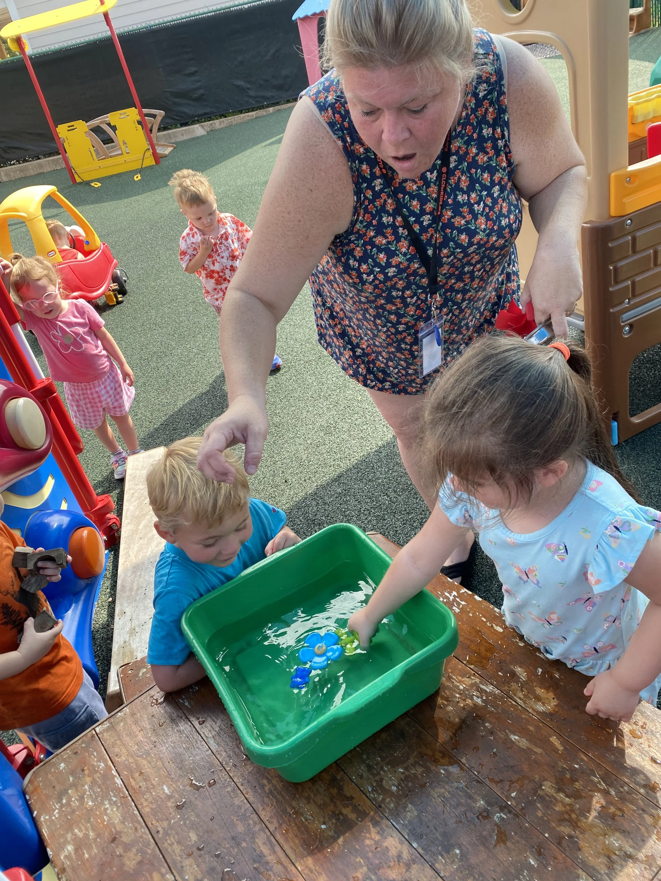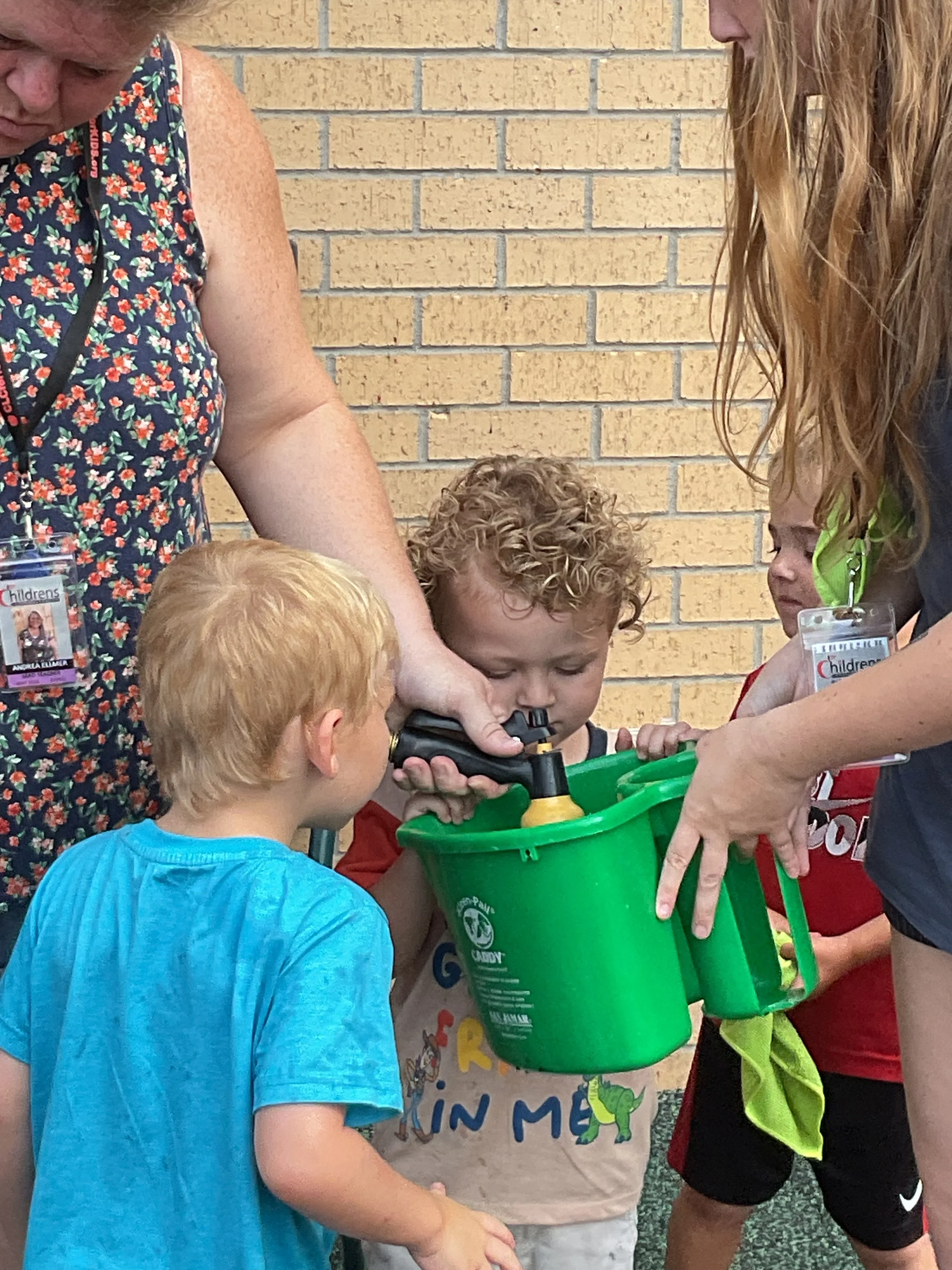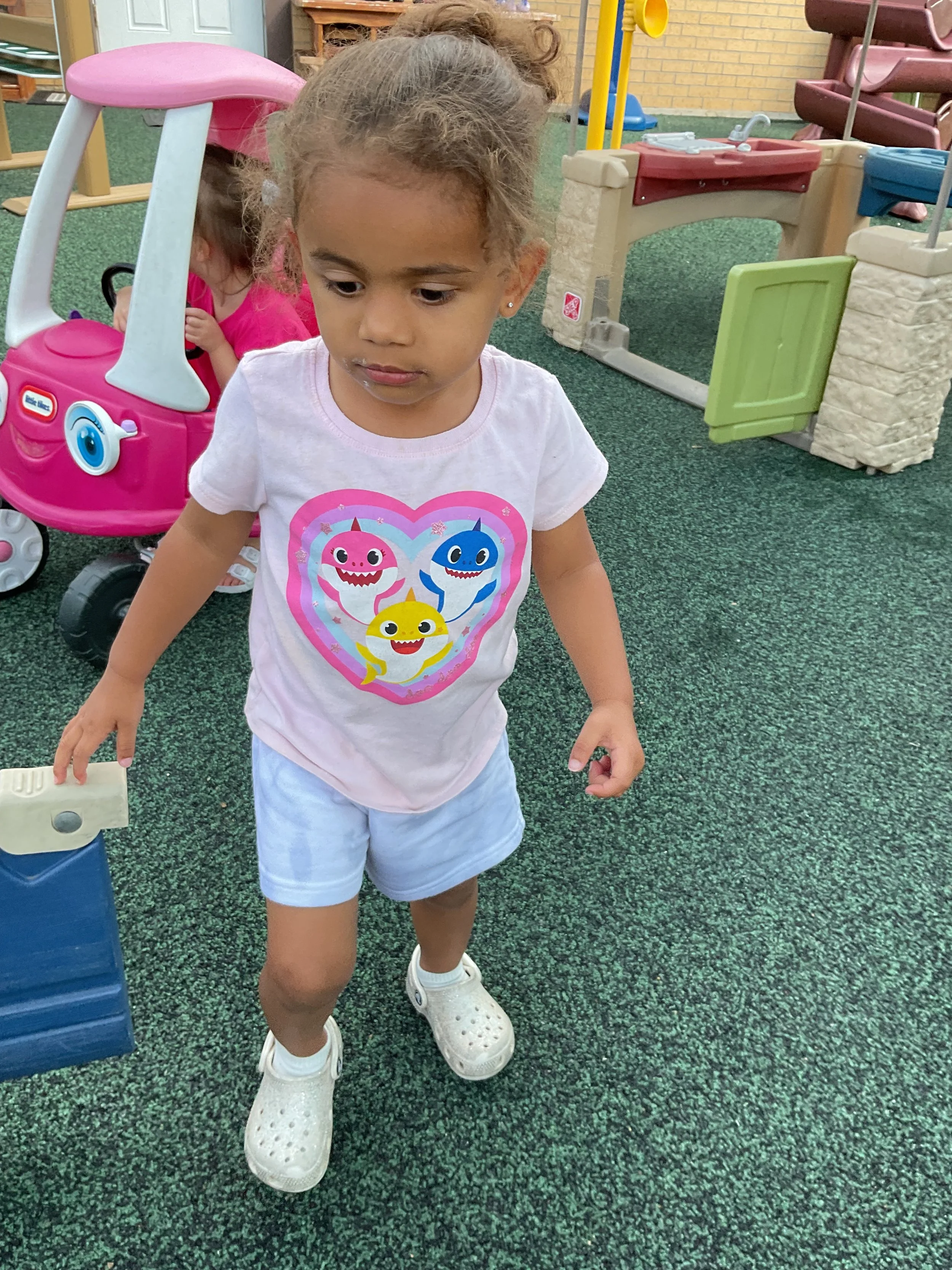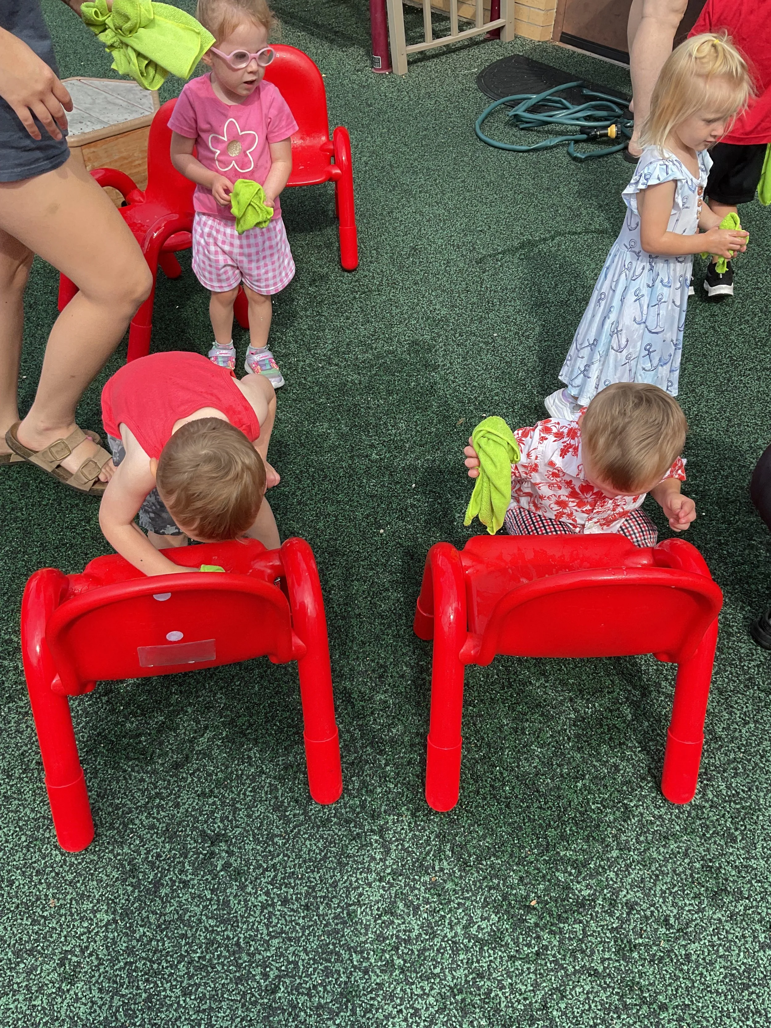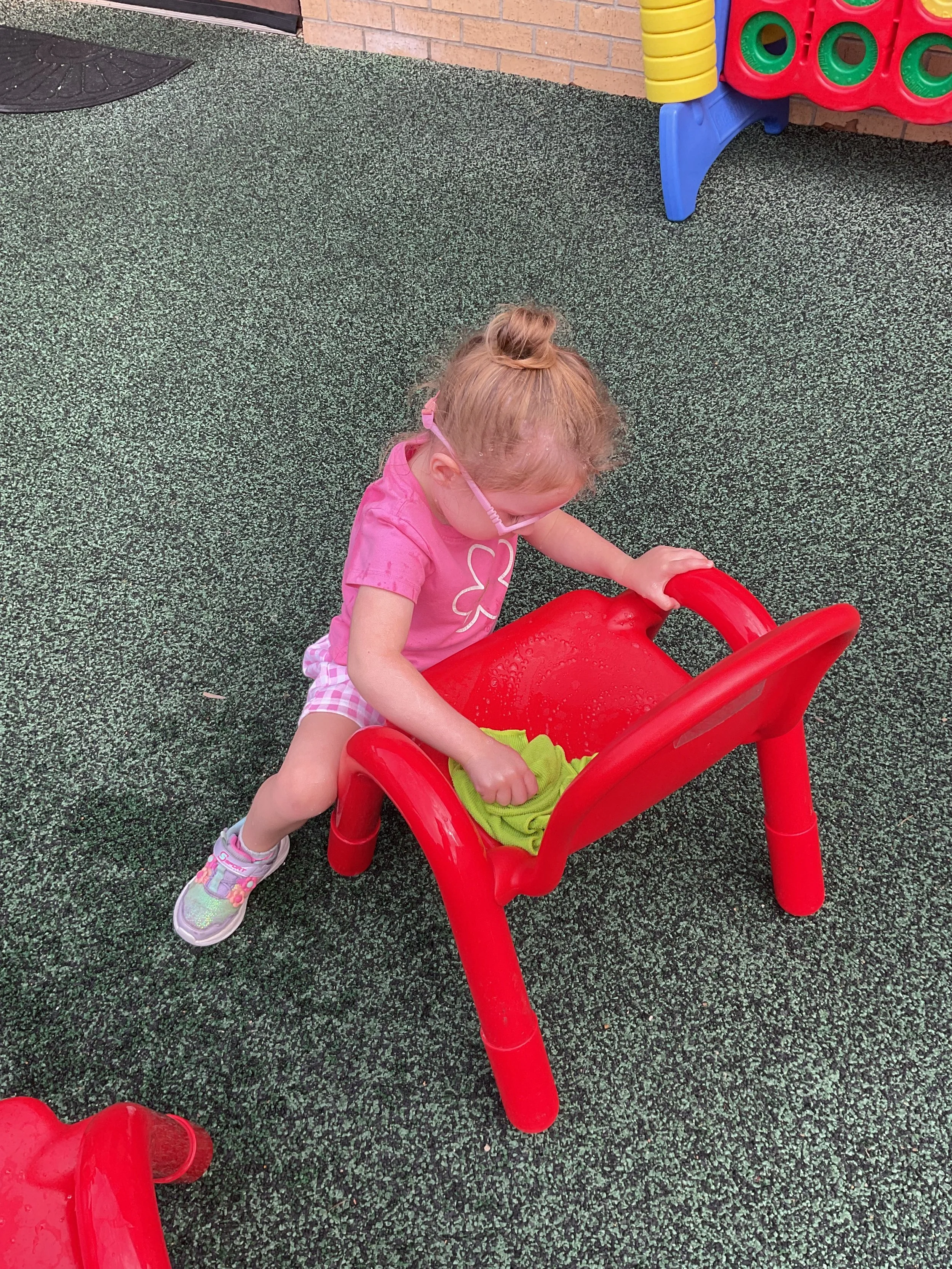 Happy Monday, we are starting this week off learning about opposites! Today, we read How do Dinosaurs Say Good Night? by Jane Yolen. This book talks about the ways you should and shouldn’t act when it’s time for bed. First, during our math and cognition activity, we compared different objects to see what would float and what would sink. Then, for our sensory and science activity, we used rags and water to clean our dirty chairs and talked about how the opposite of dirty is clean. Lastly, for our fine motor and literacy activity, we practiced tracing our names.