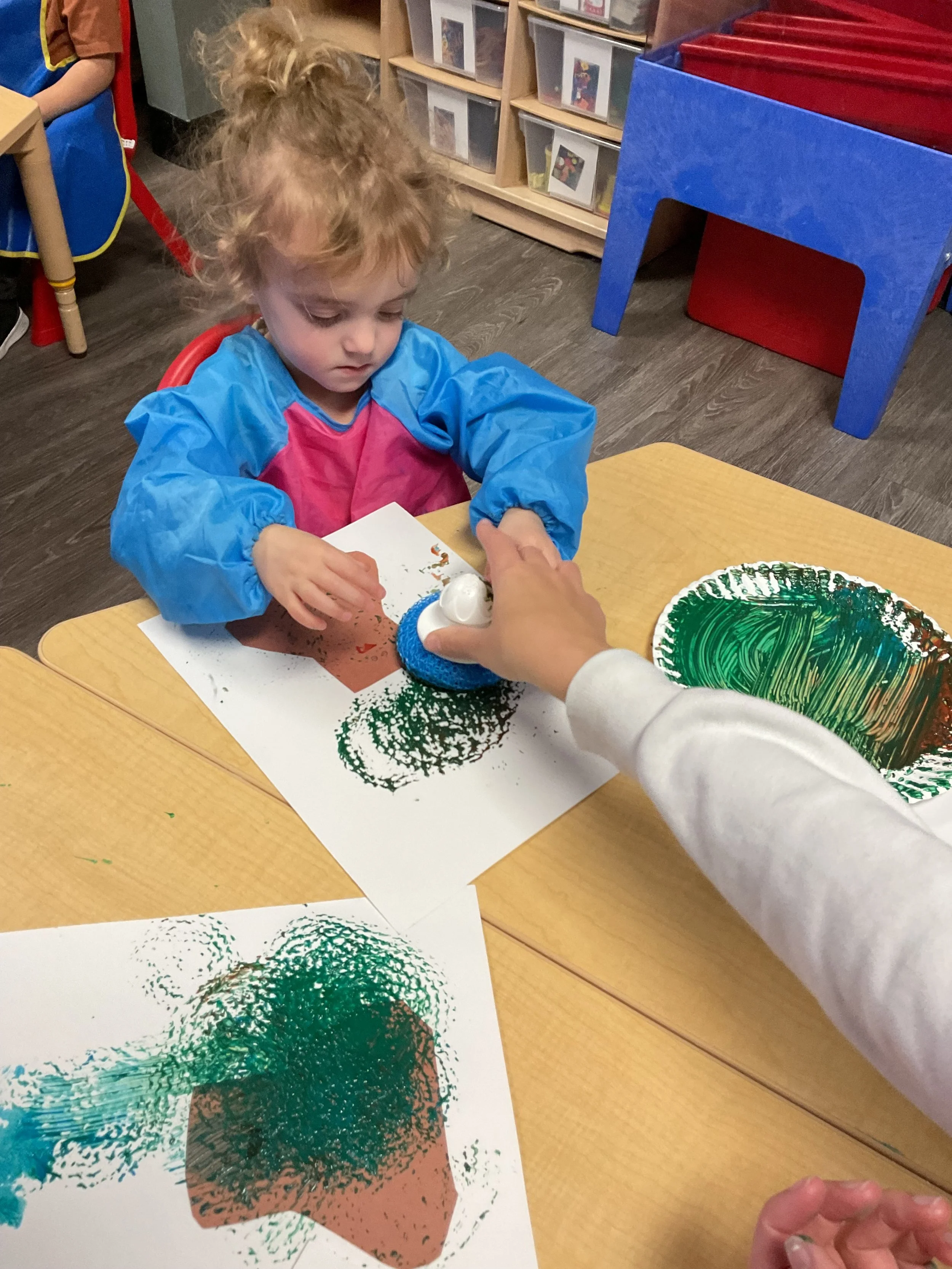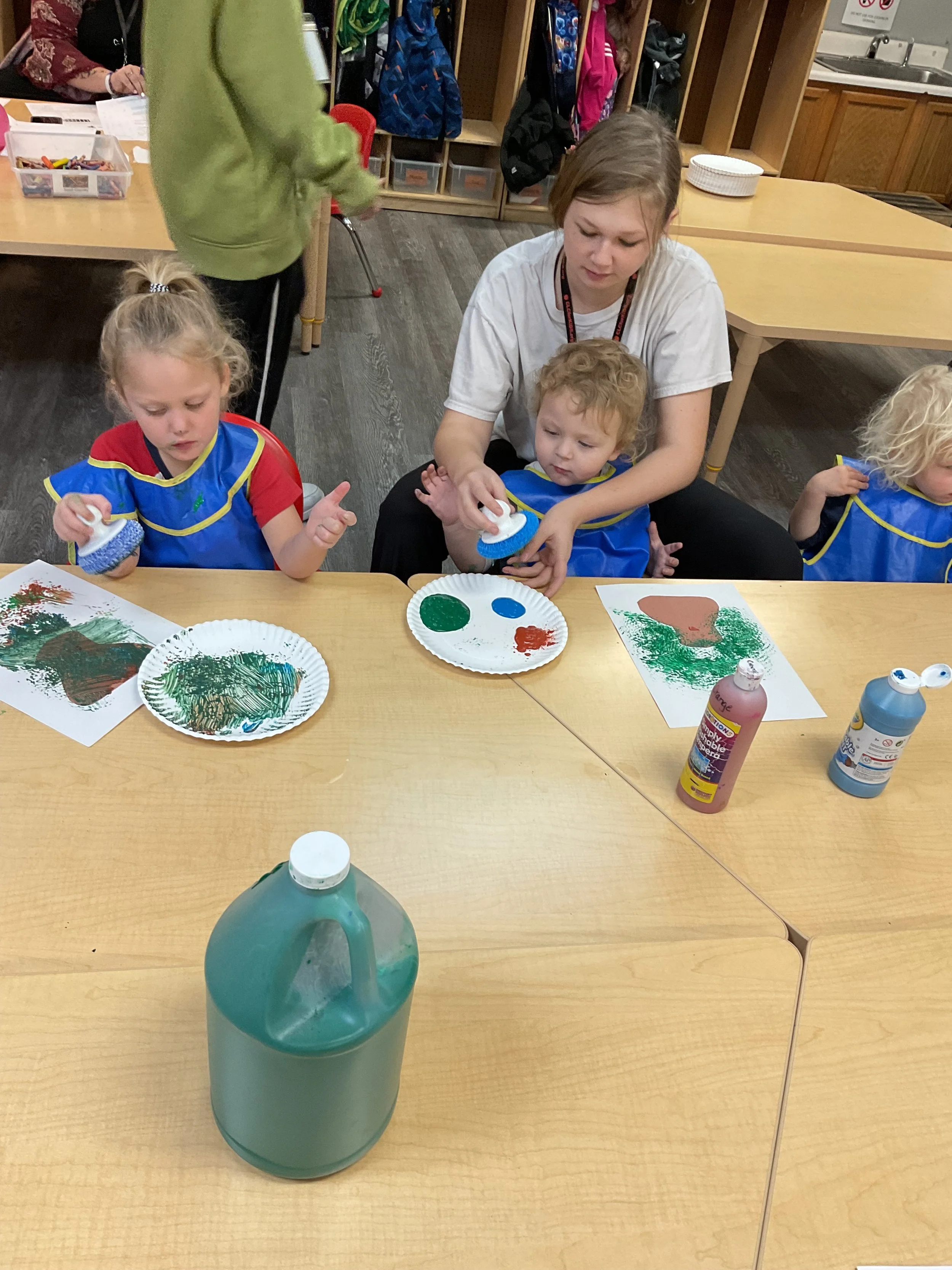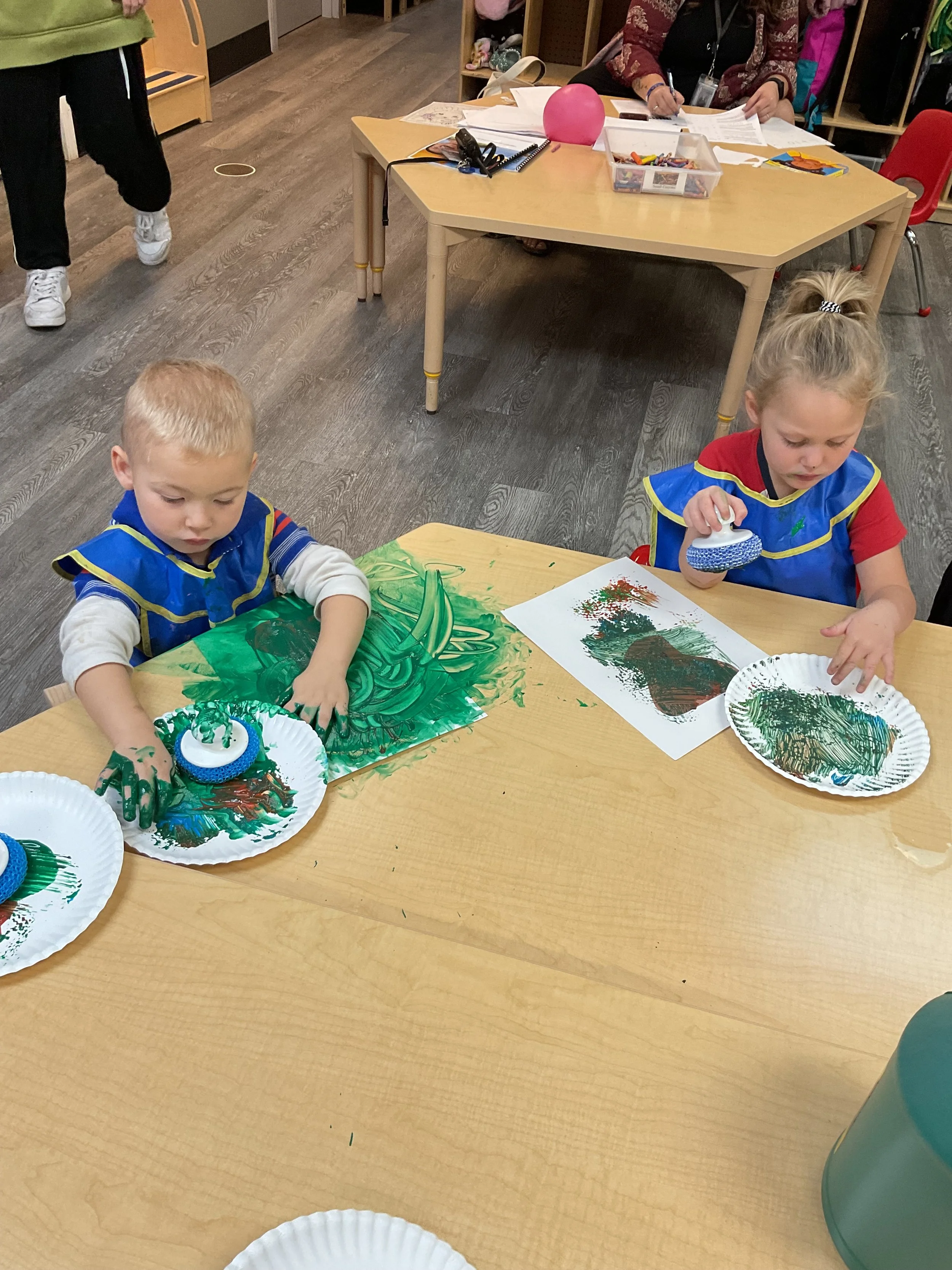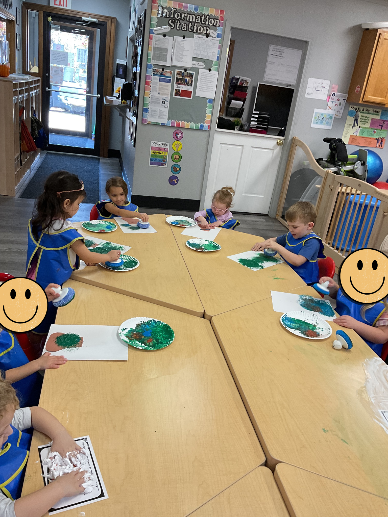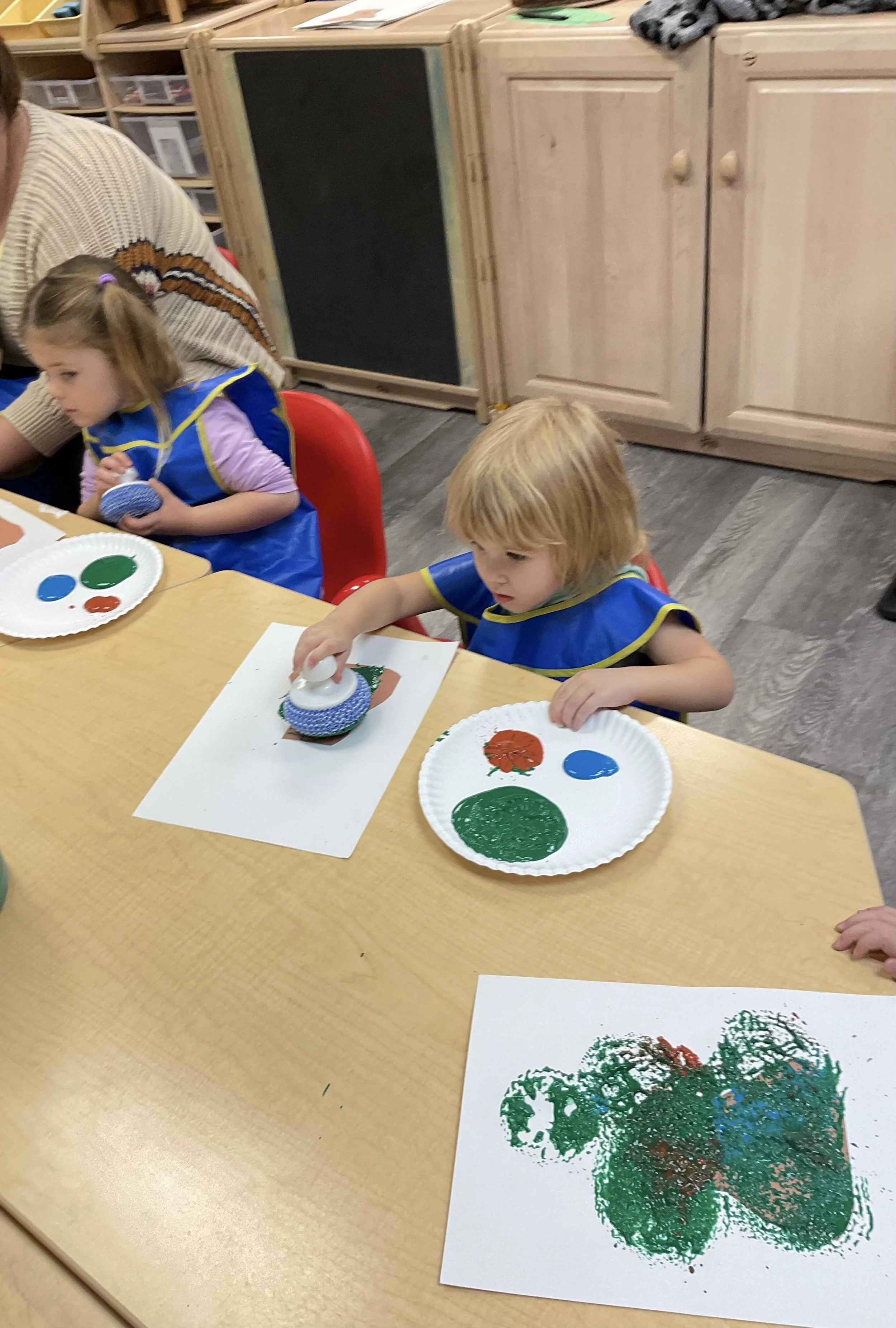 Today we read the book 10 Fat Turkeys by Tony Johnston. This book is about a group of turkeys who were sitting on a fence. One by one they fell off by doing tricks until there were no turkeys left on the fence. For math and cognition time we practiced counting with shaving cream and cut out pies. During our science and sensory time we painted turkeys. Lastly, during fine motor and literacy time we listened to a book on tape.