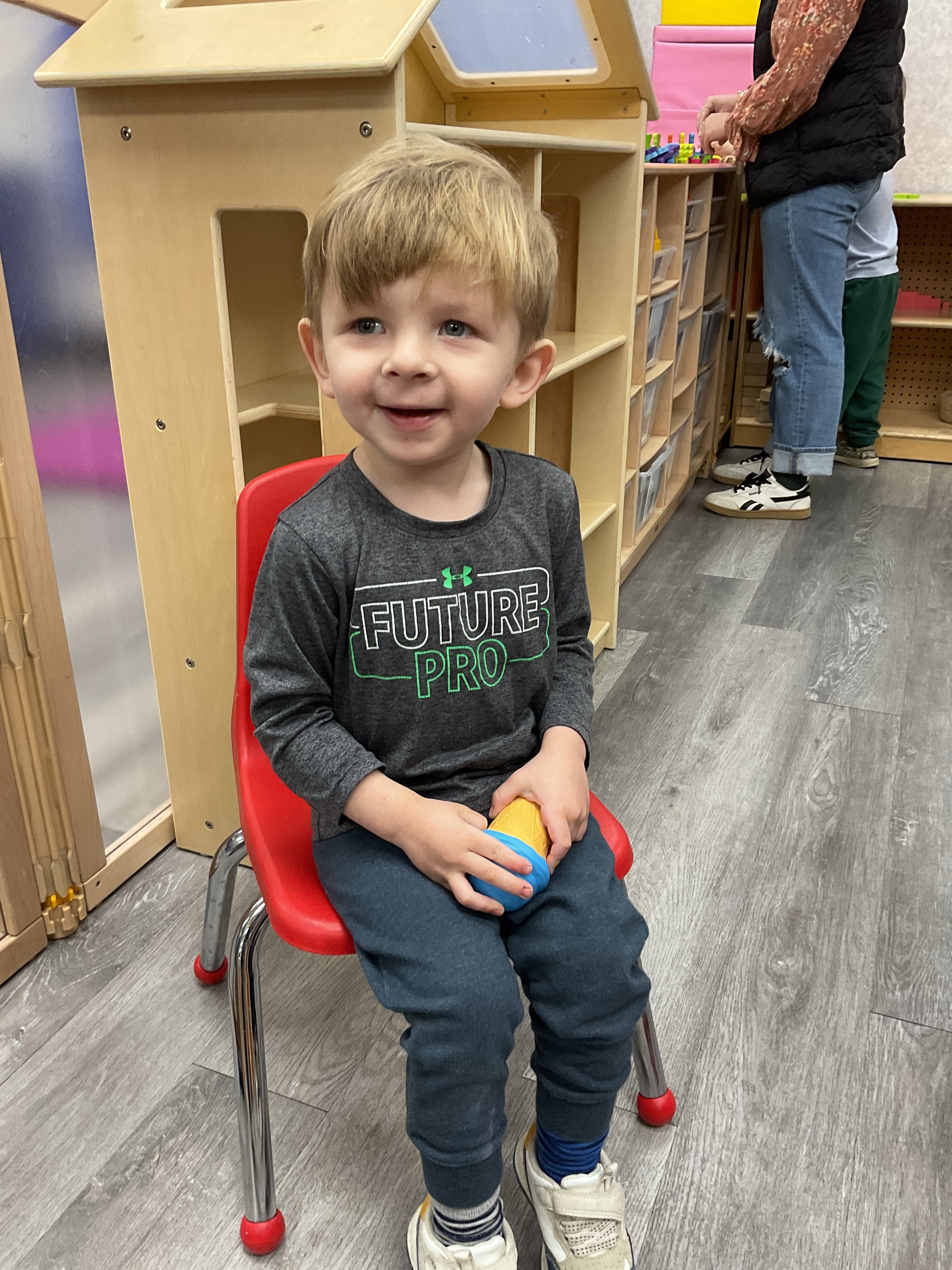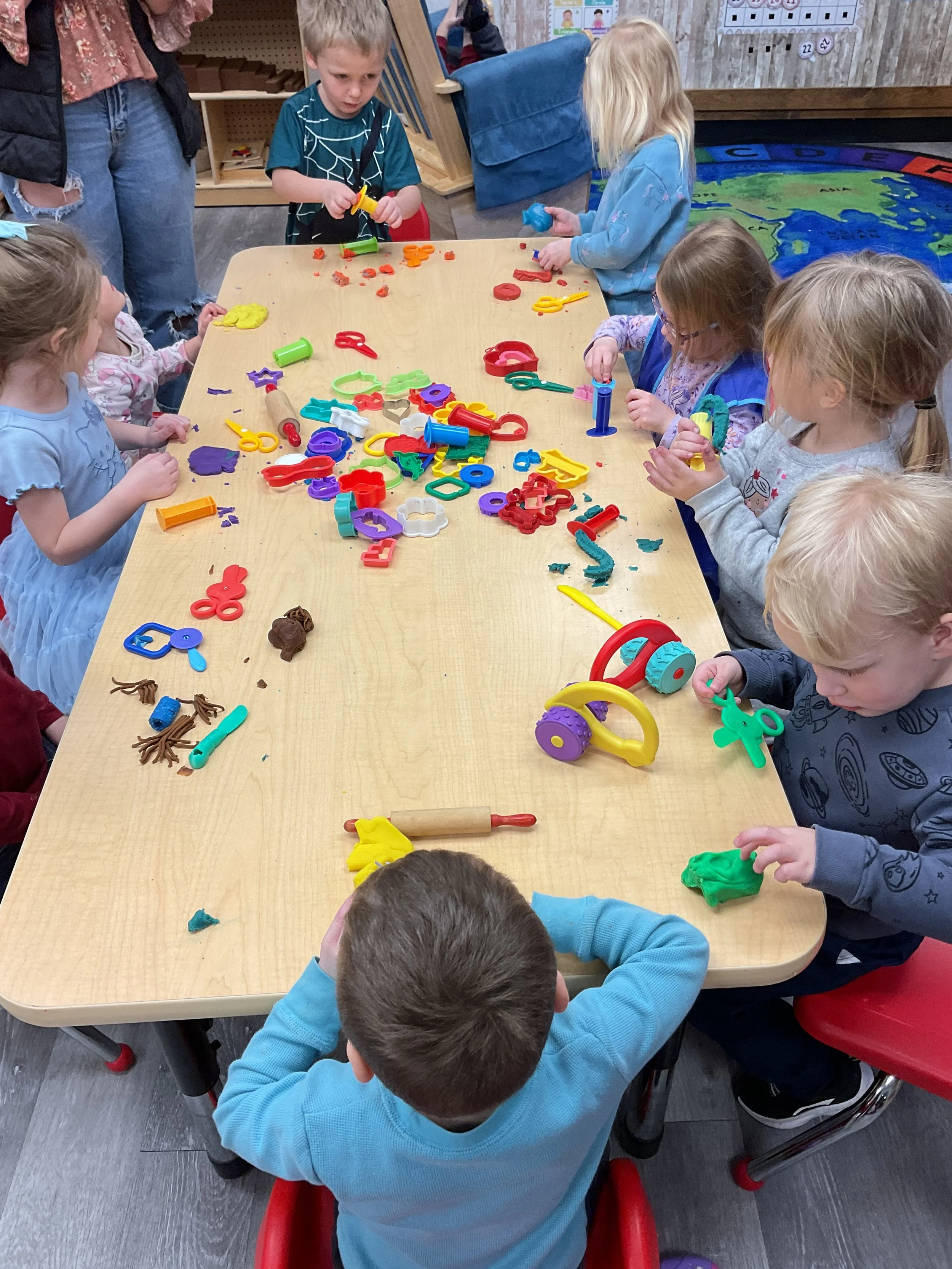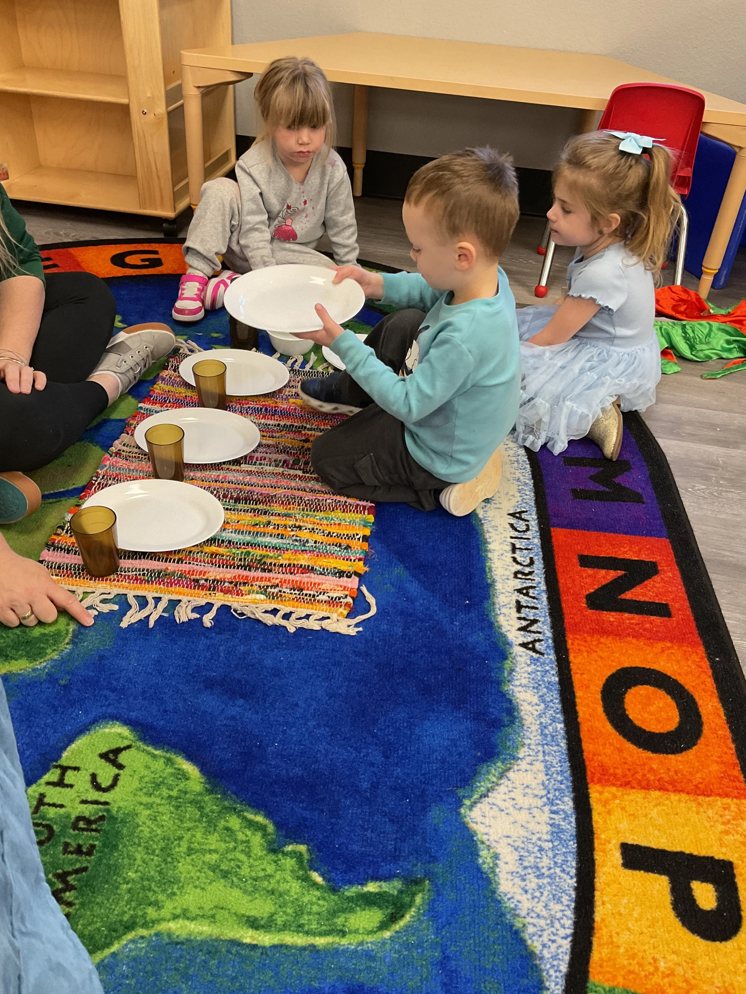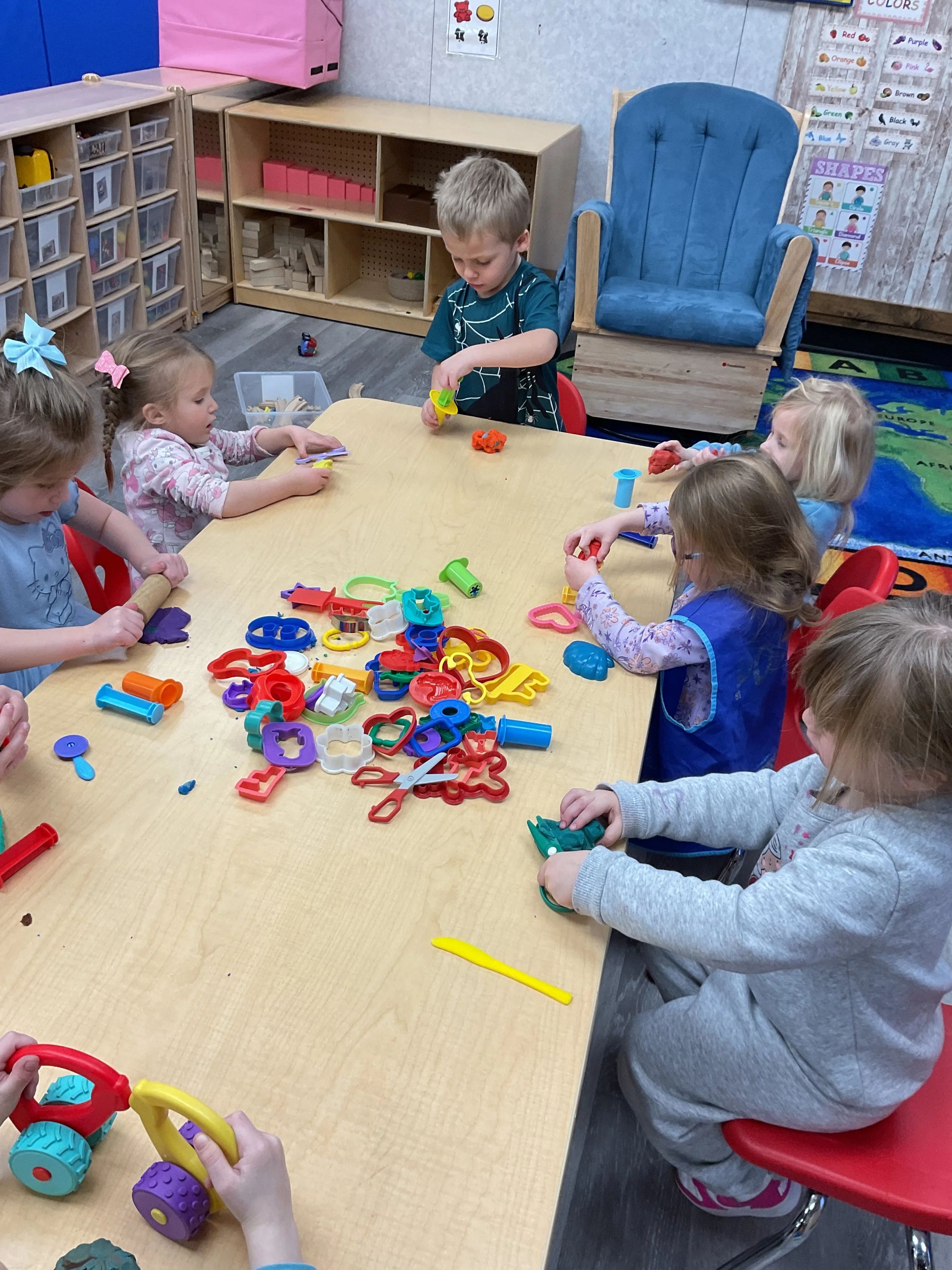 This morning, we read the book Pancakes, Pancakes written and illustrated by Eric Carle. During our music and movement time, we had a fun obstacle course to go through! Then, during our math and cognition lesson, we used dishes from the kitchen to make patterns. Next, for our science and sensory lesson, we used playdough to make our favorite foods. Finally, for our literacy and fine motor lesson, we worked on our cutting skills.