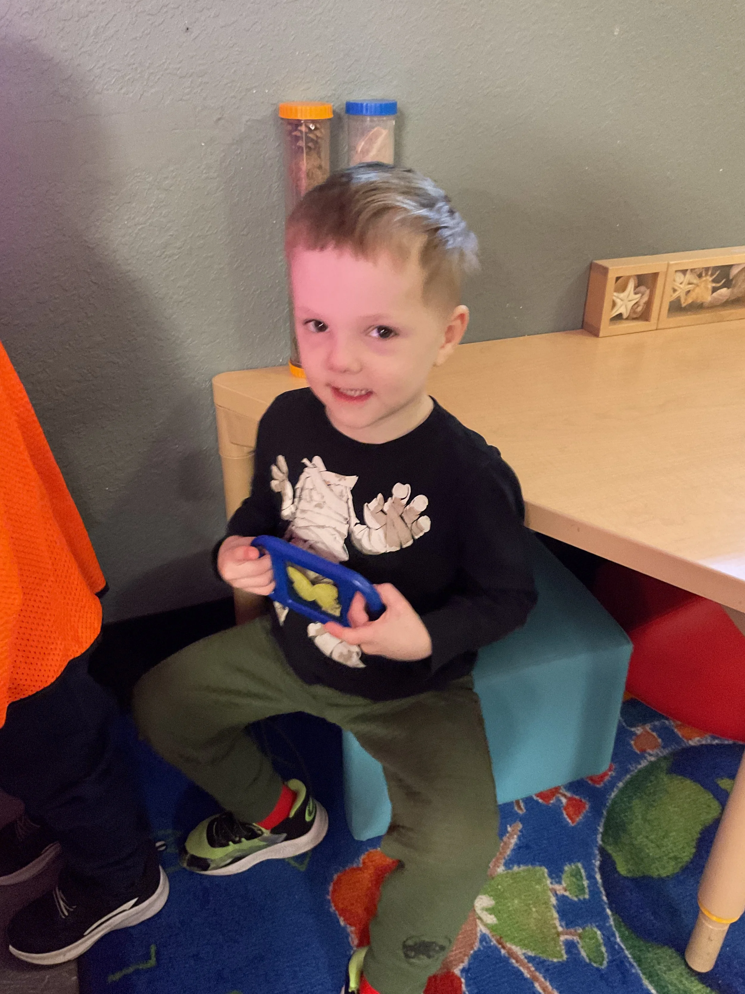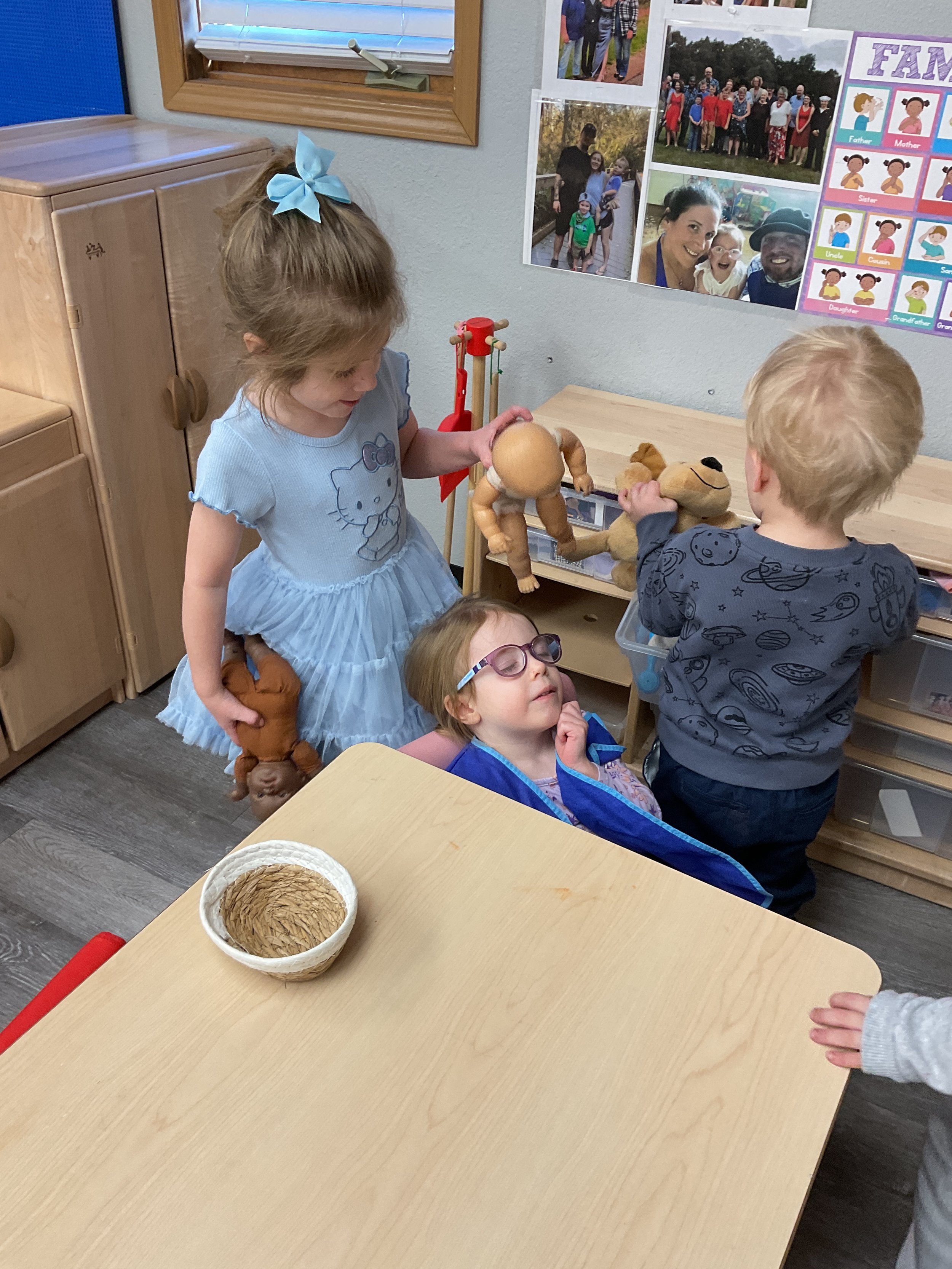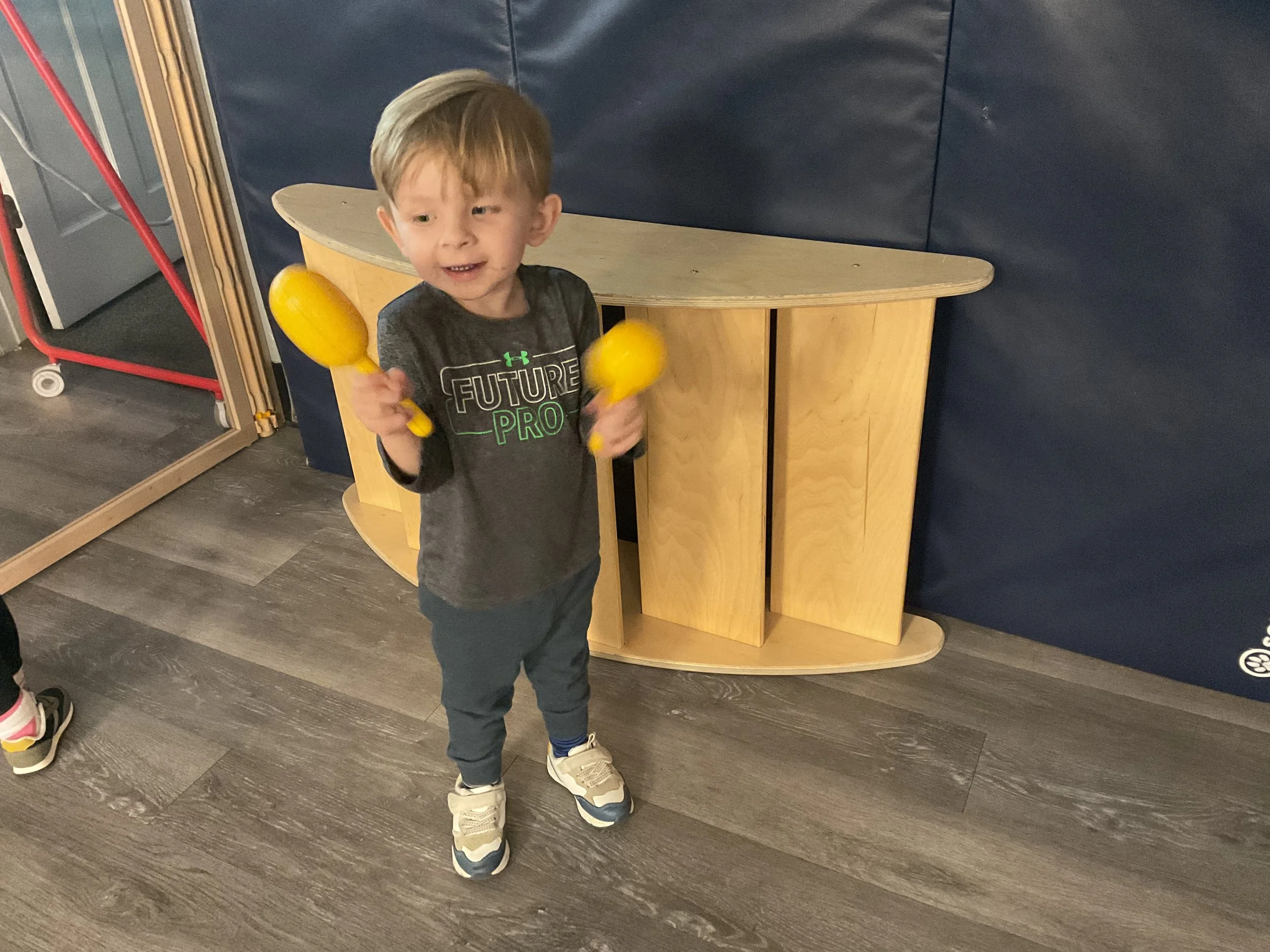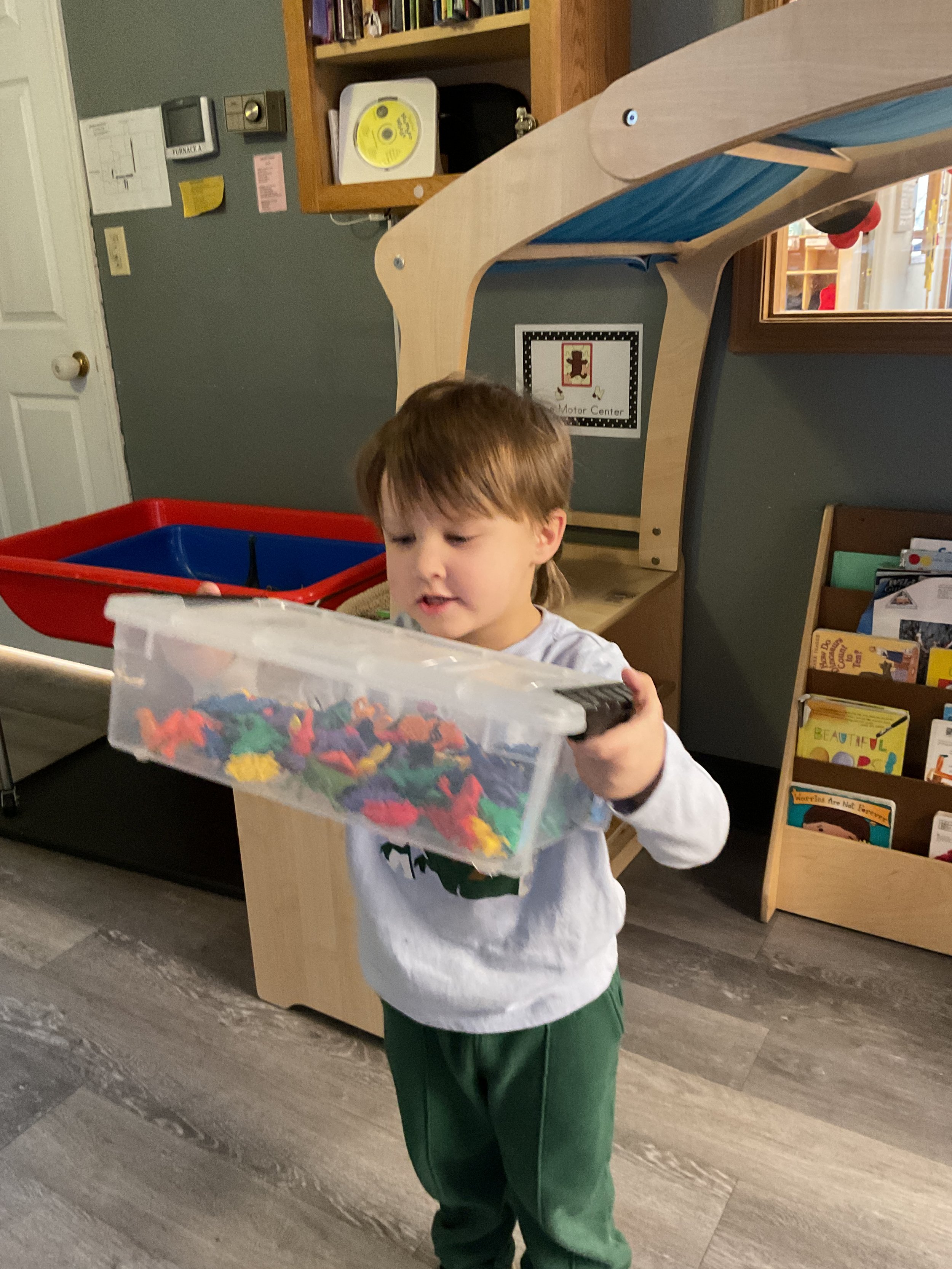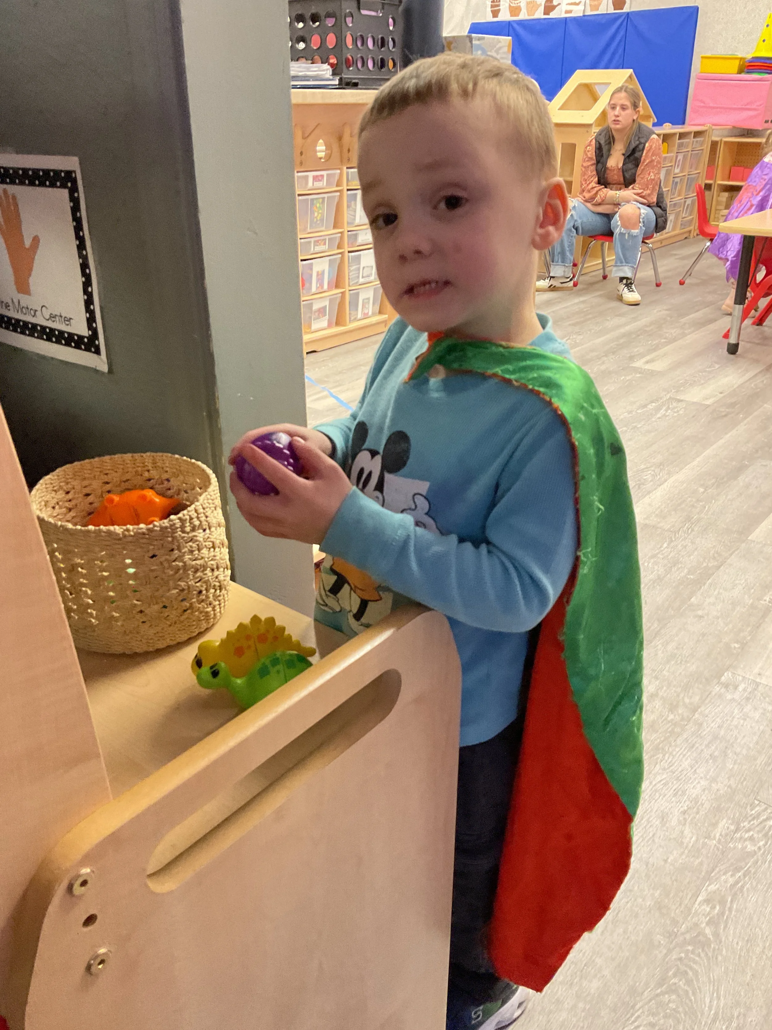 This morning, we read the book Pancakes, Pancakes written and illustrated by Eric Carle. During our music and movement time, we had a fun obstacle course to go through! Then, during our math and cognition lesson, we used dishes from the kitchen to make patterns. Next, for our science and sensory lesson, we used playdough to make our favorite foods. Finally, for our literacy and fine motor lesson, we worked on our cutting skills.