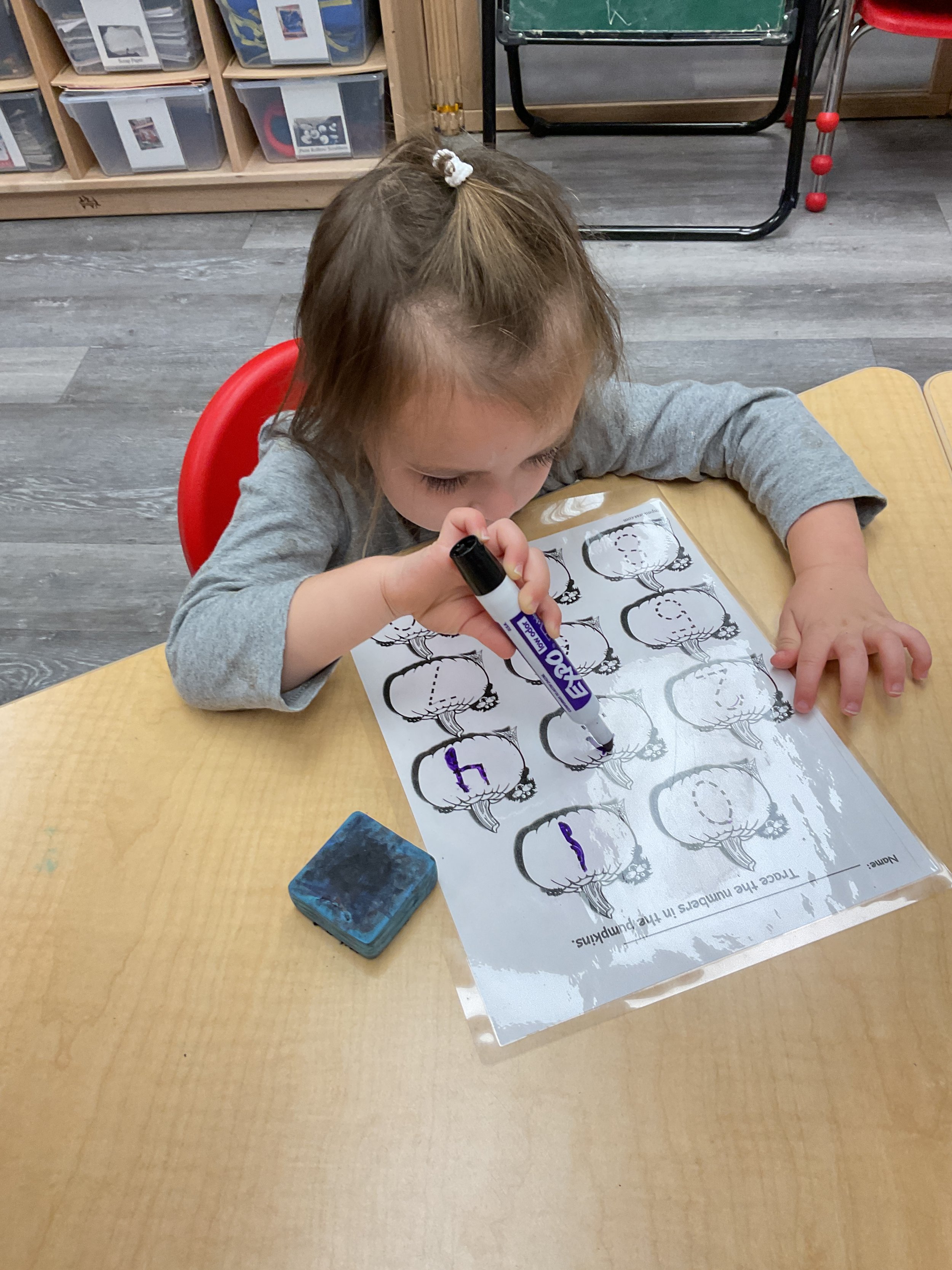 This morning, we read the book The Runaway Pumpkin written by Kevin Lewis and illustrated by S.D. Schindler. During our music and movement time, we stretched our bodies with yoga poses. Next, during our math and cognition lesson, we practiced tracing numbers. Then, during our science and sensory lesson, we felt how smooth a pumpkin can be. Finally, for our fine motor and literacy lesson, we practiced lacing.