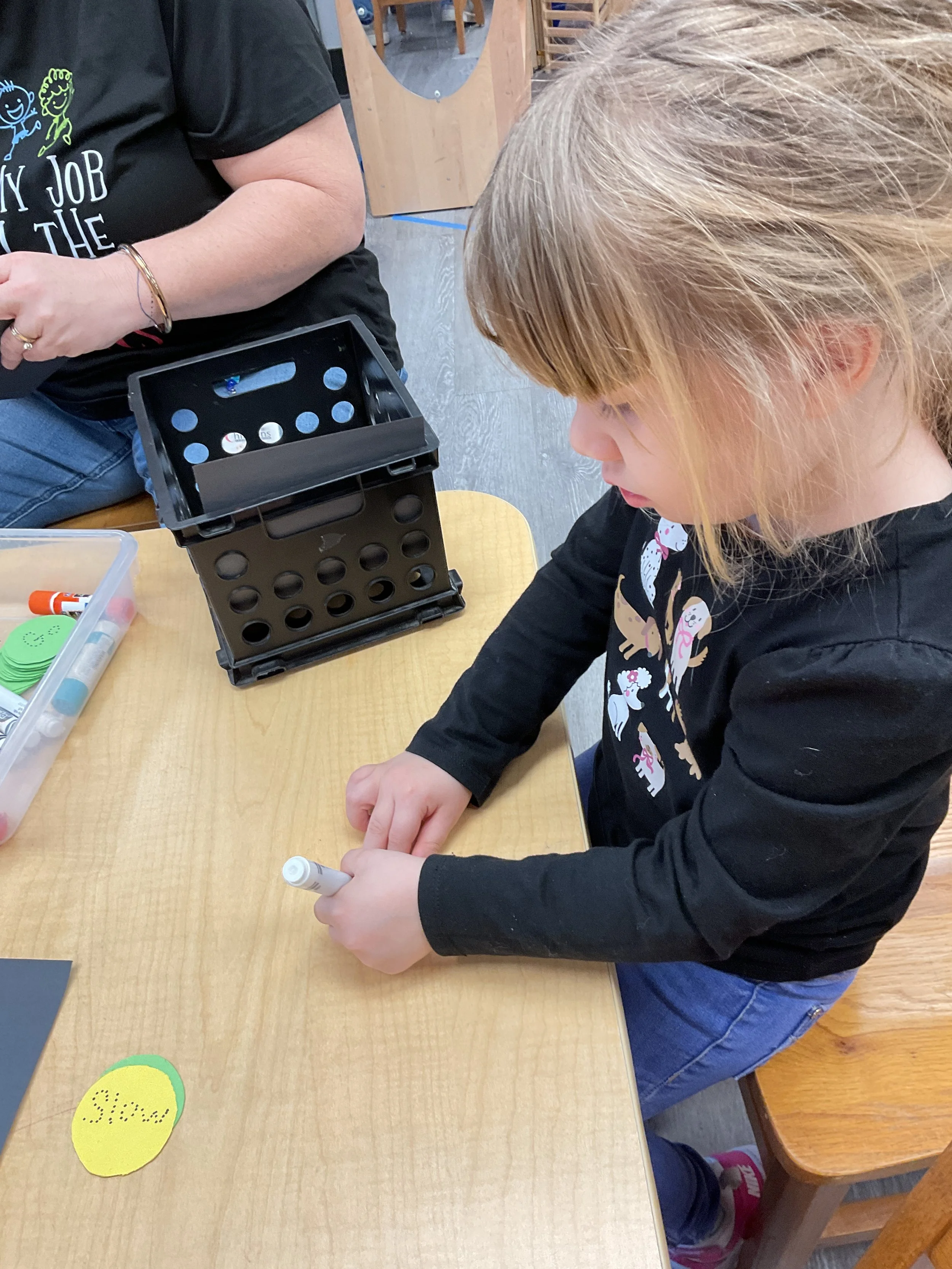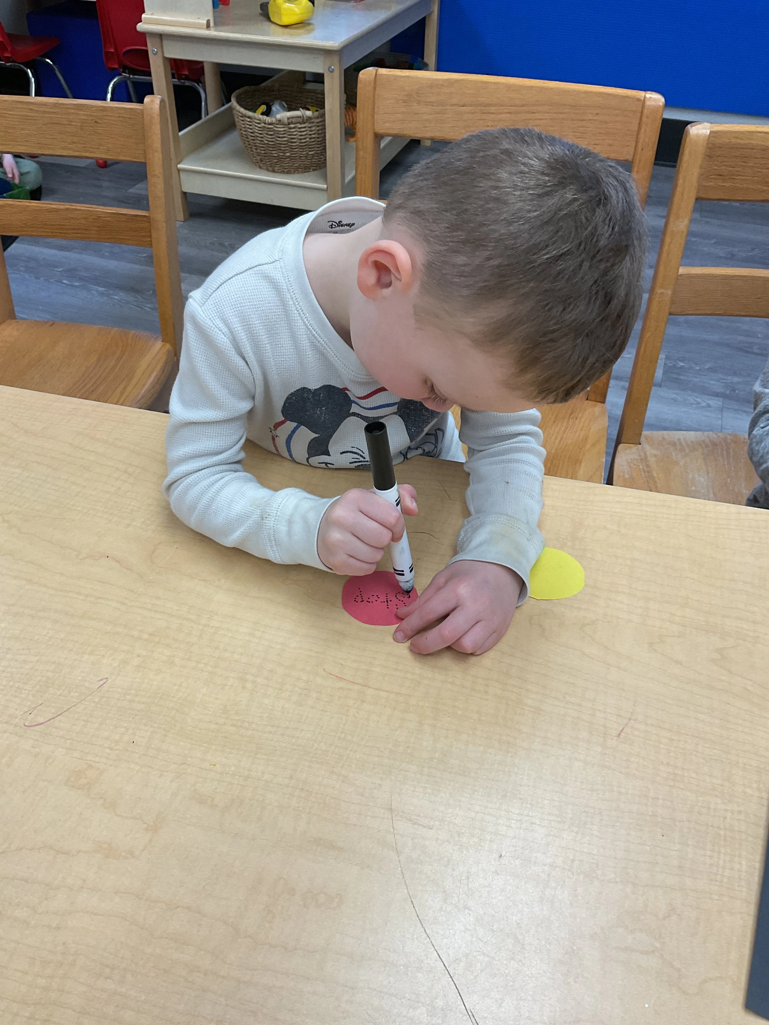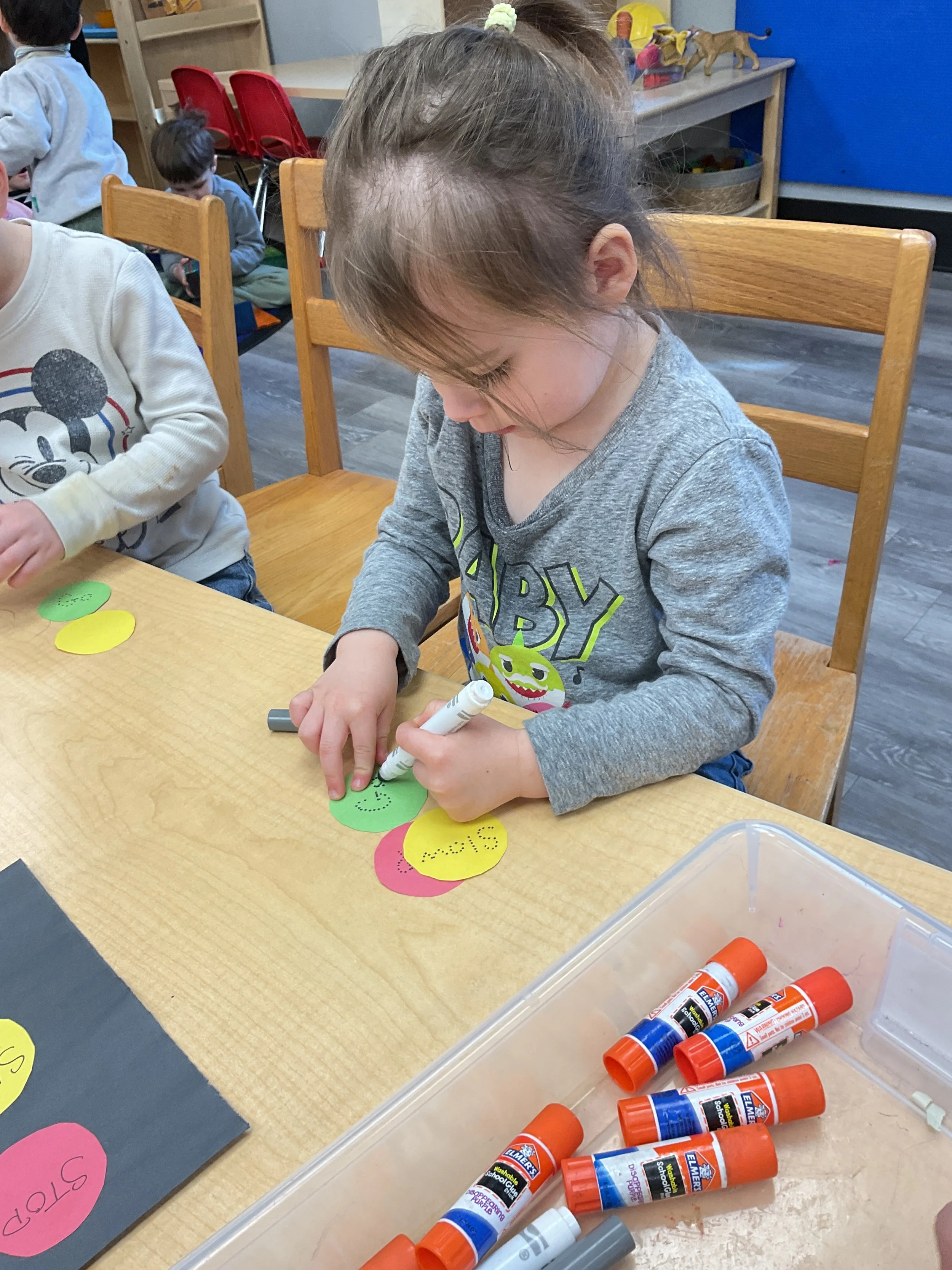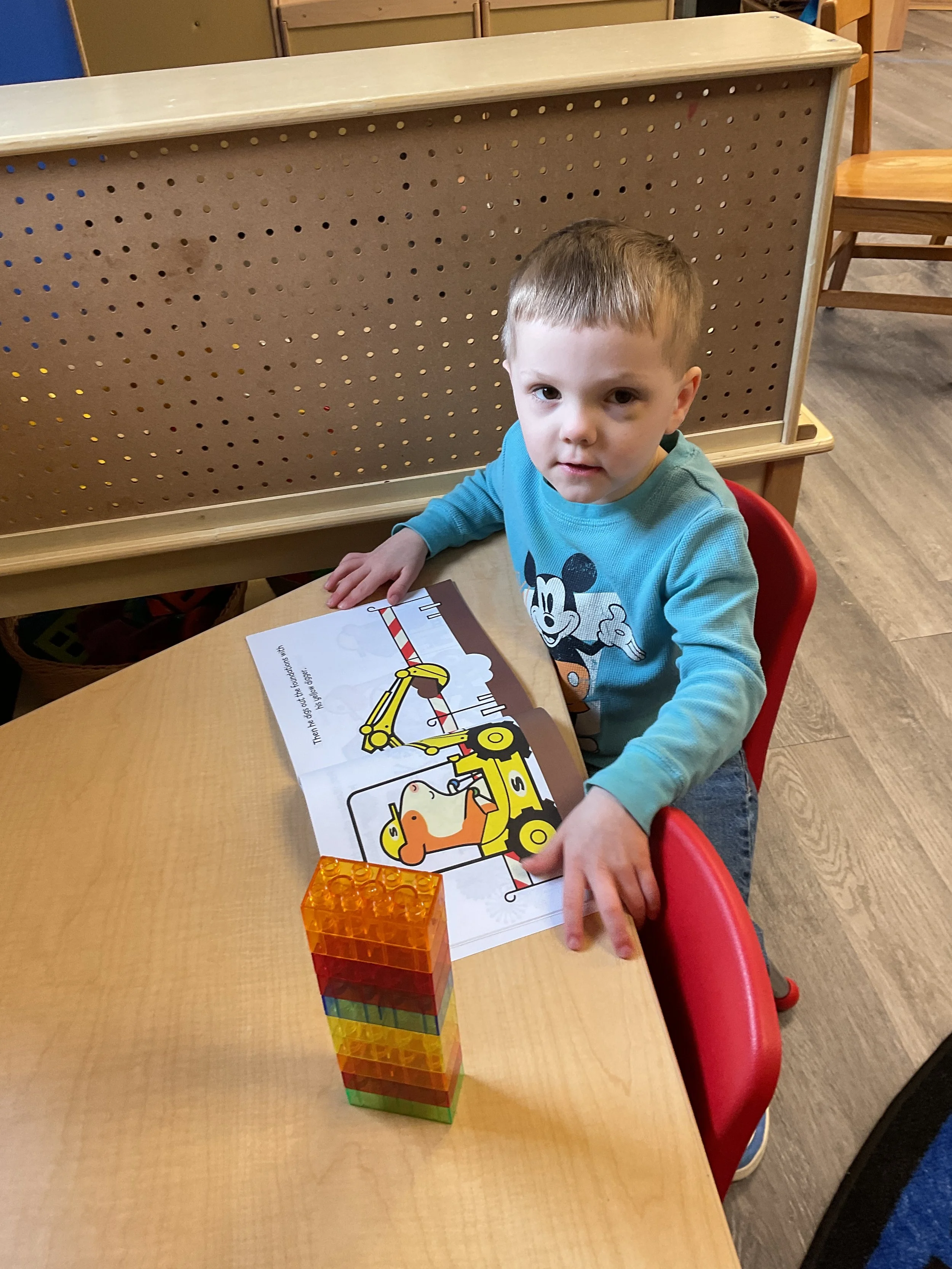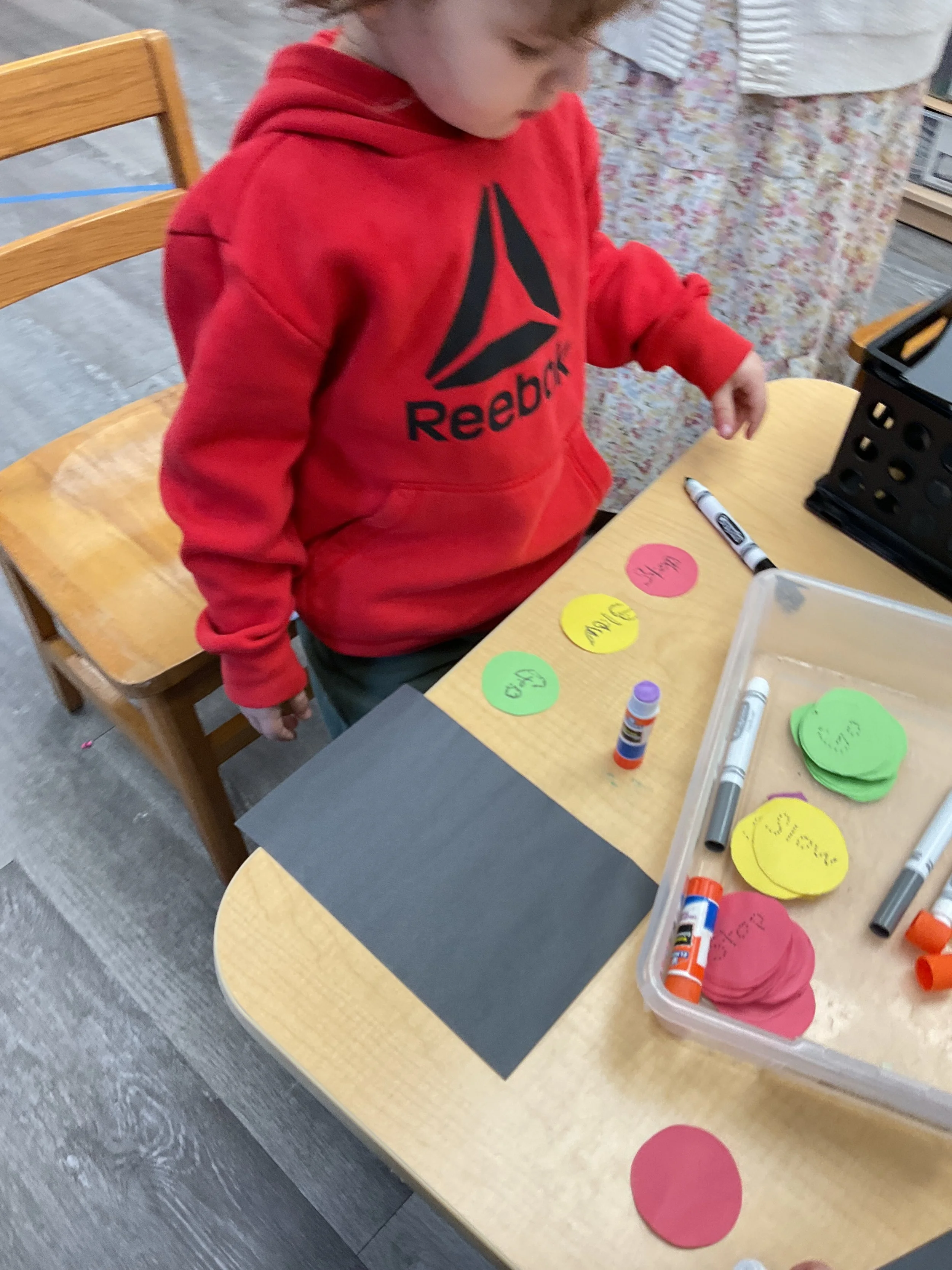 This morning, we read the book Push! Dig! Scoop! written by Rhonda Gowler Greene and illustrated by Daniel Kirk. During our music and movement time, we played Red Light, Green Light. We really liked walking like crabs during our game. Then, during our math and cognition lesson, we sorted different modes of transportation by size. Next, for our science and sensory lesson, we made a stoplight. Finally, for our literacy and fine motor lesson, we listened to a book on tape.