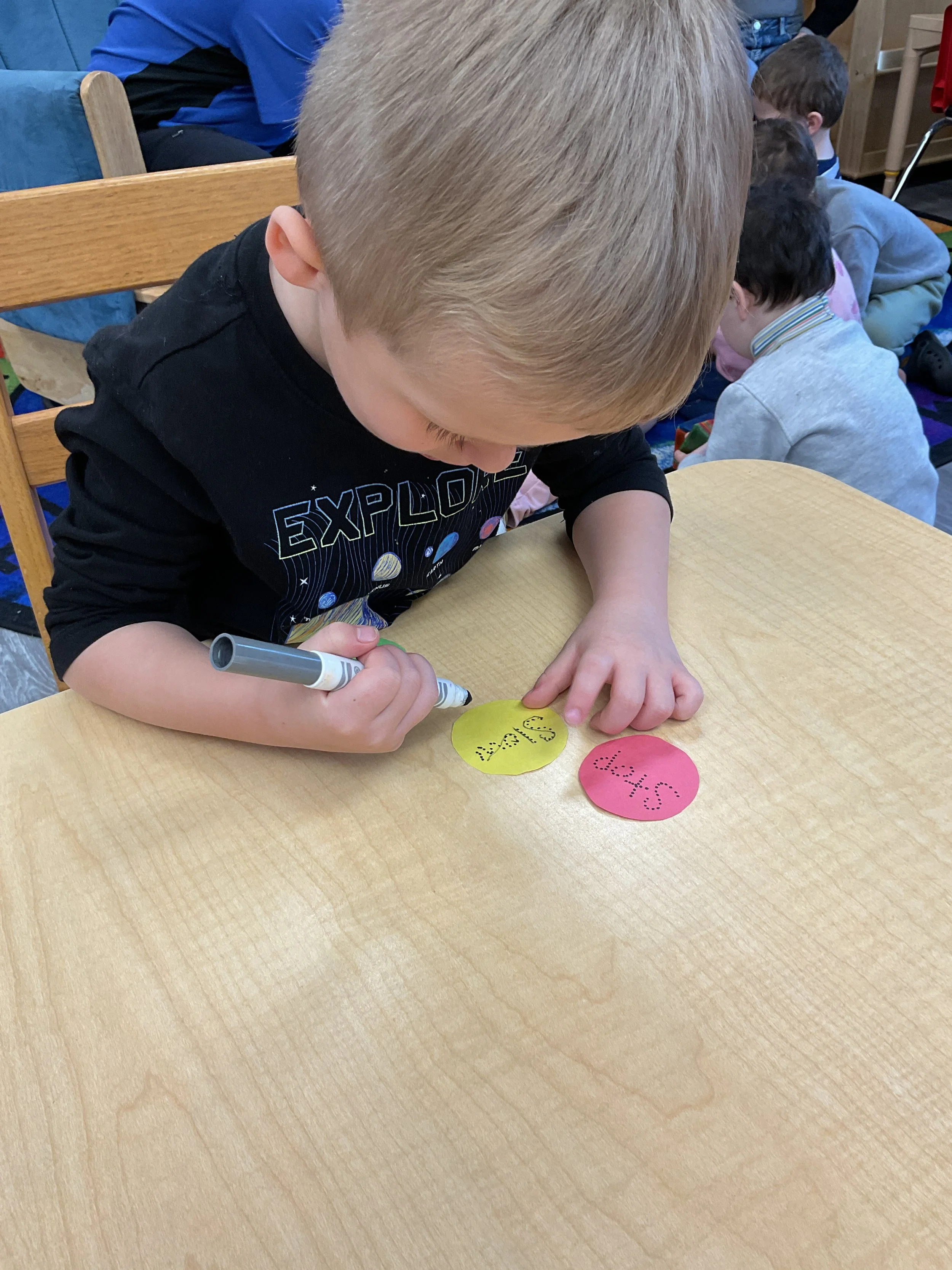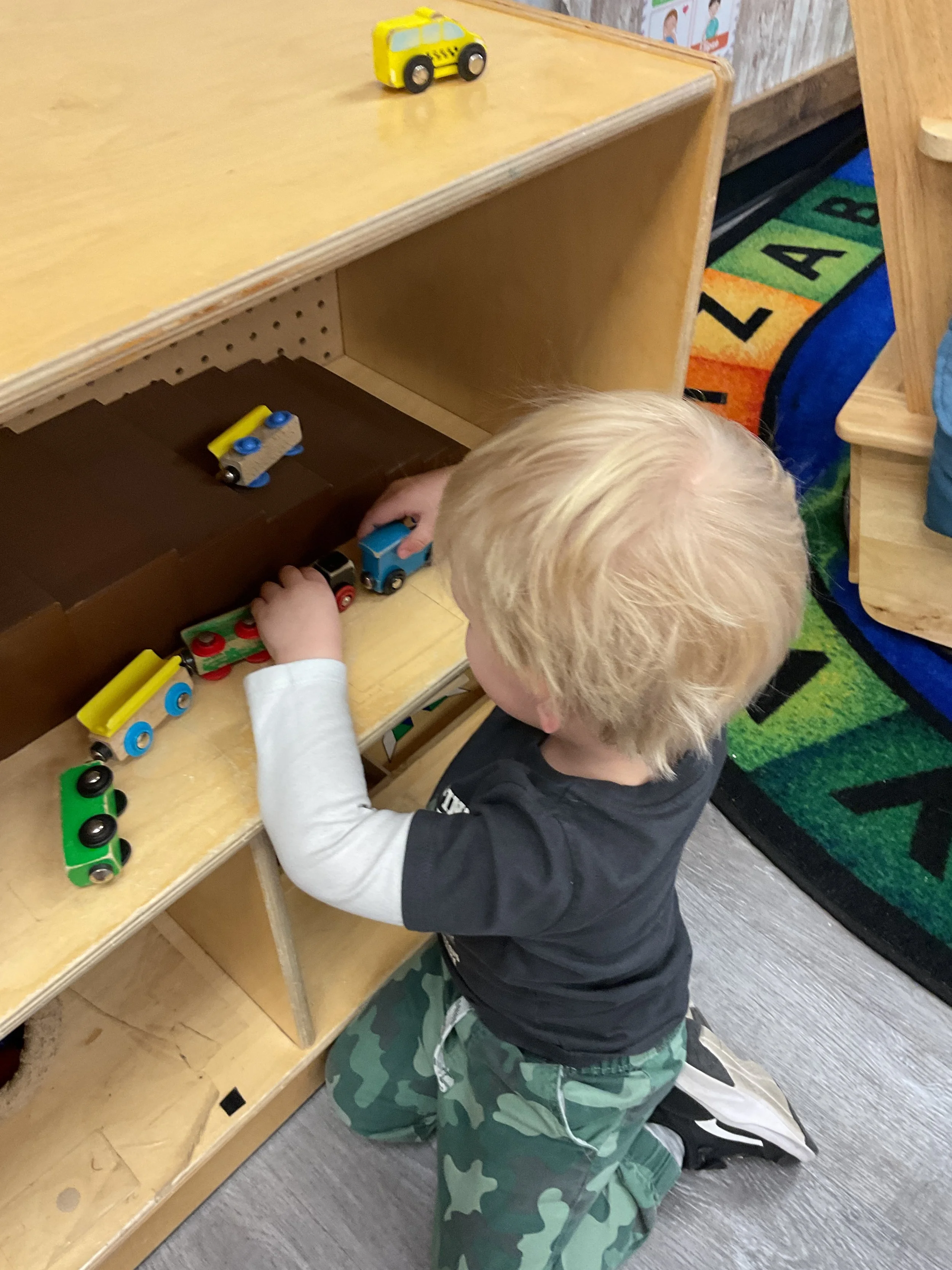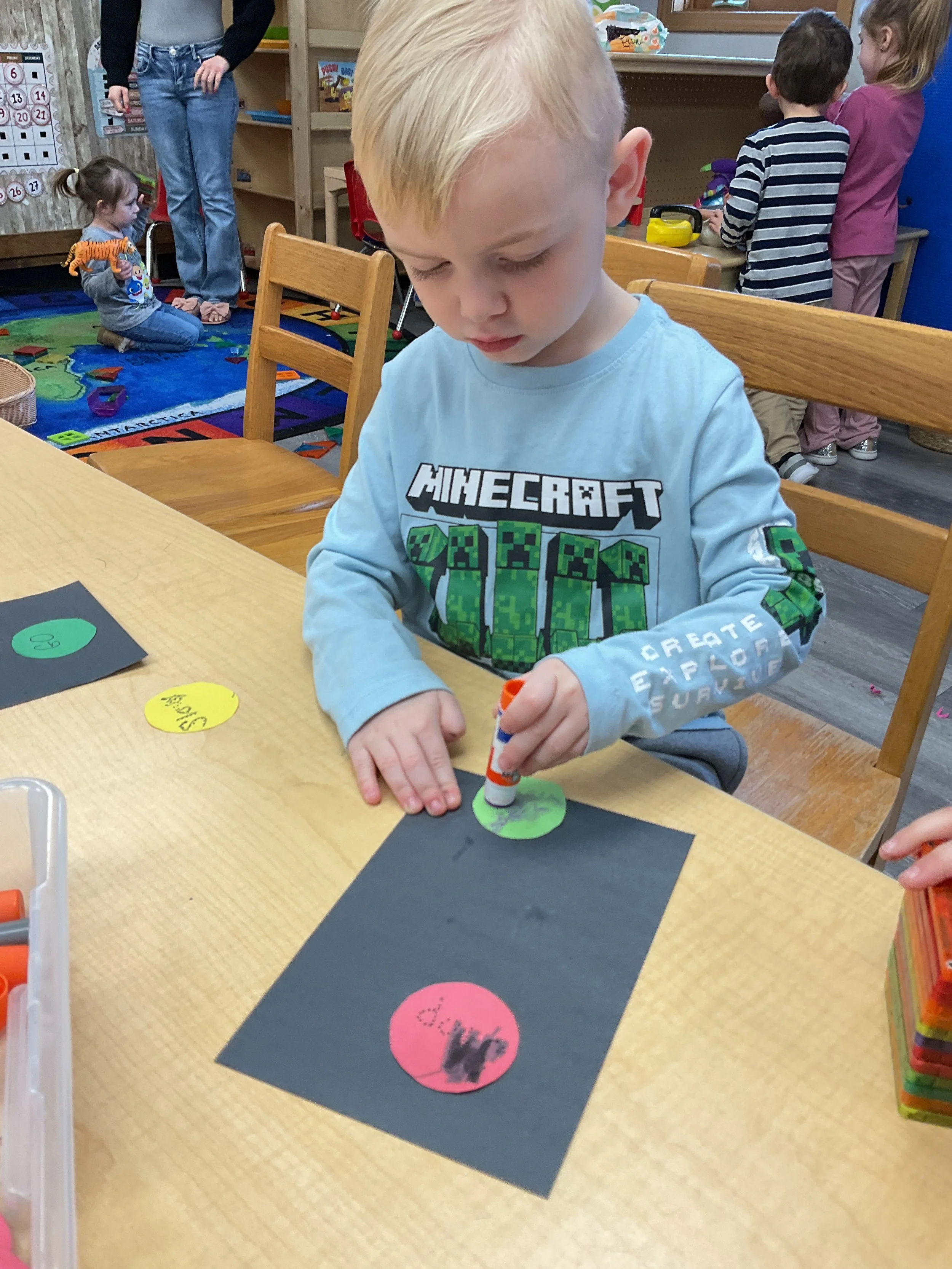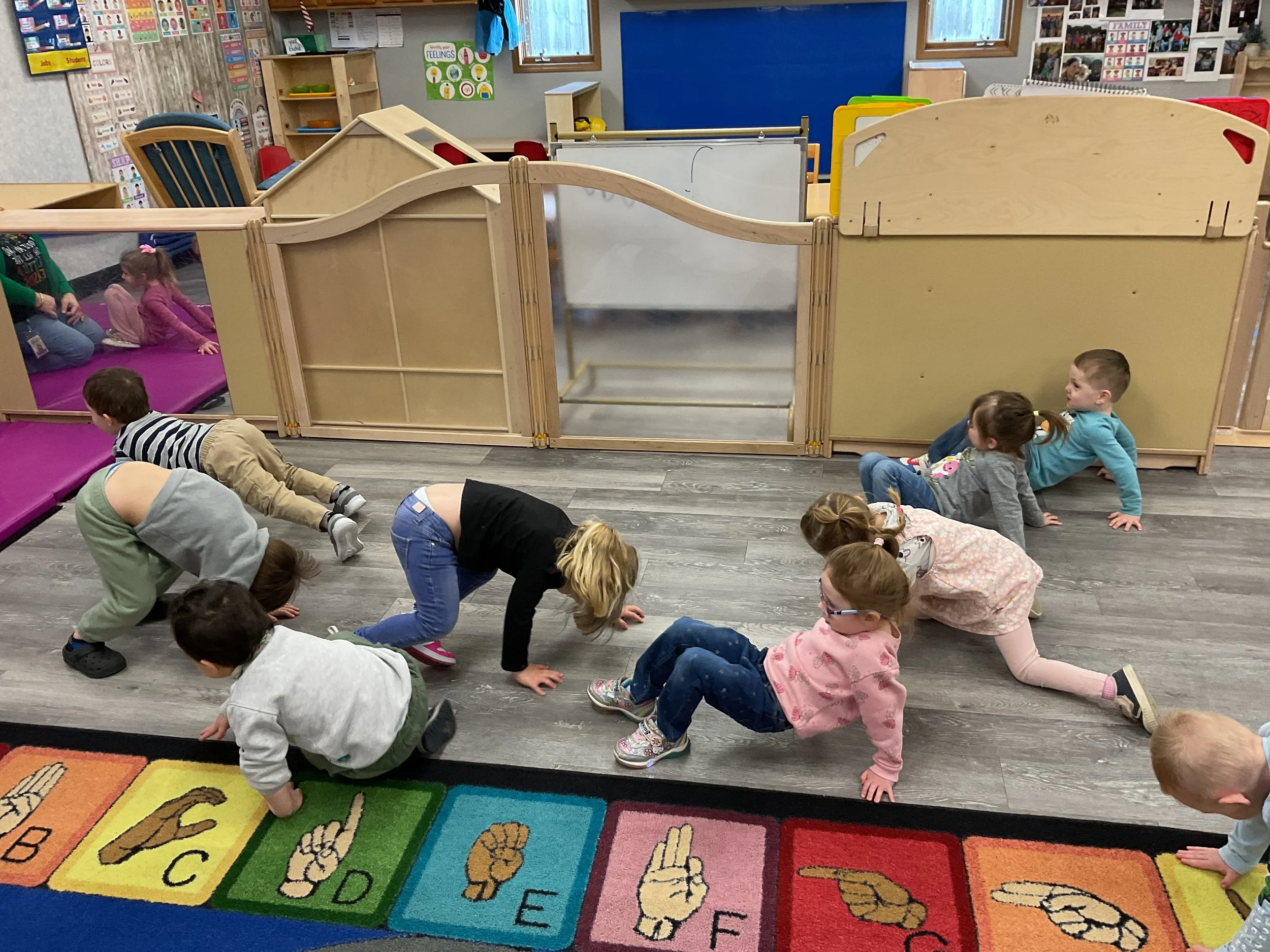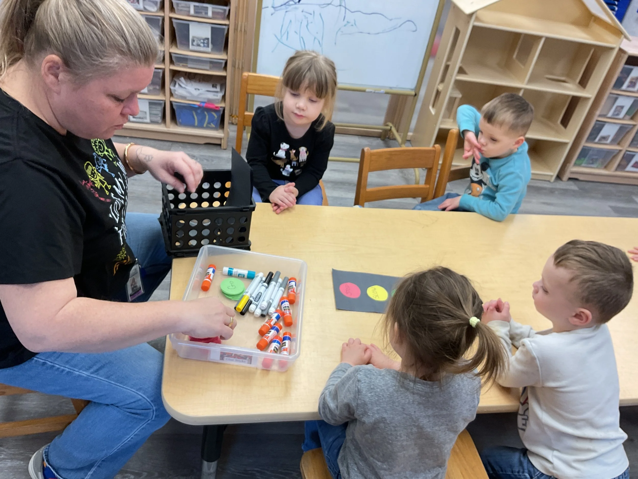 This morning, we read the book Push! Dig! Scoop! written by Rhonda Gowler Greene and illustrated by Daniel Kirk. During our music and movement time, we played Red Light, Green Light. We really liked walking like crabs during our game. Then, during our math and cognition lesson, we sorted different modes of transportation by size. Next, for our science and sensory lesson, we made a stoplight. Finally, for our literacy and fine motor lesson, we listened to a book on tape.