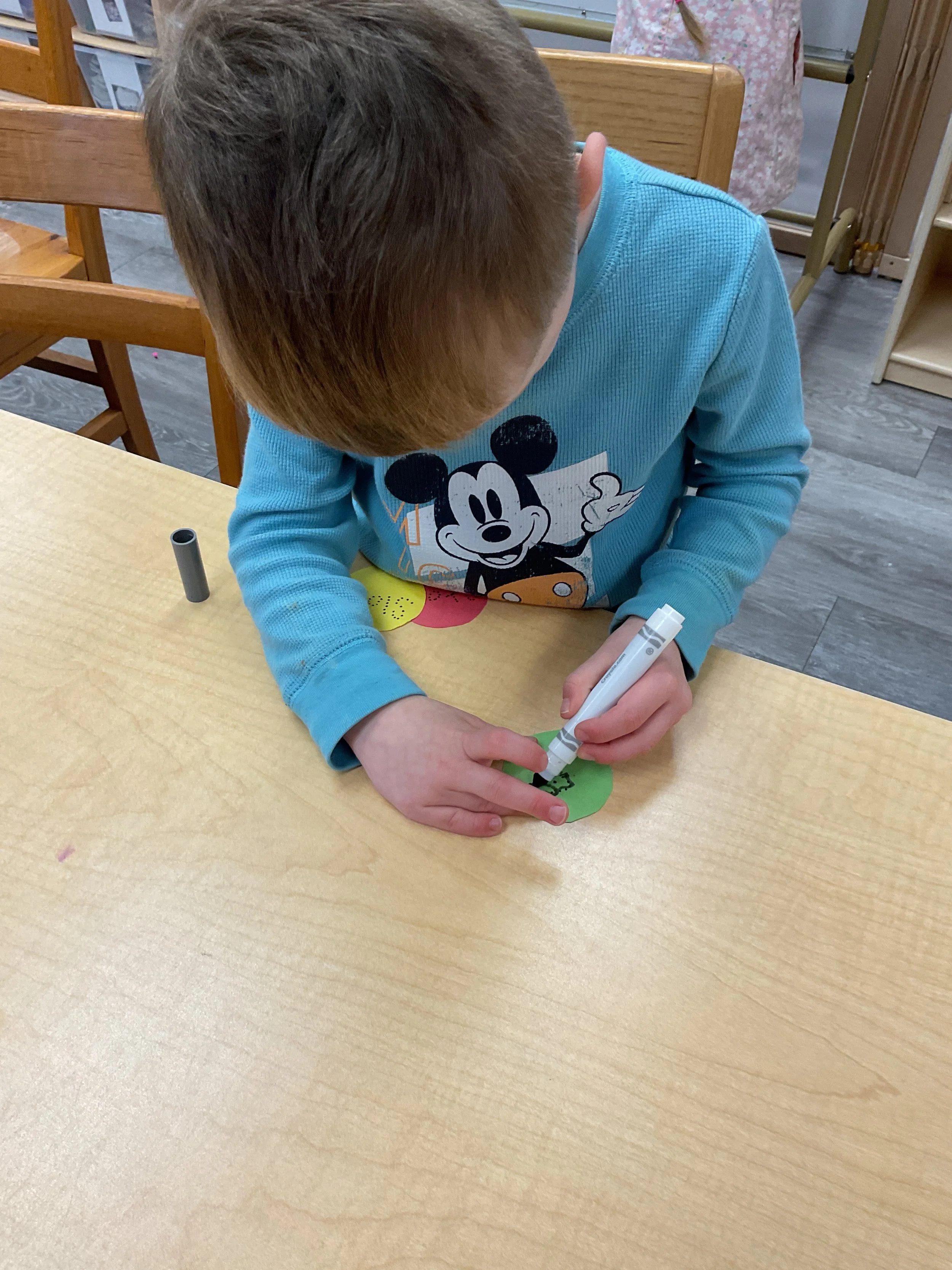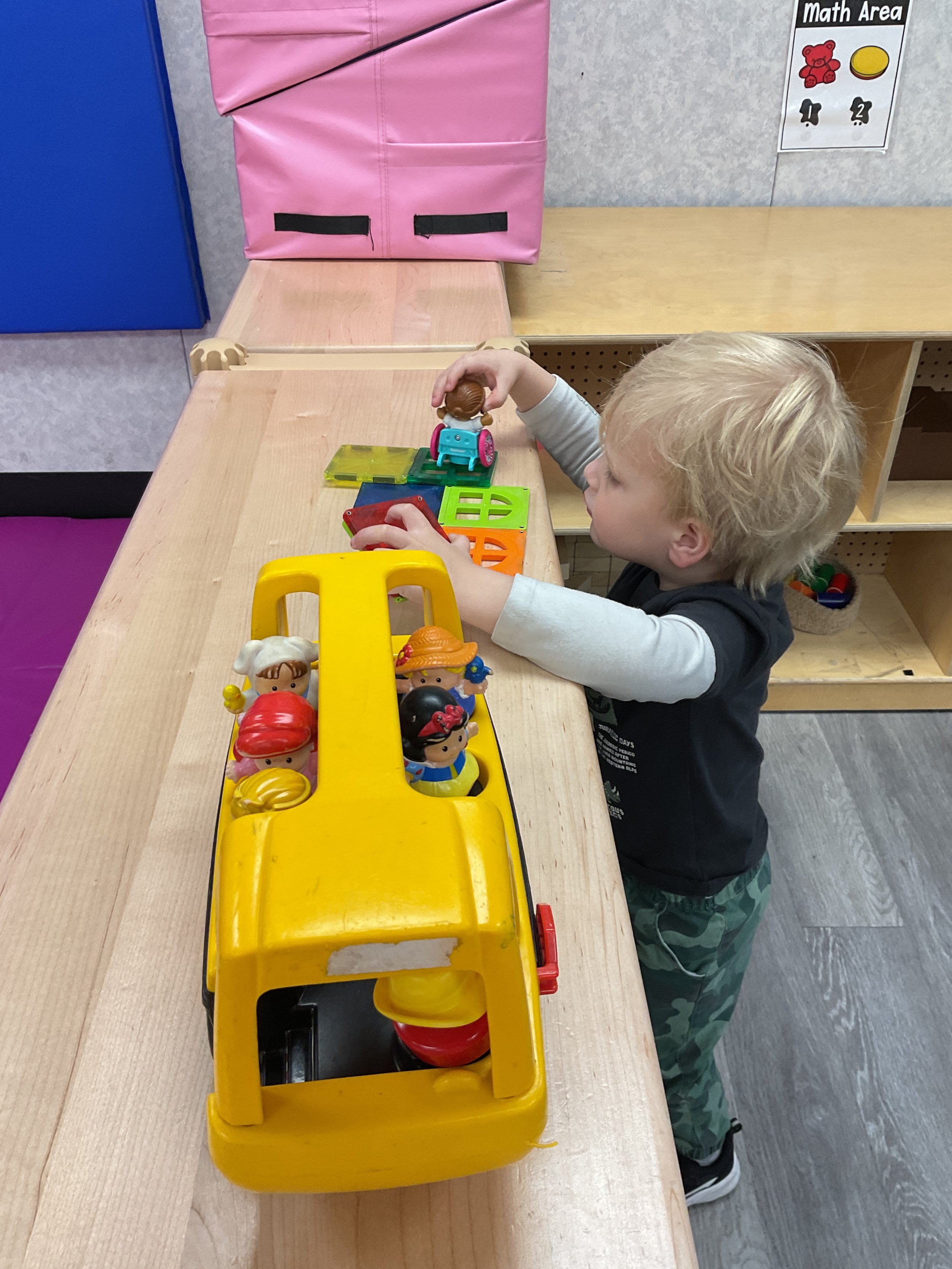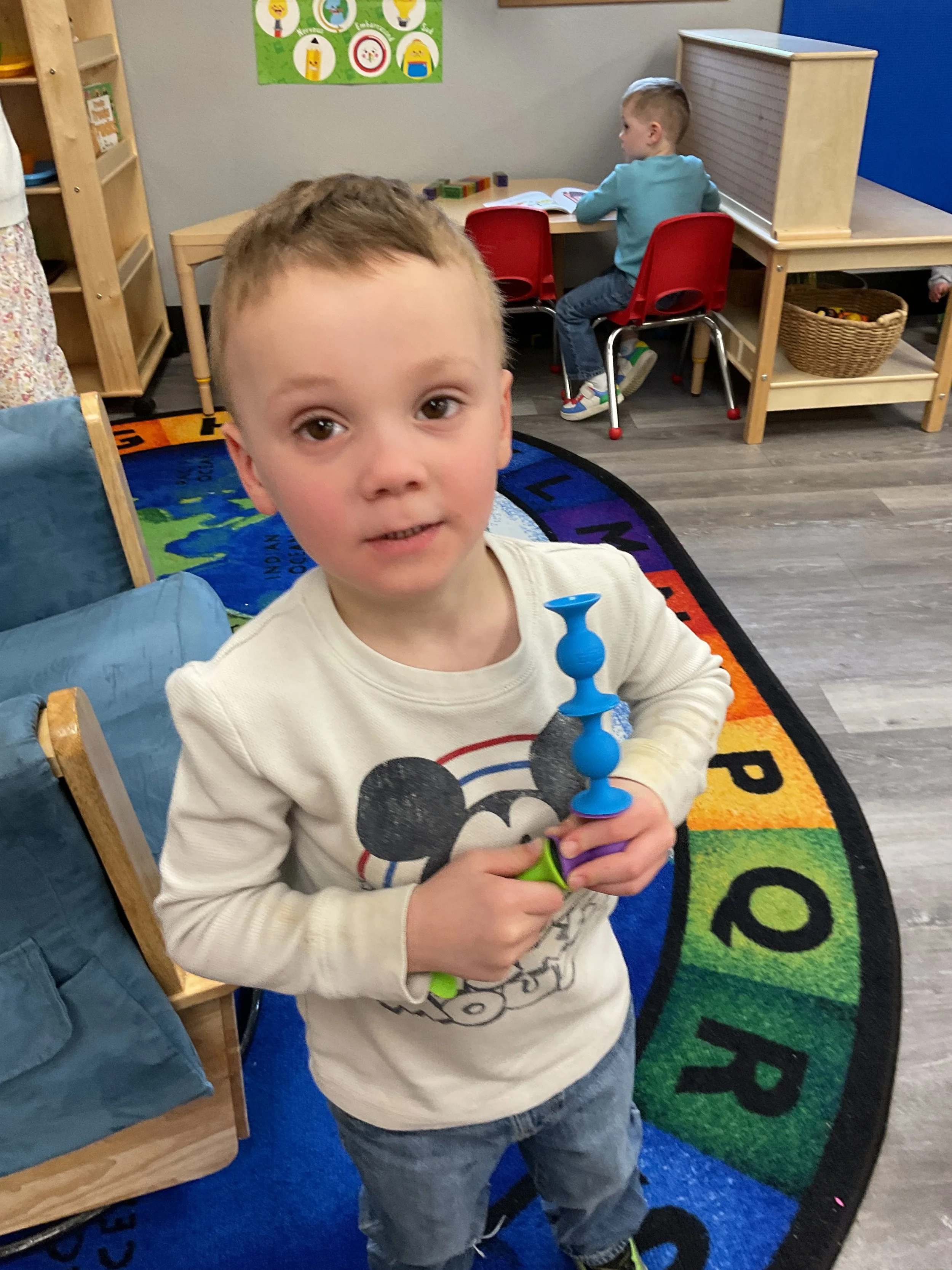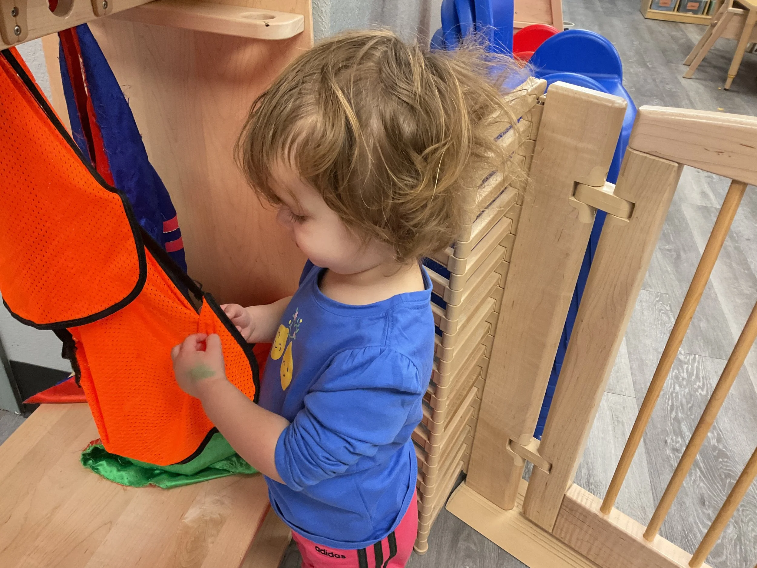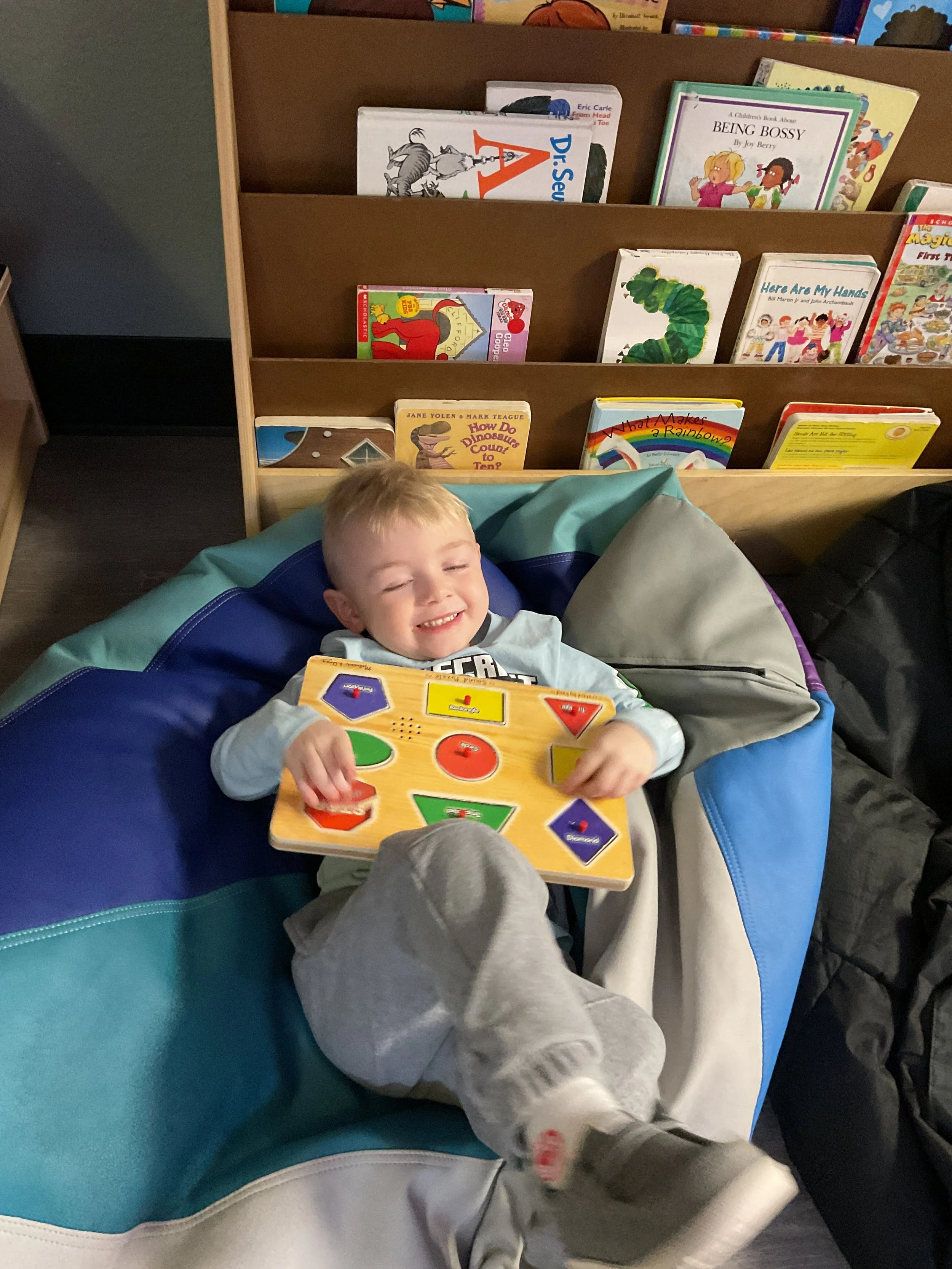 This morning, we read the book Push! Dig! Scoop! written by Rhonda Gowler Greene and illustrated by Daniel Kirk. During our music and movement time, we played Red Light, Green Light. We really liked walking like crabs during our game. Then, during our math and cognition lesson, we sorted different modes of transportation by size. Next, for our science and sensory lesson, we made a stoplight. Finally, for our literacy and fine motor lesson, we listened to a book on tape.