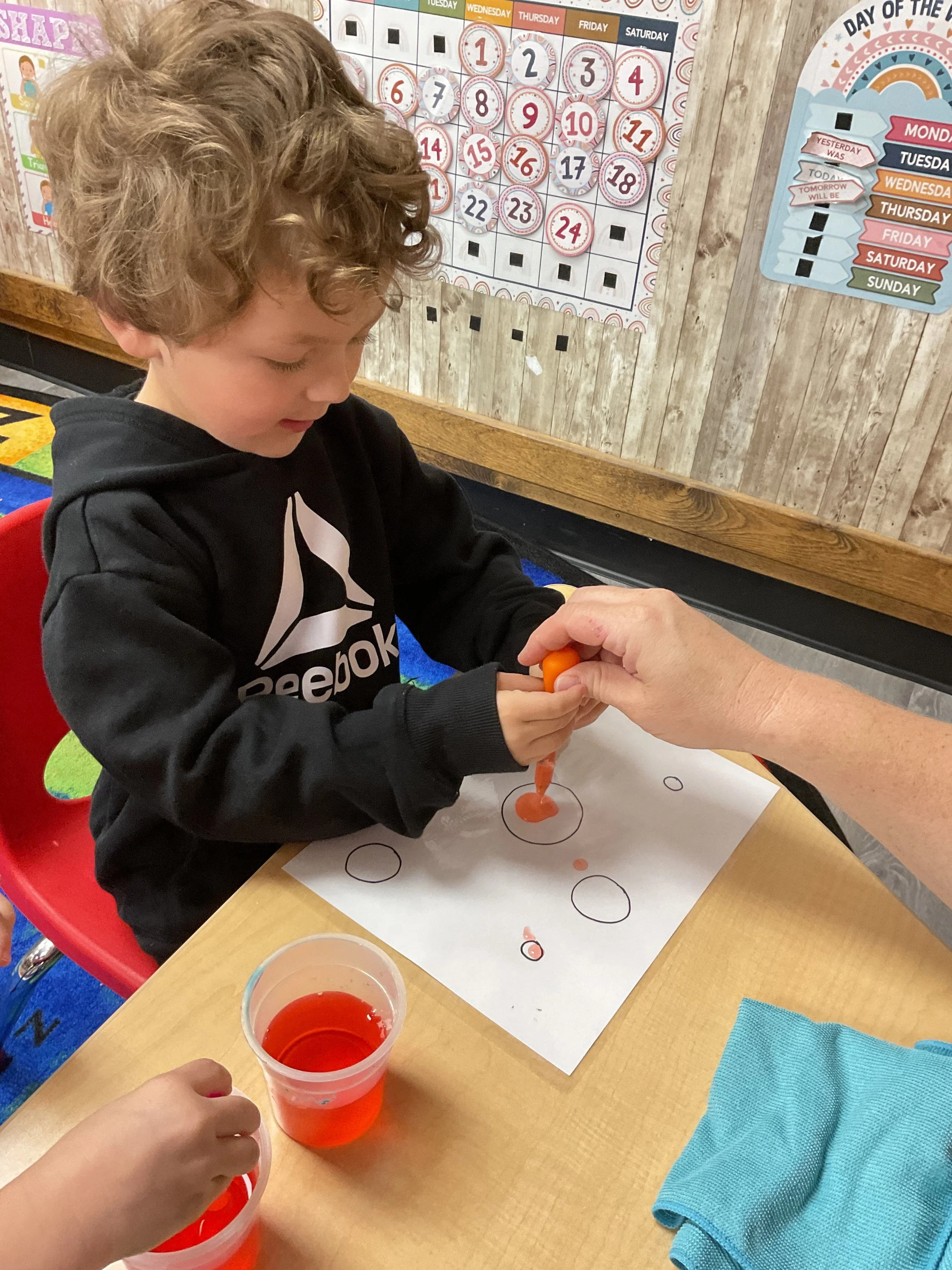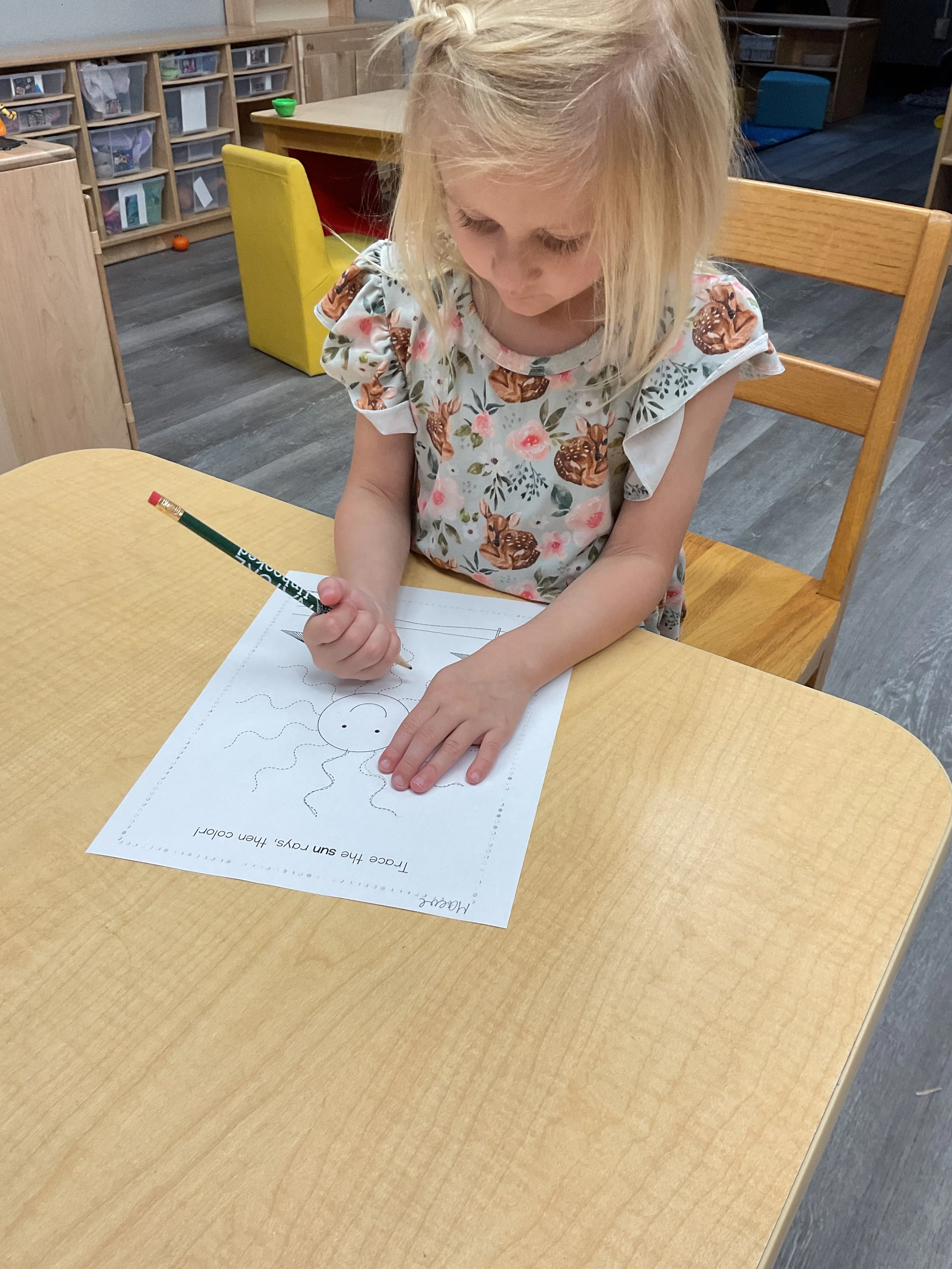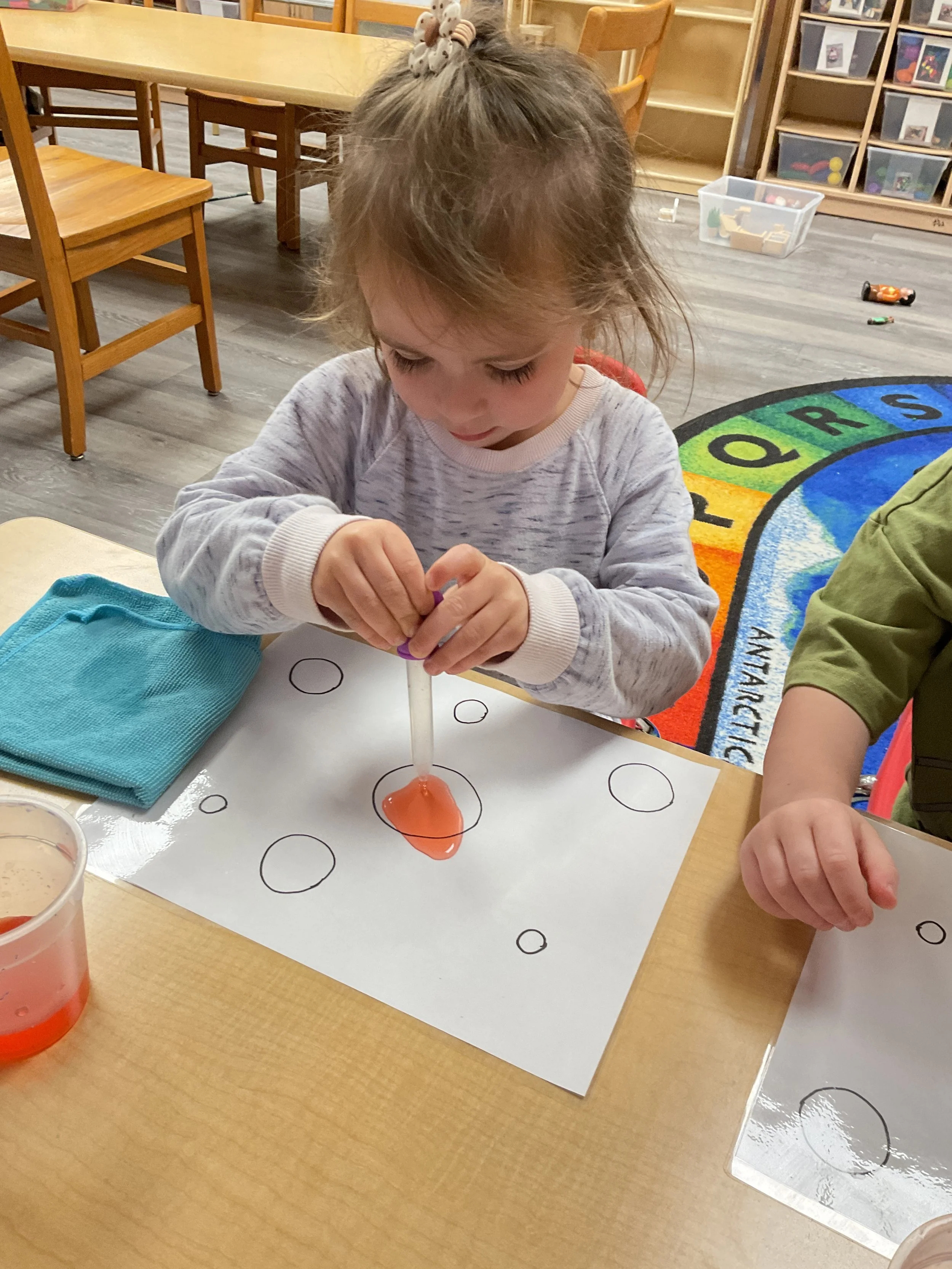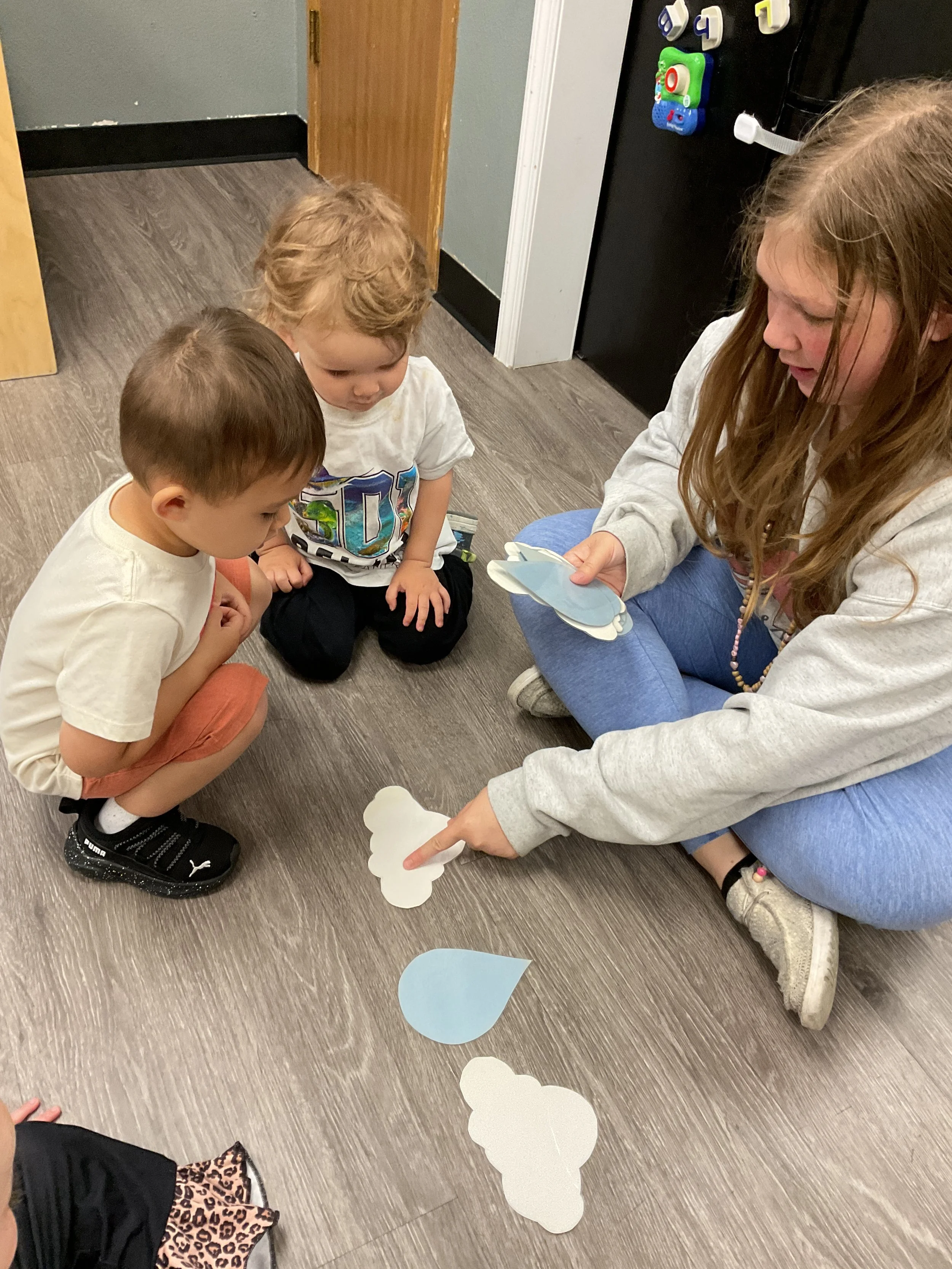 This morning, we read the book Storm is Coming written by Heather Tekavec and illustrated by Margaret Spengler. During our music and movement time, we stretched our bodies with yoga poses. Then, during our math and cognition lesson, we counted how m any drops for water it took to fill the circles. Next, for our science and sensory lesson, we filled our sensory bin with different colored scarves to represent a rainbow. Finally, for our literacy and fine motor lesson, we worked on tracing lines and writing our names.