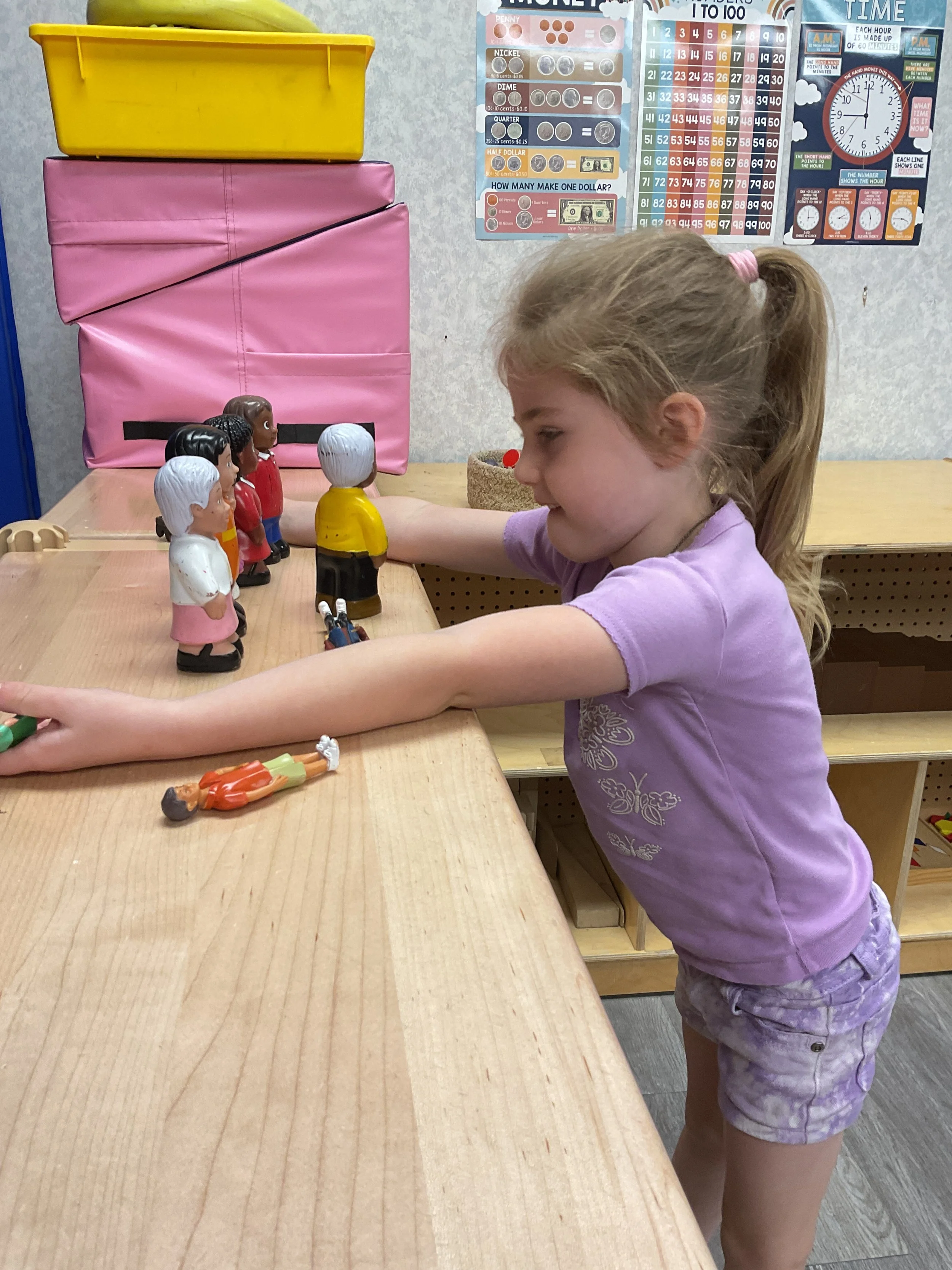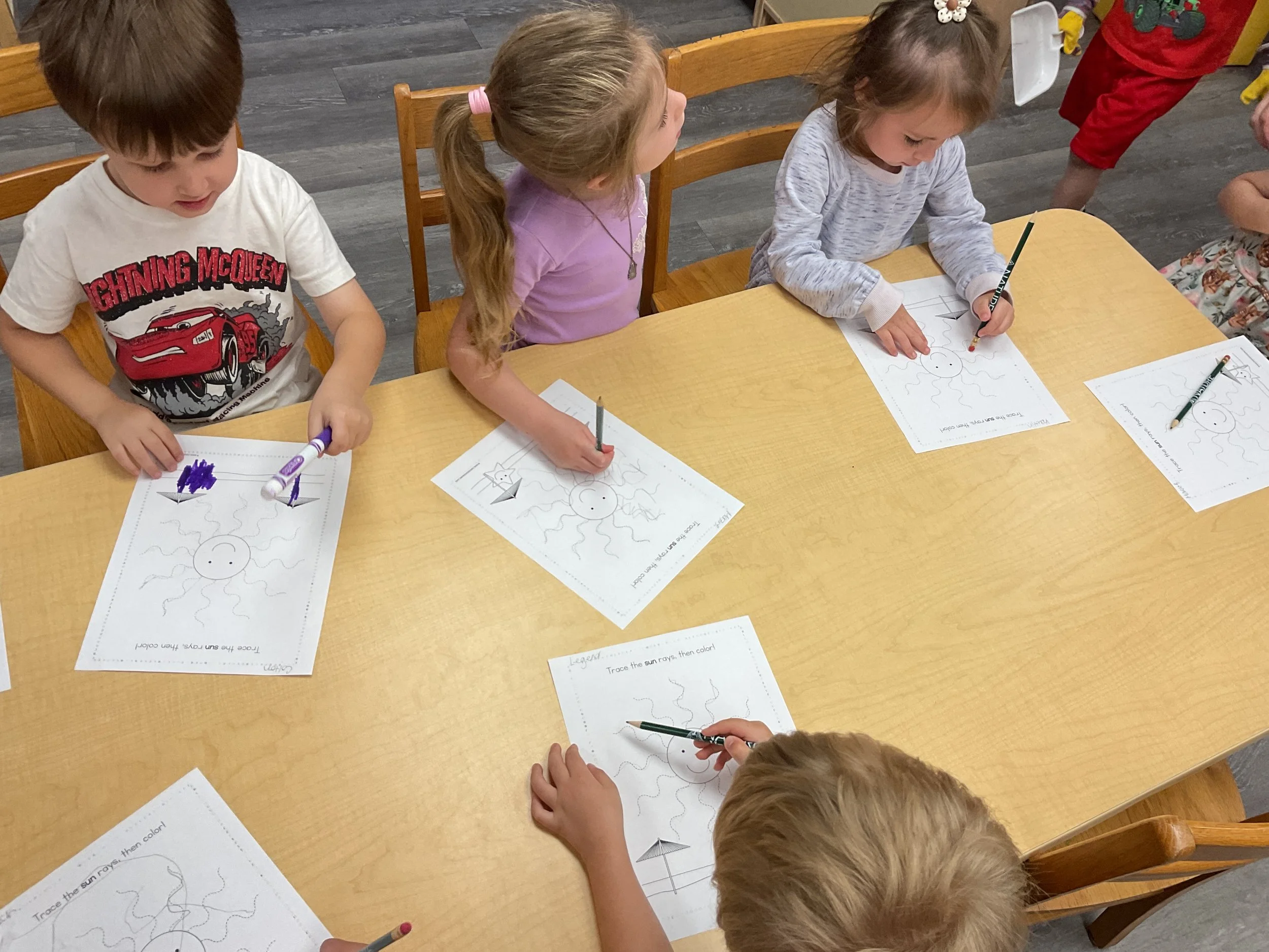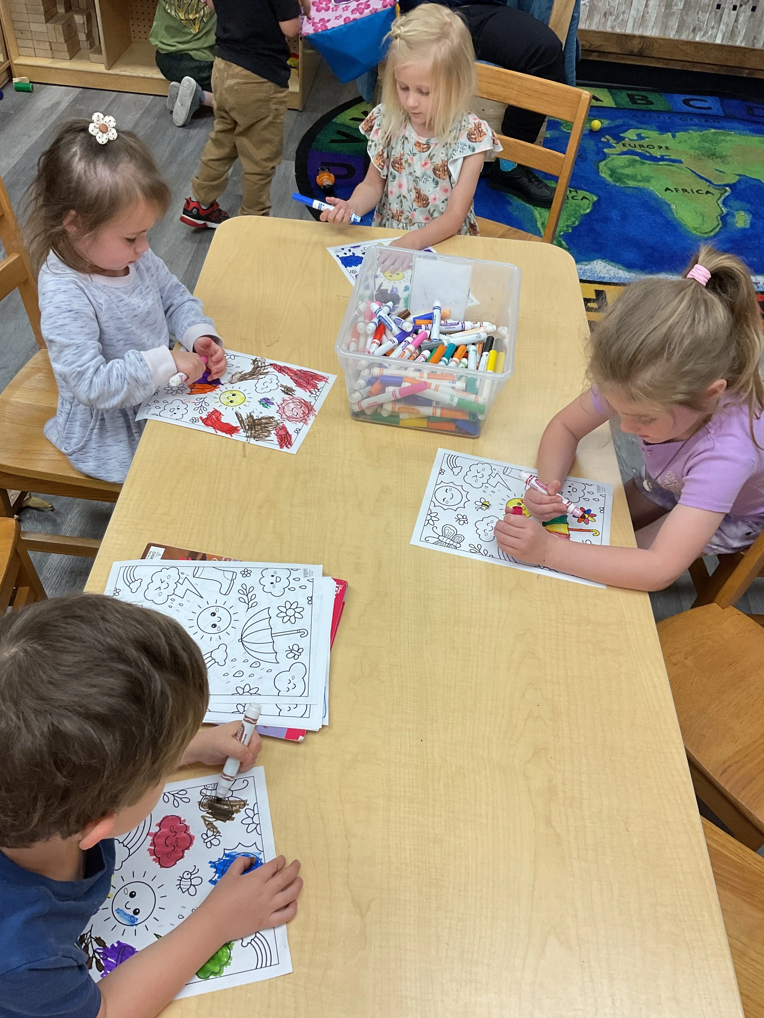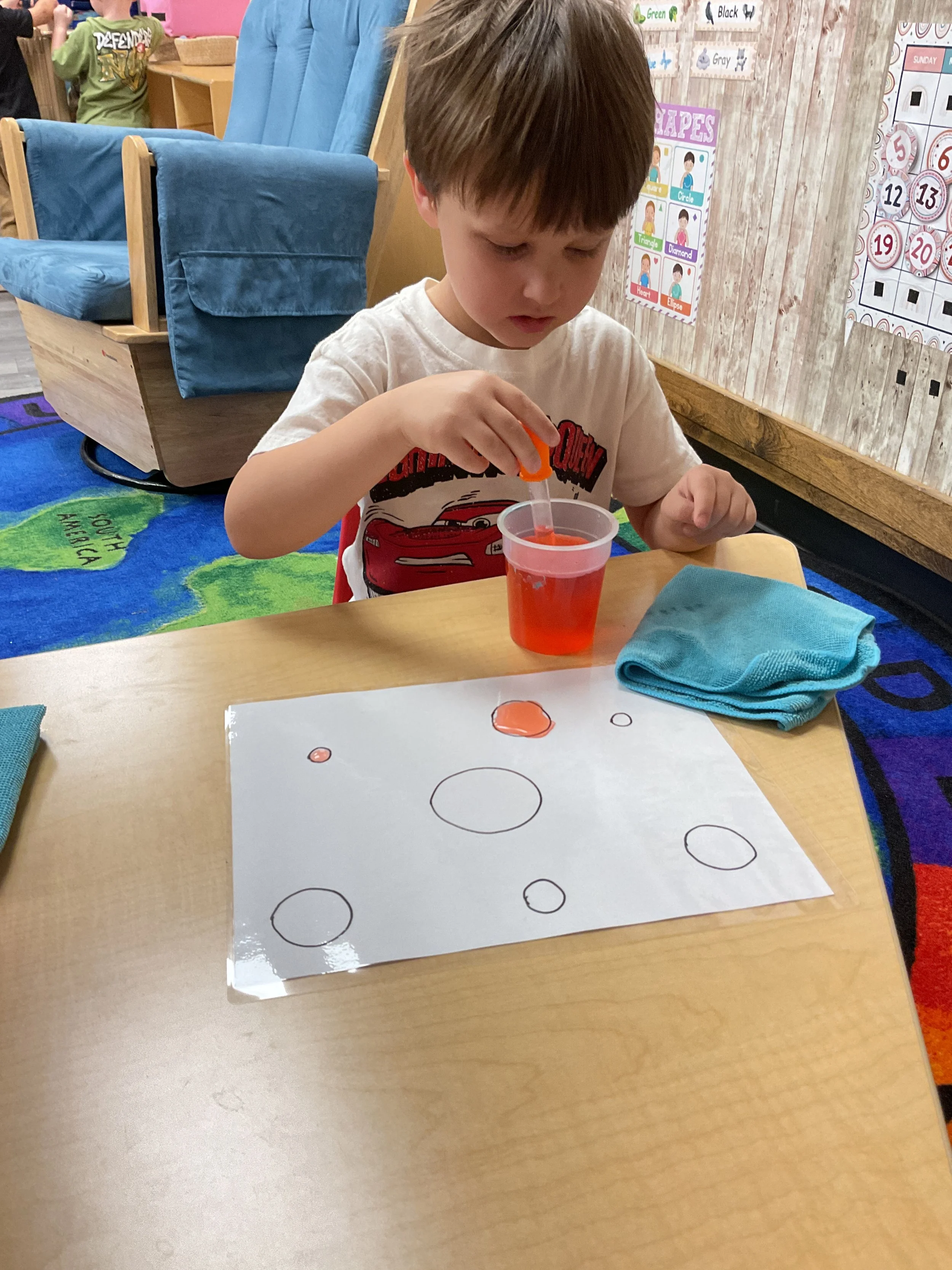 This morning, we read the book Storm is Coming written by Heather Tekavec and illustrated by Margaret Spengler. During our music and movement time, we stretched our bodies with yoga poses. Then, during our math and cognition lesson, we counted how m any drops for water it took to fill the circles. Next, for our science and sensory lesson, we filled our sensory bin with different colored scarves to represent a rainbow. Finally, for our literacy and fine motor lesson, we worked on tracing lines and writing our names.