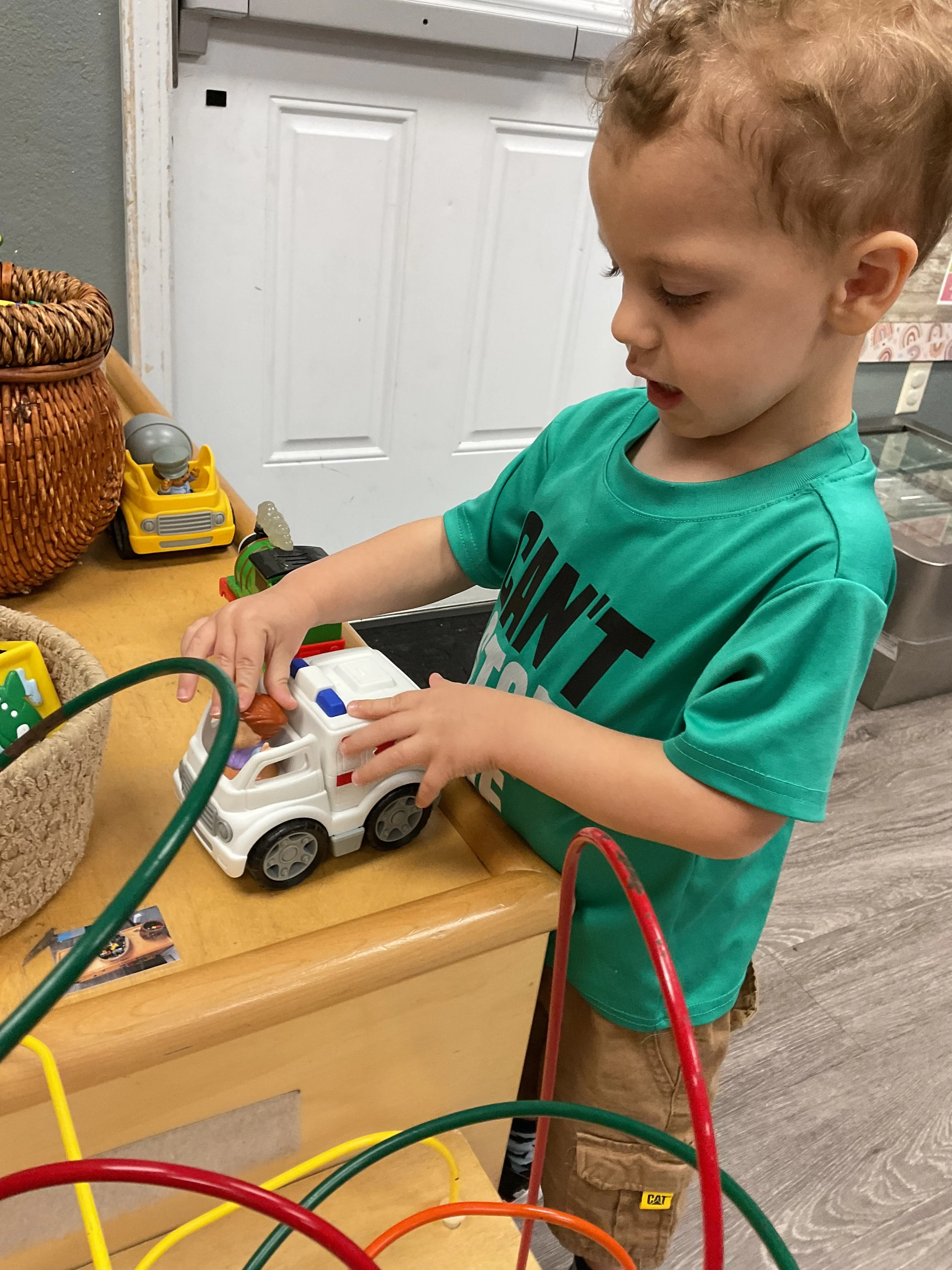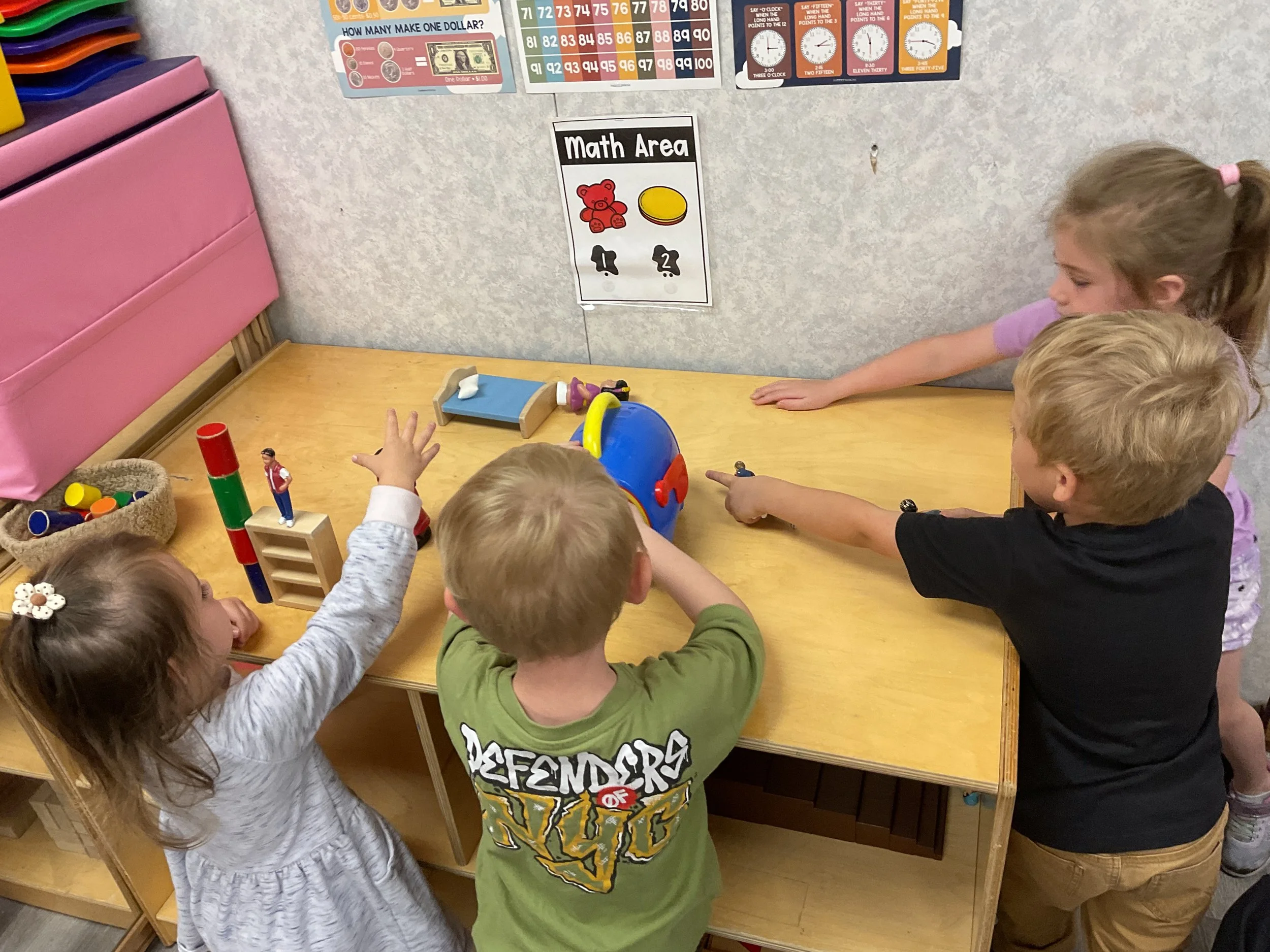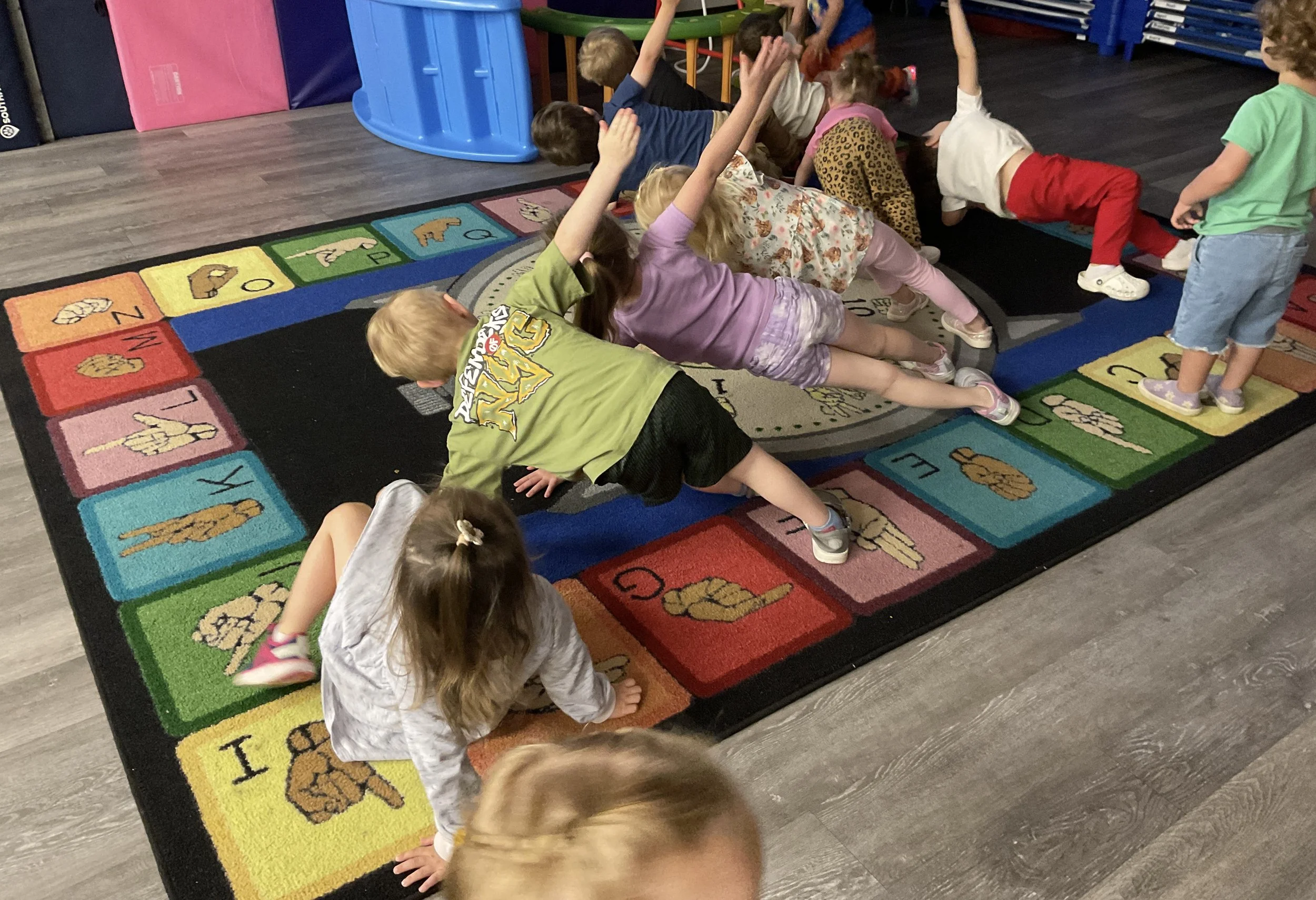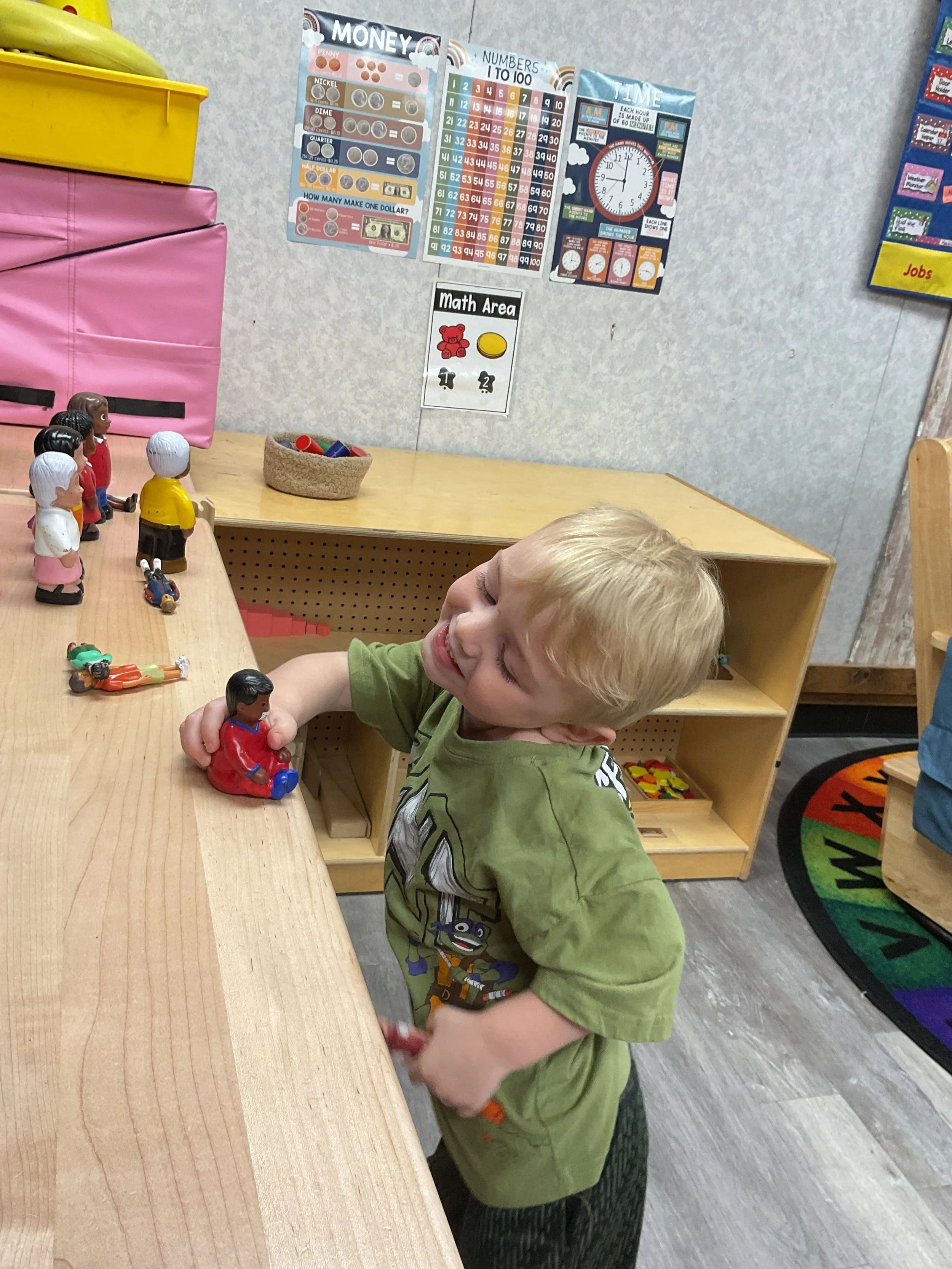 This morning, we read the book Storm is Coming written by Heather Tekavec and illustrated by Margaret Spengler. During our music and movement time, we stretched our bodies with yoga poses. Then, during our math and cognition lesson, we counted how m any drops for water it took to fill the circles. Next, for our science and sensory lesson, we filled our sensory bin with different colored scarves to represent a rainbow. Finally, for our literacy and fine motor lesson, we worked on tracing lines and writing our names.