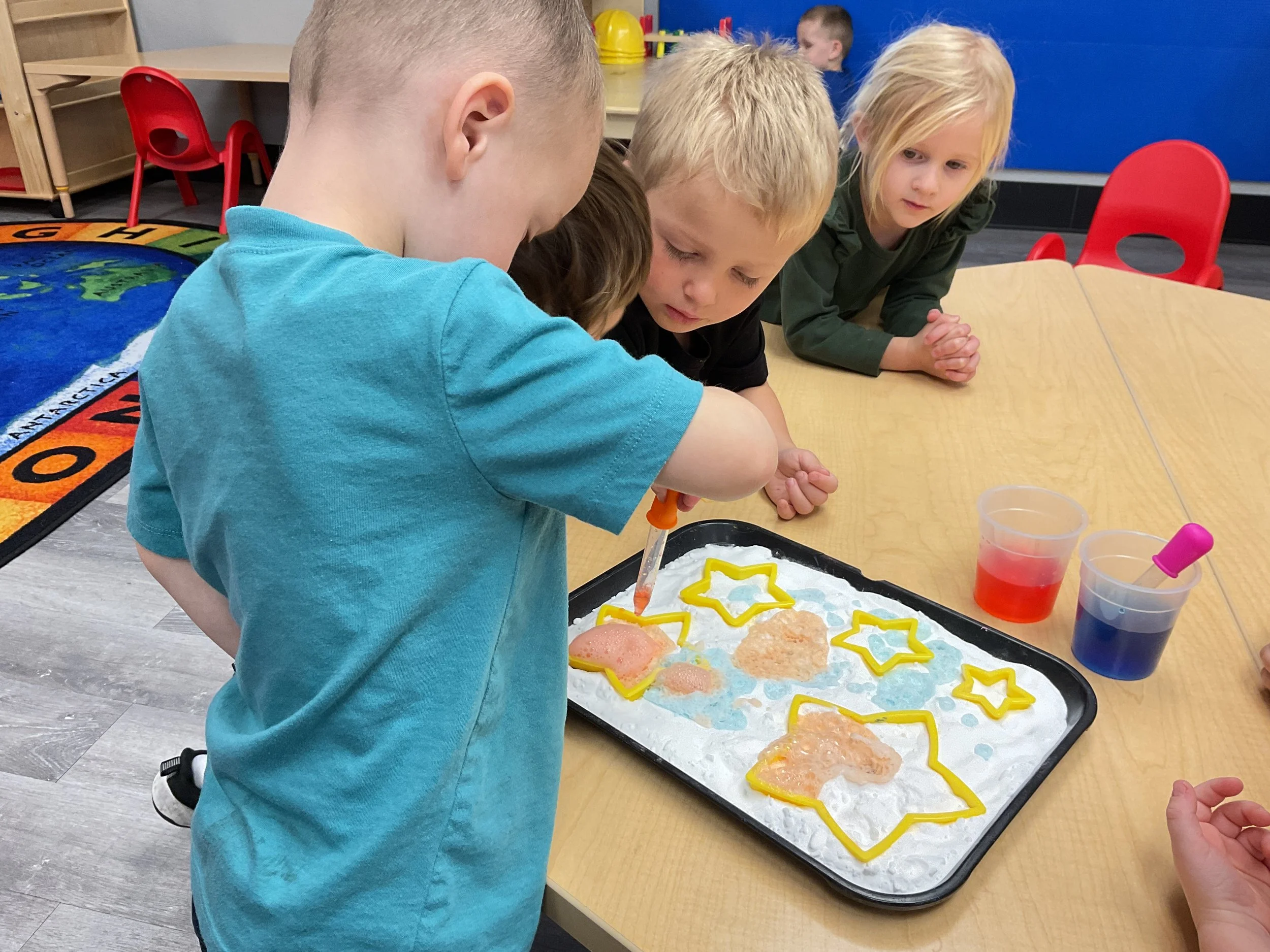 This morning, Ms. Katie came to see us from the Health Department! She read us a book about being kind, and how to be a “Bucket Filler” by doing kind things for other people. During circle time, we also read the book We are So Proud written by Donna Lango and illustrated by Luciana Navarro Powell. During our music and movement time, we played with balloons! We talked about static electricity and rubbed the balloons on our heads to make our hair stand up, we even had a balloon get stuck to the celling! Next, during our math and cognition lesson, we matched army figurines together. Then, during our science and sensory lesson, we filled a tray with baking soda and we put red and blue coloring in vinegar. Then, we each got a turn to fill an eye dropper and drop the colored vinegar to see a chemical reaction between the baking soda and vinegar. Finally, for our fine motor and literacy lesson, we put made a Solider using different shaped paper!