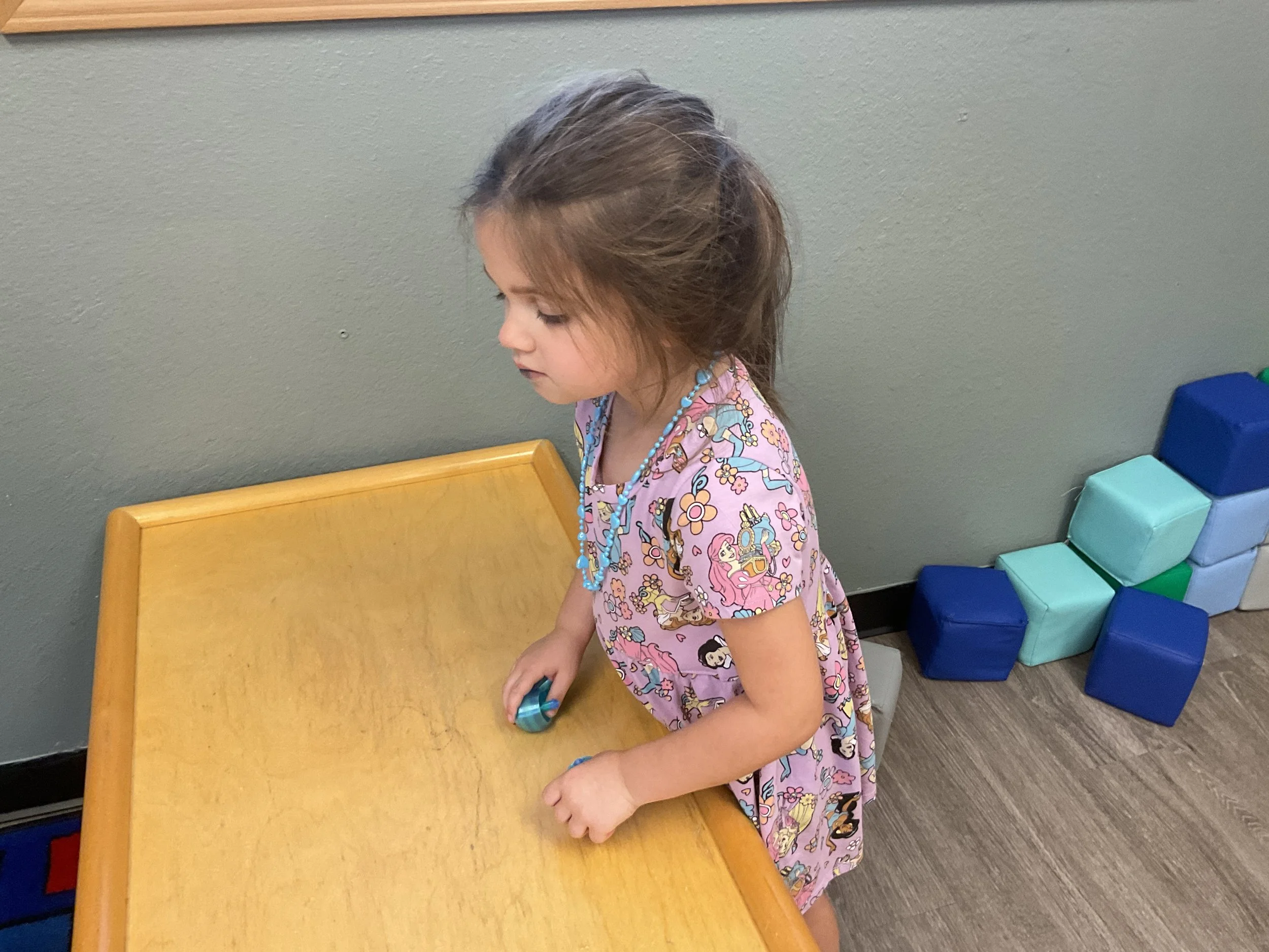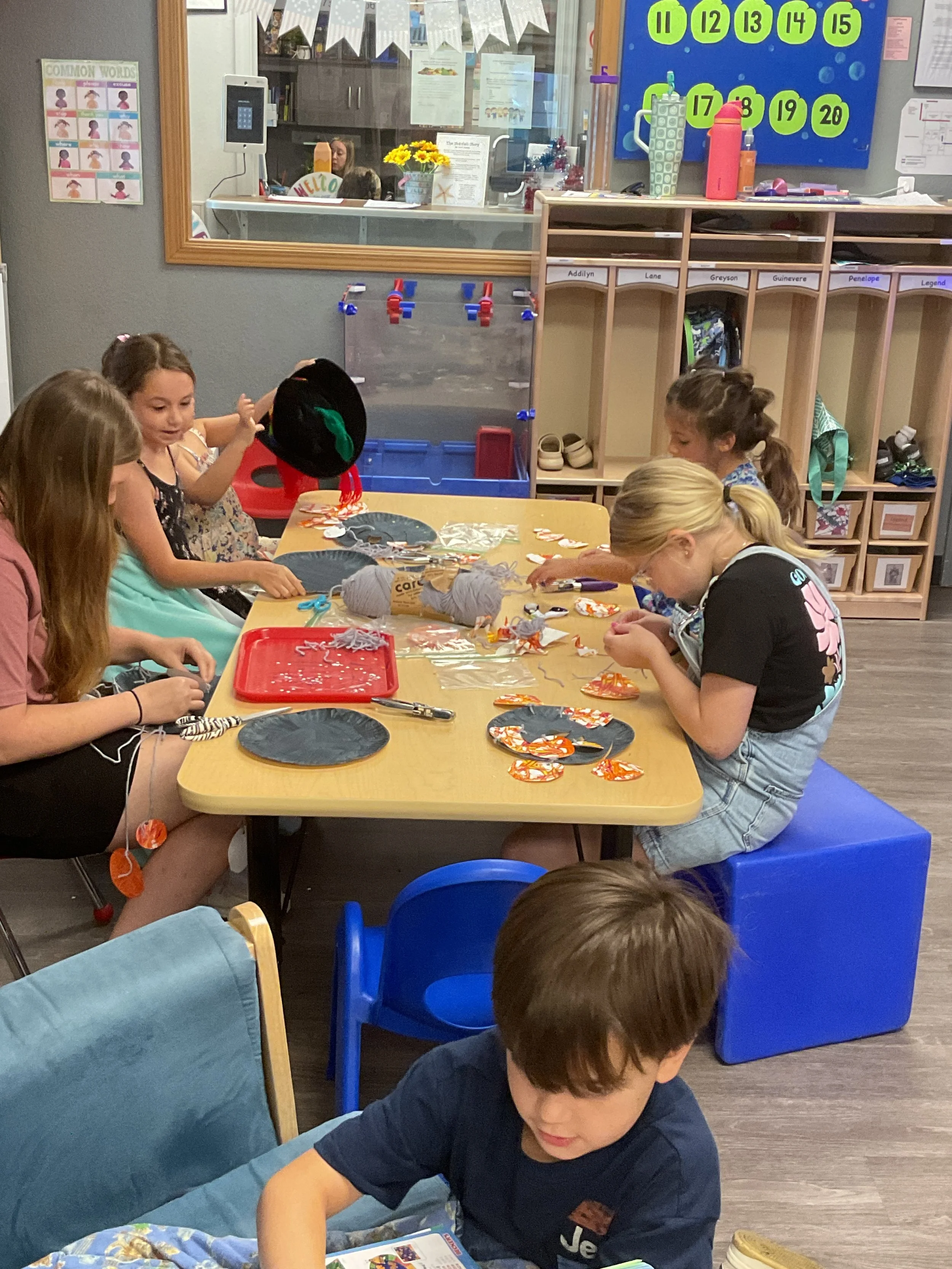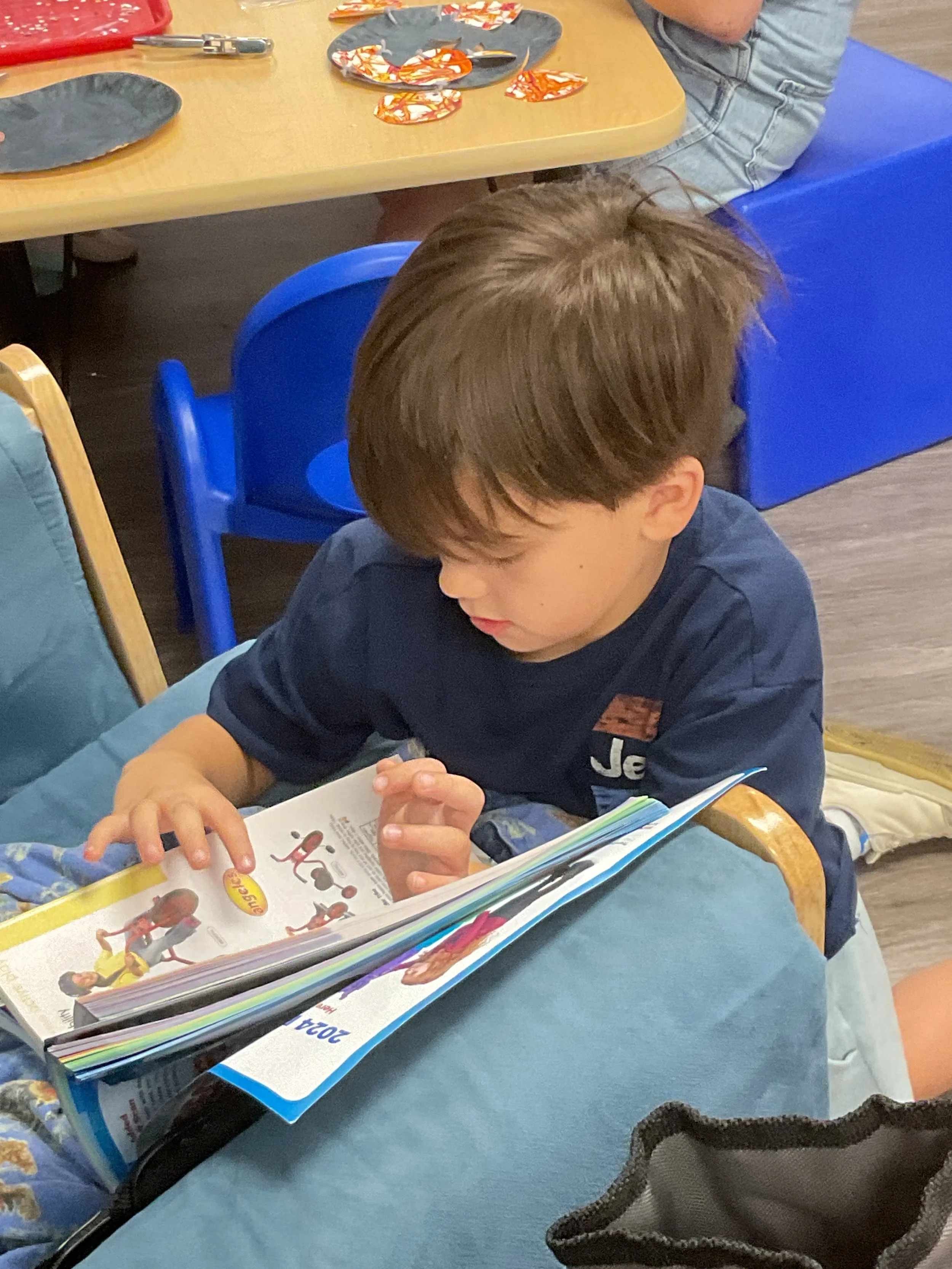 This morning, we read the book Hedgie Blasts Off written by Jan Brett. During music and movement time, we stretched our bodies so we can reach the stars during yoga this morning! During our math and cognition lesson, we used different shapes to make a rocket. For our science and sensory lesson, we filled our sensory bin with astronauts and asteroids. Finally, during our fine motor and literacy lesson, we practiced tracing and writing space themed words.