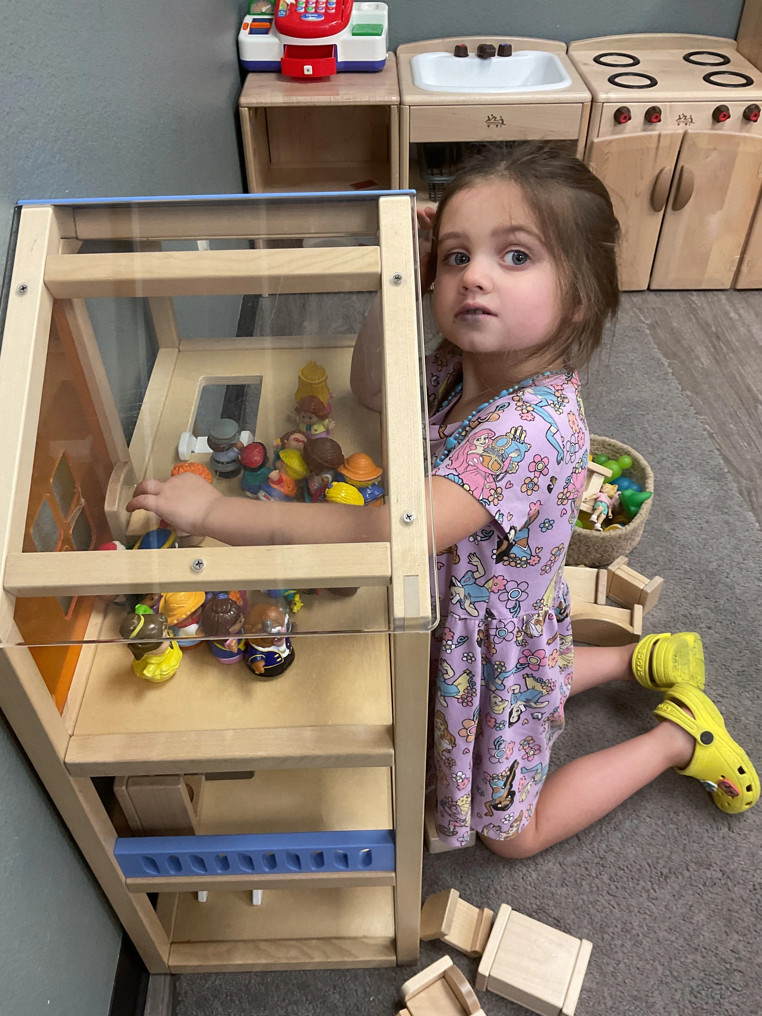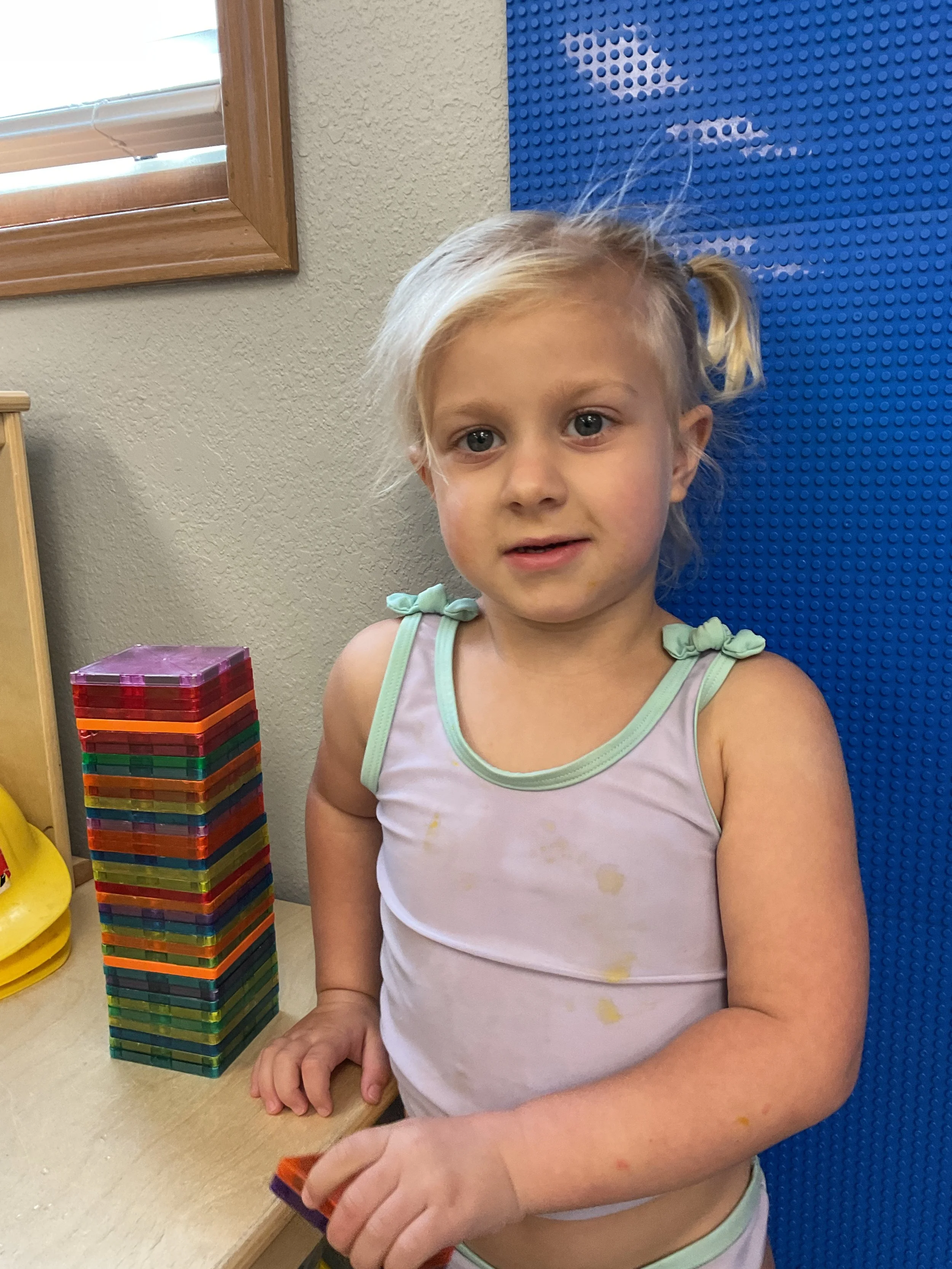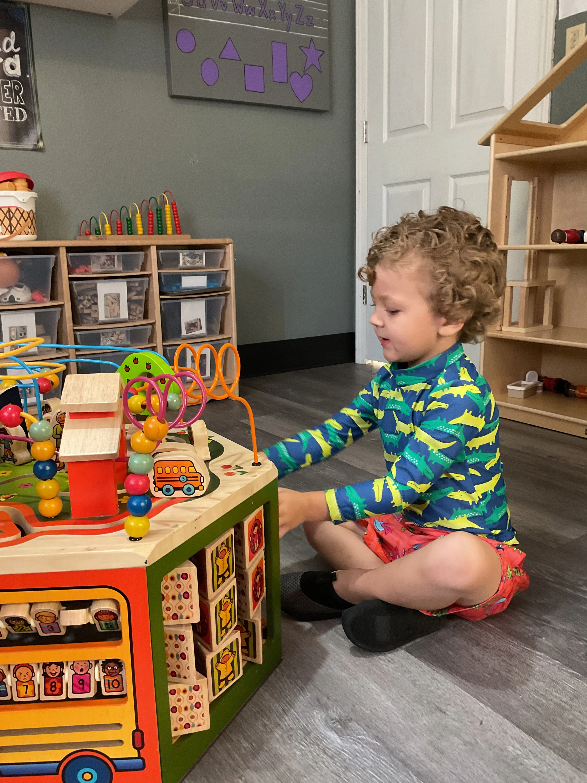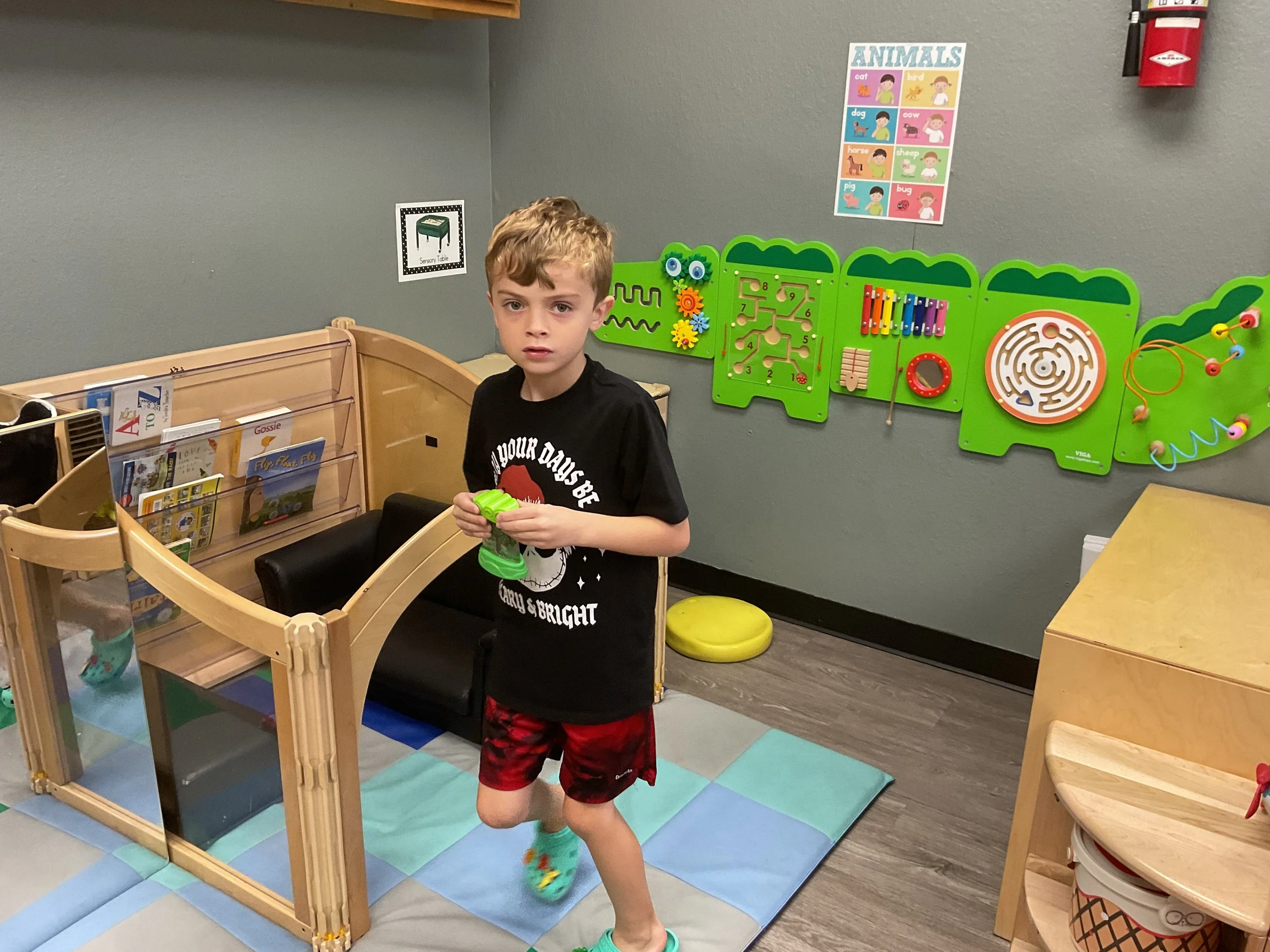 This morning, we read the book Hedgie Blasts Off written by Jan Brett. During music and movement time, we stretched our bodies so we can reach the stars during yoga this morning! During our math and cognition lesson, we used different shapes to make a rocket. For our science and sensory lesson, we filled our sensory bin with astronauts and asteroids. Finally, during our fine motor and literacy lesson, we practiced tracing and writing space themed words.