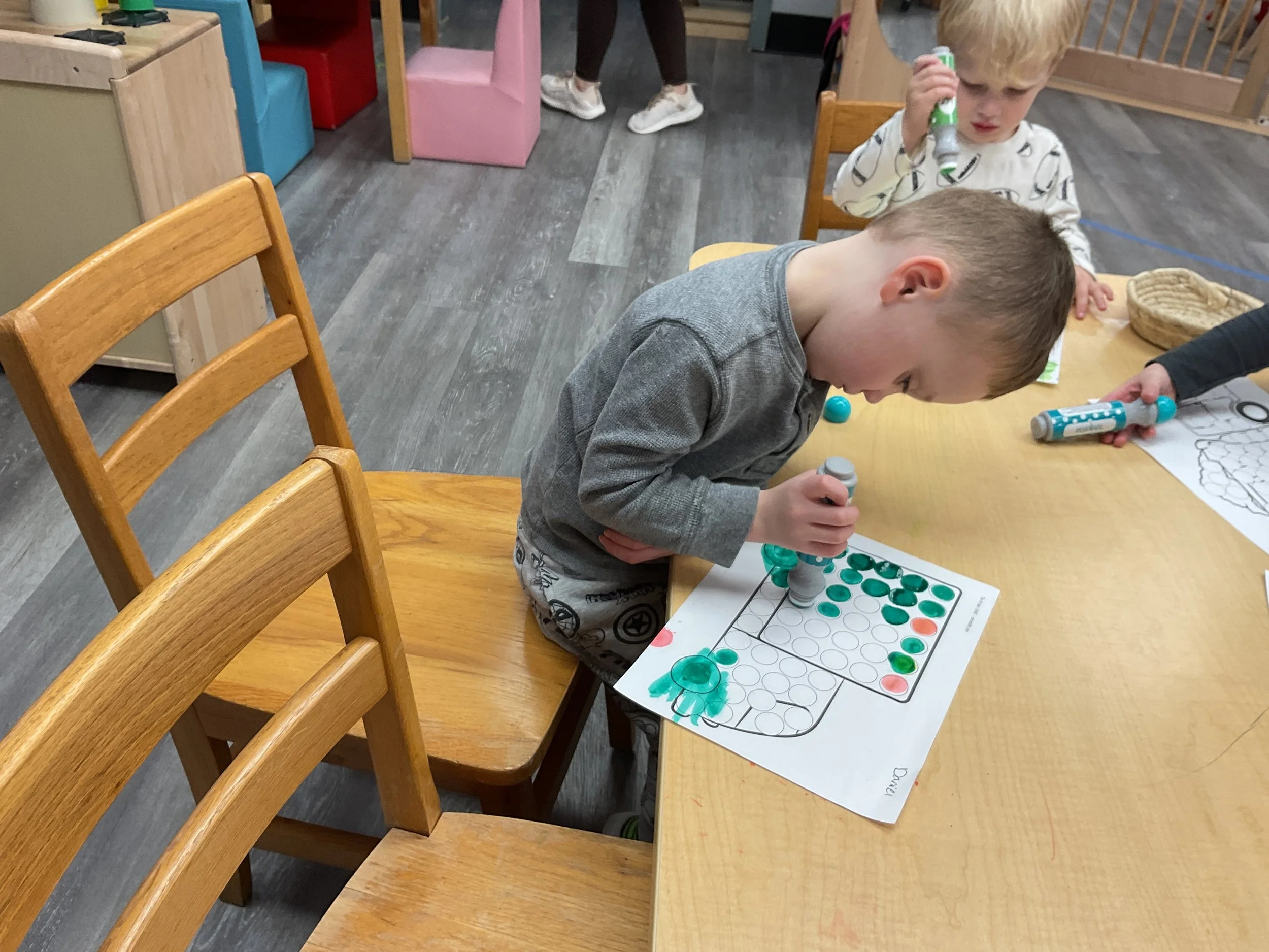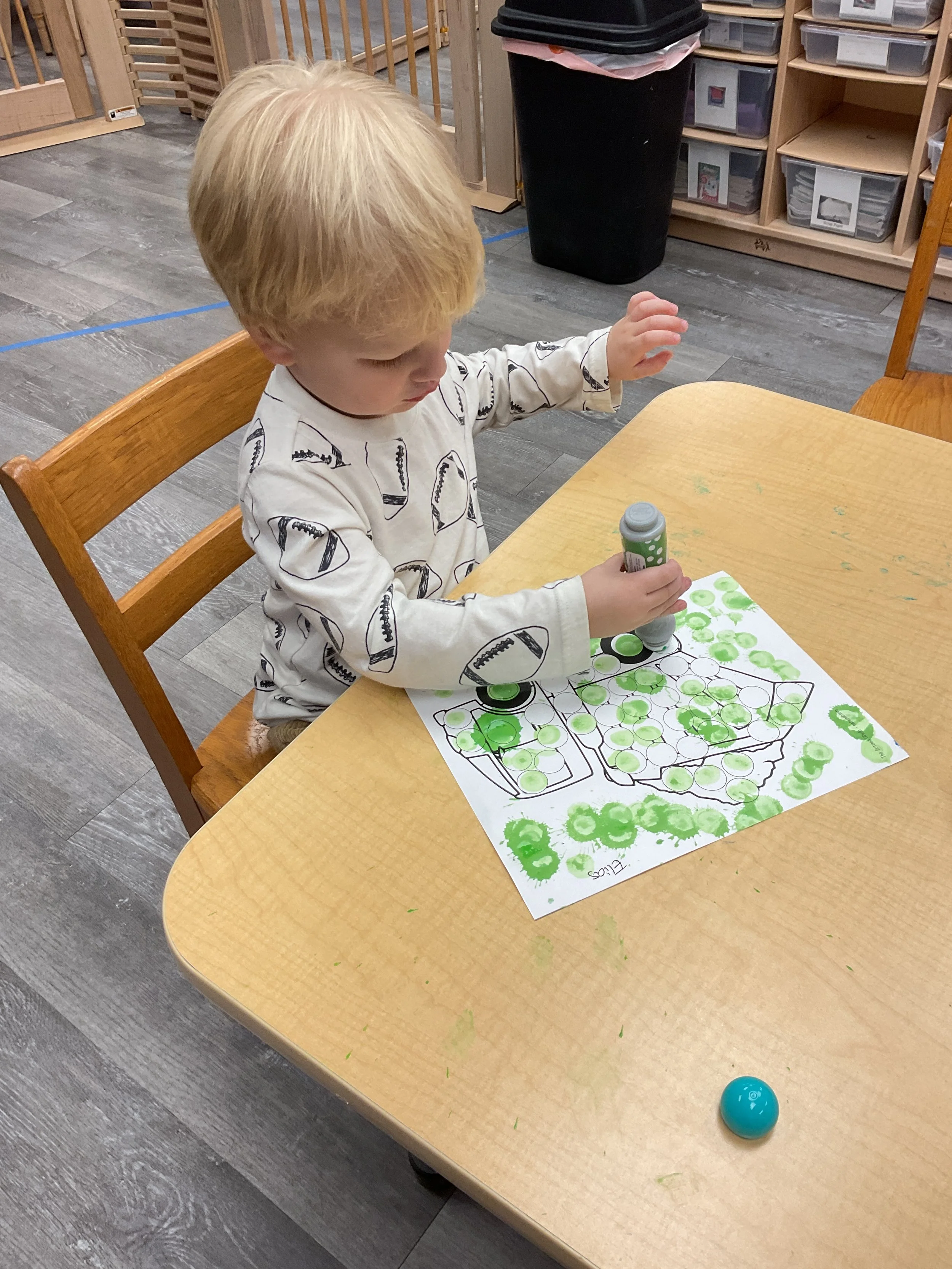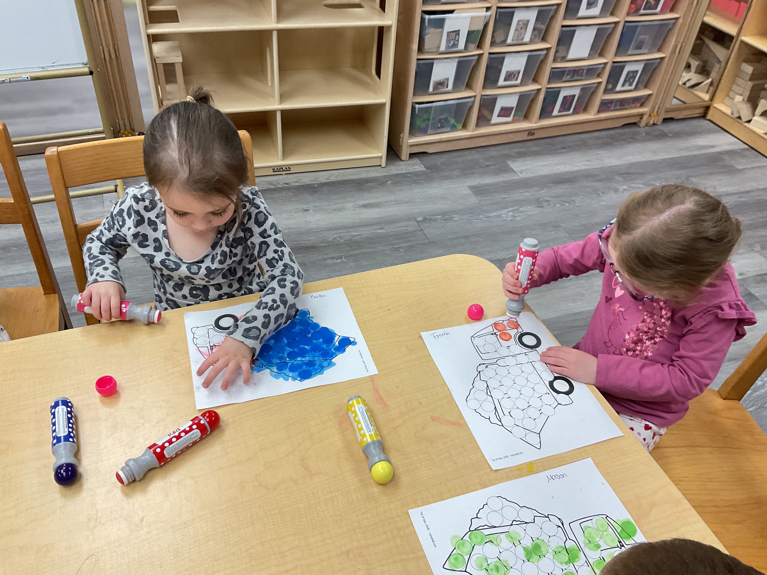 This morning, we Stanley the Builder written by Jonathan Cape. During our music and movement time, we played with balloons! For, our math and cognition lesson, we counted cars from 1 to 20. Next, for our sensory and science activity, we filled a bag of water and pushed pencils through to see if any water would spill out. Finally, for our literacy and fine motor lesson, we made the letter T into tractors!