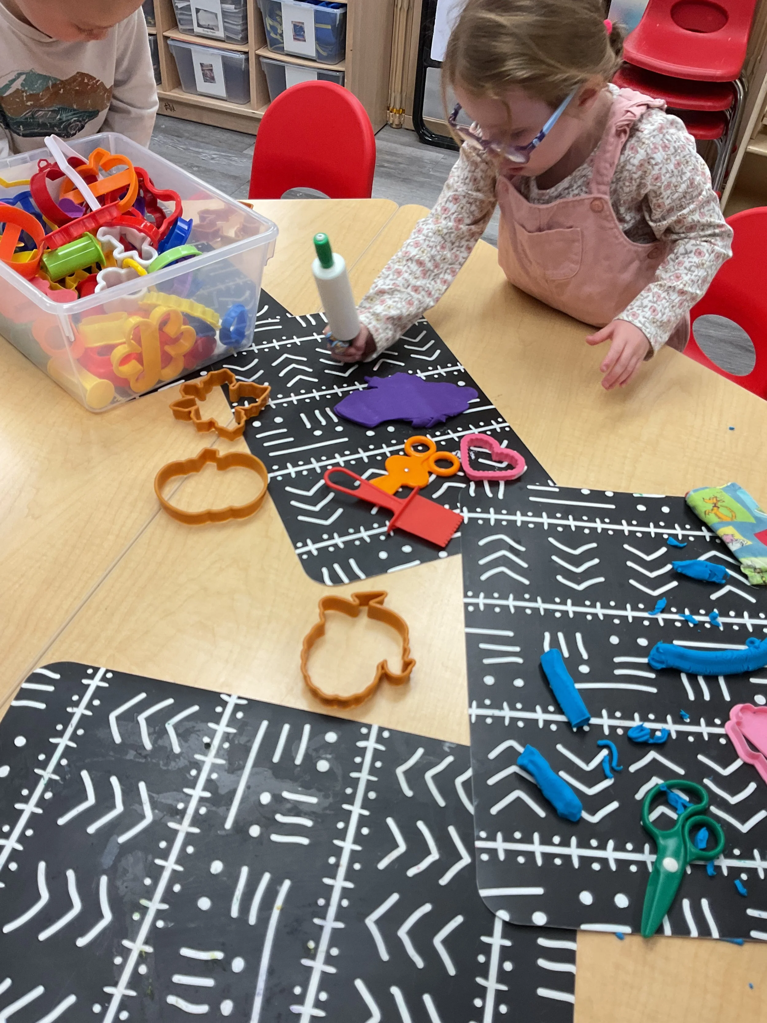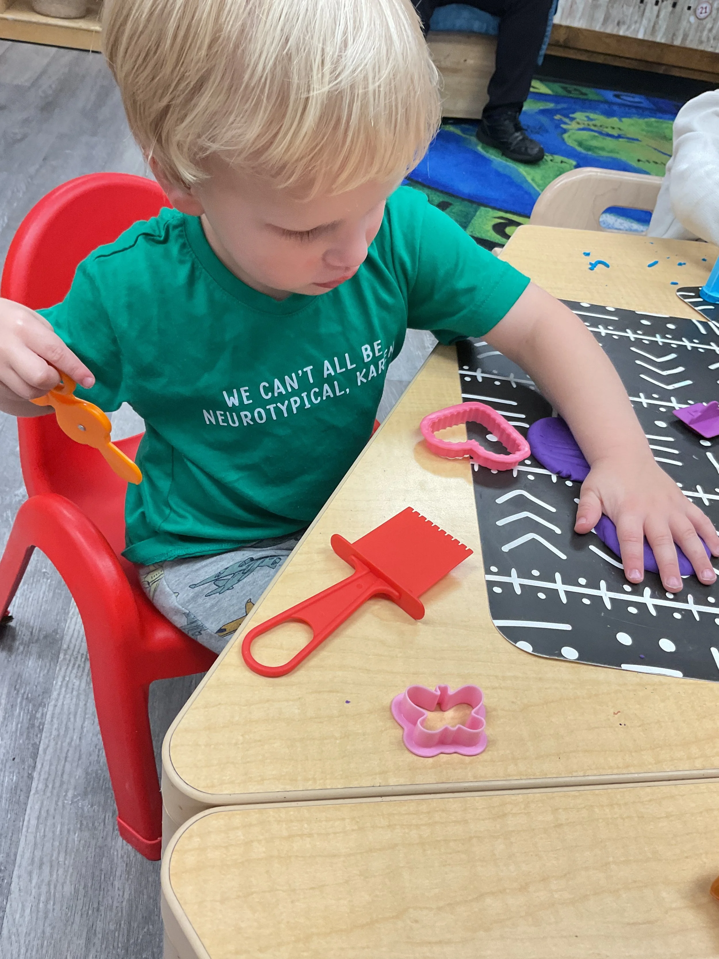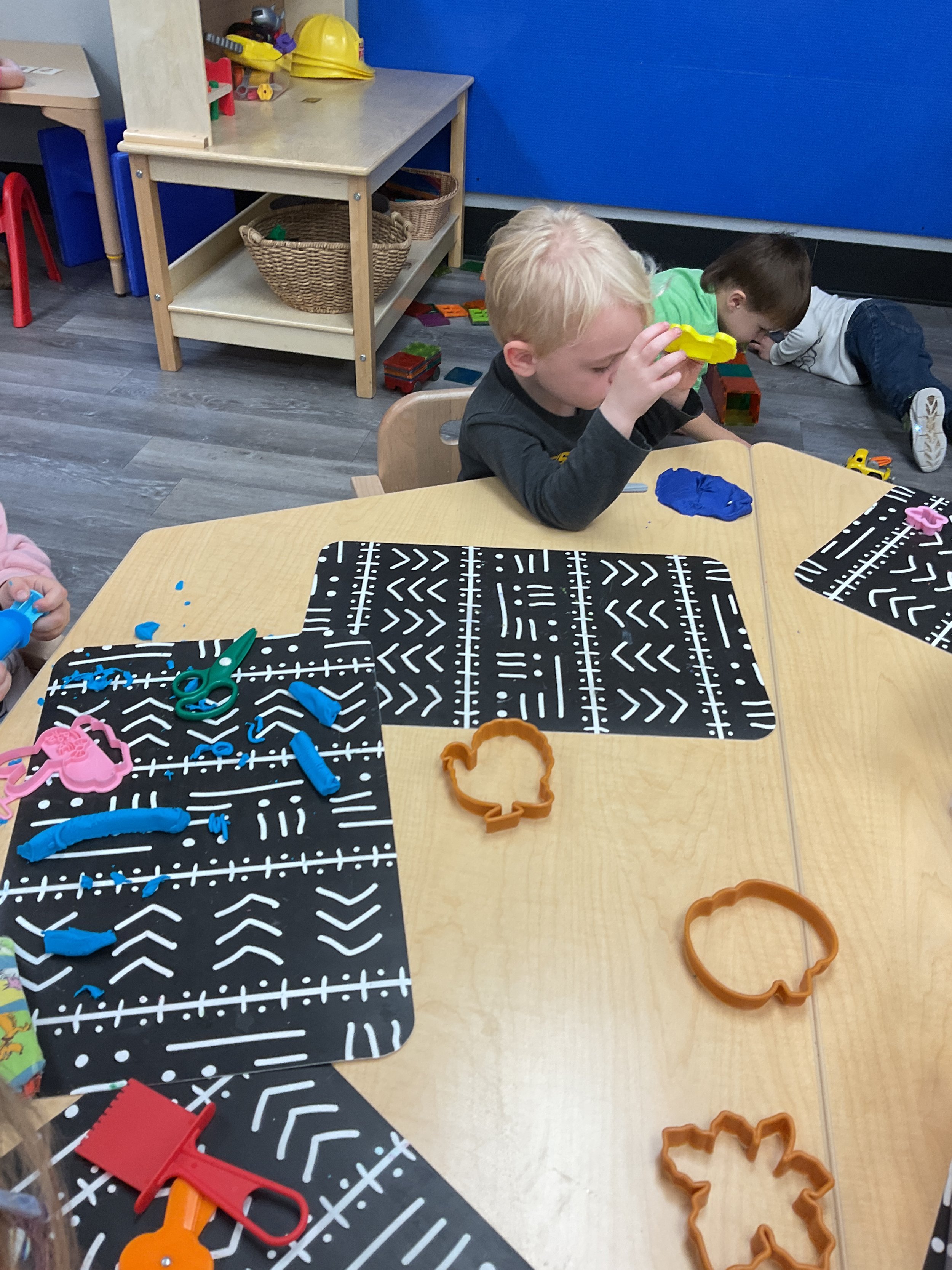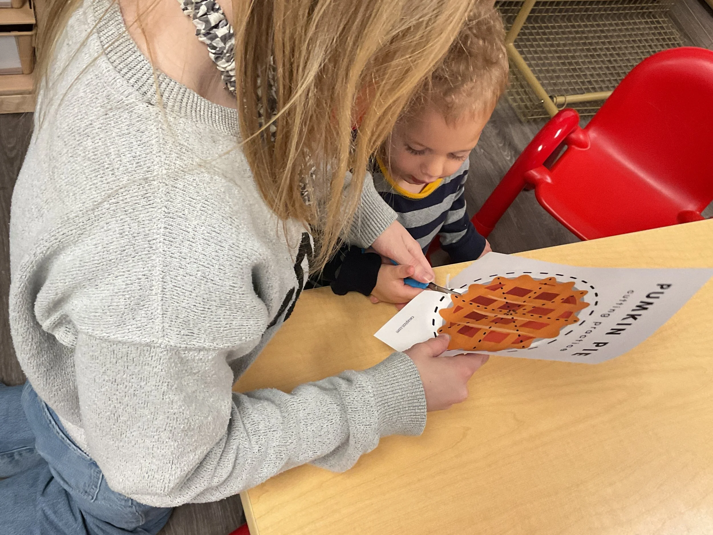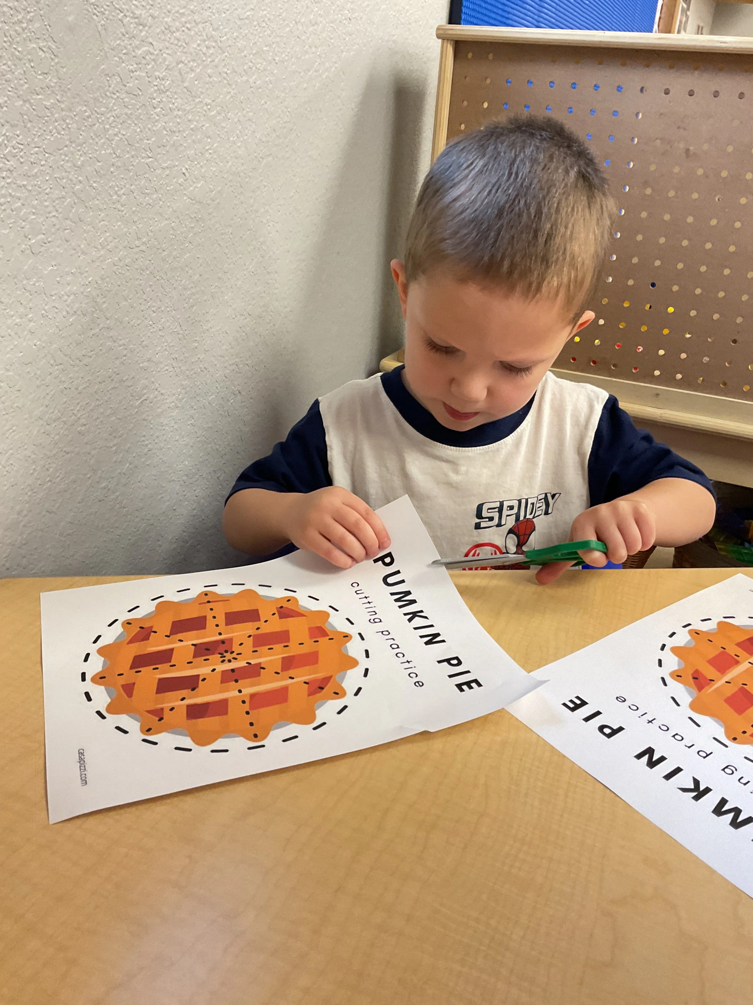 This morning, we read the book Thanksgiving is for Giving Thanks by Margaret Sutherland and illustrated by Sonja Lamut. During our music and movement time we played games of catch and tossed balls into bins at different heights. Next, during our math and cognition lesson we matched Thanksgiving themed pictures together. Then, during our science and sensory lesson we used playdough to make our favorite Thanksgiving pies. And finally, for our fine motor and literacy lesson we practiced our cutting skills by cutting a picture of a pumpkin pie.