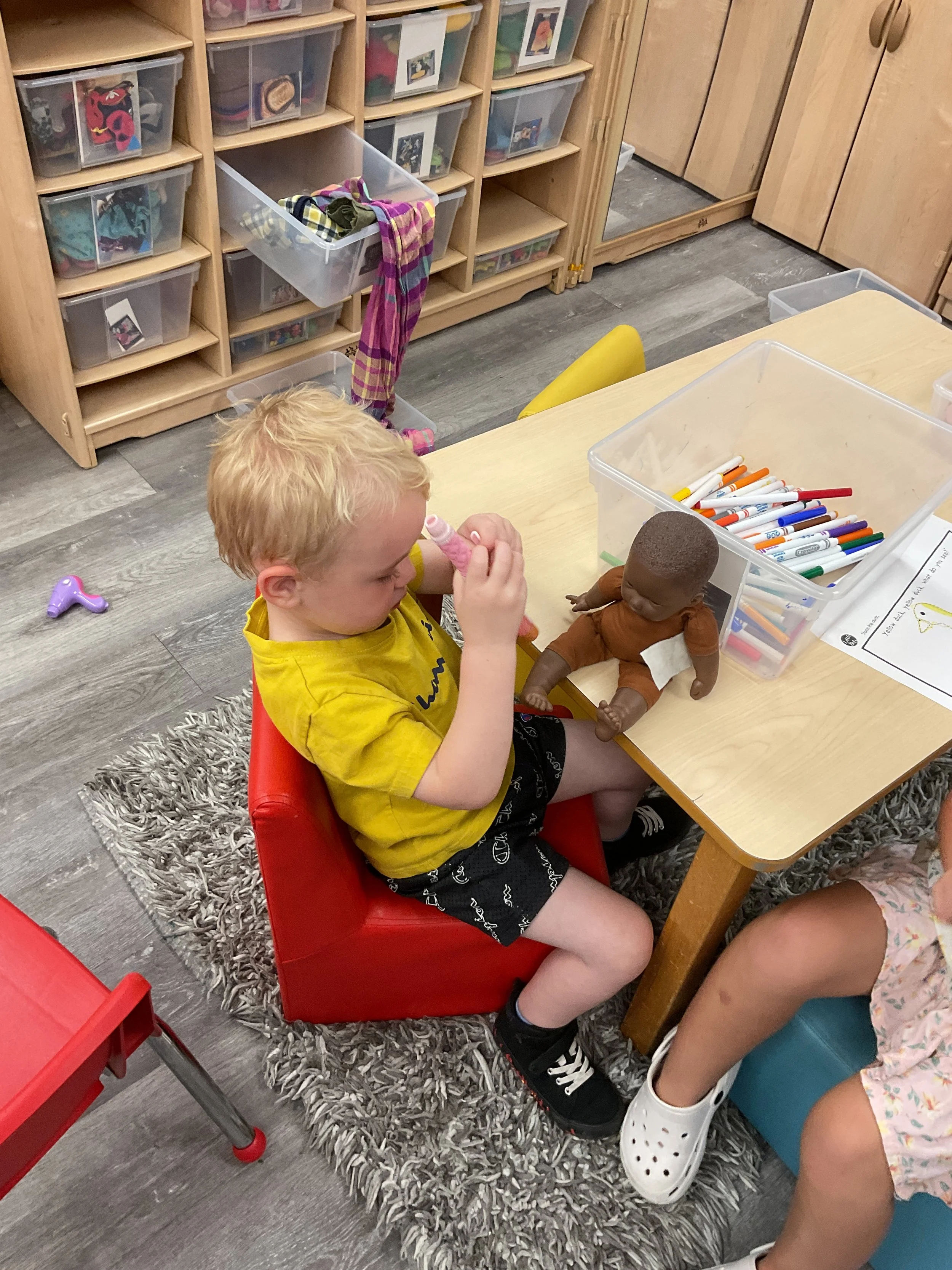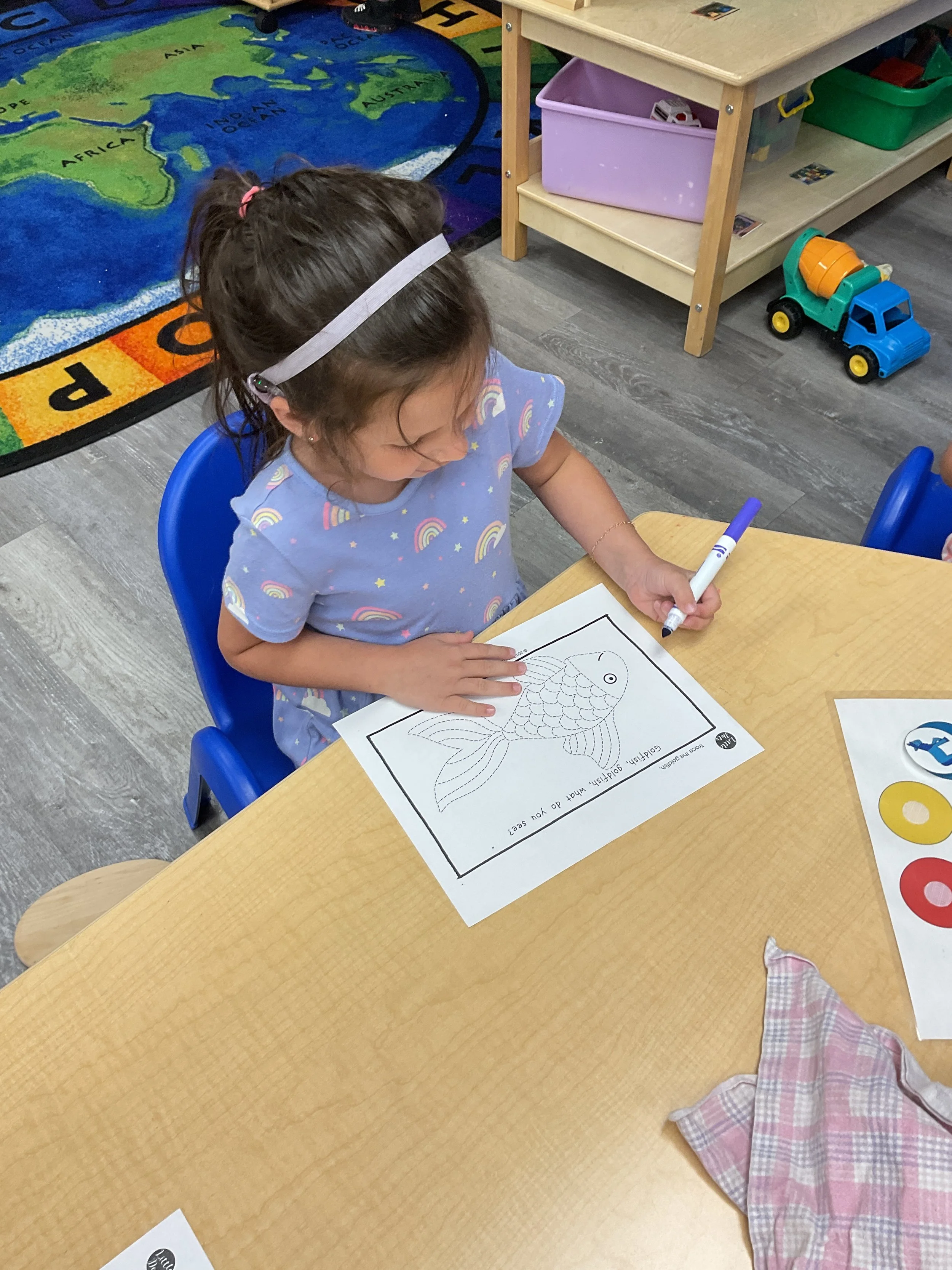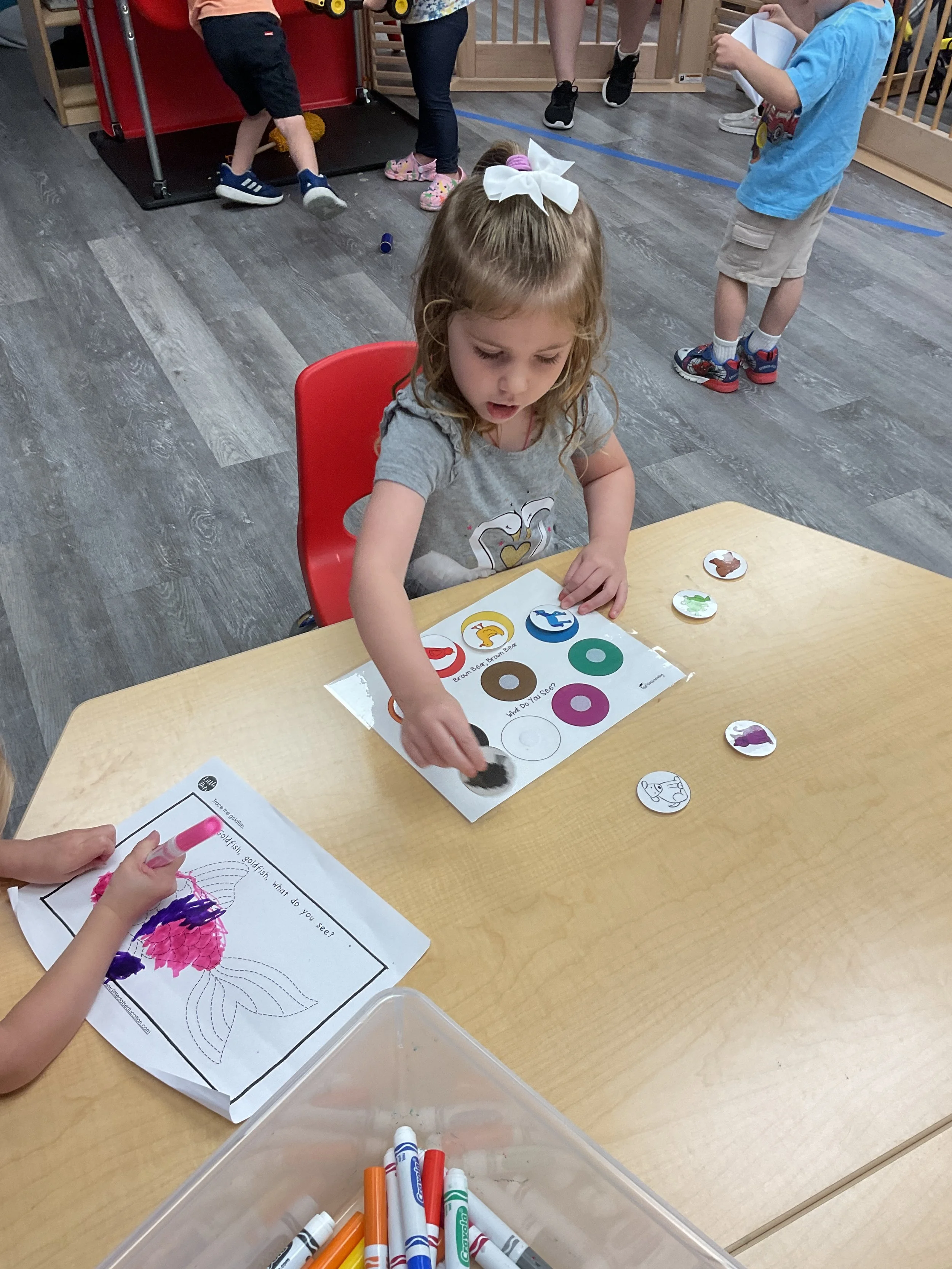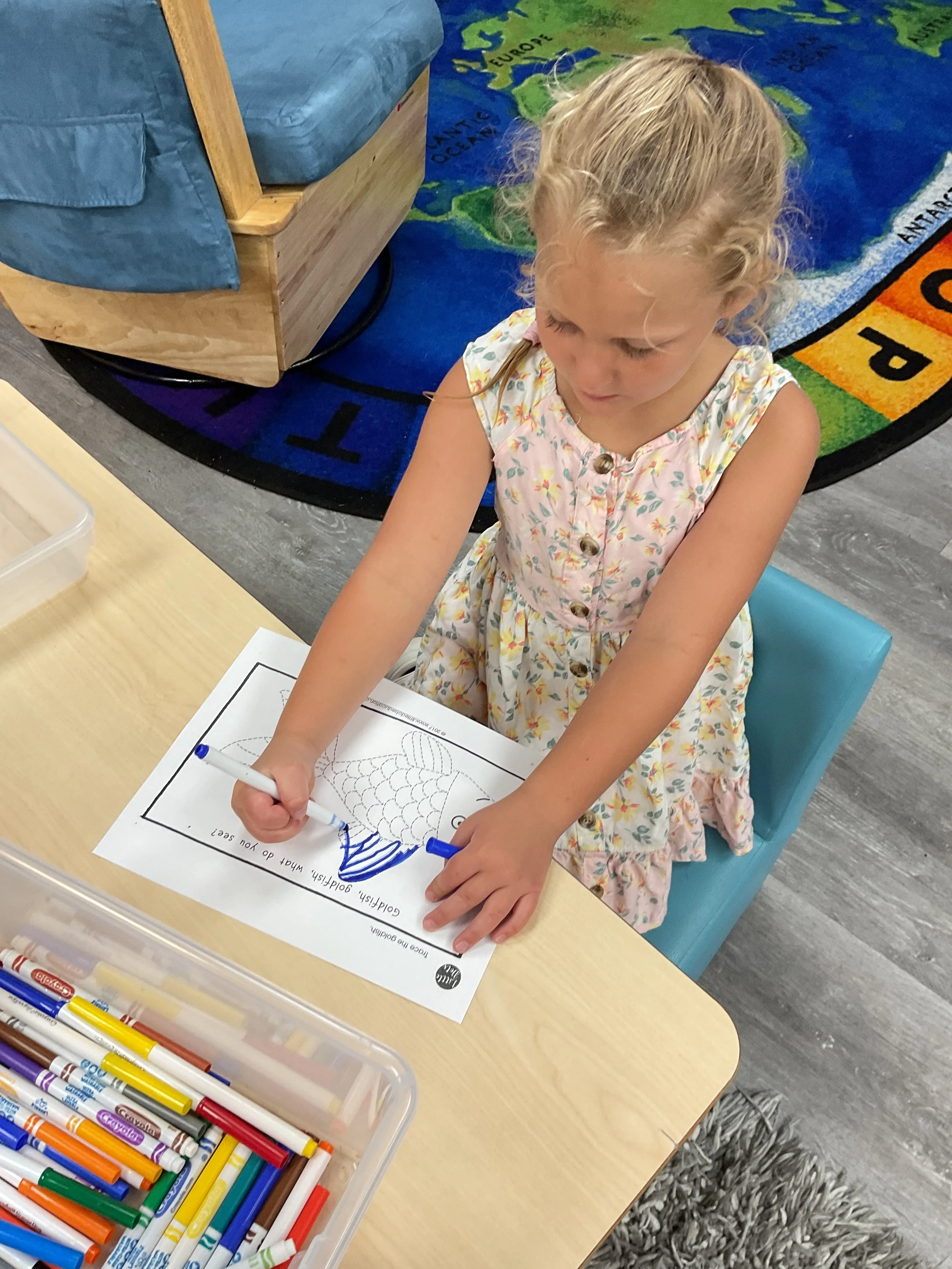 We had the best water day today! We had a kid vs. teacher water war, the kids definitely won. The victors then enjoyed popsicles! Today we read the book The Tiny Seed written and illustrated by Eric Carle. During music and movement time, we had a yoga class. During our math and cognition lesson, we worked on shape and color recognition using a Brown Bear color wheel. Next, for our science and sensory lesson, we filled our sensory bin with kinetic sand and made animals from Eric Carle's illustrations. Finally, during our fine motor and literacy lesson, we worked on our 3-finger grip by tracing lines.