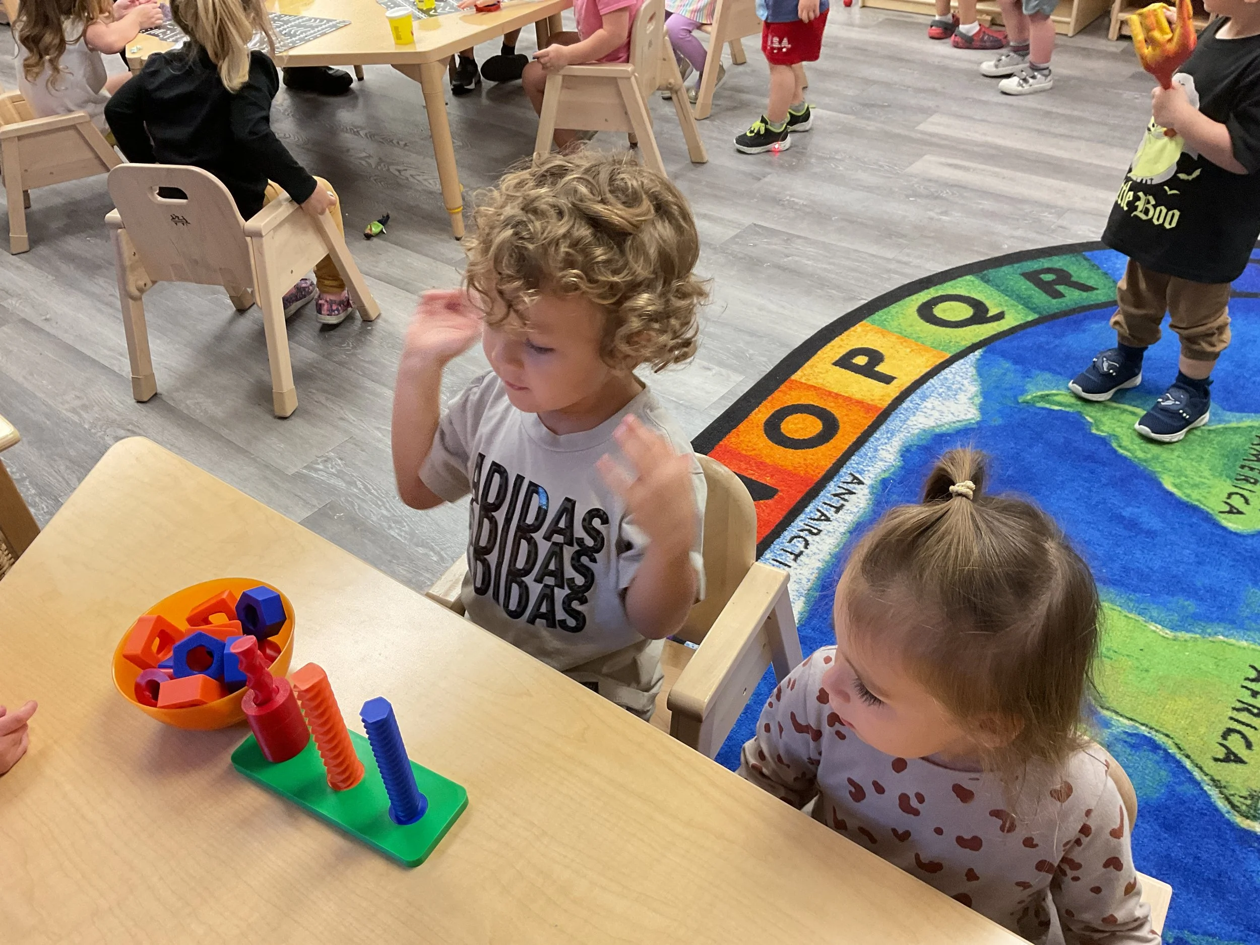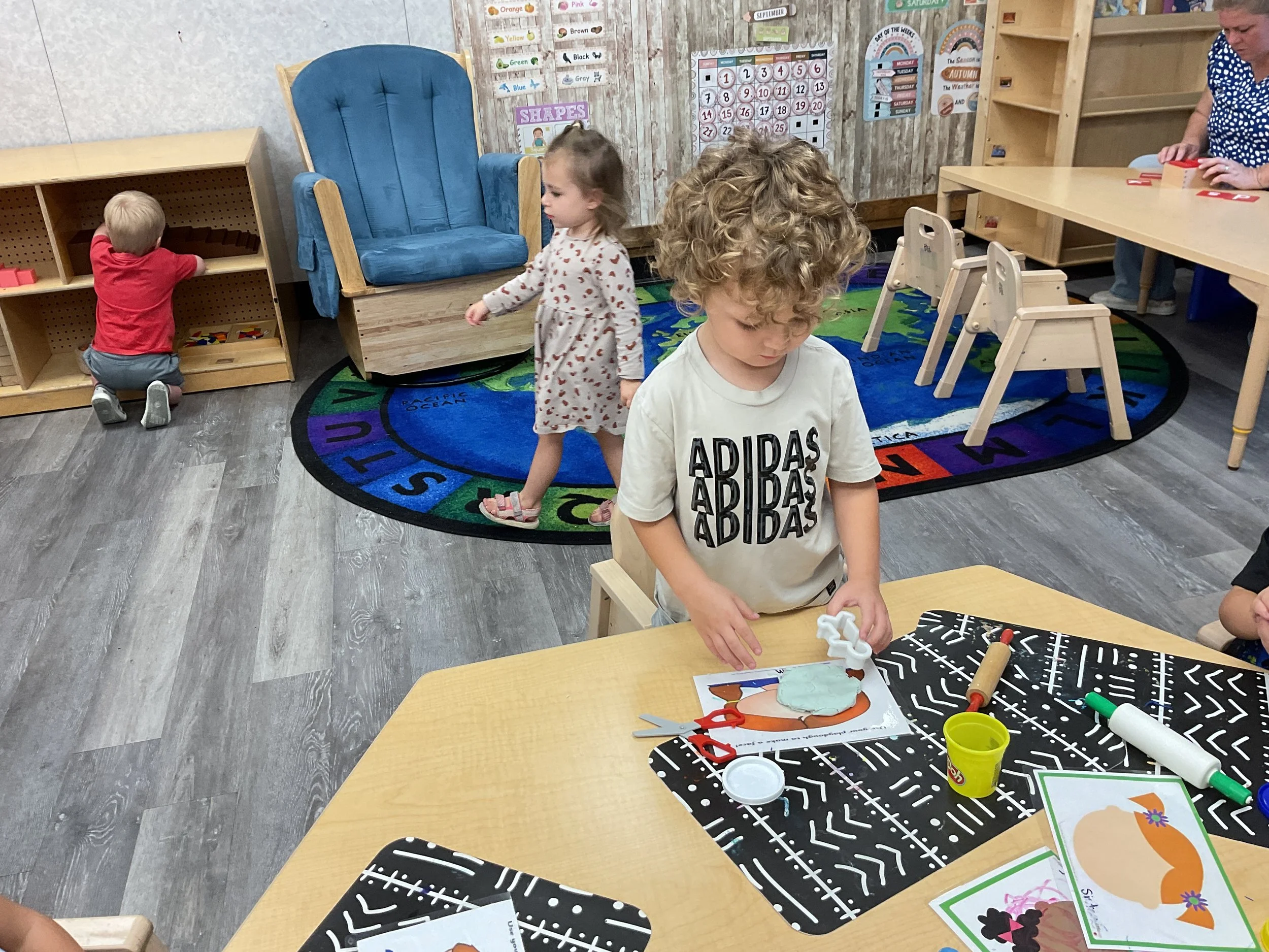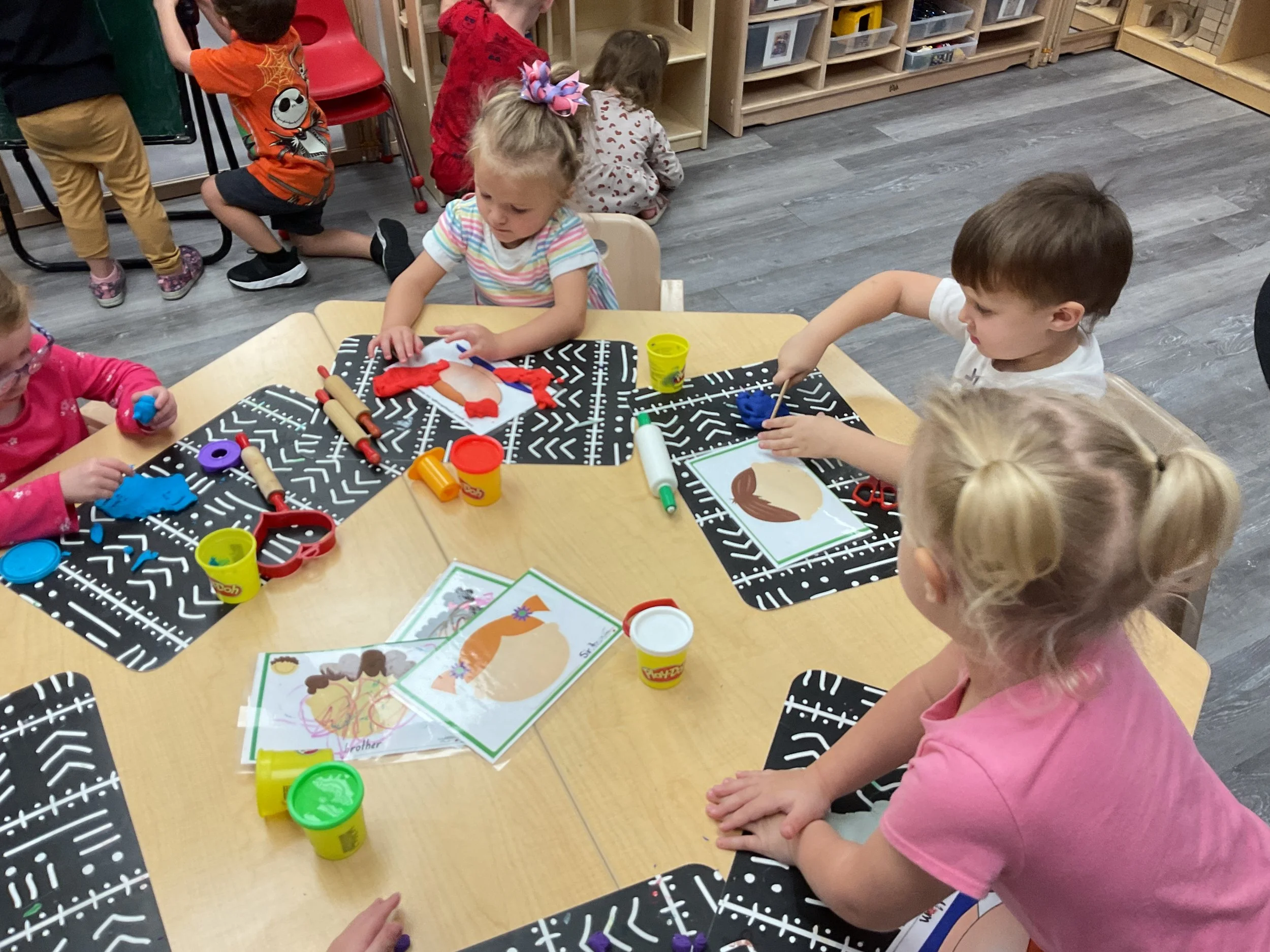 Today we read the book Llama, Llama Misses Mama written by Anna Dewdney. During our music and movement time, we took our big speaker out to the playground and had a morning dance party! Then, during our math and cognition lesson, we used our hands to make clapping patterns. Next, during our science and sensory lesson, we used playdough to make our friends and families. Finally, for our fine motor and literacy lesson, we practiced cutting out pictures of our famiies!