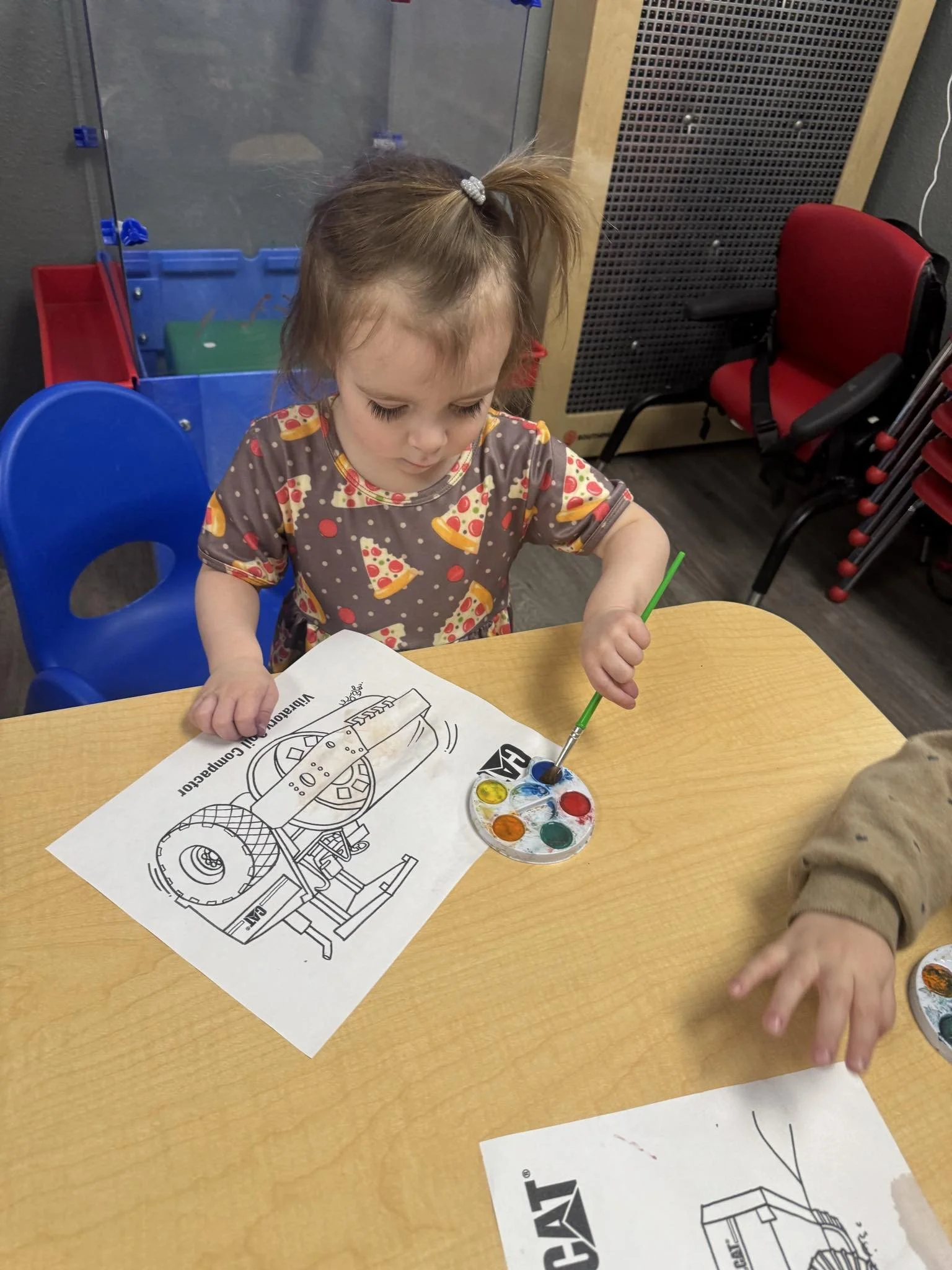 Today we read a book about a trash truck called I Stink by Kate and Jim McMullan. During our math and cognition lesson, we worked on our one to one correspondence from numbers 1 – 20. For our sensory and science lesson, we used watercolors to paint pictures of big construction equipment. During our fine motor and literacy lesson, we listened to a book on tape.