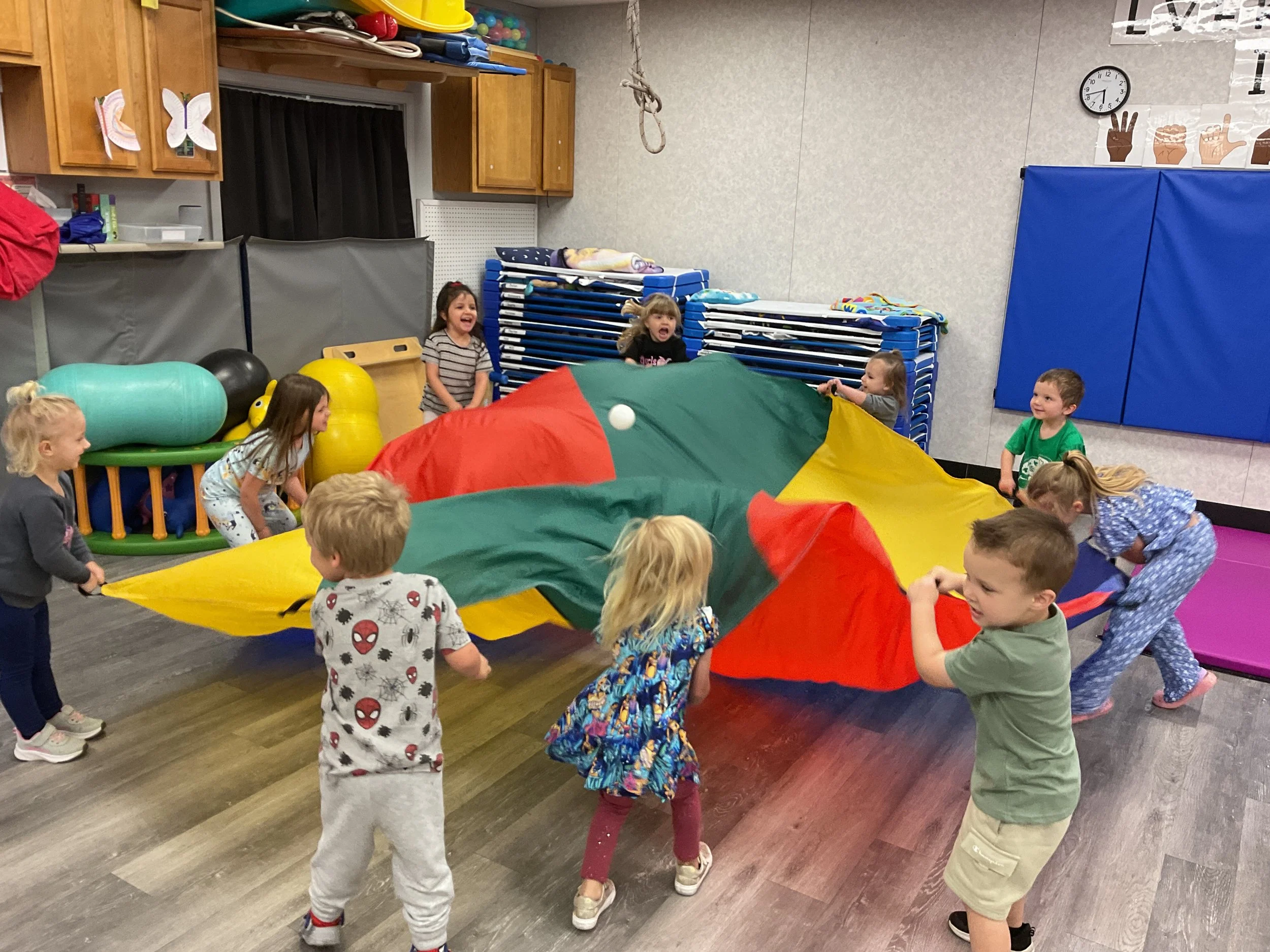 Today we read the book Grow Flower Grow written by Lisa Bruce and illustrated by Rosalind Beardshaw. This morning we played with the big parachute and used it to make a fort! During our math and cognition lesson, we matched uppercase letters to the correct lowercase letters. Next, for our sensory and science lesson, we put white carnations into colored water to experiment if the flowers will change colors over the next few days. Finally, for our fine motor and sensory lesson, we used our fork flower paintings from yesterday and we put a nice umbrella over our flowers.