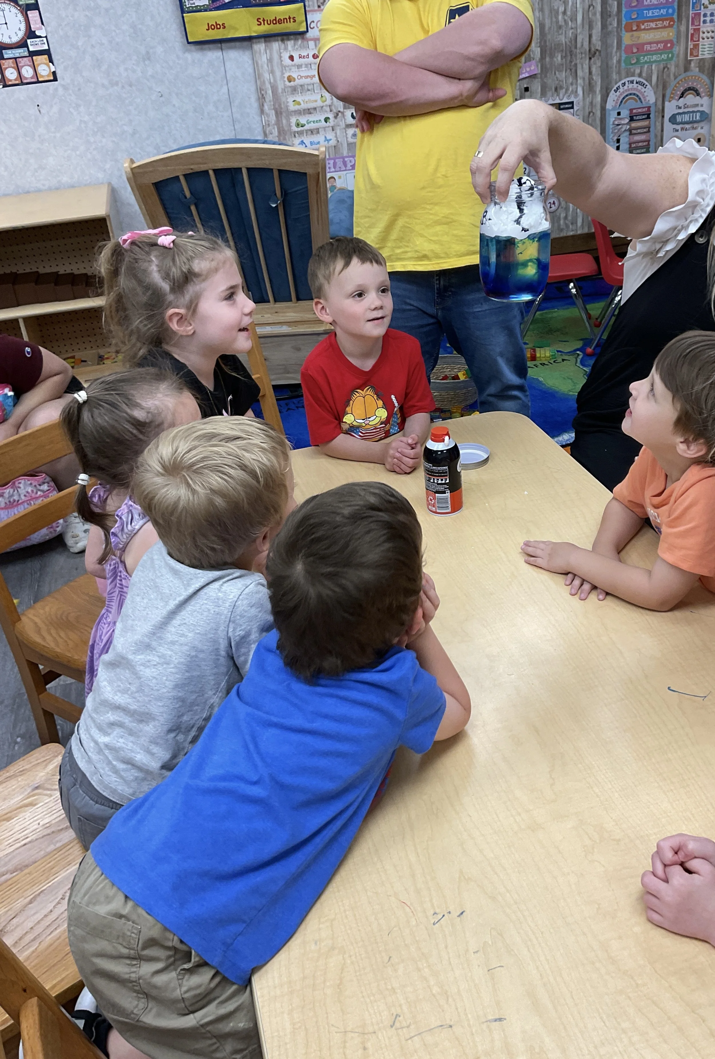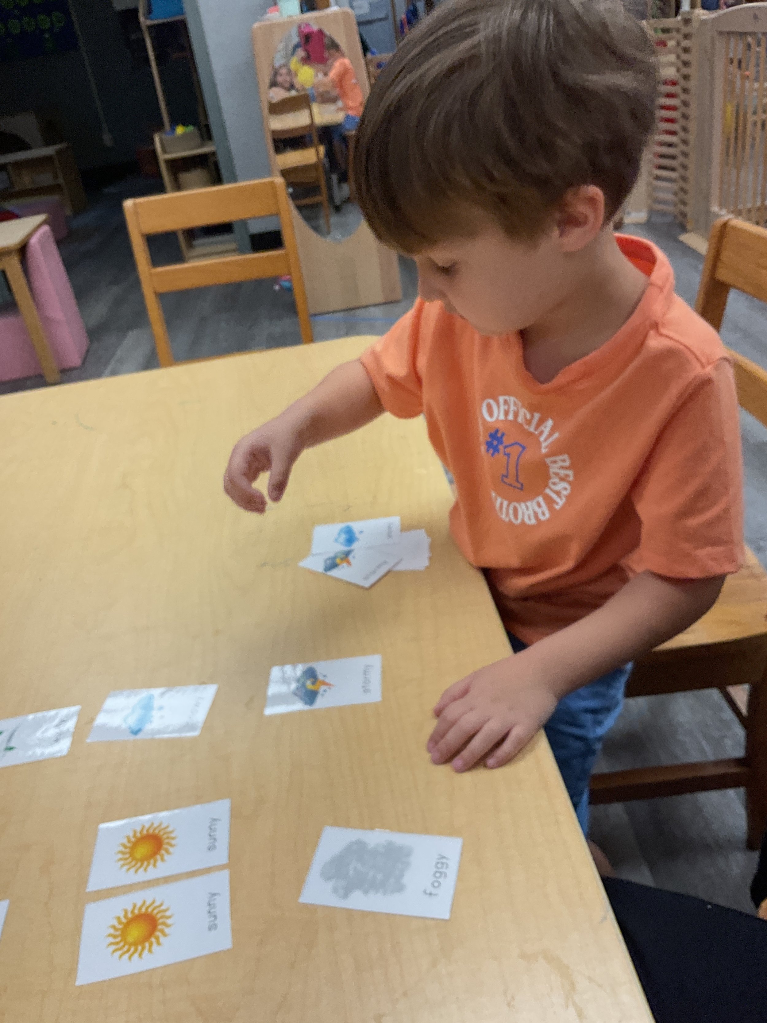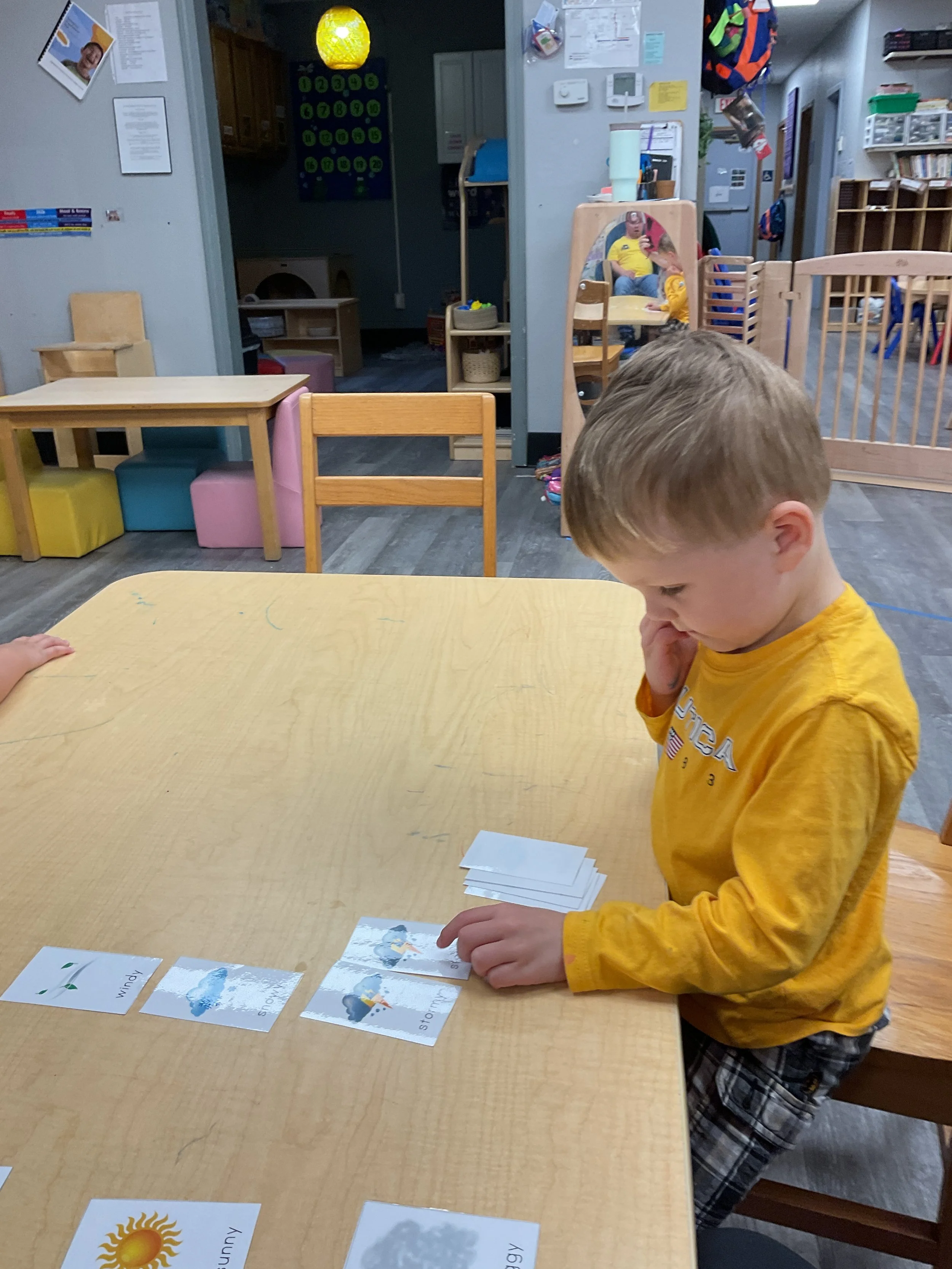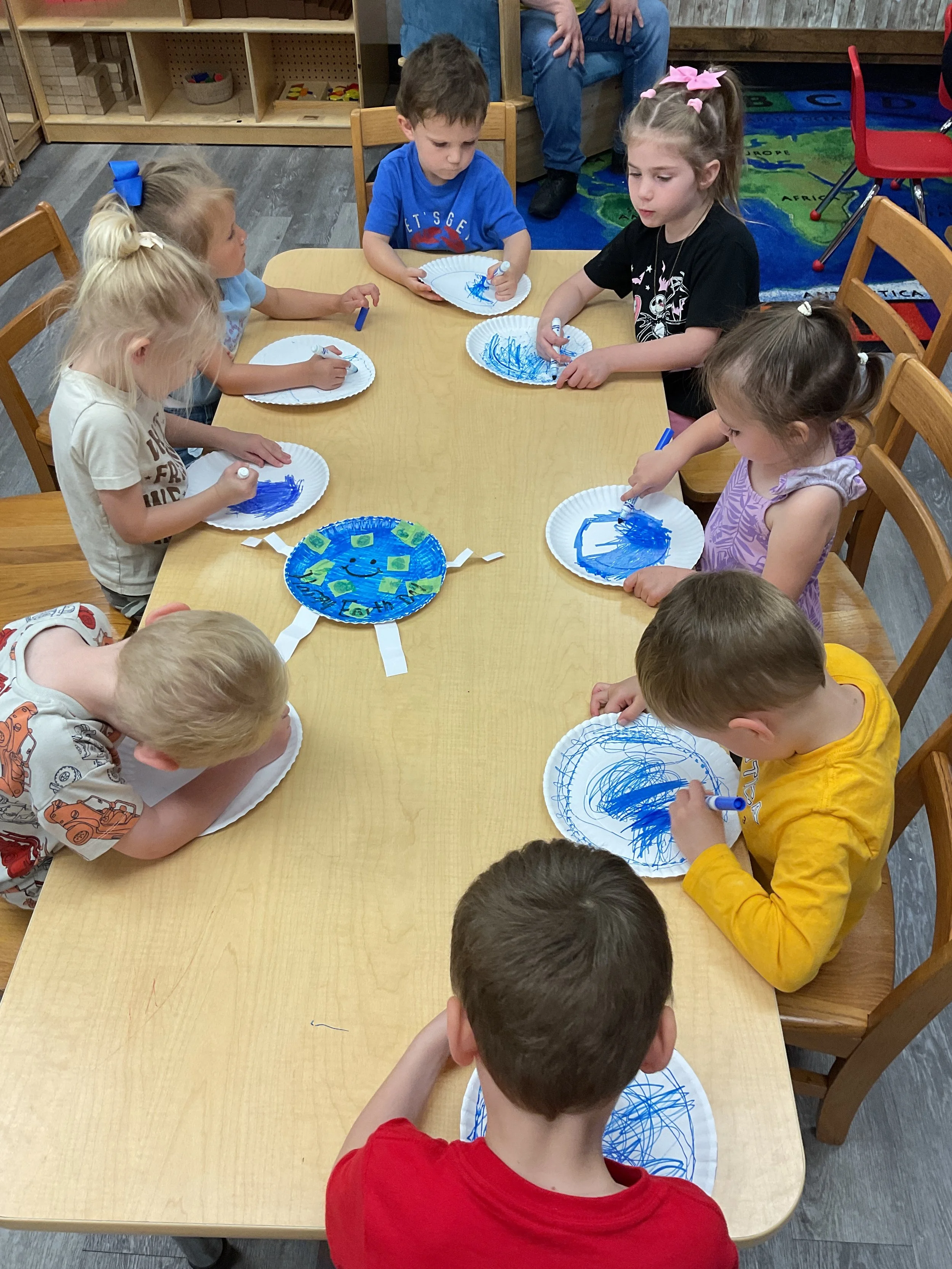 This morning, we read the book One Windy Day written by Tammi Salzano and illustrated by Hannah Wood. During our music and movement time, we used different equipment to help strengthen our cores. Then, during our math and cognition lesson, we matched pictures of weather together. Next, for our science and sensory lesson, we made it rain! We did this by filling a clear jar with water, then we topped it with shaving cream to represent a cloud before we dropped blue food coloring on the cloud to represent rain. We watched the path the “rain” took, and we watched it “rain” into the jar. Finally, for our literacy and fine motor lesson, we pained our hands and made umbrellas! Today is also Earth Day, to celebrate we made the planet Earth.