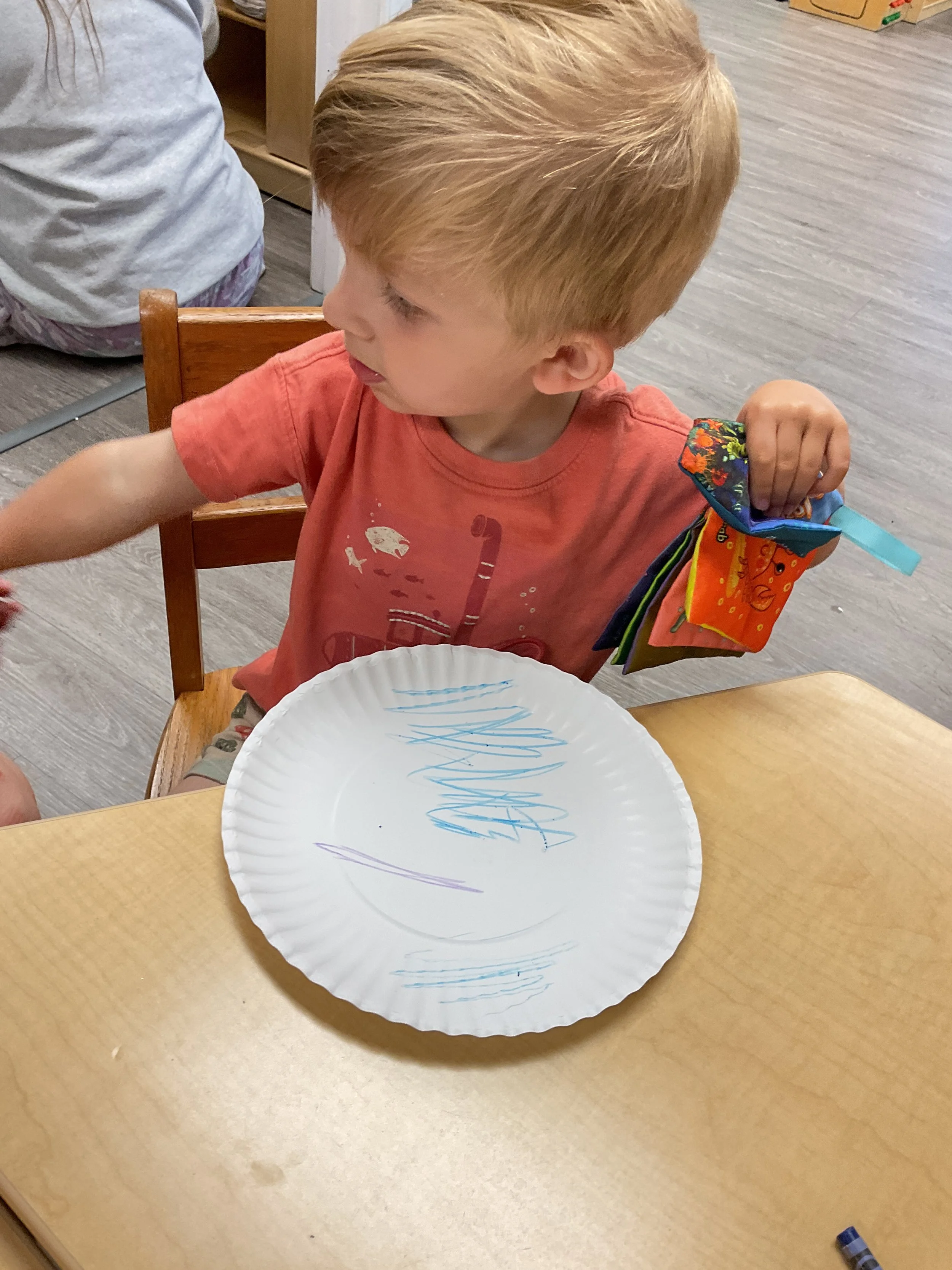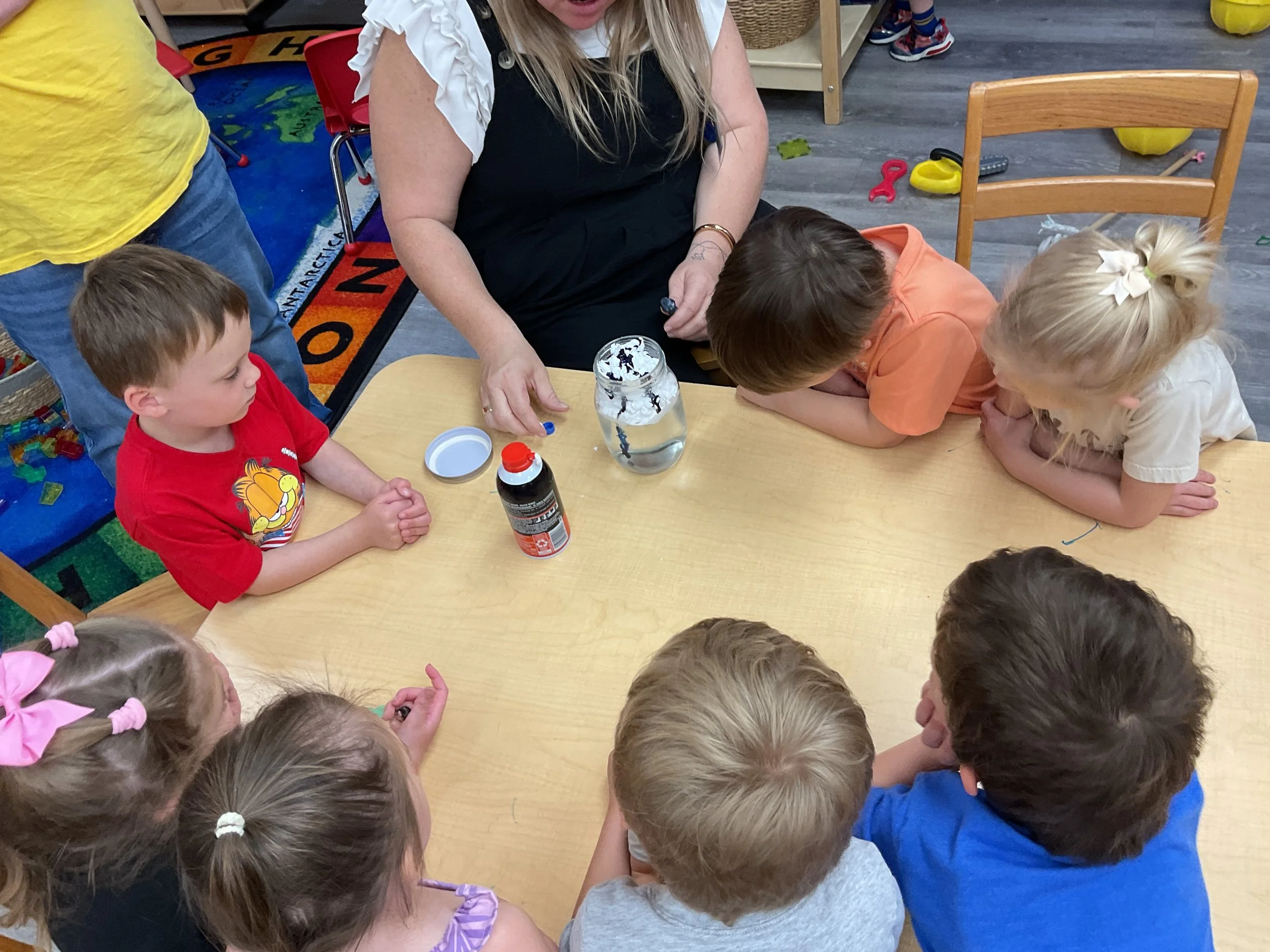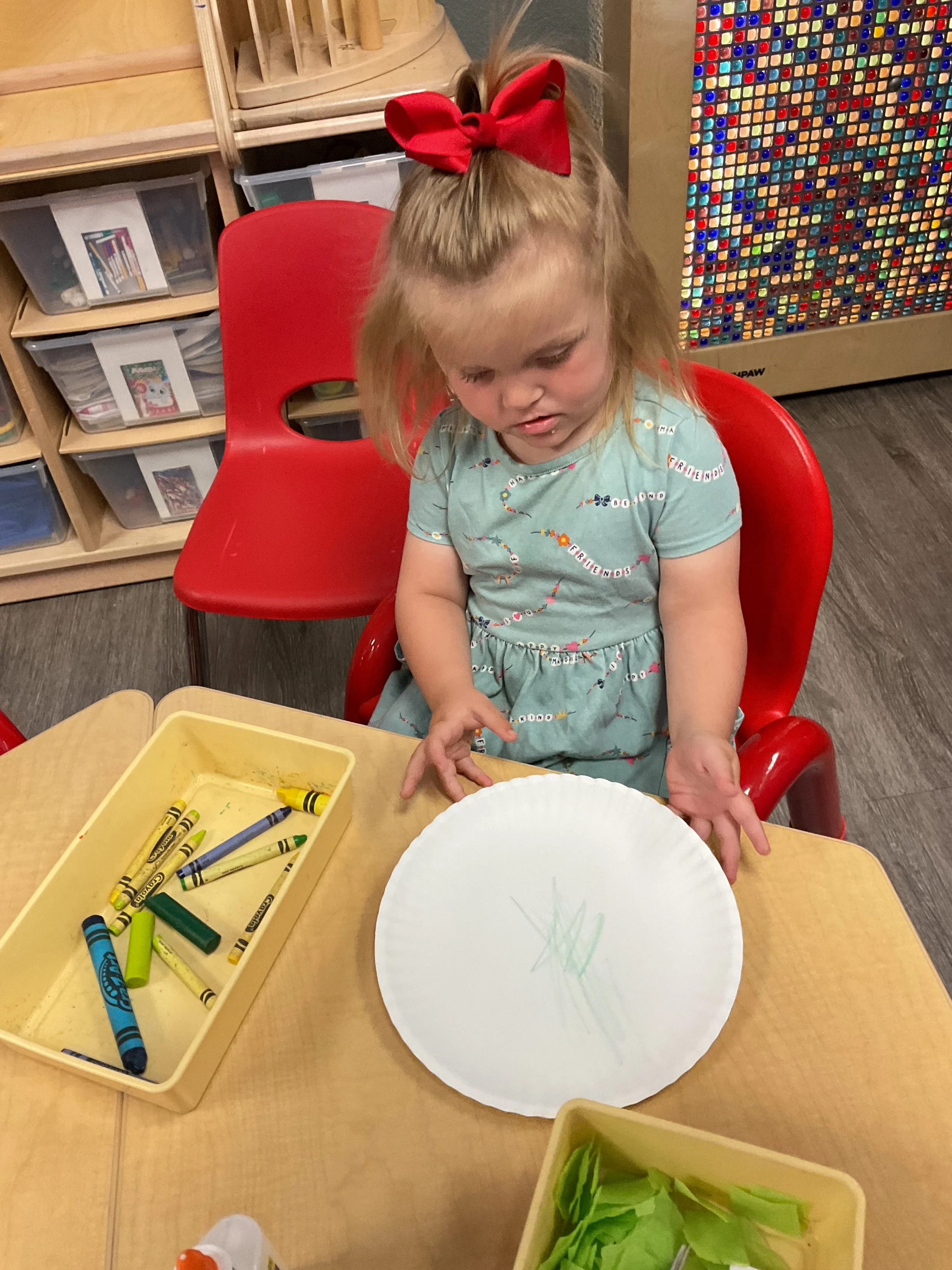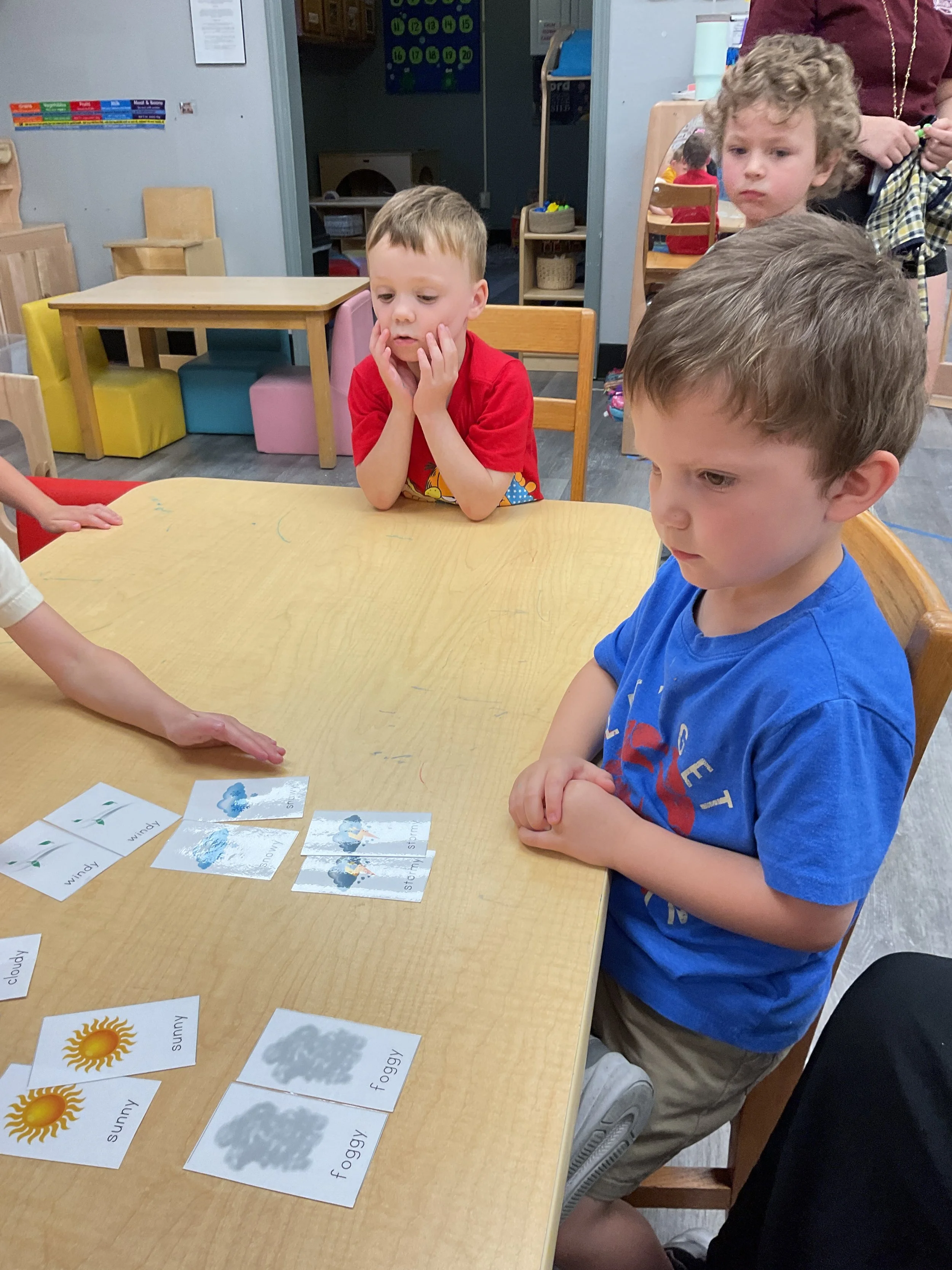 This morning, we read the book One Windy Day written by Tammi Salzano and illustrated by Hannah Wood. During our music and movement time, we used different equipment to help strengthen our cores. Then, during our math and cognition lesson, we matched pictures of weather together. Next, for our science and sensory lesson, we made it rain! We did this by filling a clear jar with water, then we topped it with shaving cream to represent a cloud before we dropped blue food coloring on the cloud to represent rain. We watched the path the “rain” took, and we watched it “rain” into the jar. Finally, for our literacy and fine motor lesson, we pained our hands and made umbrellas! Today is also Earth Day, to celebrate we made the planet Earth.