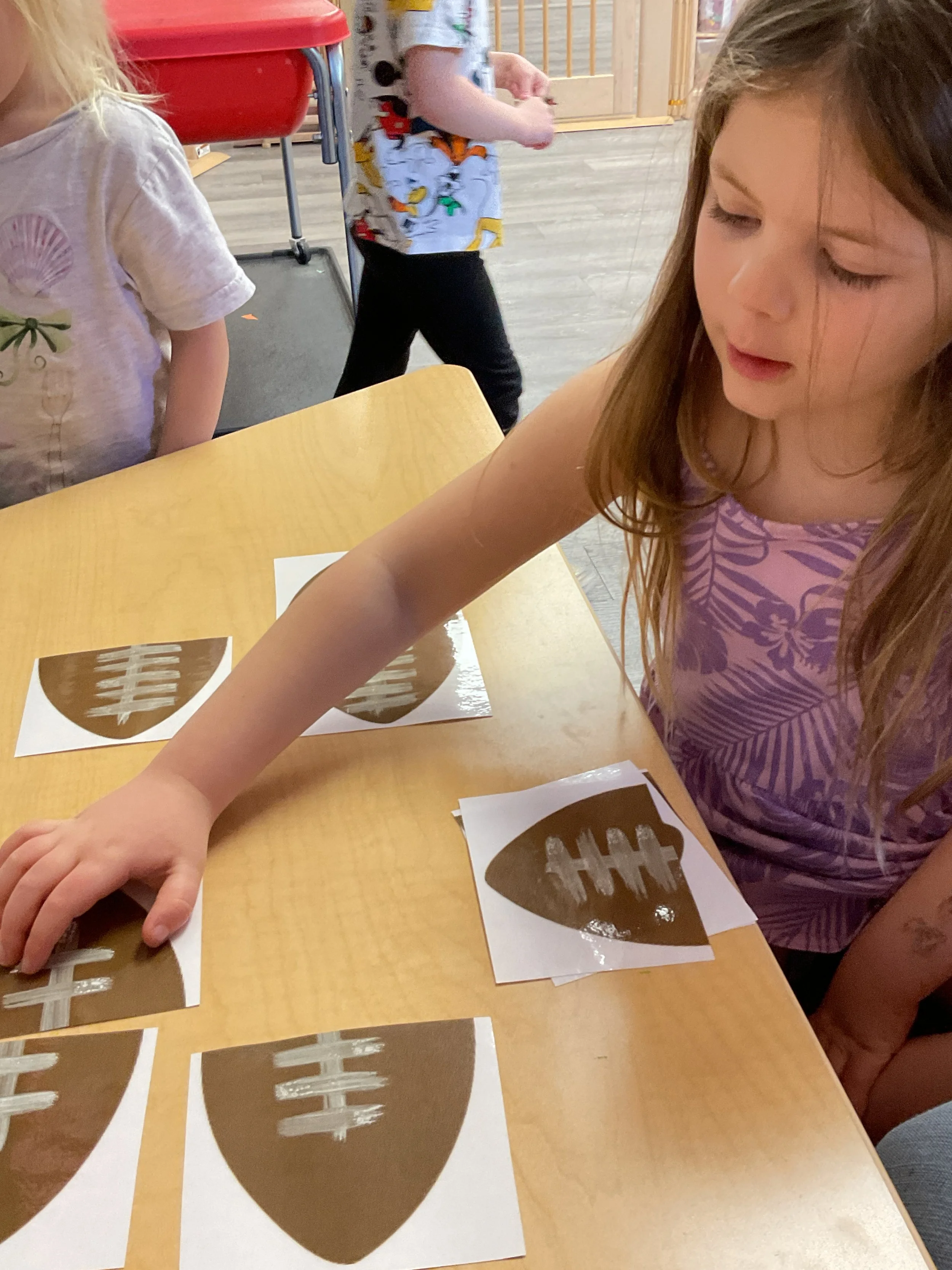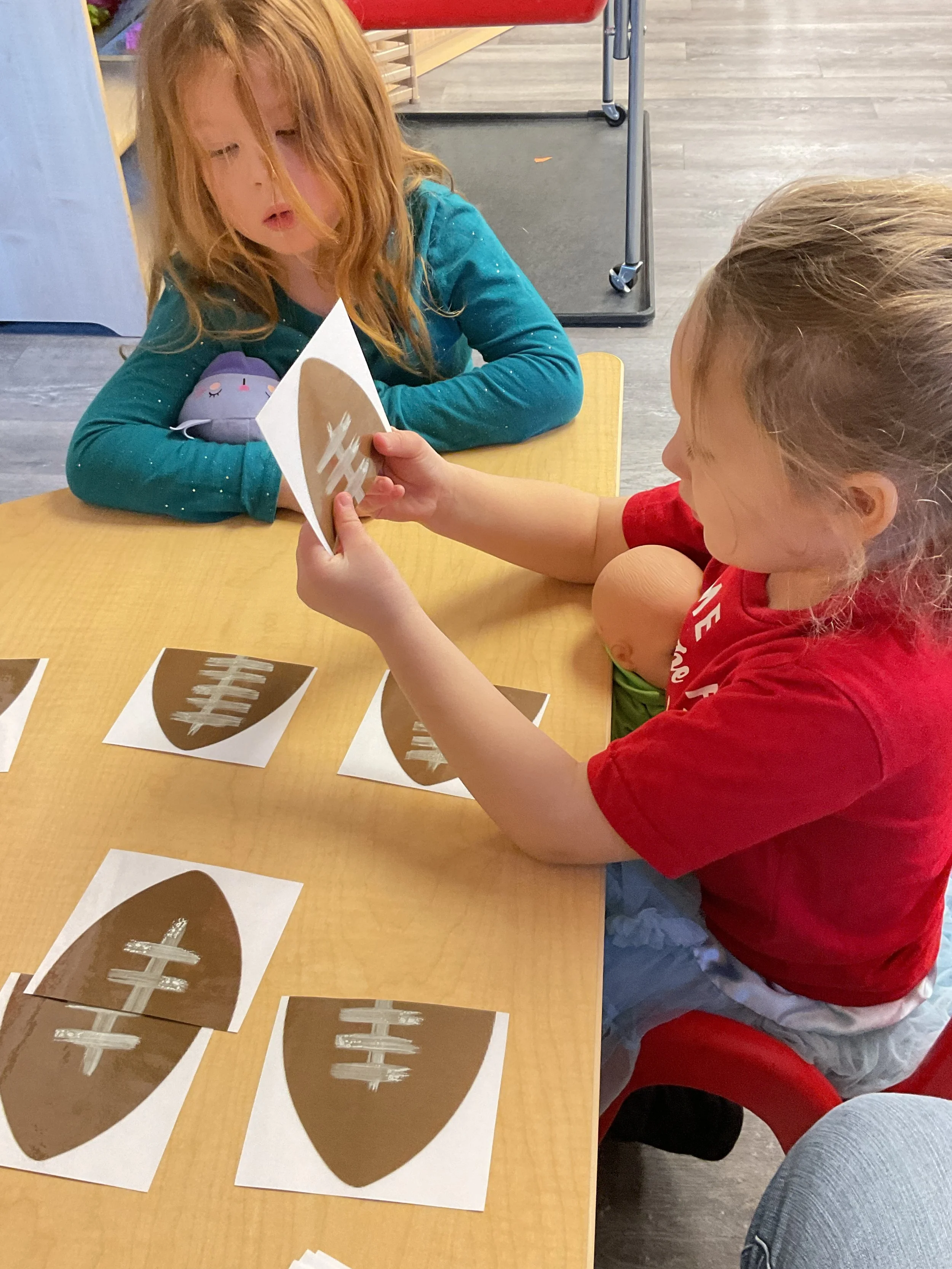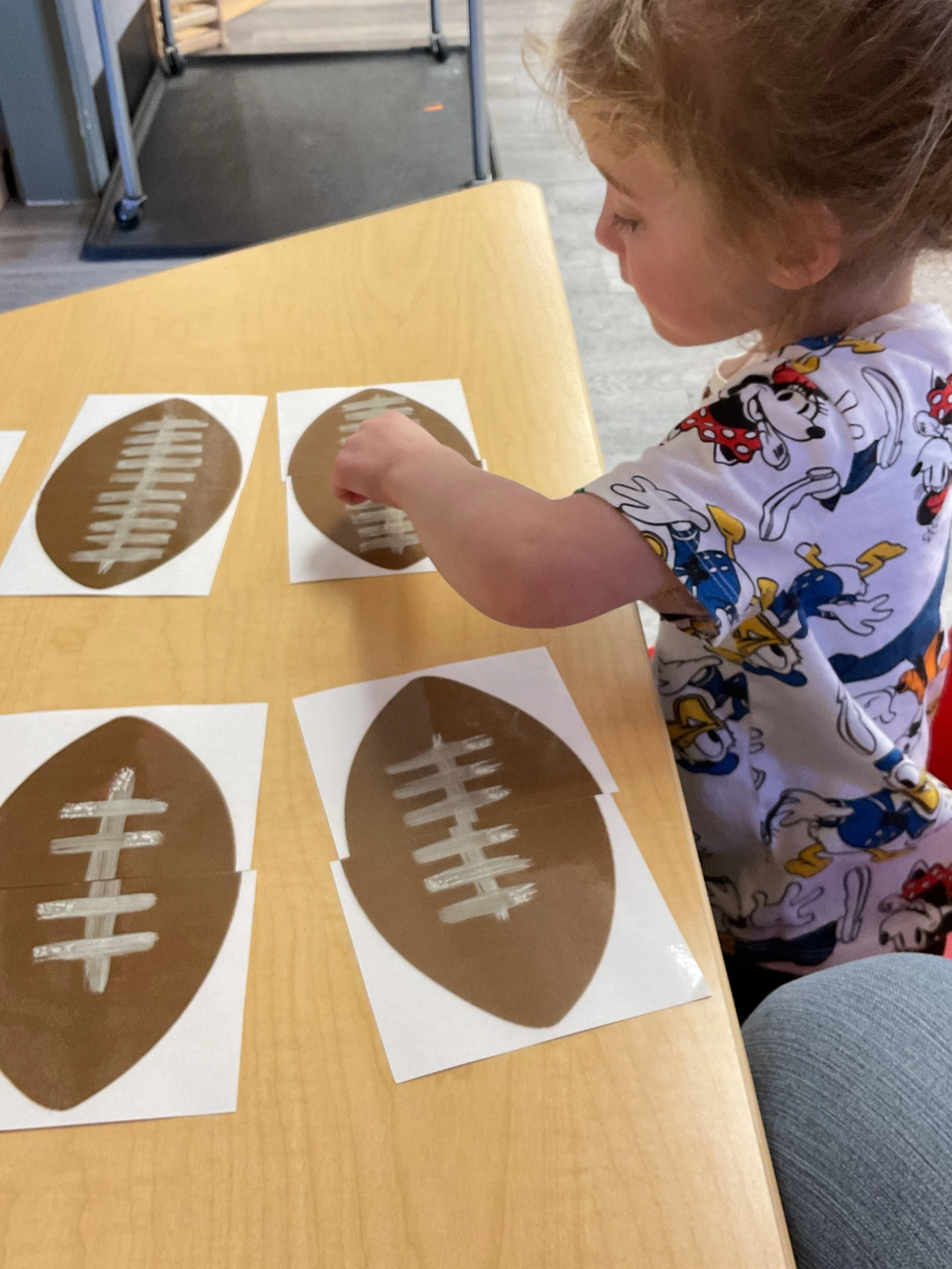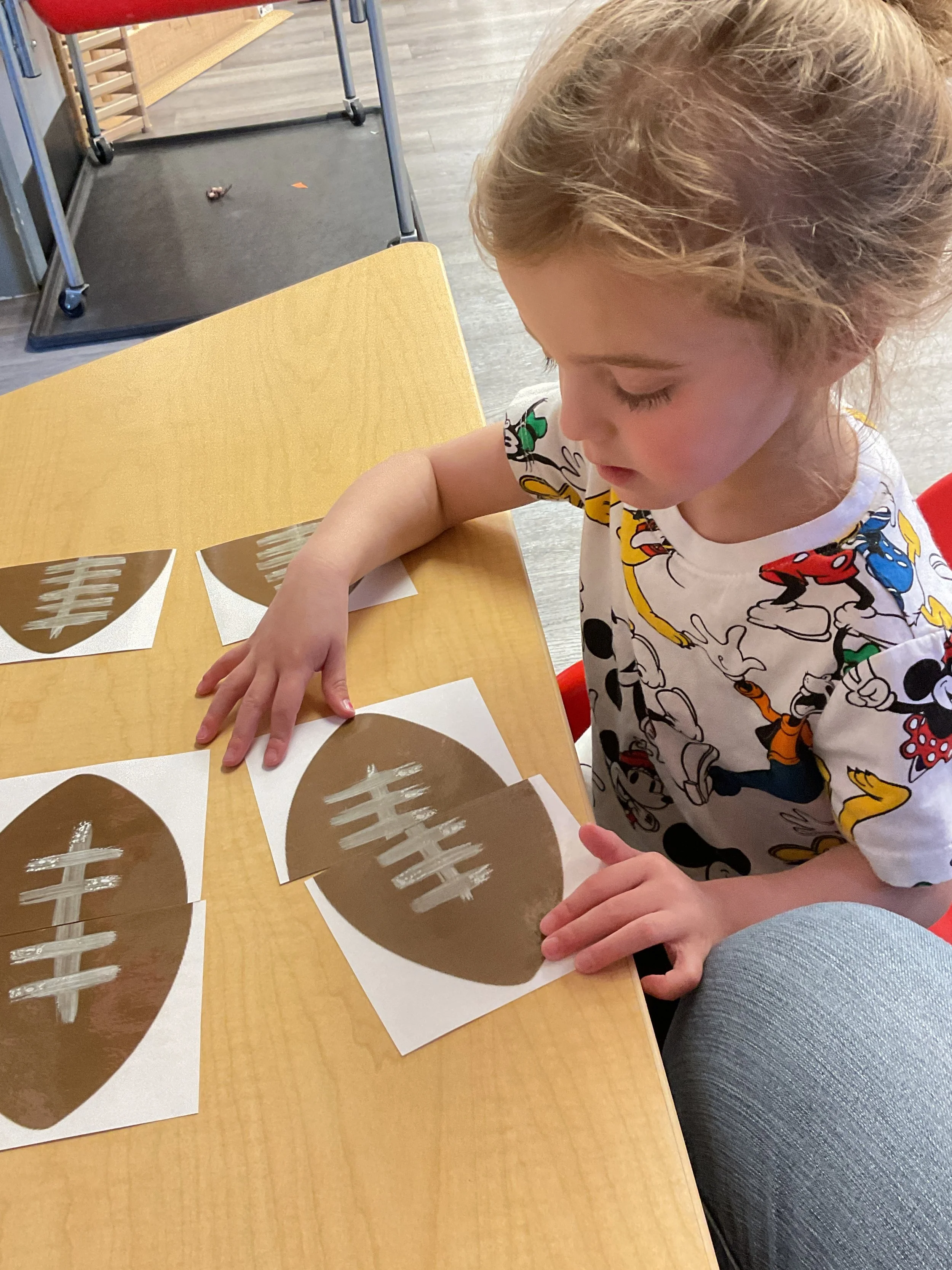 Today we read the book Dogs Don’t Wear Sneakers written by Laura Numeroff and illustrated by Joe Mathieu. During our math and cognition lesson, we counted the laces on footballs and had to find its match and we also matched football equipment together. Next, during our science and sensory lesson, we drew pictures of our favorite sports. Finally, during our fine motor and literacy lesson, we practiced tracing and writing our names.