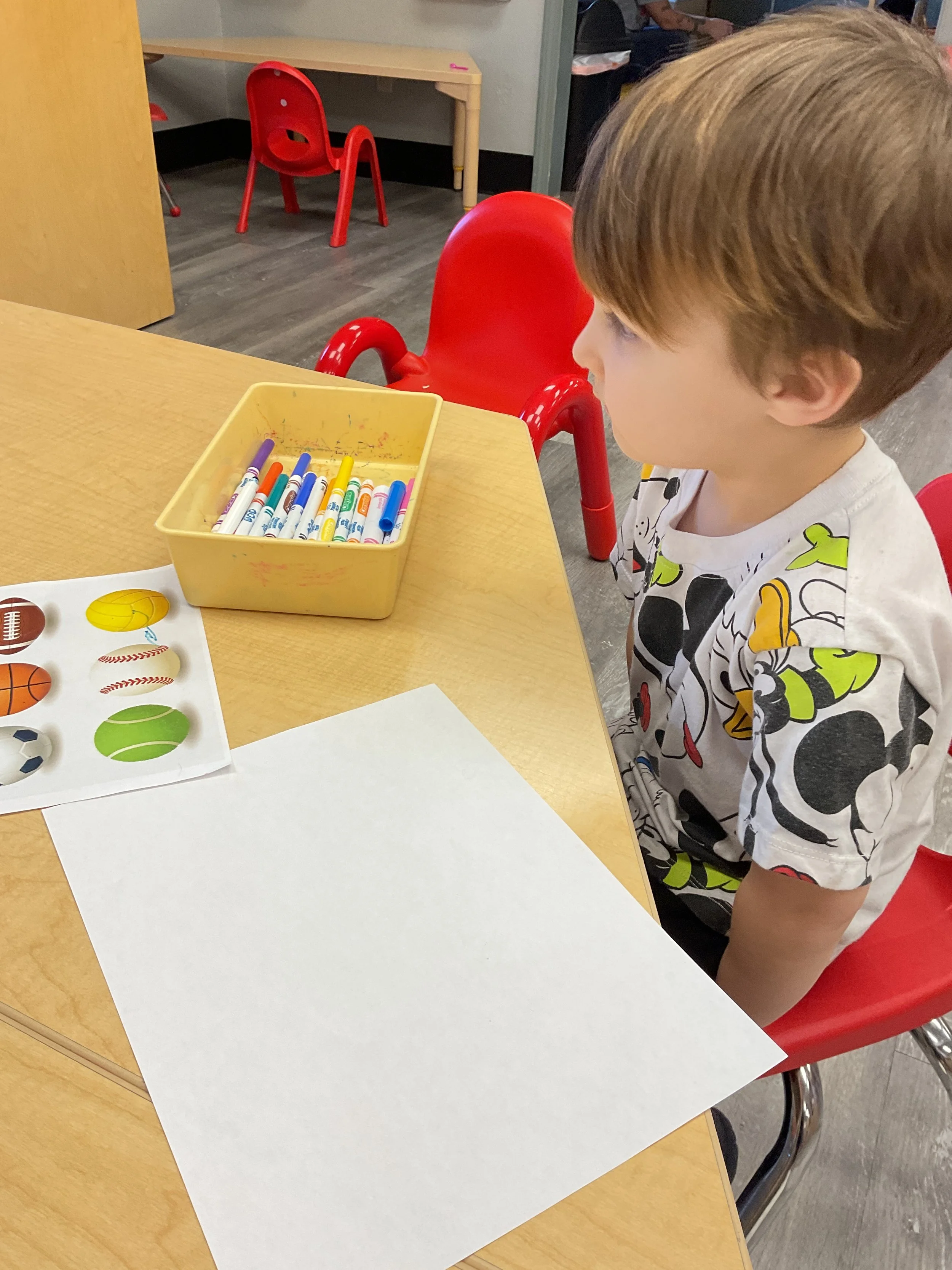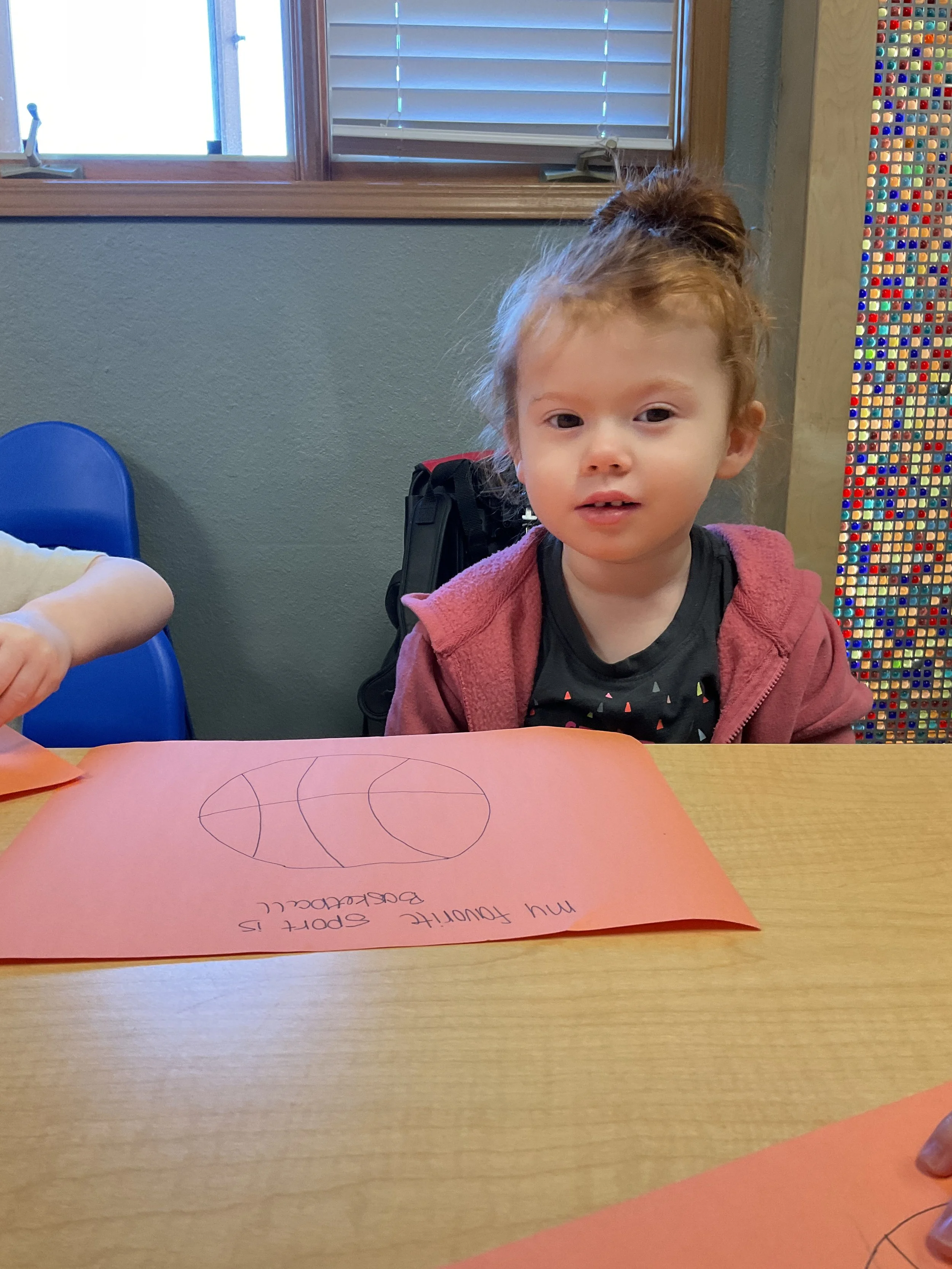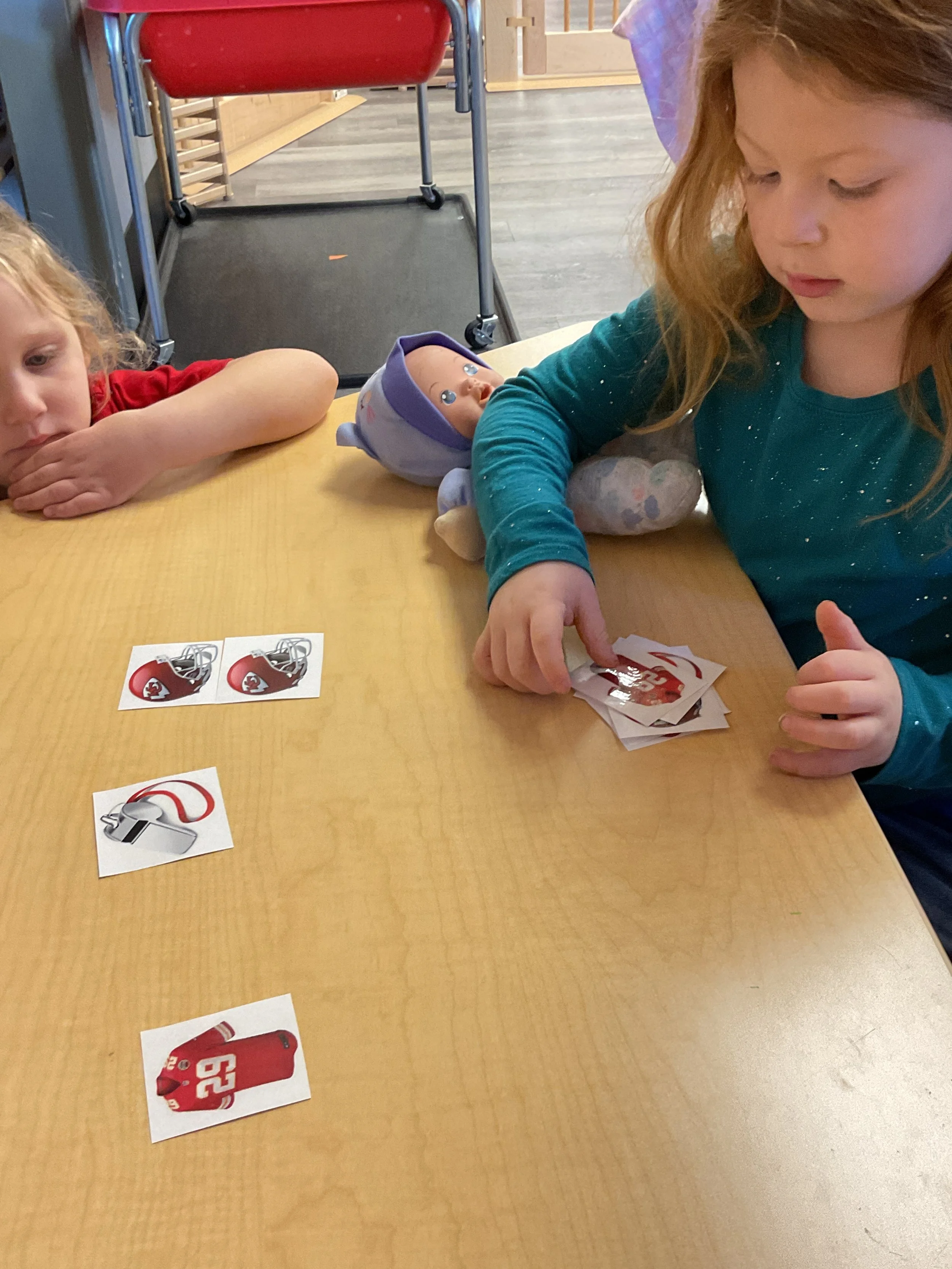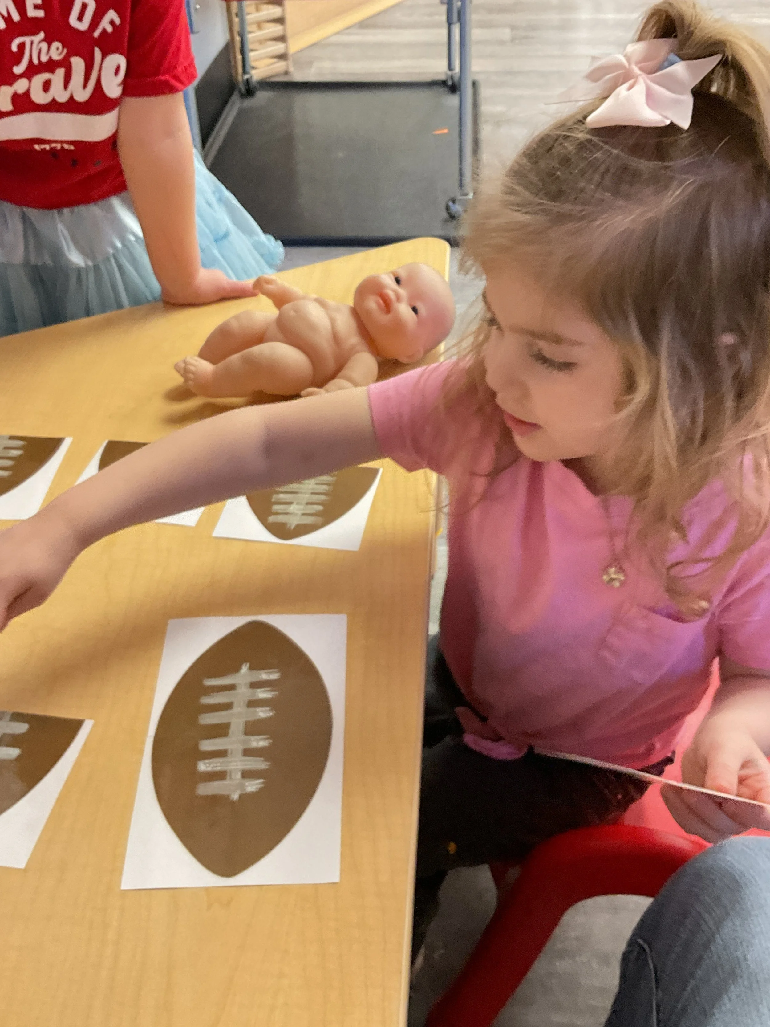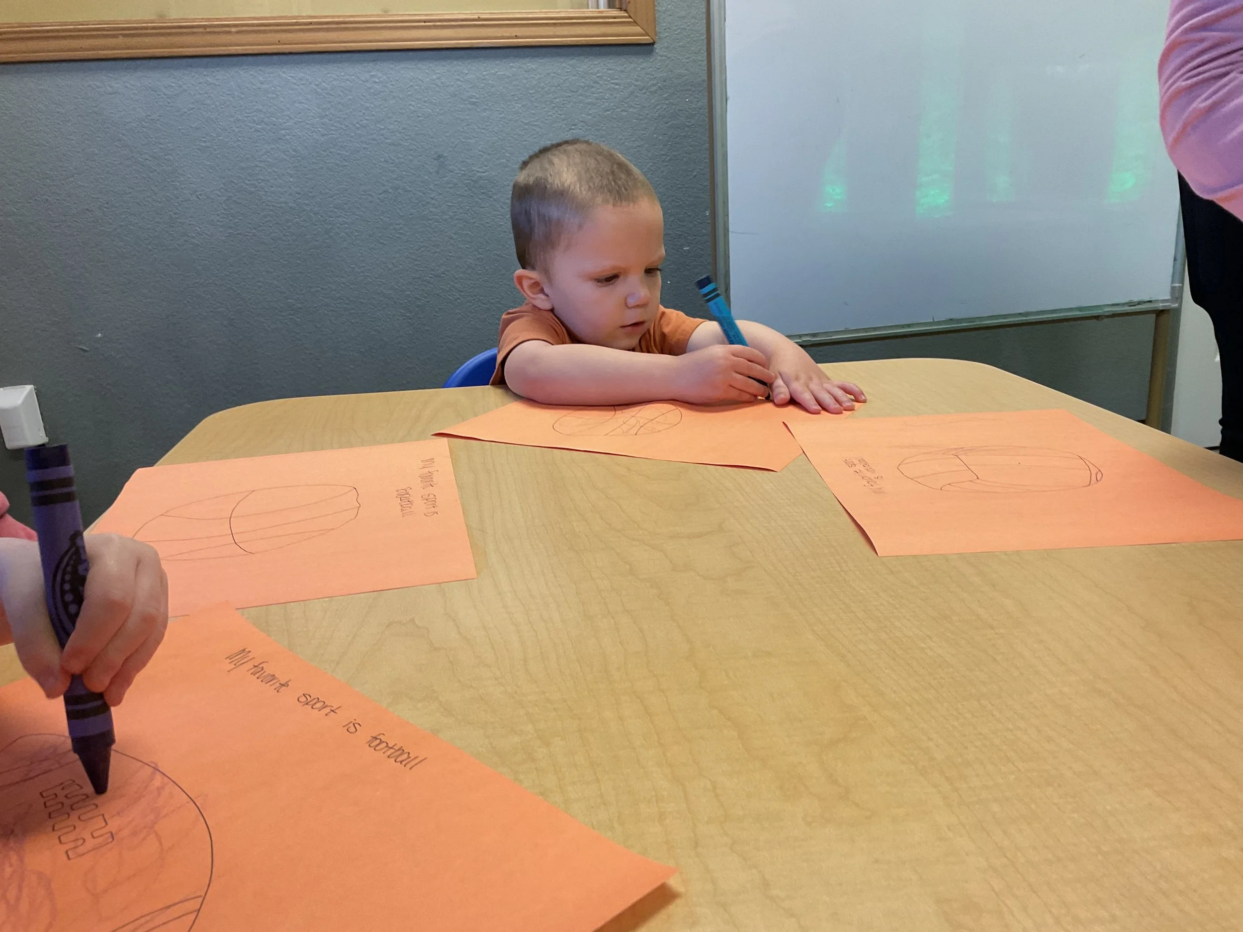 Today we read the book Dogs Don’t Wear Sneakers written by Laura Numeroff and illustrated by Joe Mathieu. During our math and cognition lesson, we counted the laces on footballs and had to find its match and we also matched football equipment together. Next, during our science and sensory lesson, we drew pictures of our favorite sports. Finally, during our fine motor and literacy lesson, we practiced tracing and writing our names.