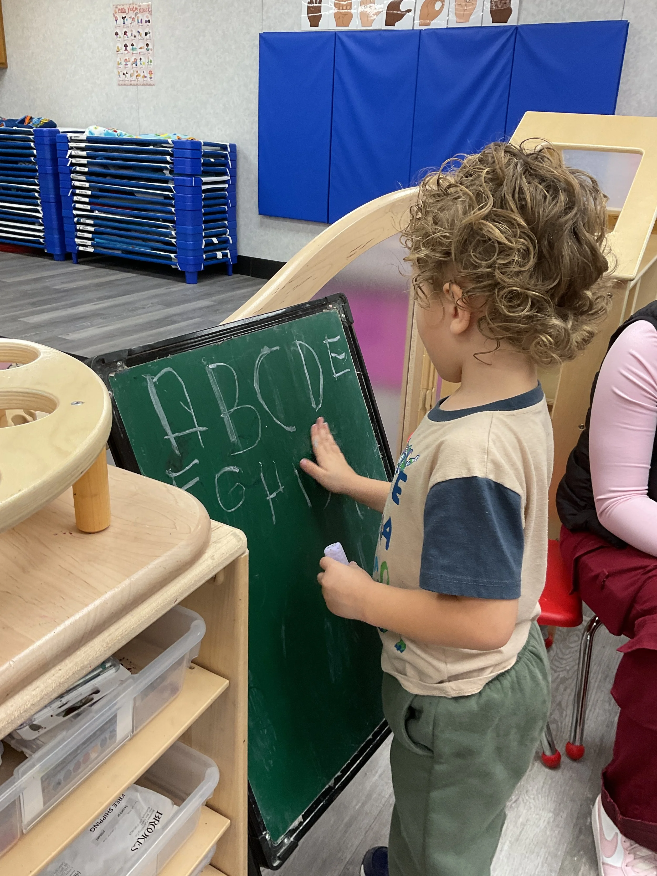This morning, we read the book Look, Listen, Taste, Touch, and Smell written by Pamela Hill Nottleton and illustrated by Becky Shinpe. During our music and movement time, we danced the wiggle dance and then stretched our bodies with some yoga. Then, during our math and cognition lesson, we used Uno cards to make Christmas lights! As we turned over an Uno card, we had to match the color and the number to let us know how many lights we needed. Next, for our science and sensory lesson, we filled our sensory bin with textured fabrics. Finally, during our fine motor and literacy lesson, we practiced tracing and writing our names.