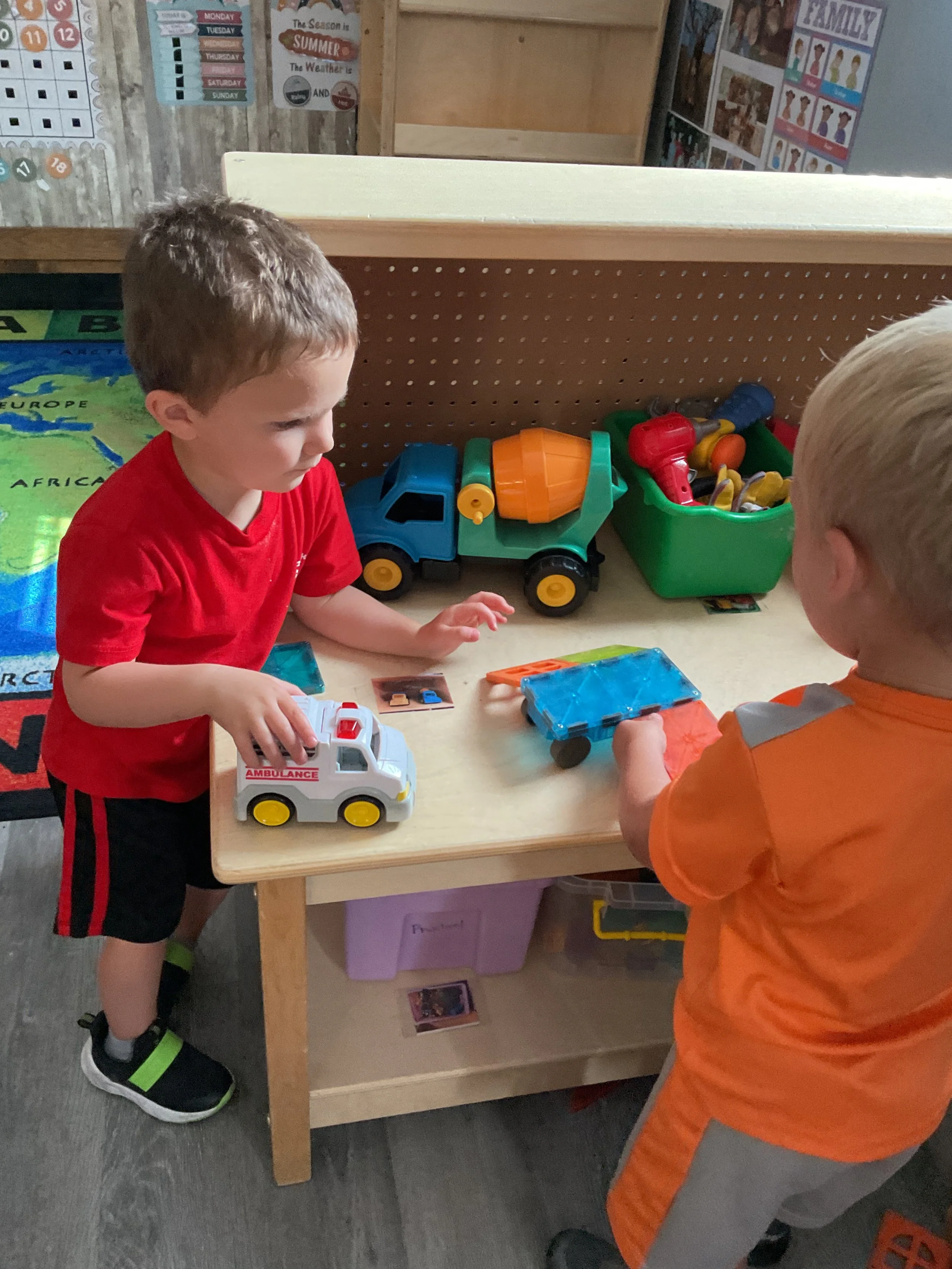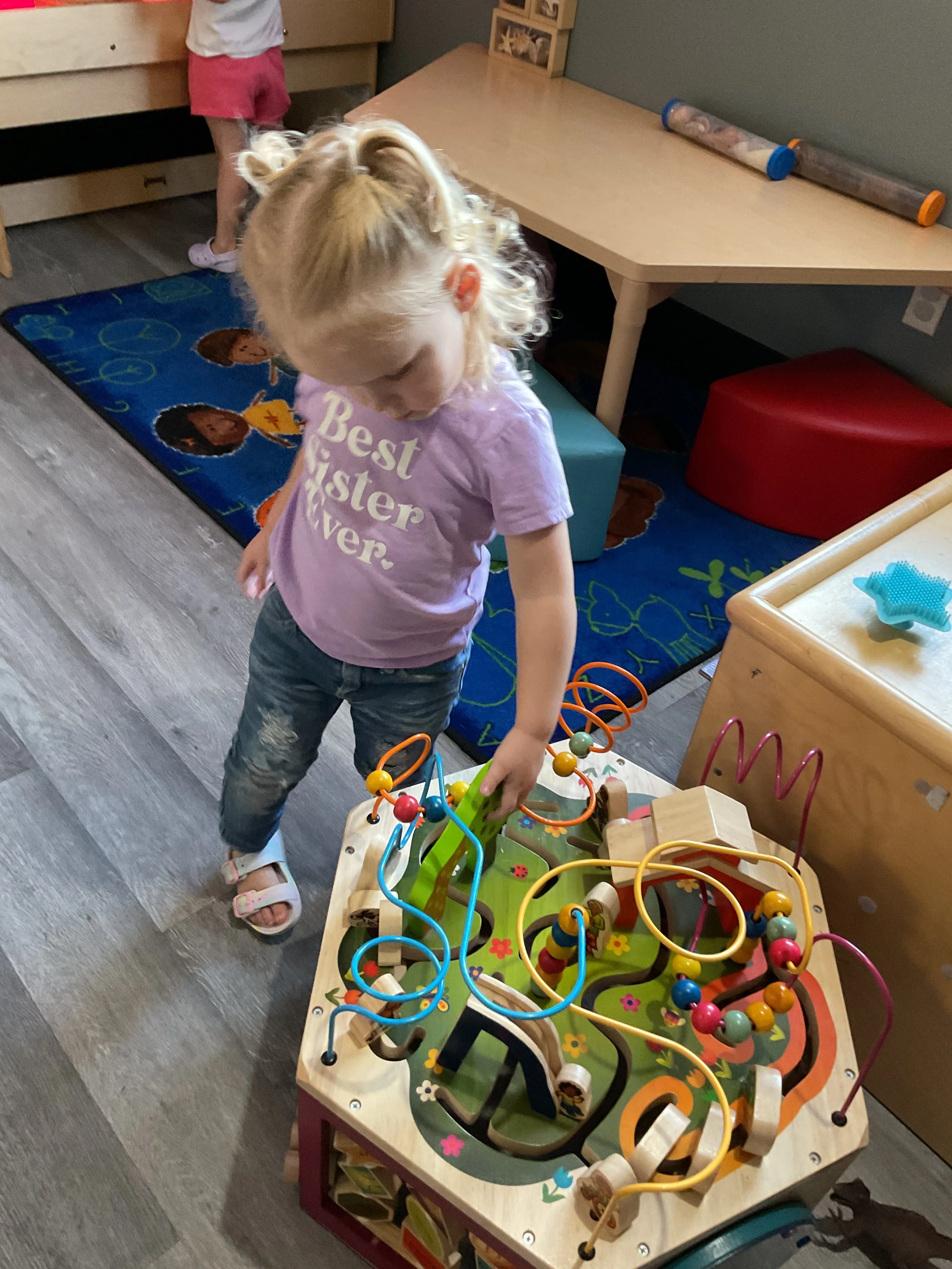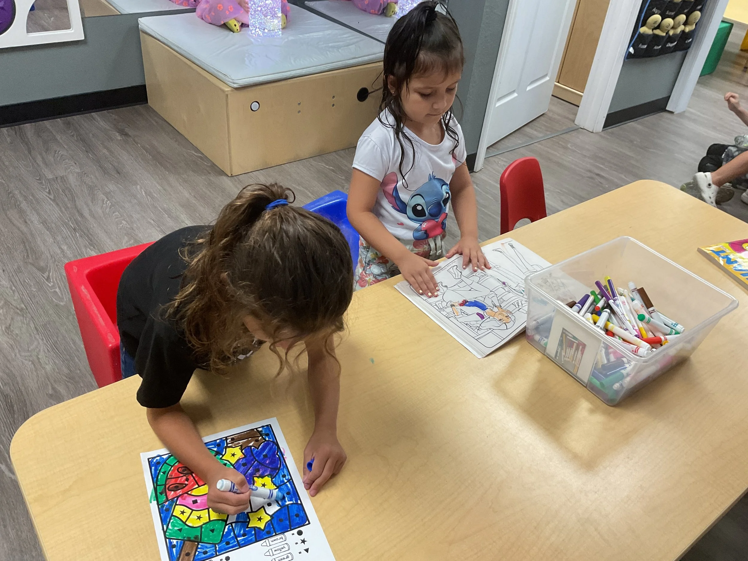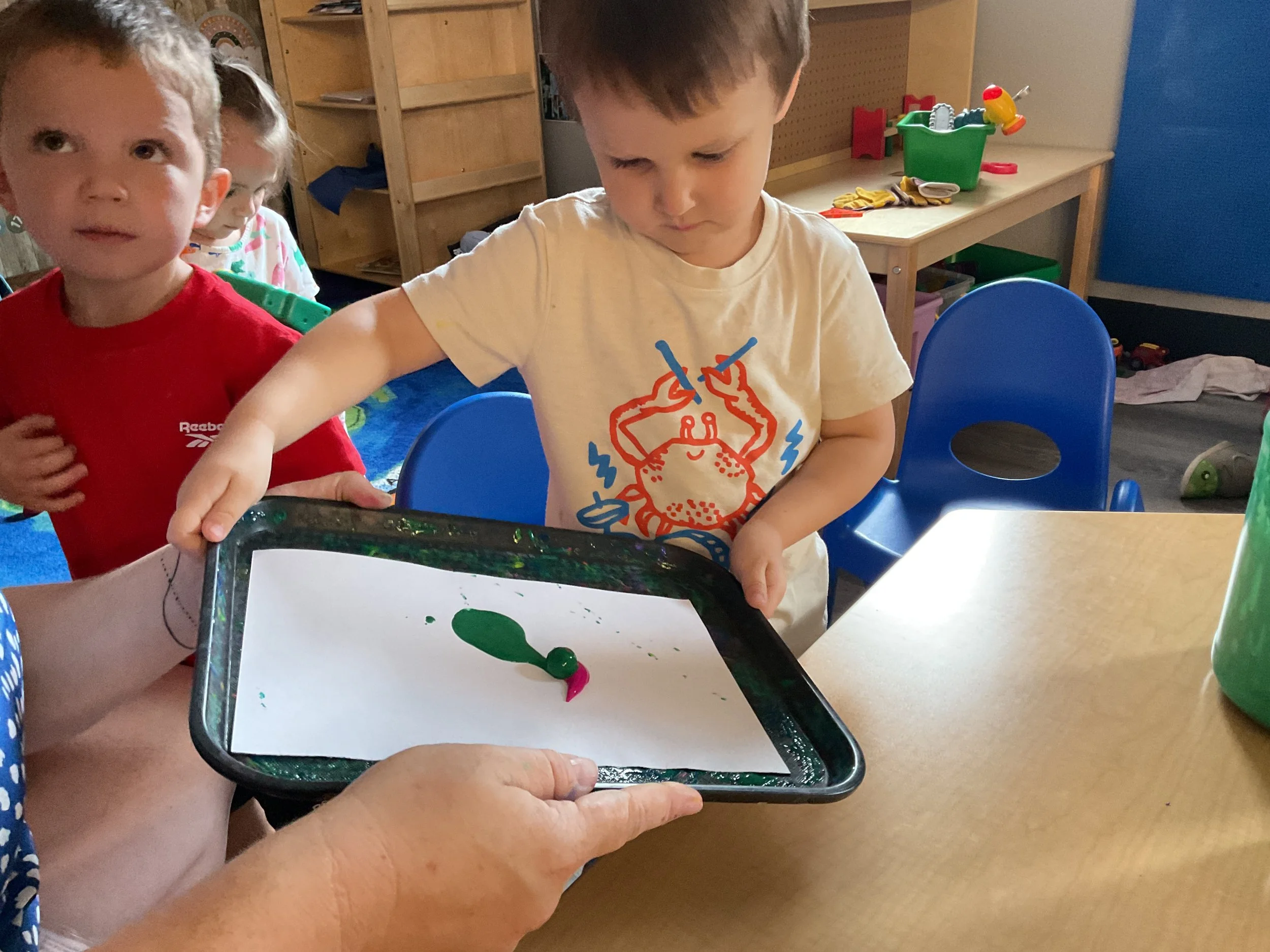 This morning, we read the book 8 Little Planets written by Chris Ferrie and illustrated by Lizzy Doyle. During music and movement time, we pretended that one of our friends was the sun and the rest of us were planets! We had to move in an orbit around the sun just like the planets in our solar system. During our math and cognition lesson, we matched space themed items. For our science and sensory lesson, we painted with marbles and colored a space picture. Finally, during our fine motor and literacy lesson, we practiced tracing and writing our names.