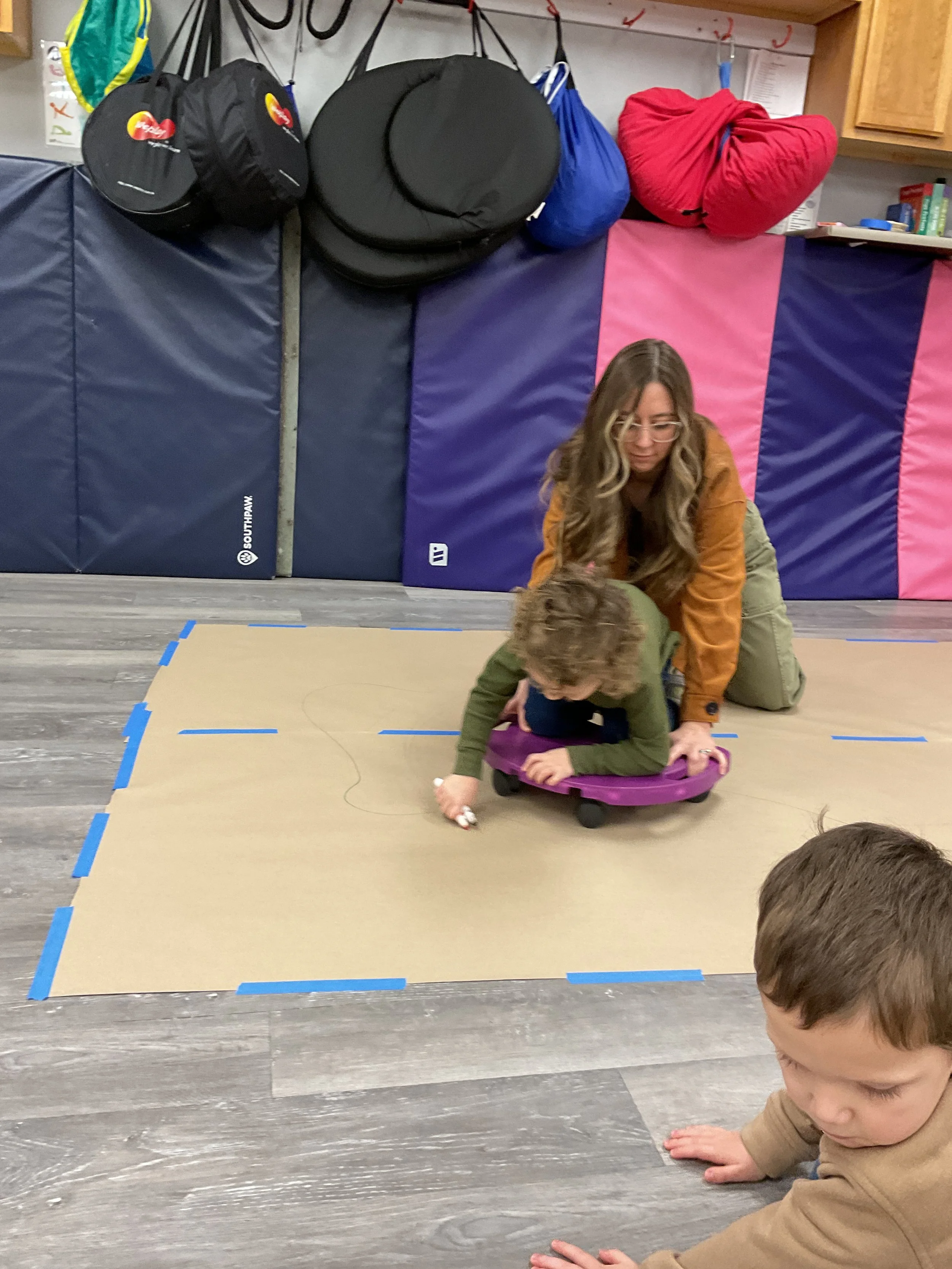 This morning, we read the book Pete the Cat: Pete’s Big Lunch written by James Dean. During our music and movement time, we put a BIG piece of paper on the floor, then we laid on a scooter our tummies. Then, using markers and crayons, our teachers and Ms. Adrienne pulled us by our ankles to make a beautiful picture. Then, during our math and cognition lesson, we talked about what foods are fruits or vegetables. Next, for our science and sensory lesson we drew a picture of our favorite foods. Finally for our literacy and fine motor lesson we listened to a book on tape.