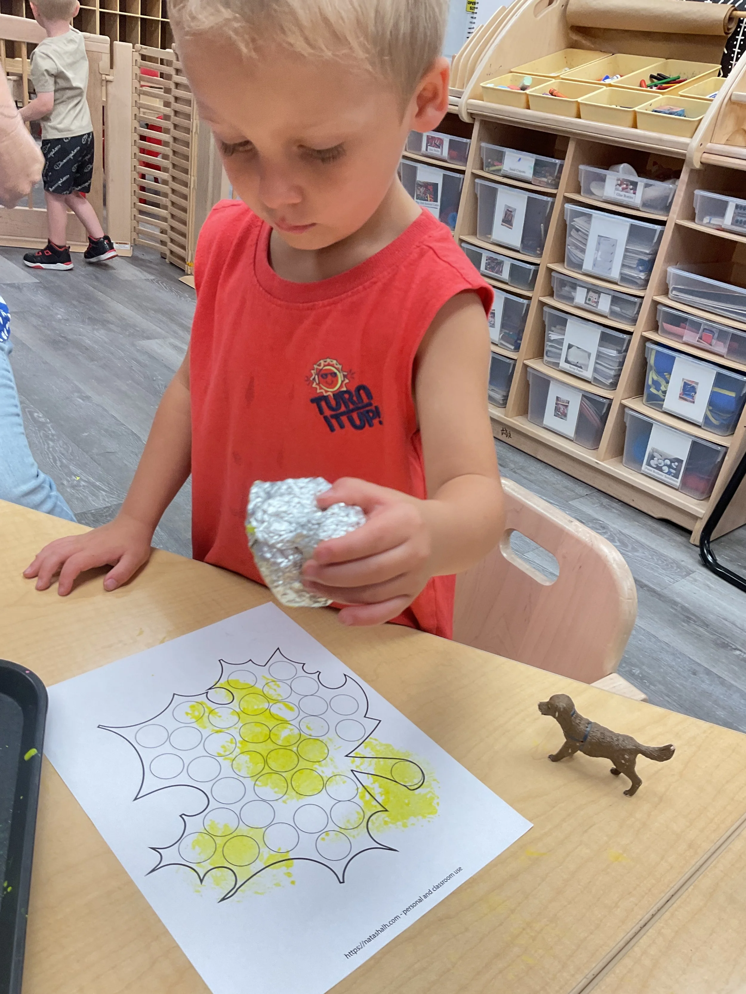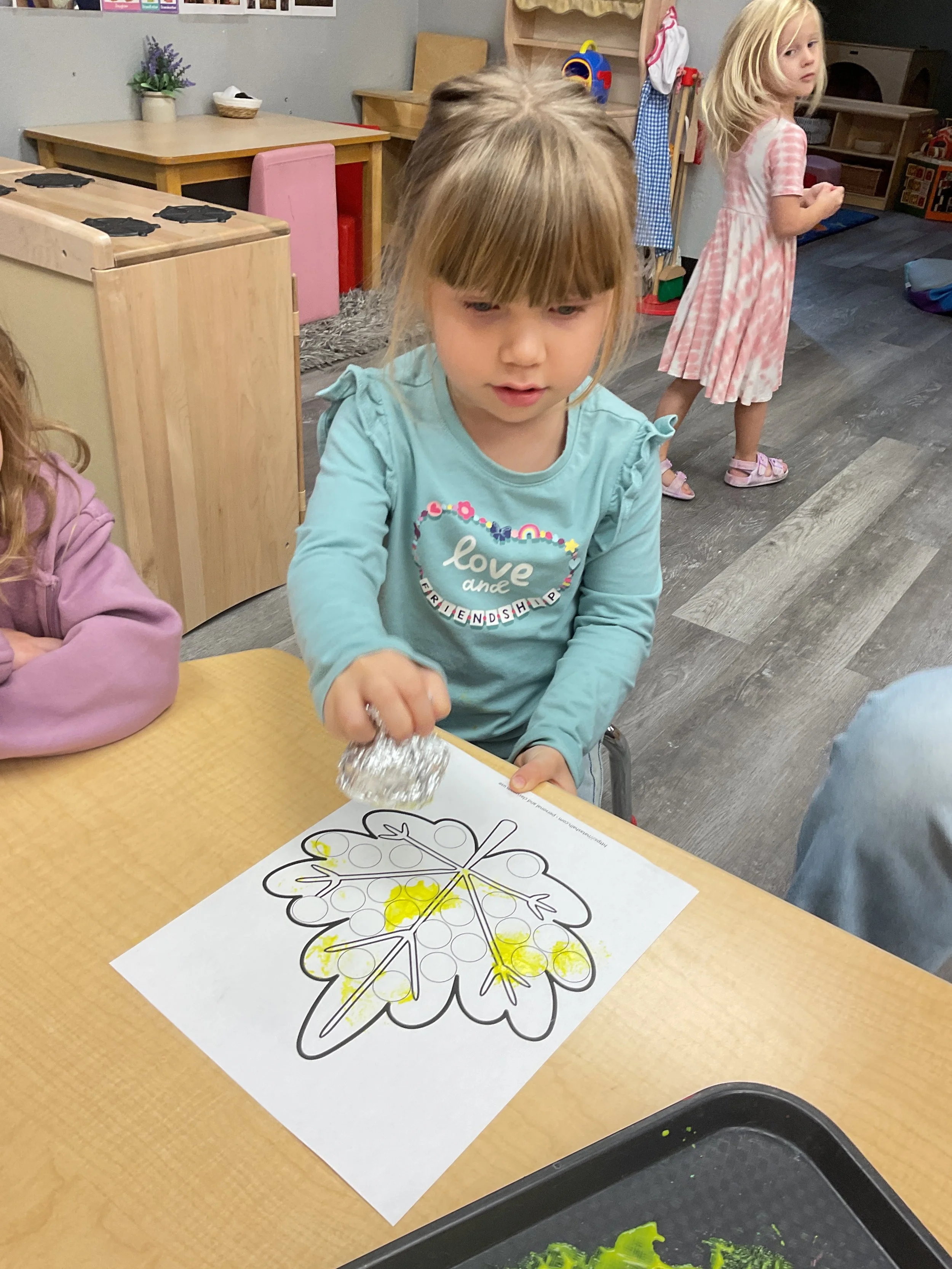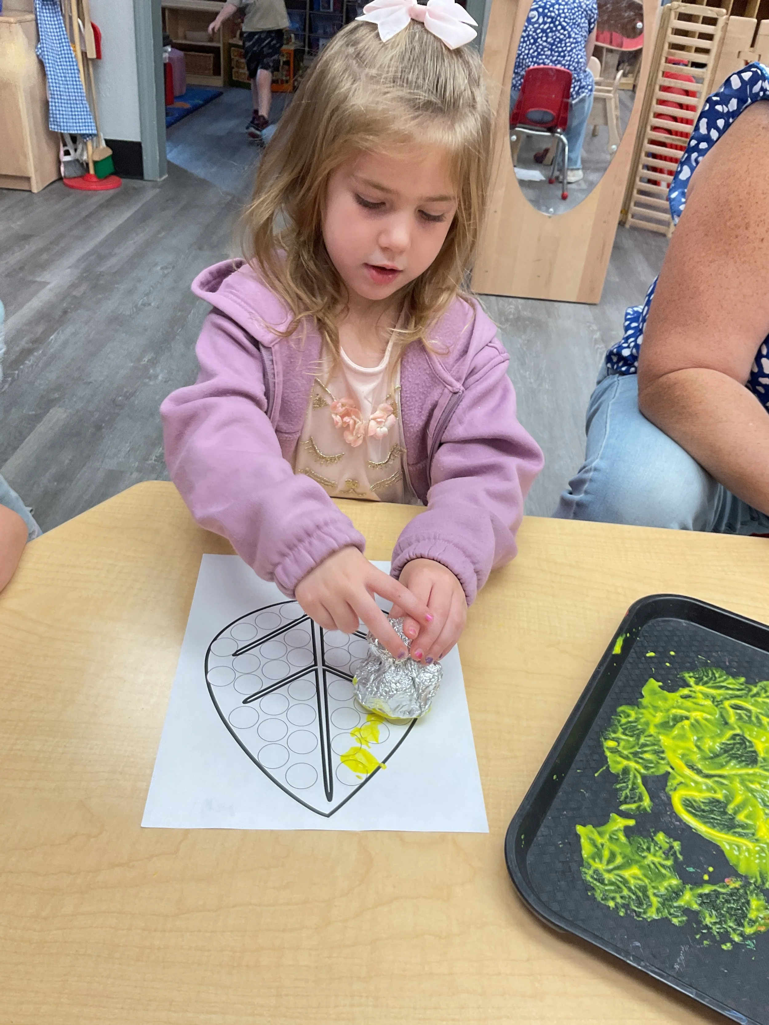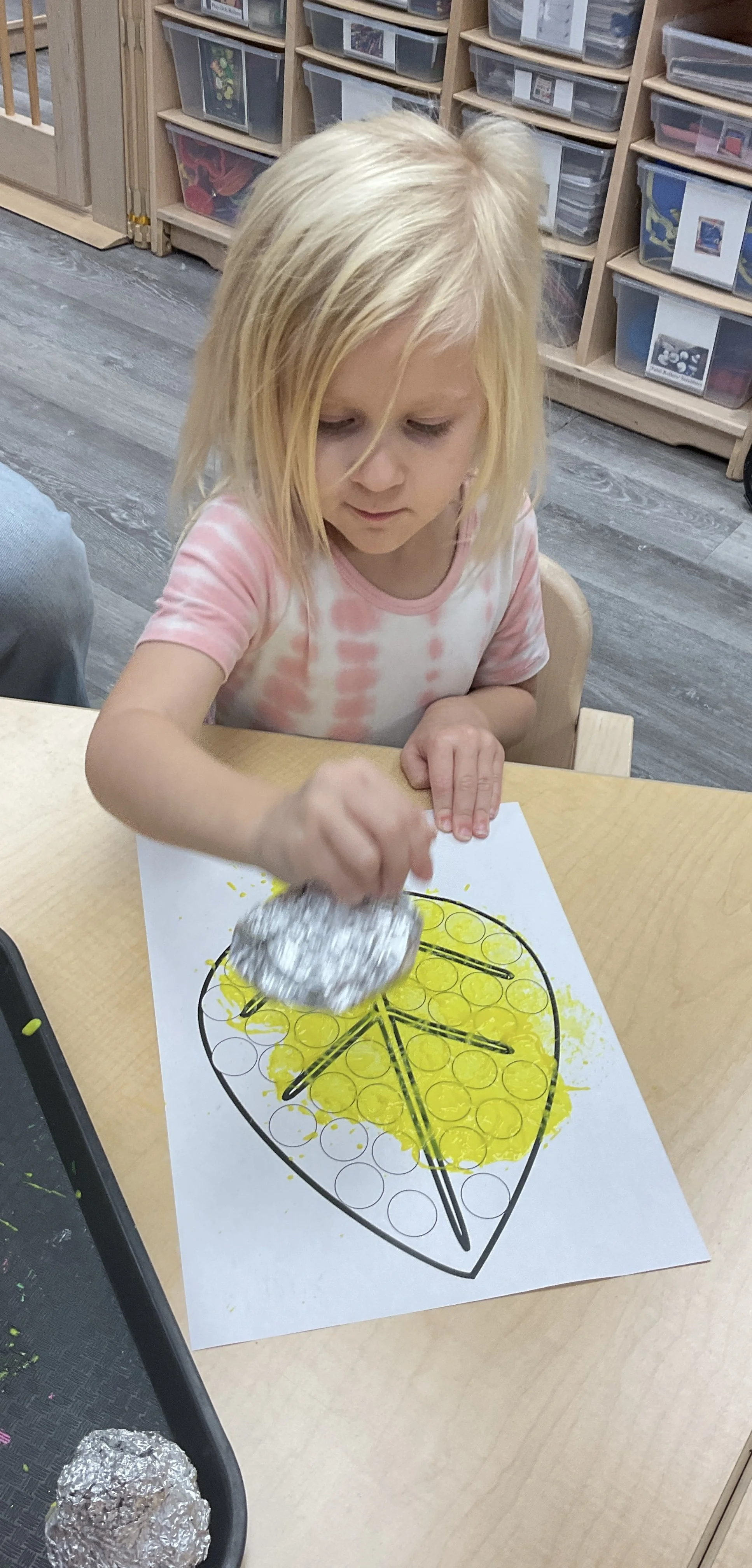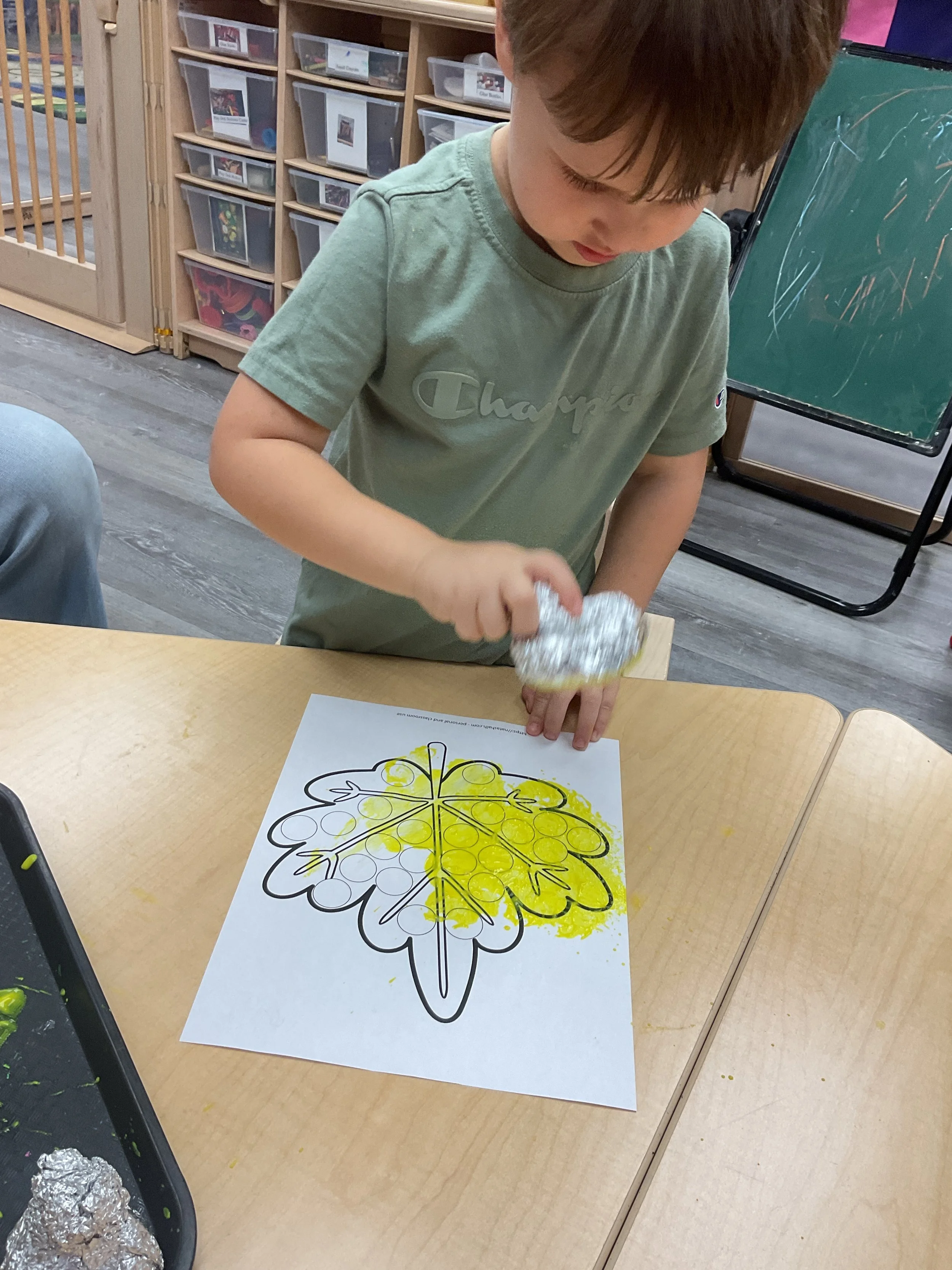 This morning, we read the book A Tree is Nice written by Janice May Udry and illustrated by Marc Semont. During our music and movement time, we navigated an obstacle course. Next, during our math and cognition lesson, we worked on beginning sounds. Then, for our science and sensory lesson, we talked about the life cycle of a plant. Finally, during our fine motor and literacy lesson, we painted tree leaves yellow with foil stampers.