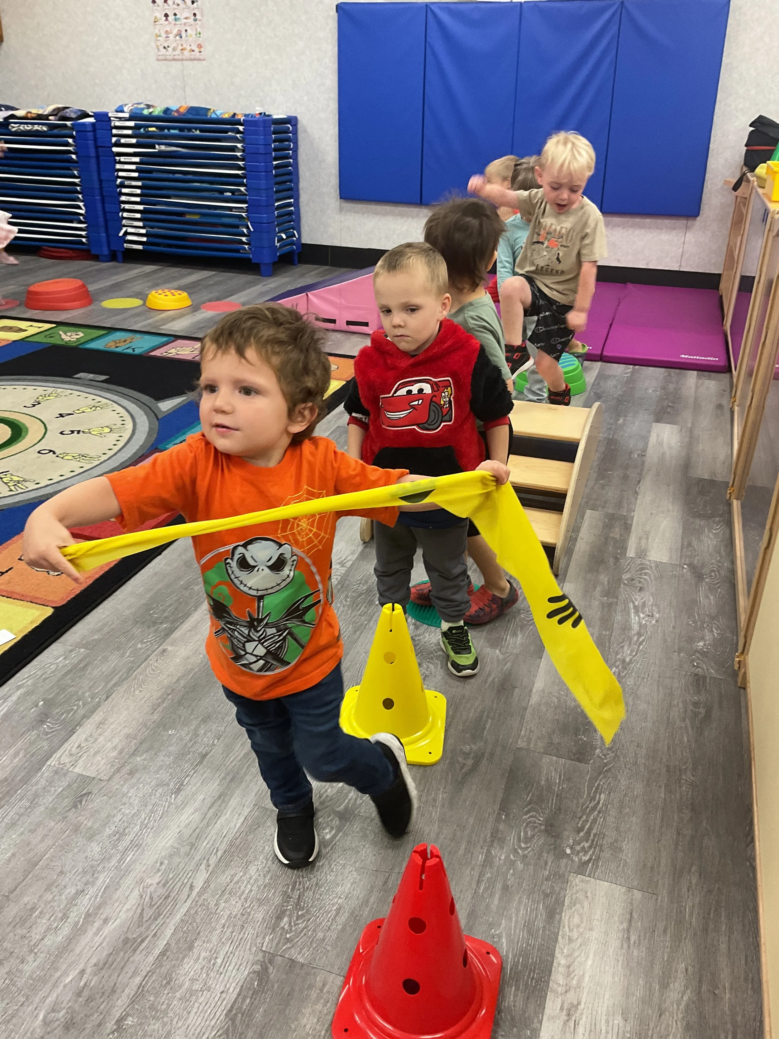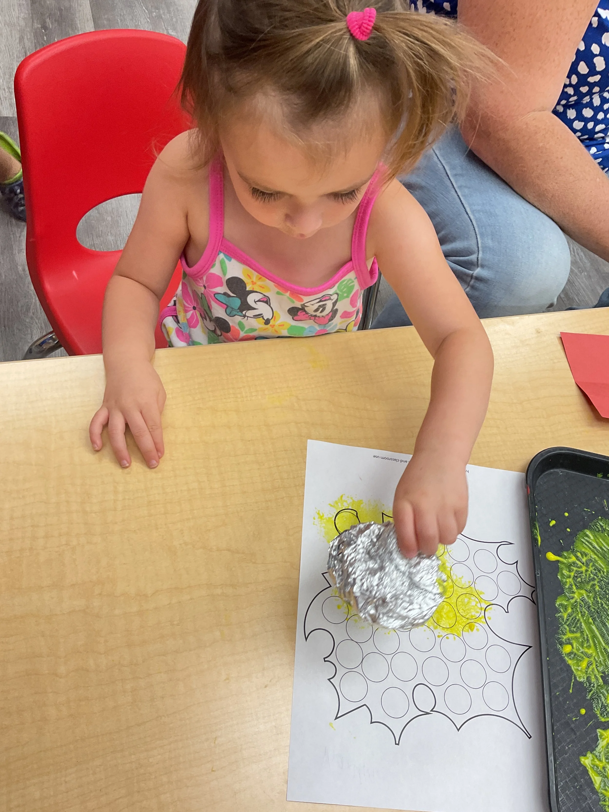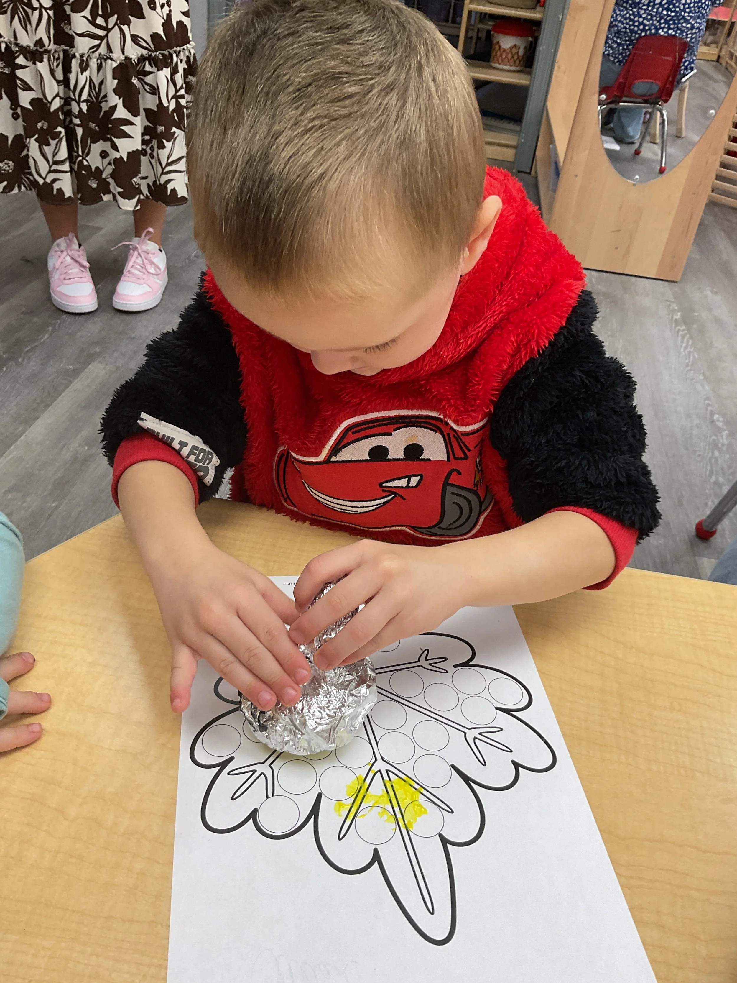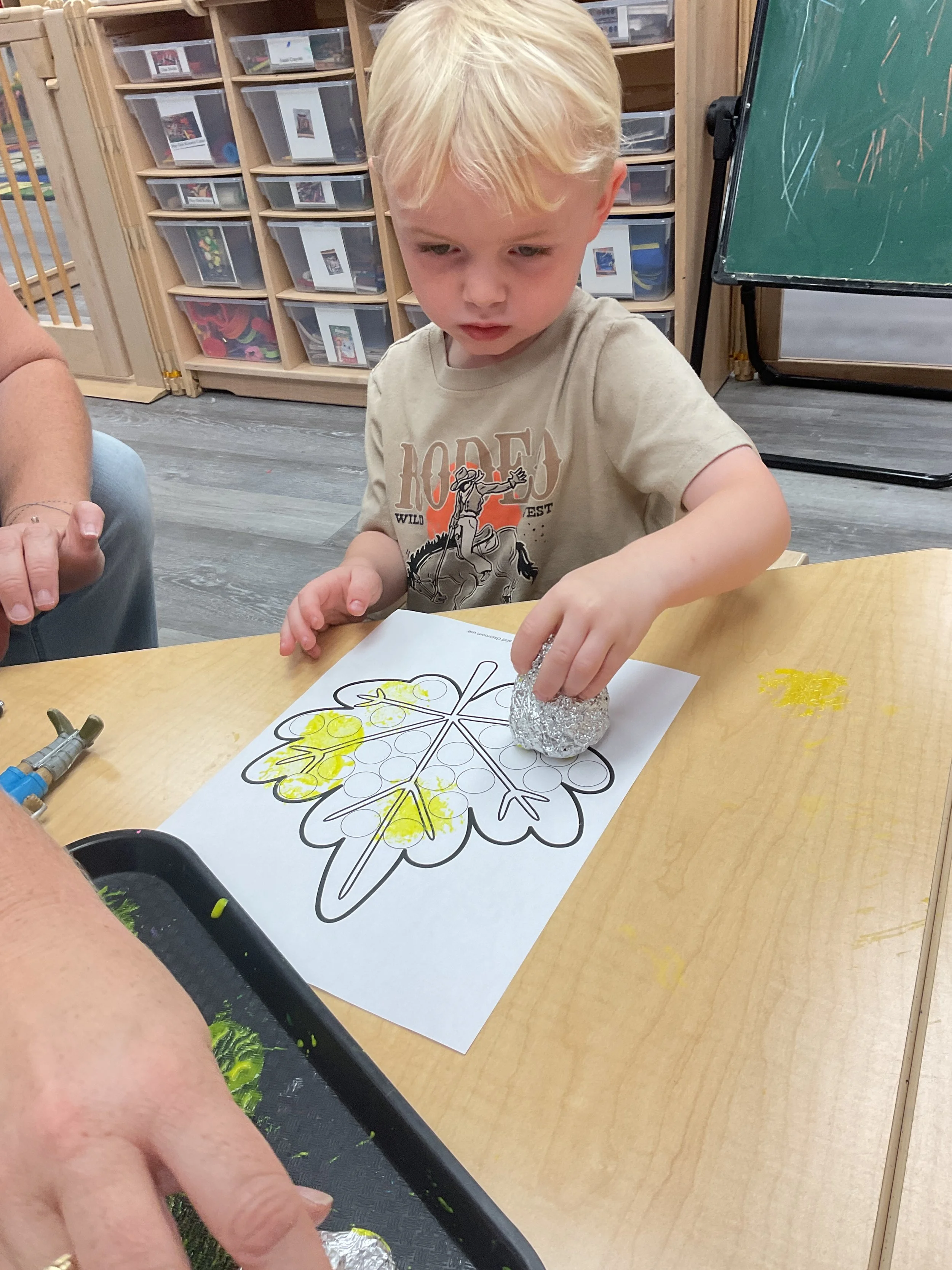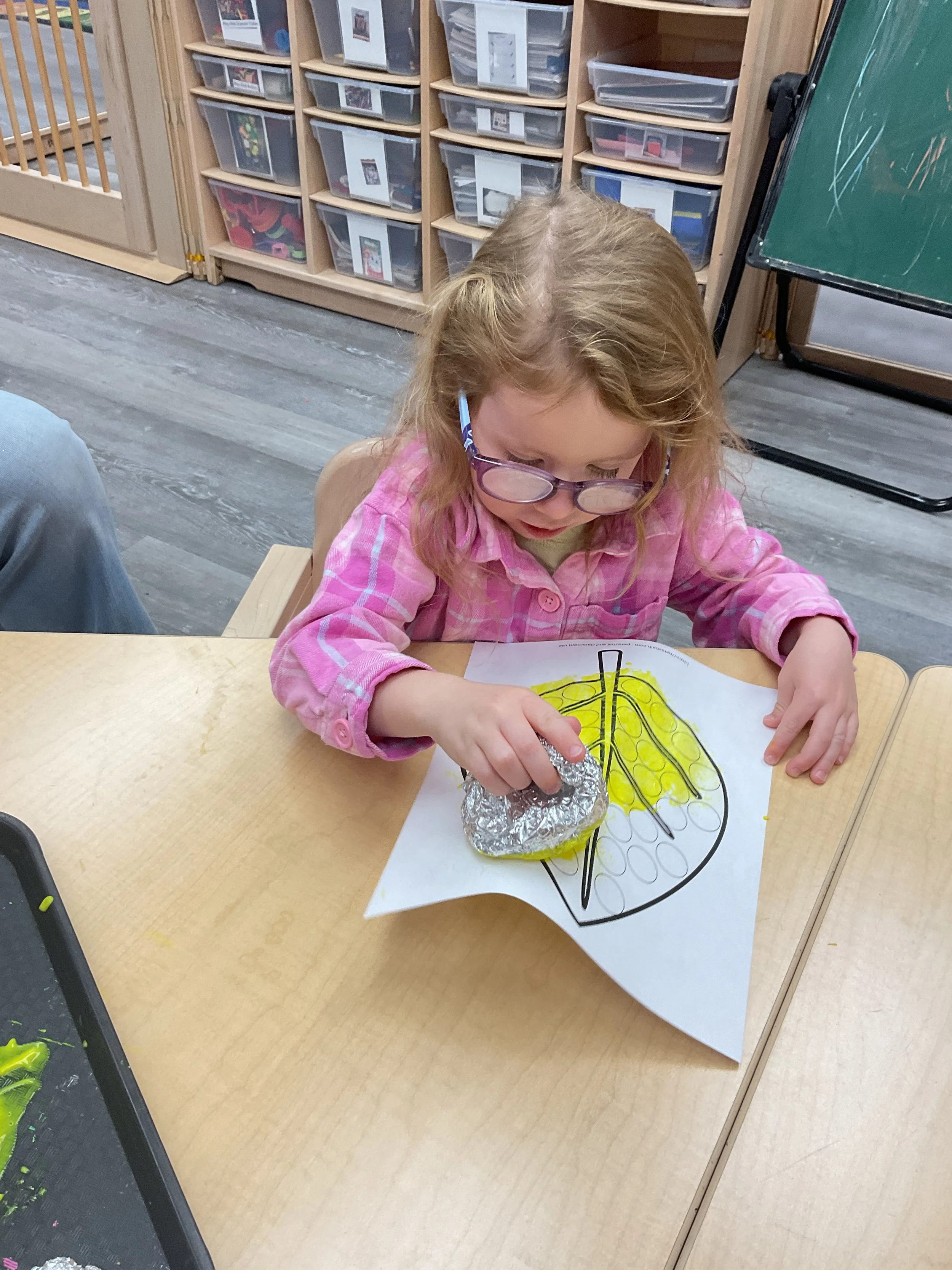 This morning, we read the book A Tree is Nice written by Janice May Udry and illustrated by Marc Semont. During our music and movement time, we navigated an obstacle course. Next, during our math and cognition lesson, we worked on beginning sounds. Then, for our science and sensory lesson, we talked about the life cycle of a plant. Finally, during our fine motor and literacy lesson, we painted tree leaves yellow with foil stampers.