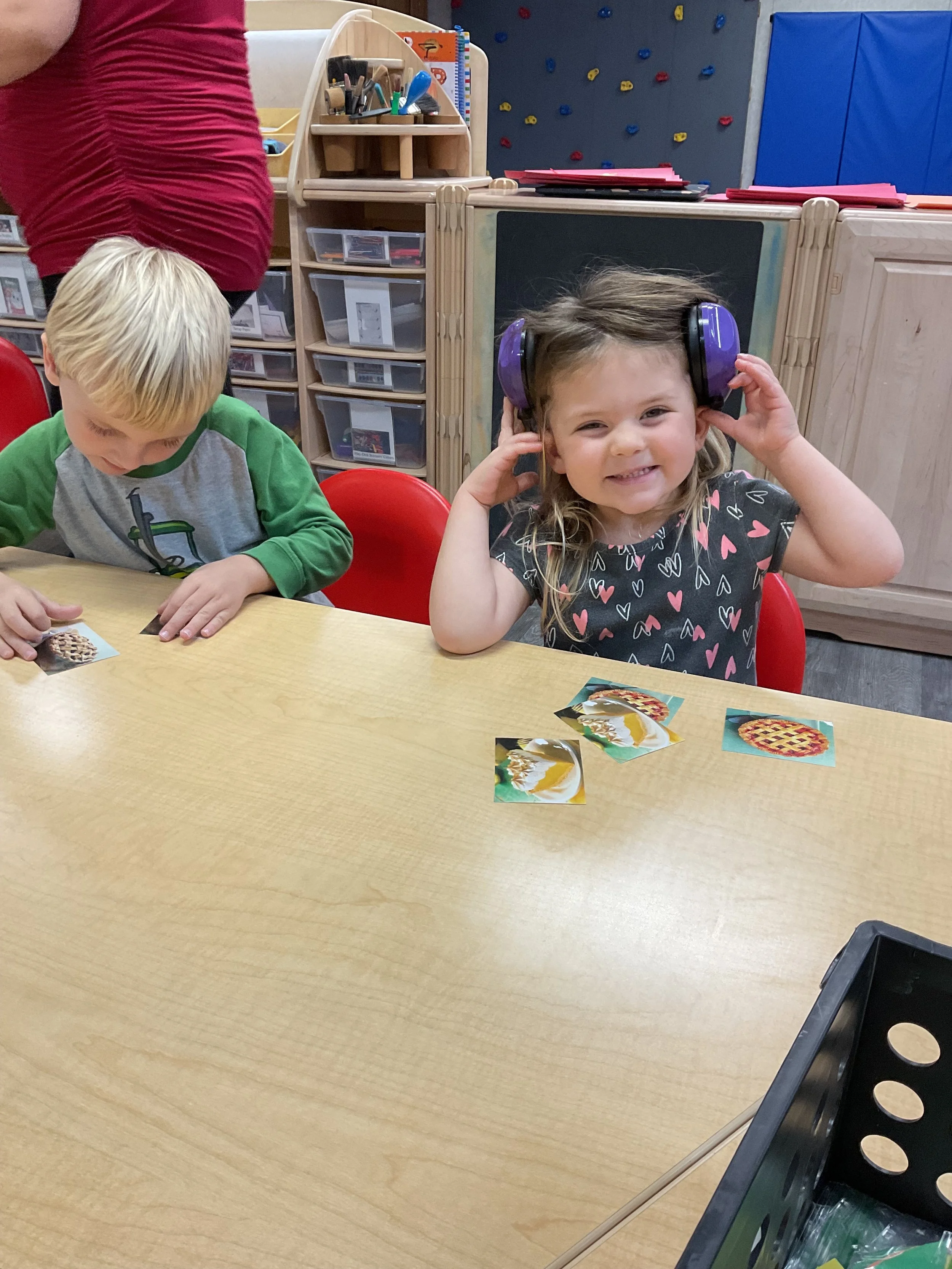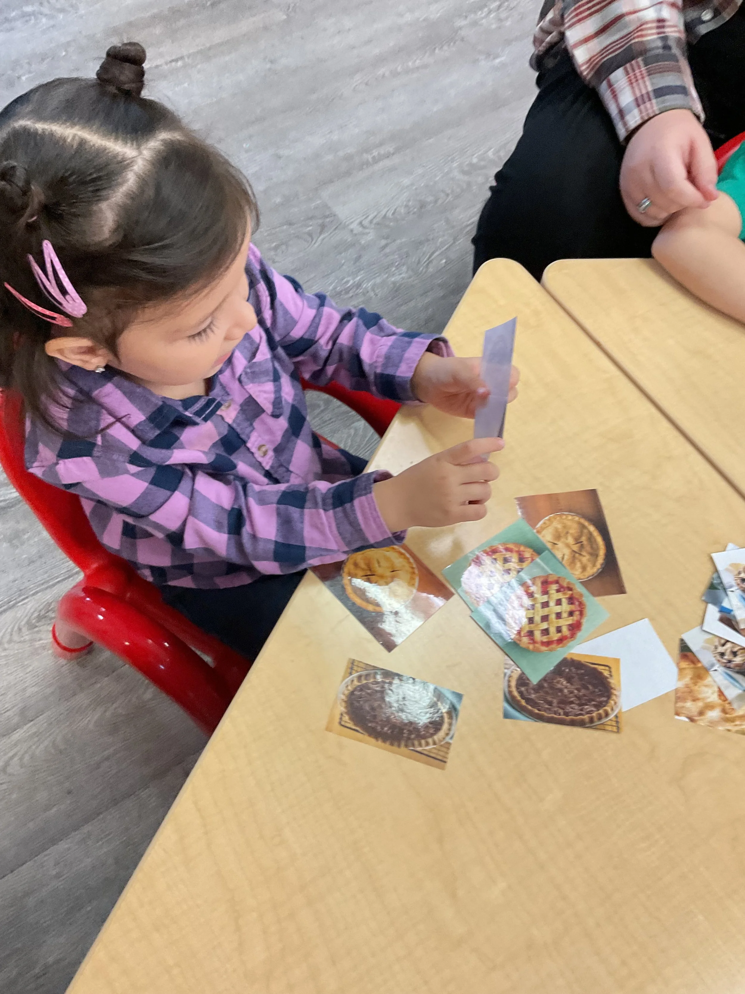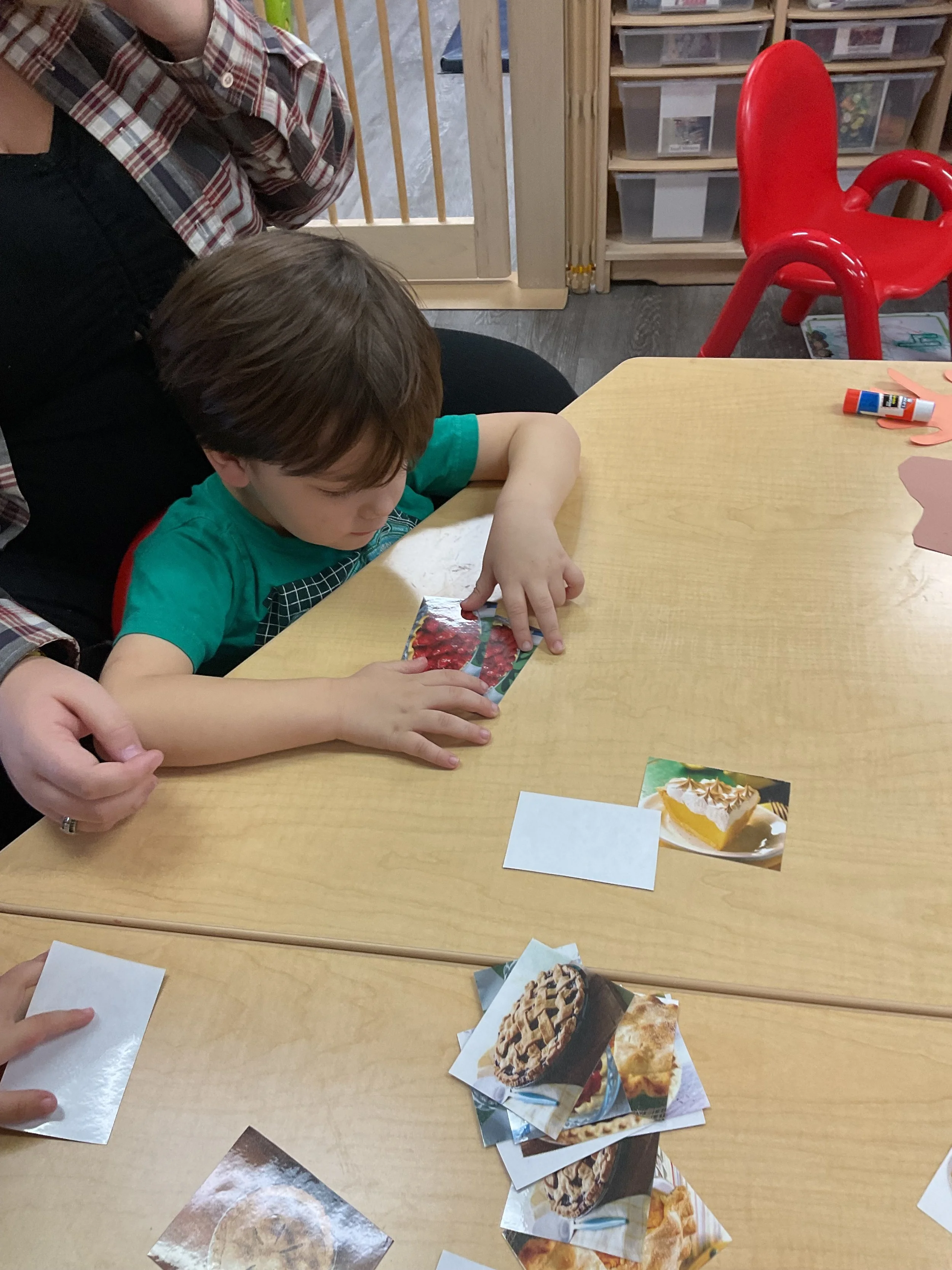 Happy Monday! Today we read the book Countdown to Thanksgiving by Jodi Huelin. This book teaches us about Thanksgiving traditions and things we might do with our families during this holiday. During our math and cognition activity we matched together different types of pies. For science and sensory time we created Thanksgiving placemats by tracing our handprints and cutting them out to make turkeys. Lastly, for our fine motor and literacy we practiced spelling our names by using feathers with letters on them and putting them in order to make a turkey.
